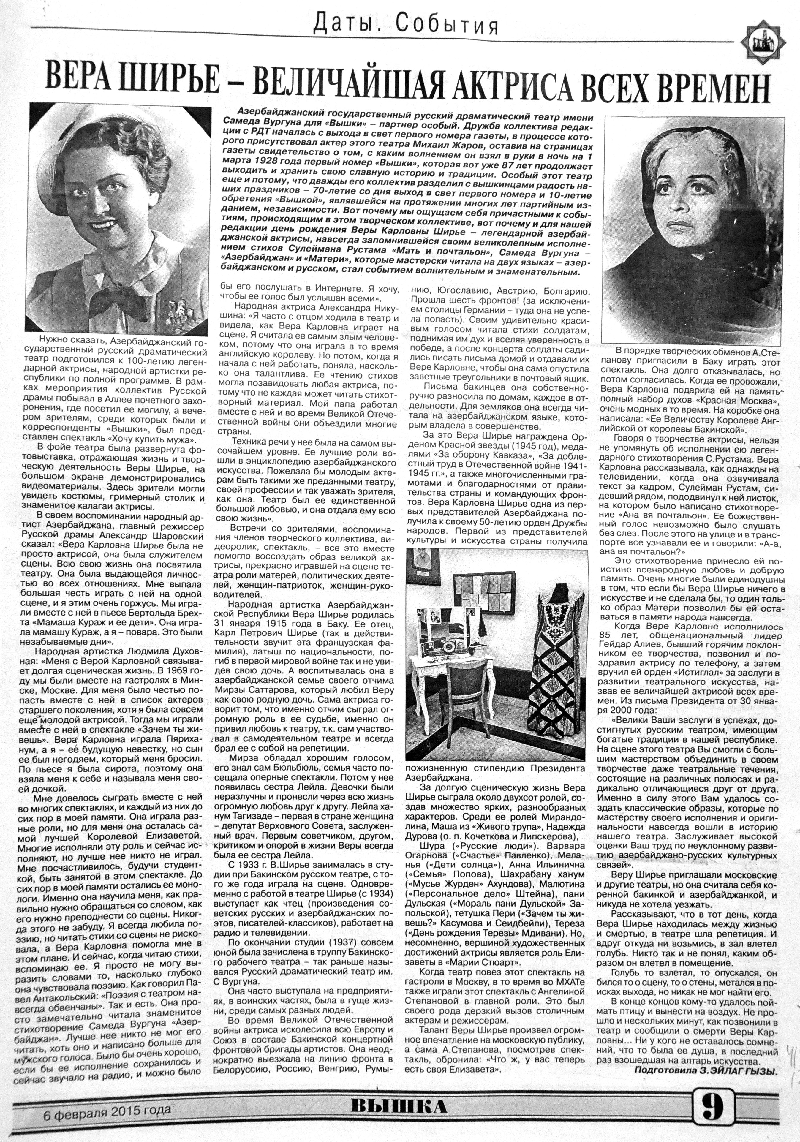 драмтеатра имени Самеда Вургуна / провела И.Асадова //Эхо.- 2015. -24 февраля. - С.8. Вера Ширье – 100