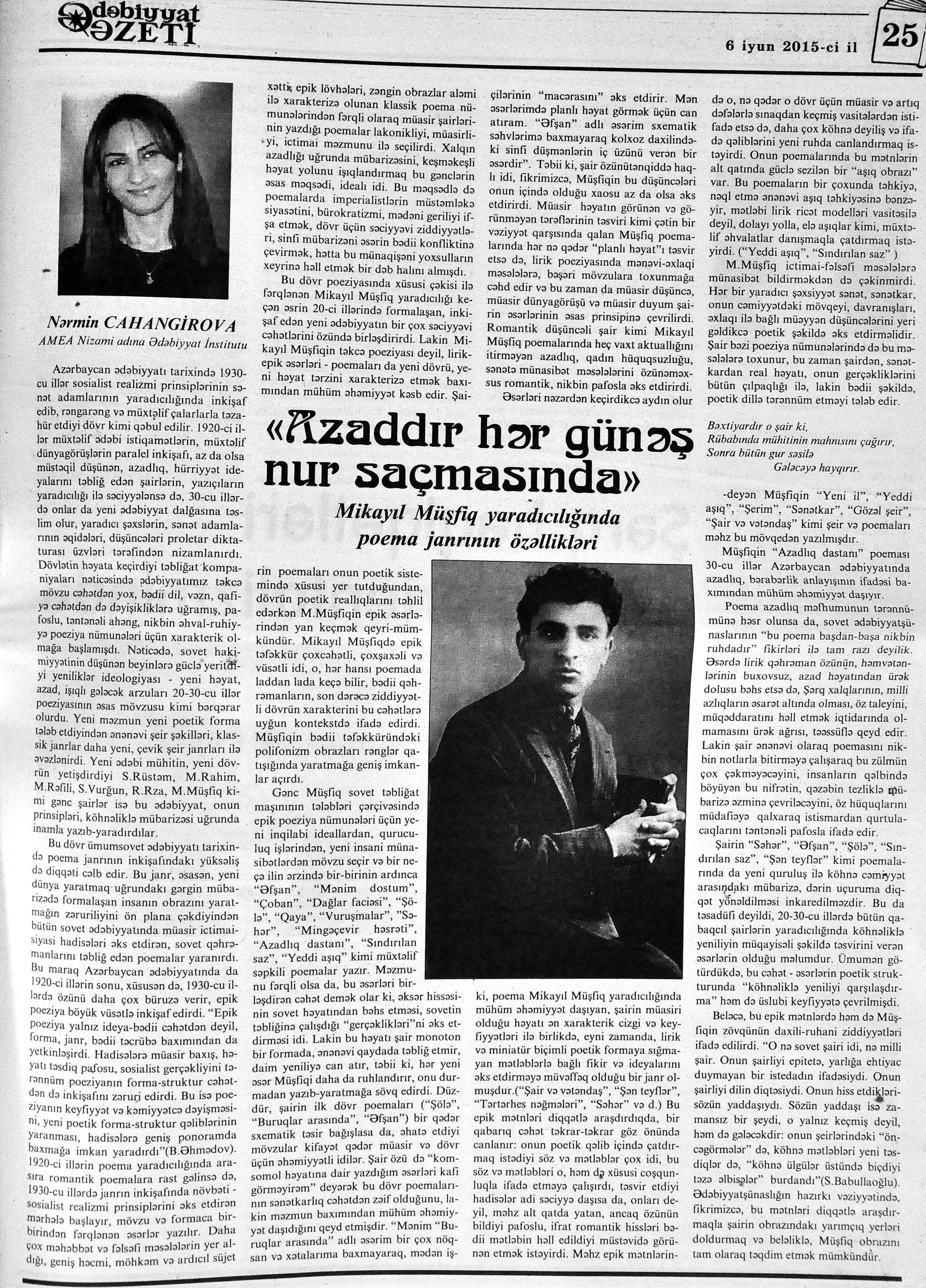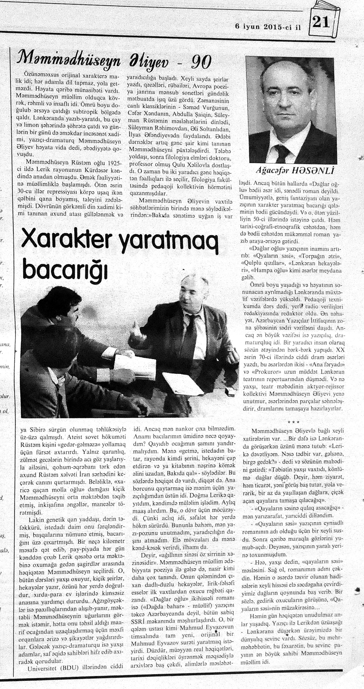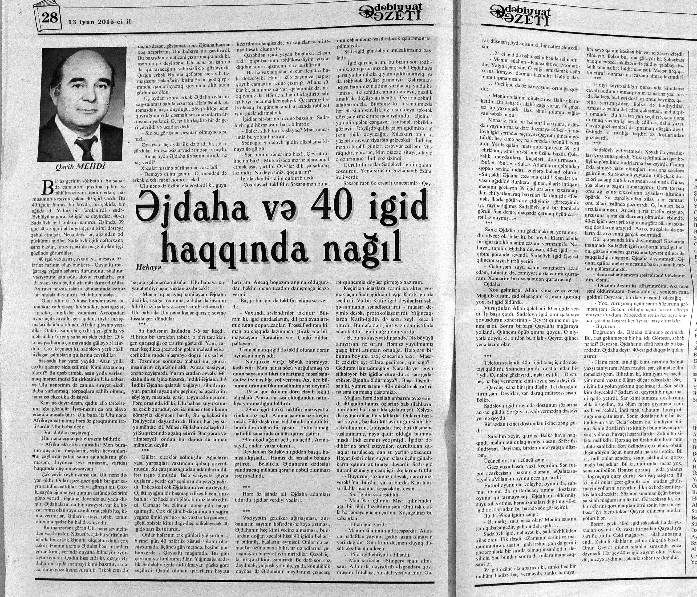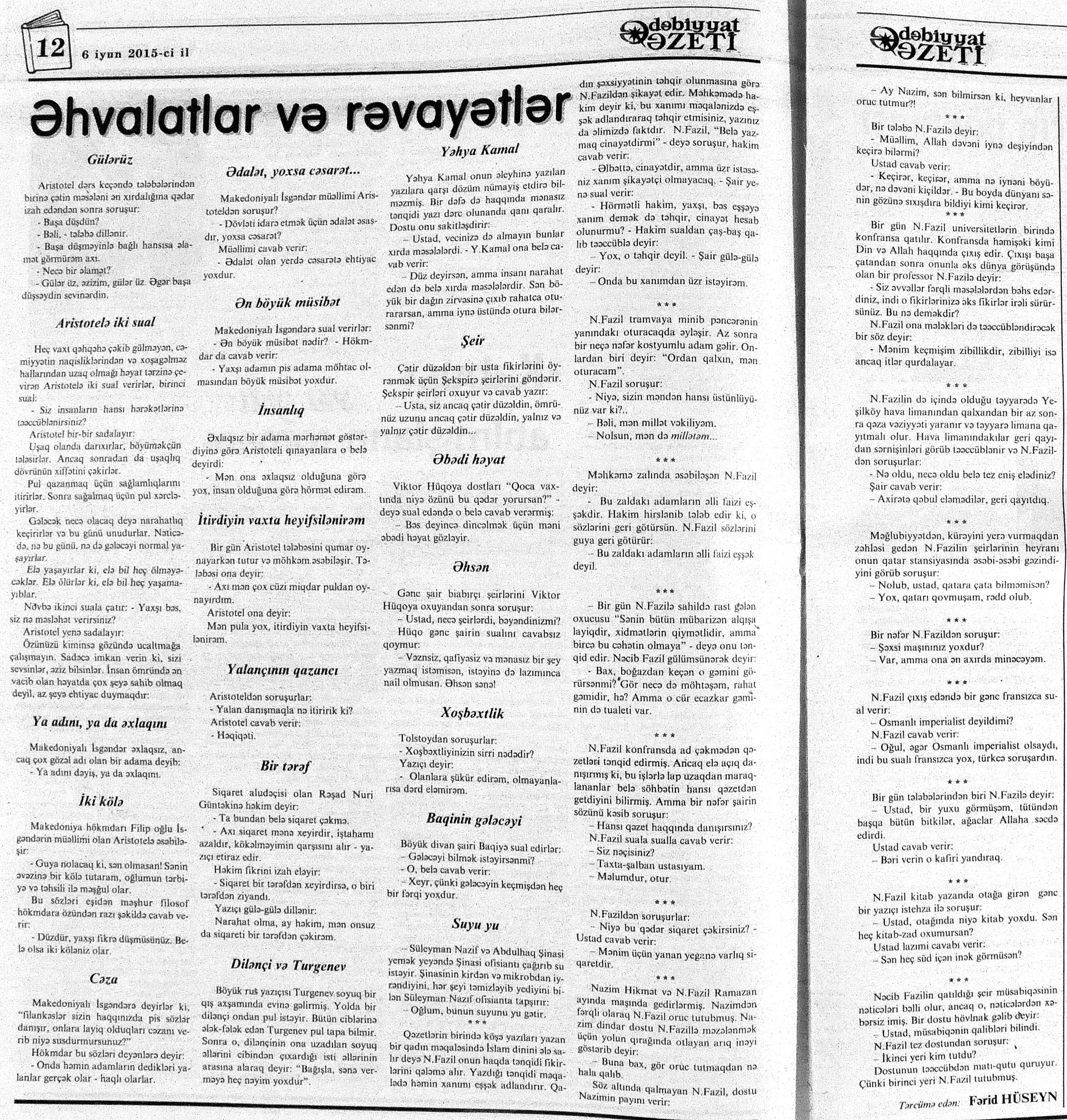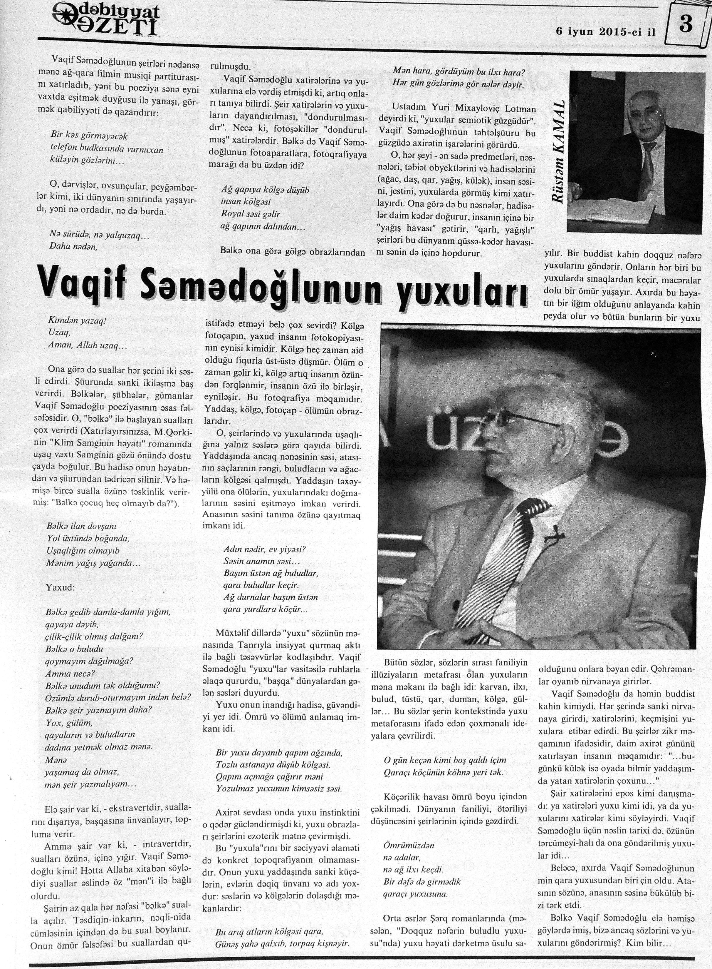 544. Kamal, Y. Əhvalatlar və rəvayətlər //Ədəbiyyat qəzeti.- 2015.- 6 iyun.- S.12-13. 545. Məmmədli, İ. Dahilər: //Ədəbiyyat qəzeti.- 2015.- 6 iyun.- S.15.