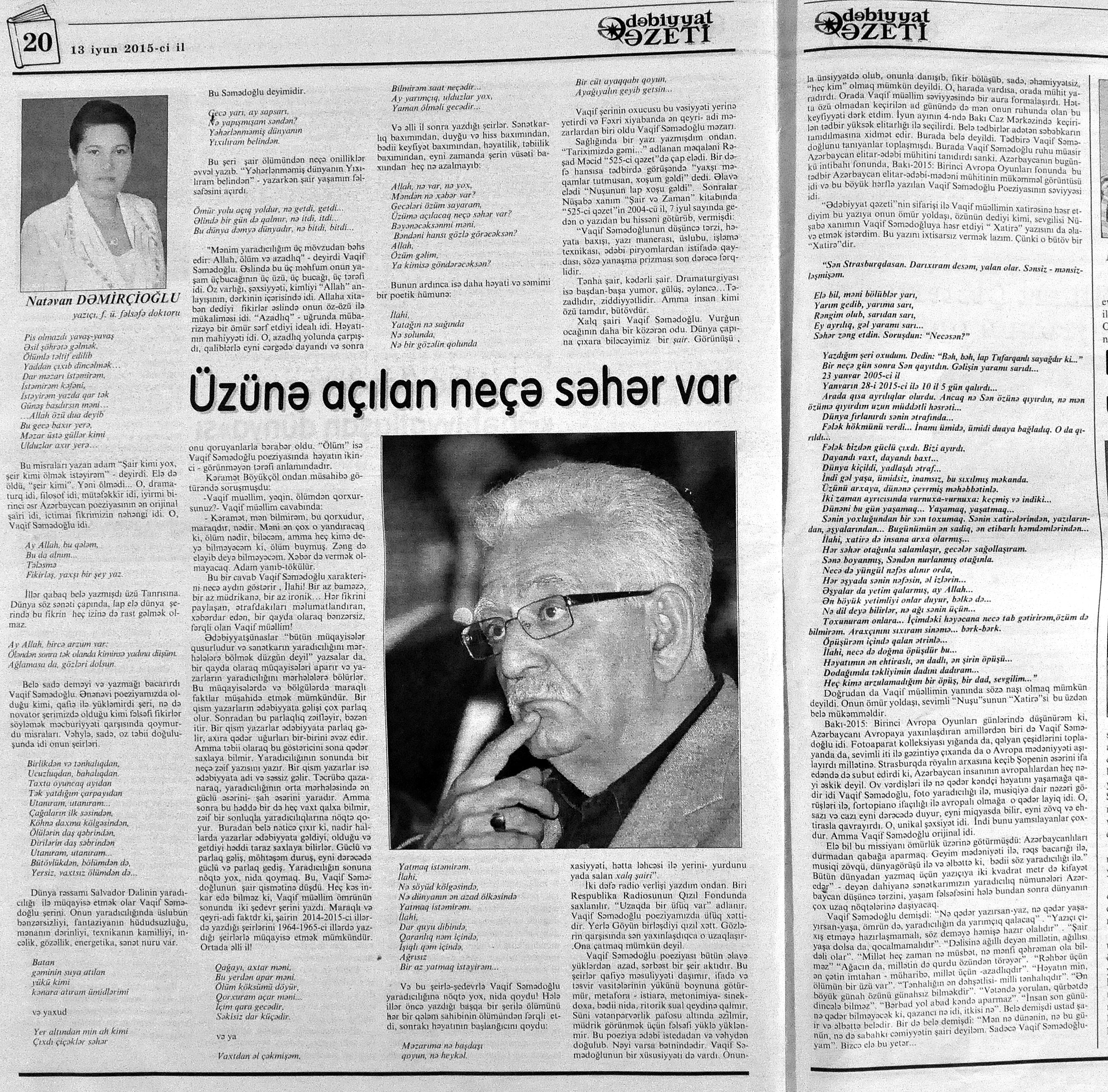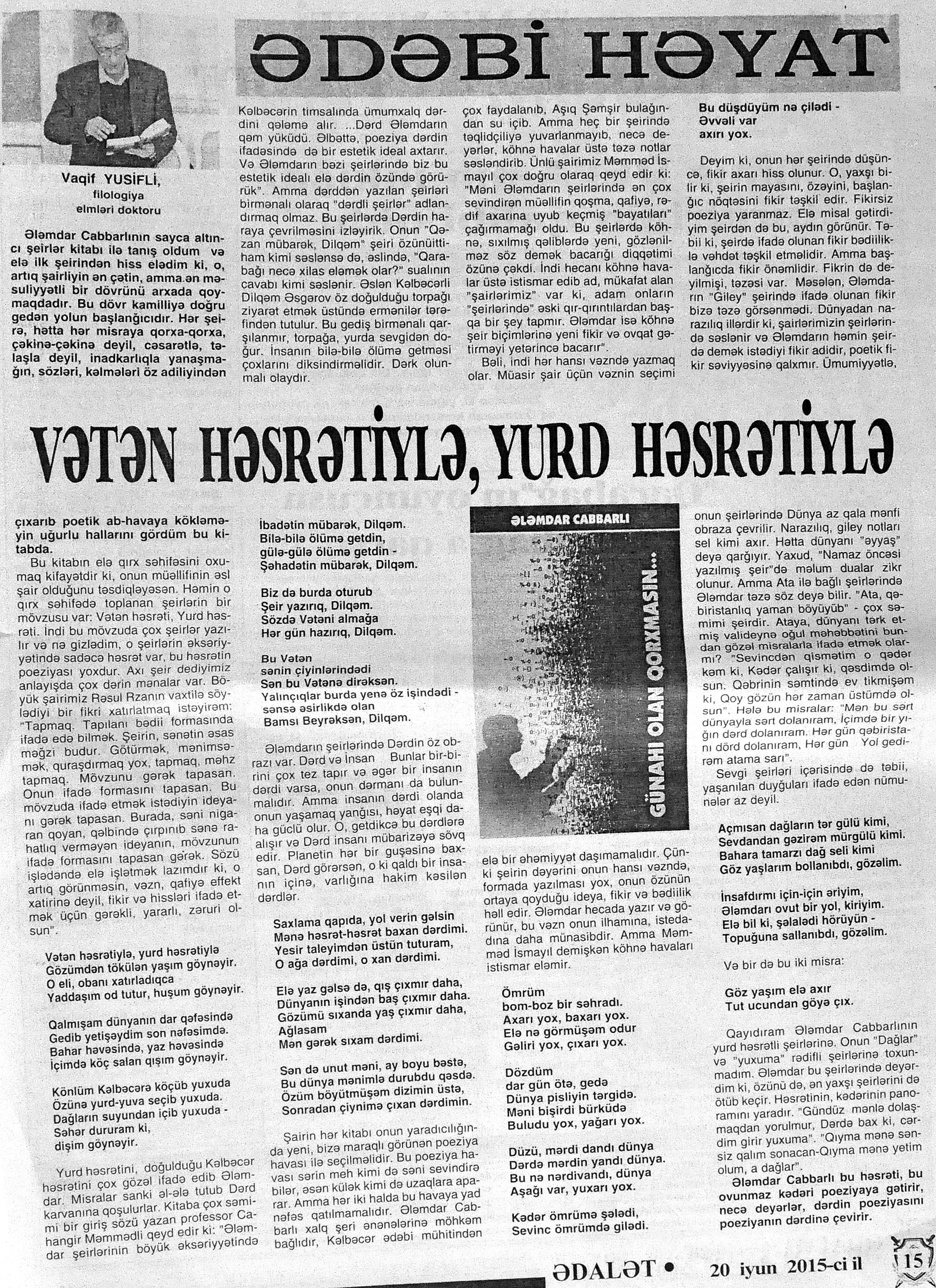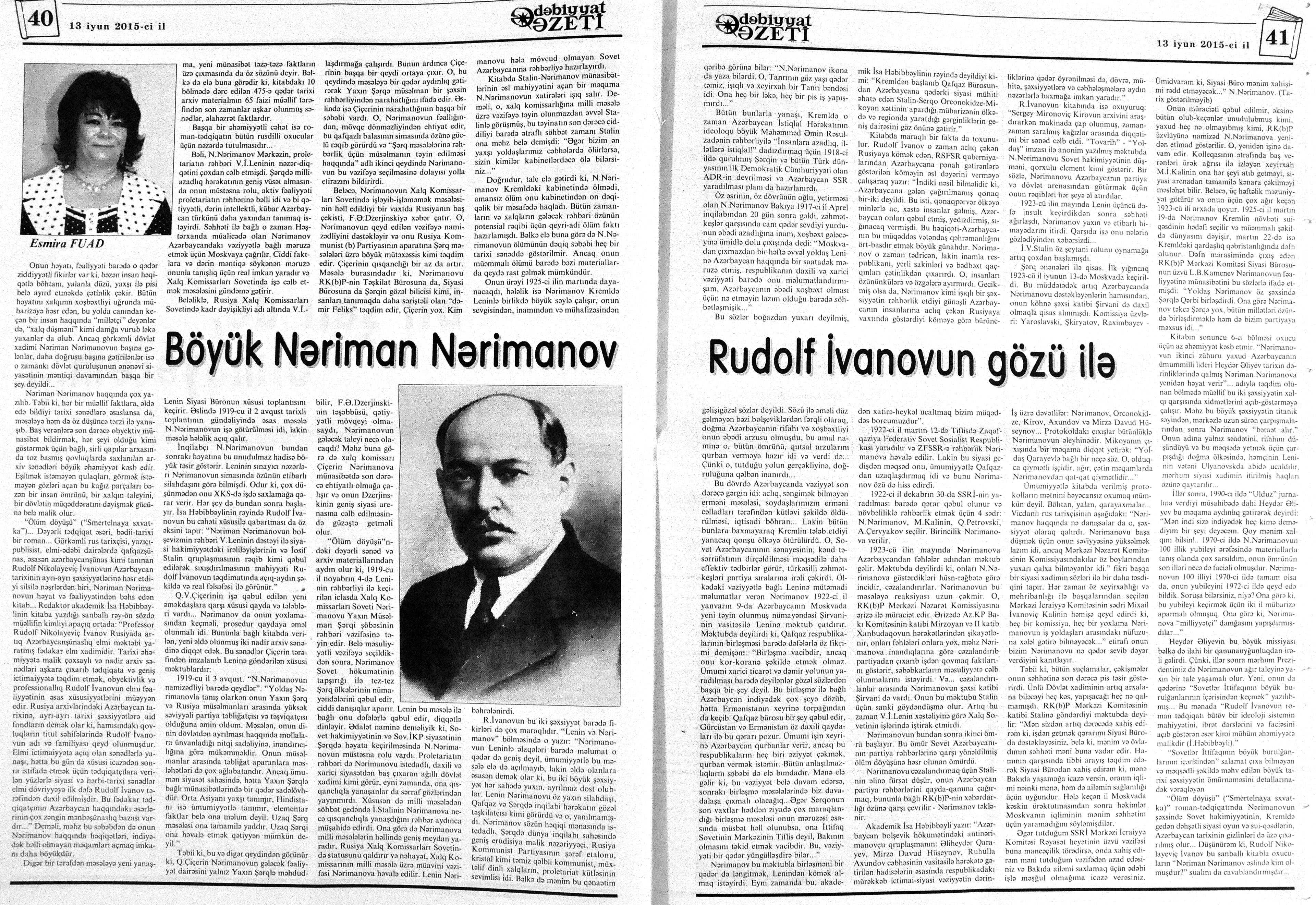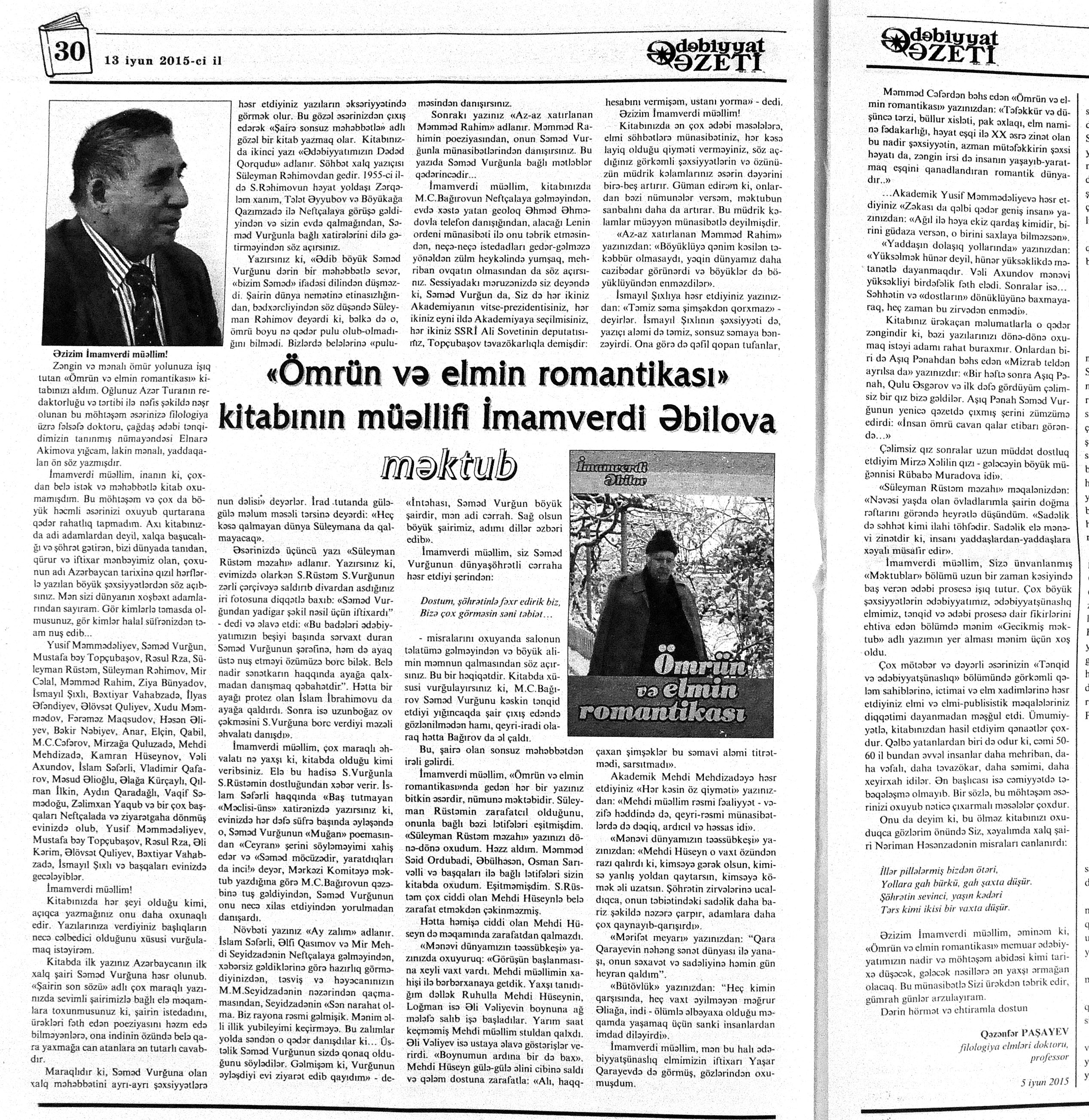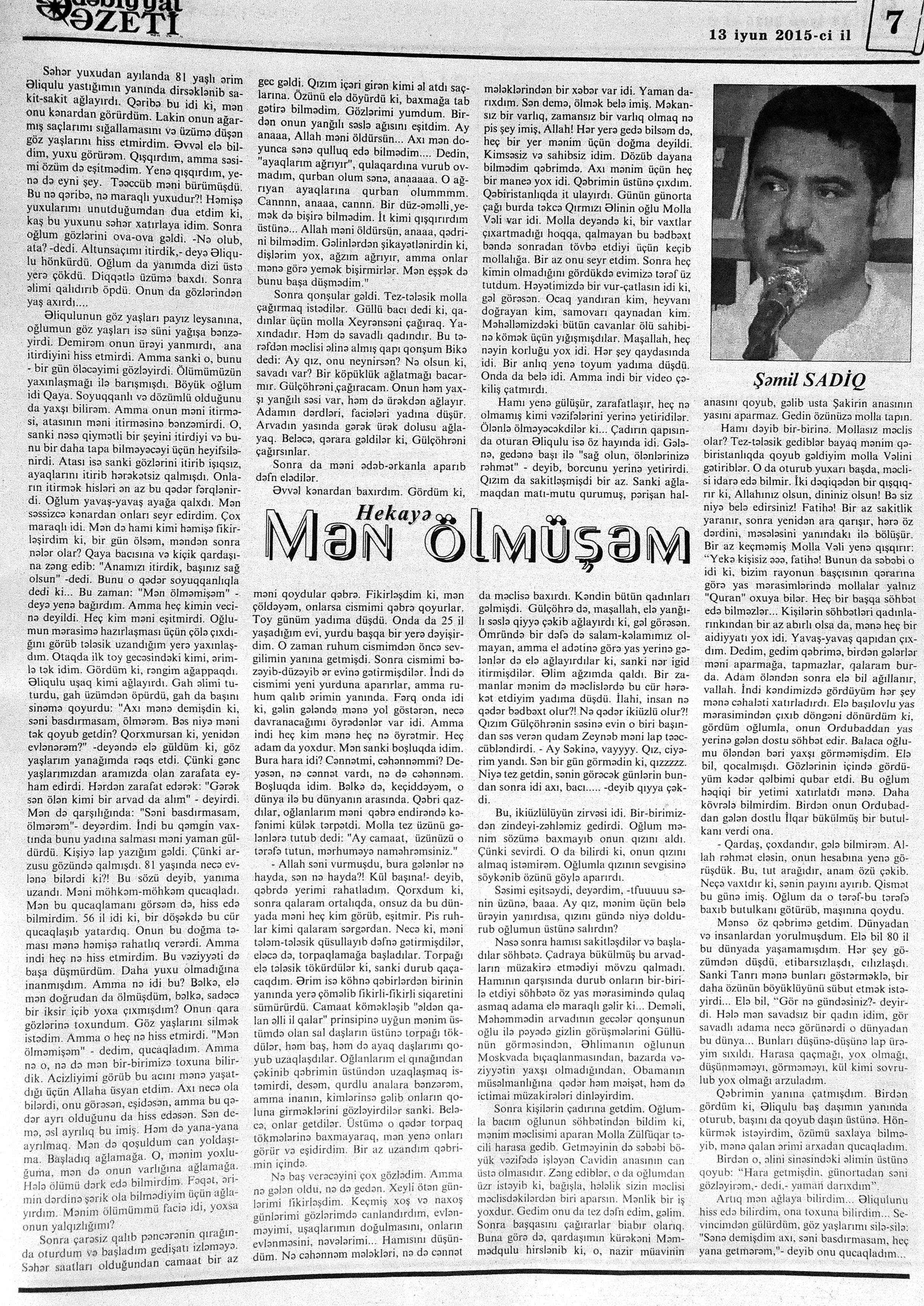 544. Kamal, Y. Əhvalatlar və rəvayətlər //Ədəbiyyat qəzeti.- 2015.- 6 iyun.- S.12-13. 545. Məmmədli, İ. Dahilər: //Ədəbiyyat qəzeti.- 2015.- 6 iyun.- S.15.