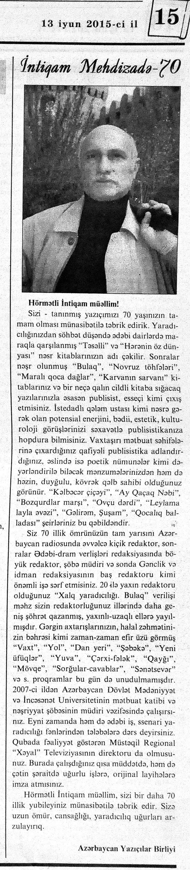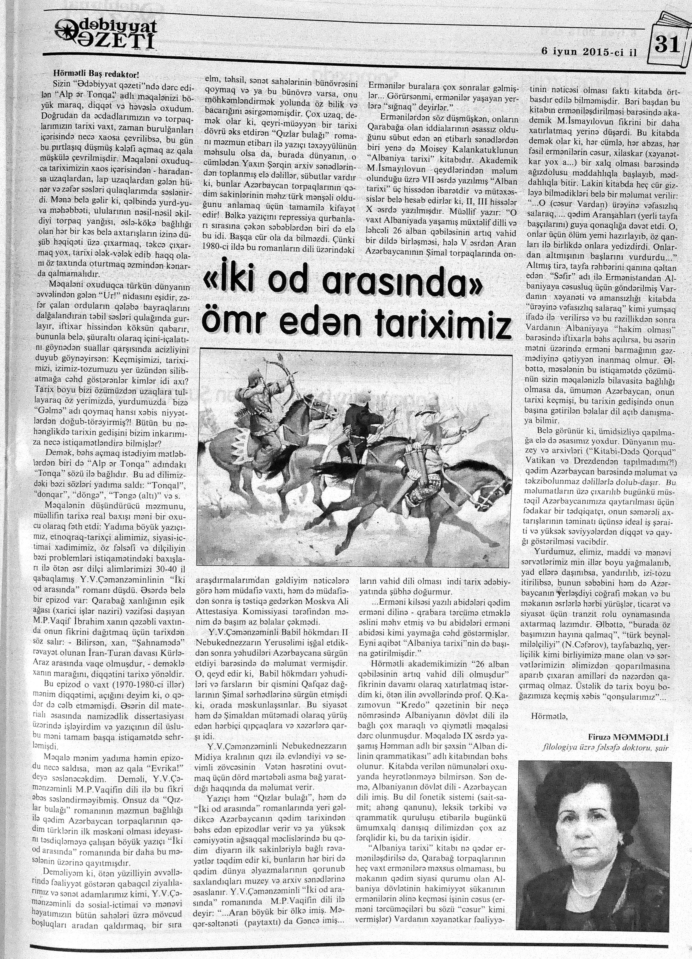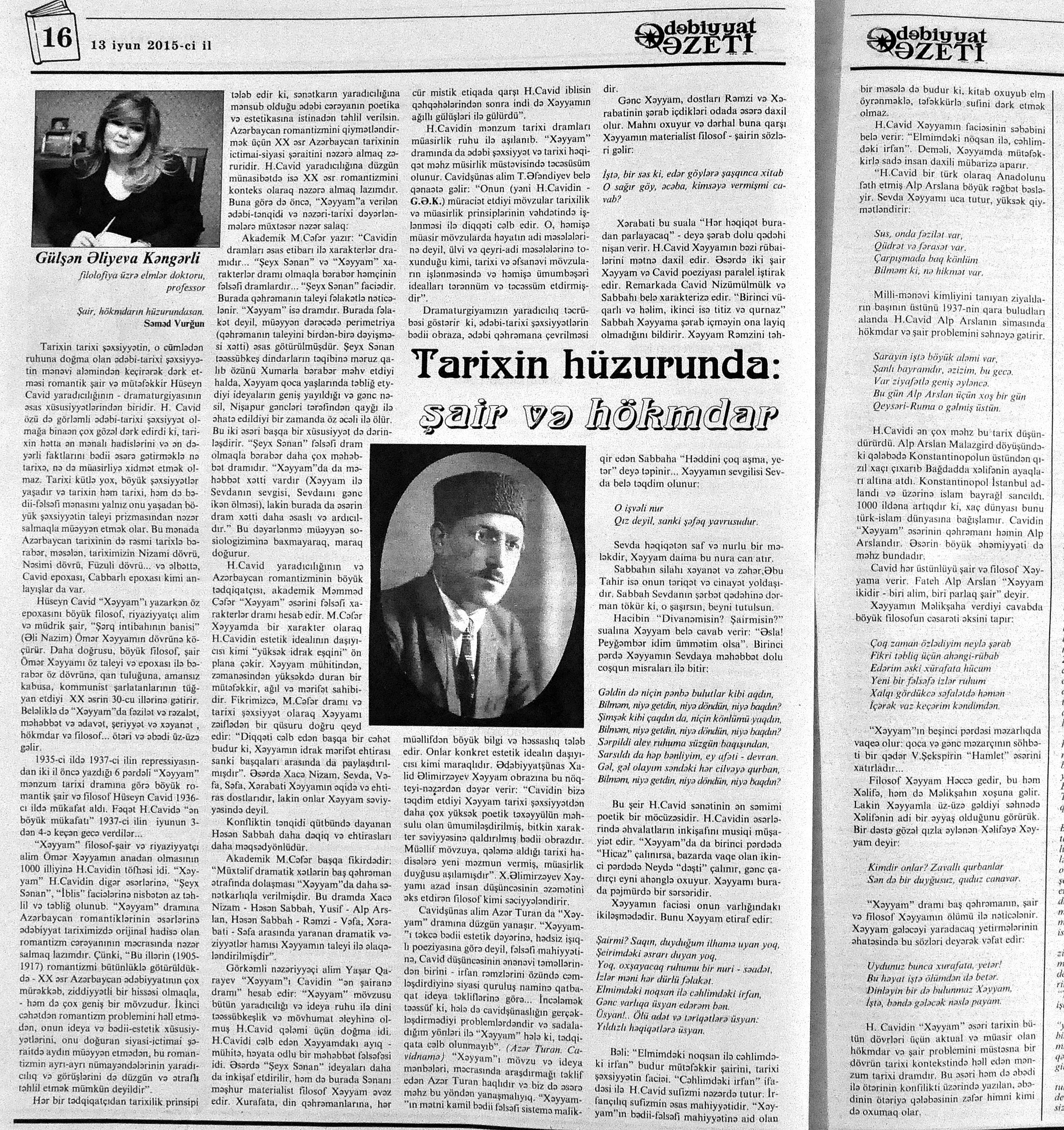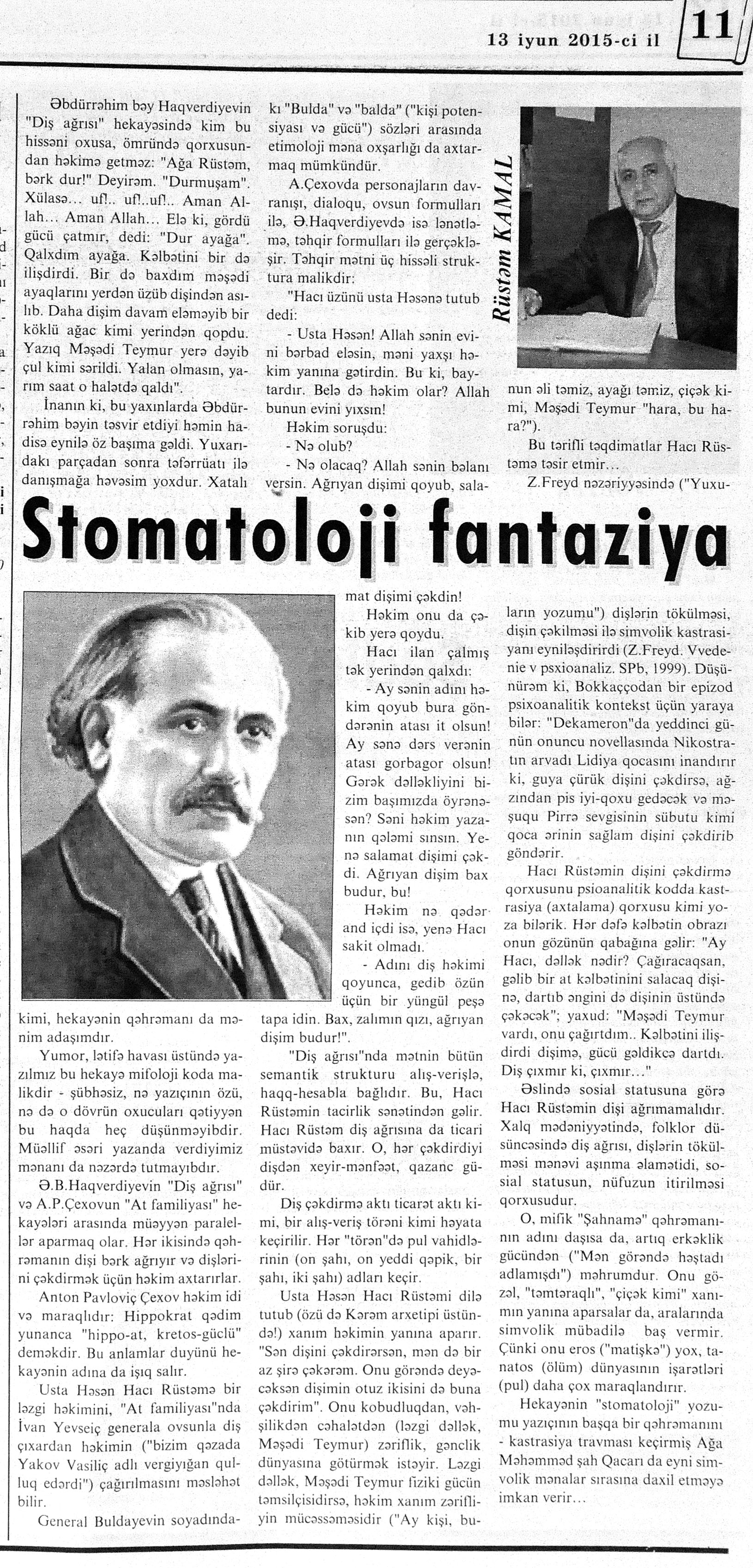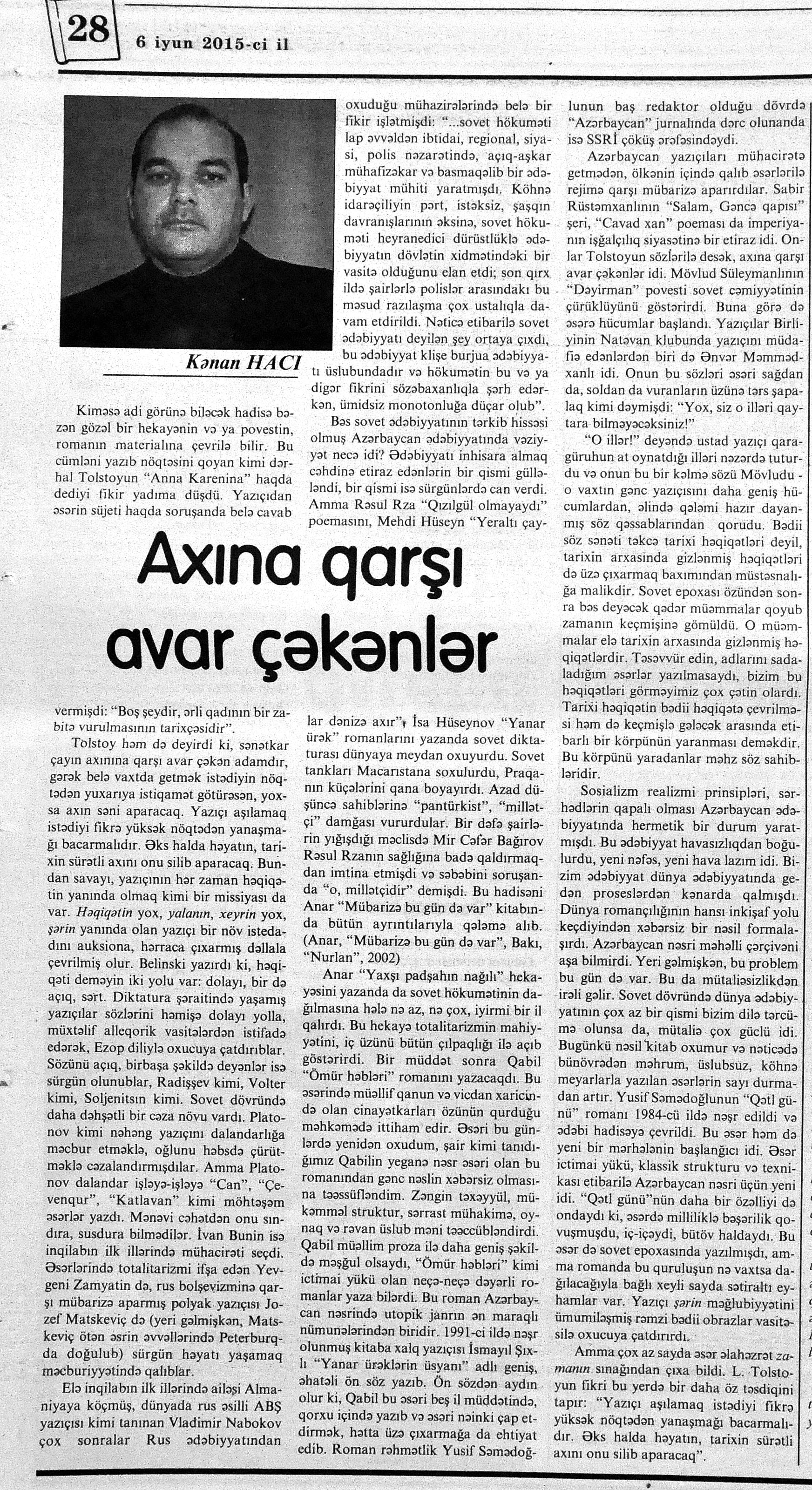 544. Kamal, Y. Əhvalatlar və rəvayətlər //Ədəbiyyat qəzeti.- 2015.- 6 iyun.- S.12-13. 545. Məmmədli, İ. Dahilər: //Ədəbiyyat qəzeti.- 2015.- 6 iyun.- S.15.