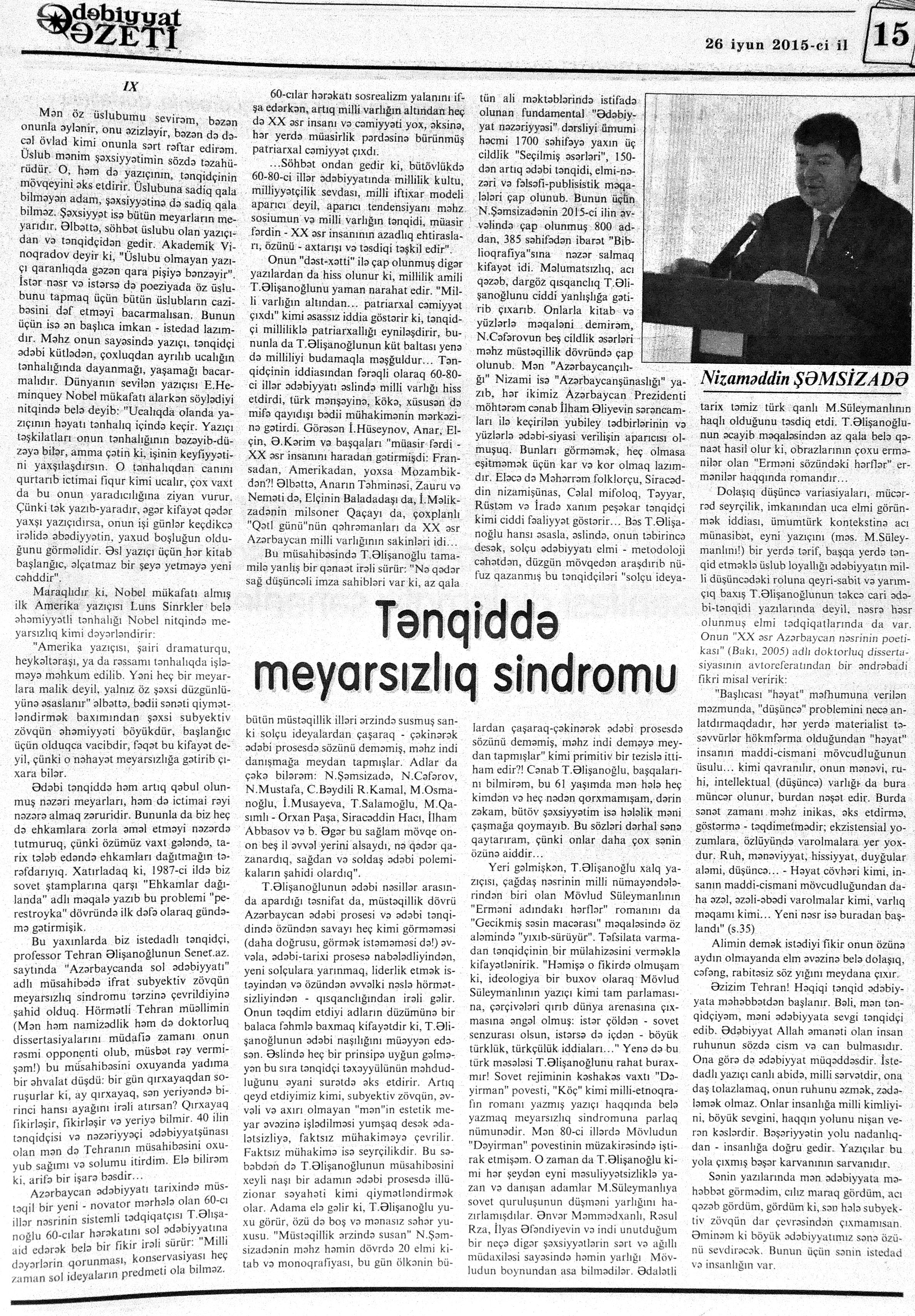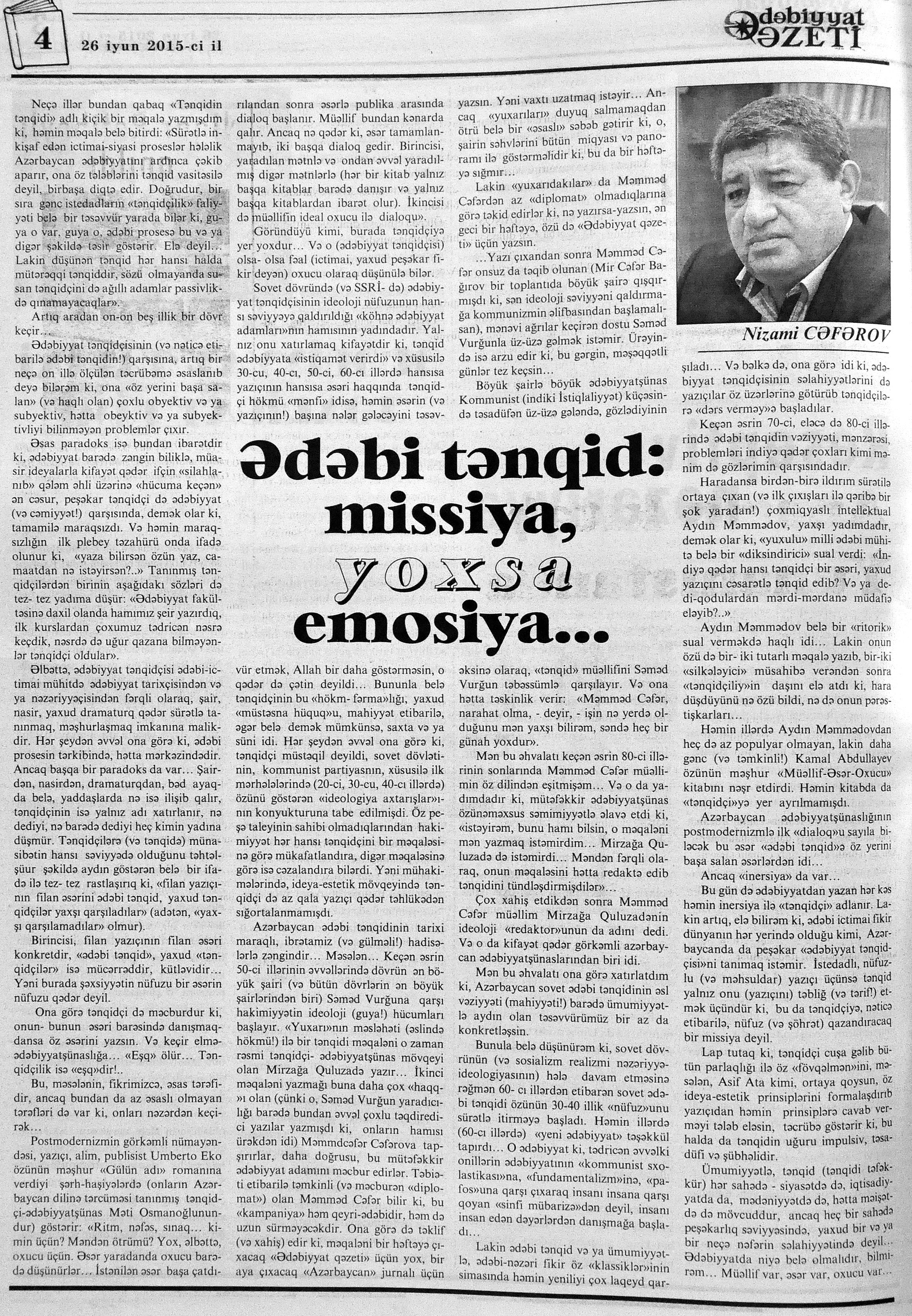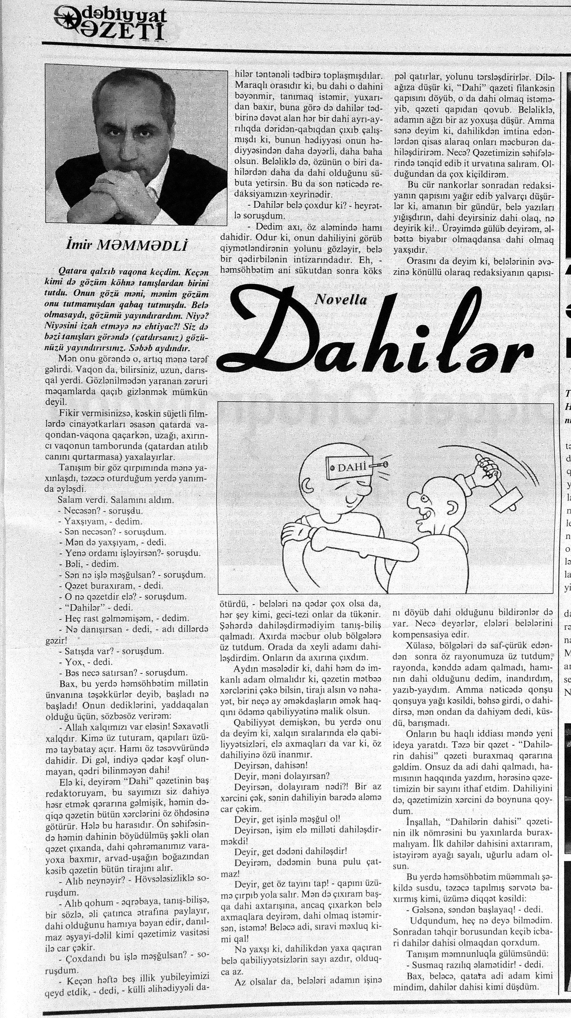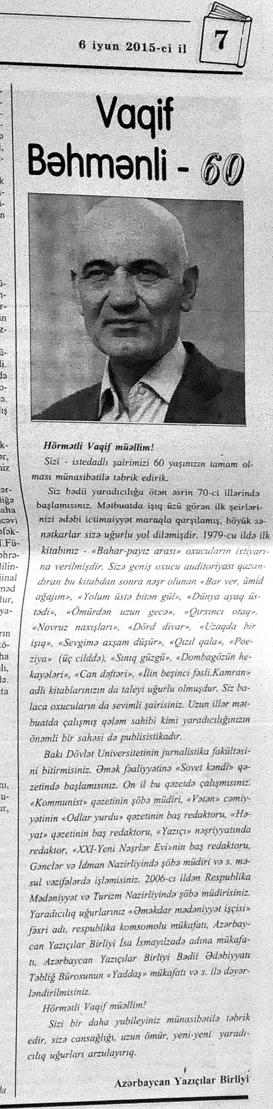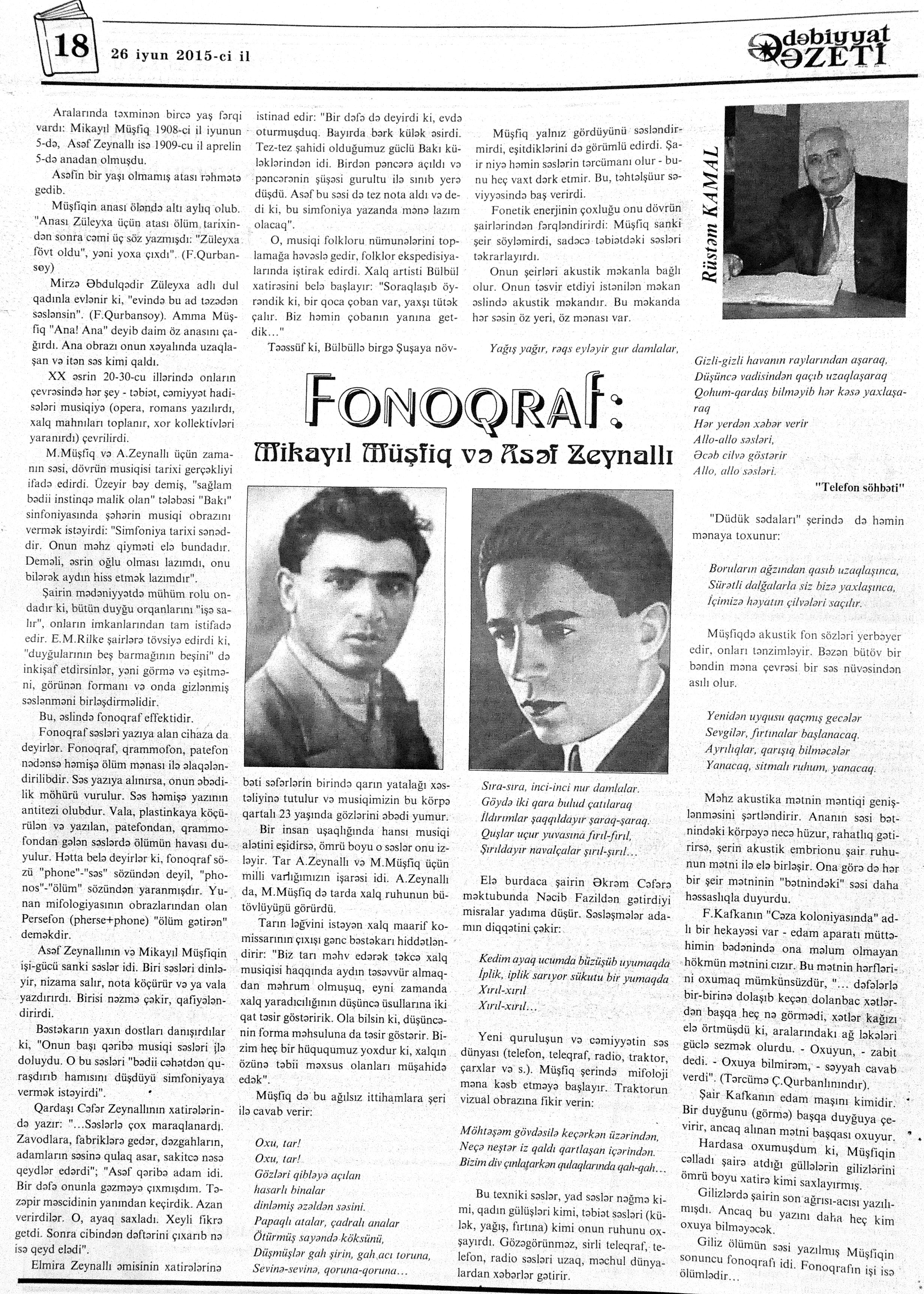 544. Kamal, Y. Əhvalatlar və rəvayətlər //Ədəbiyyat qəzeti.- 2015.- 6 iyun.- S.12-13. 545. Məmmədli, İ. Dahilər: //Ədəbiyyat qəzeti.- 2015.- 6 iyun.- S.15.