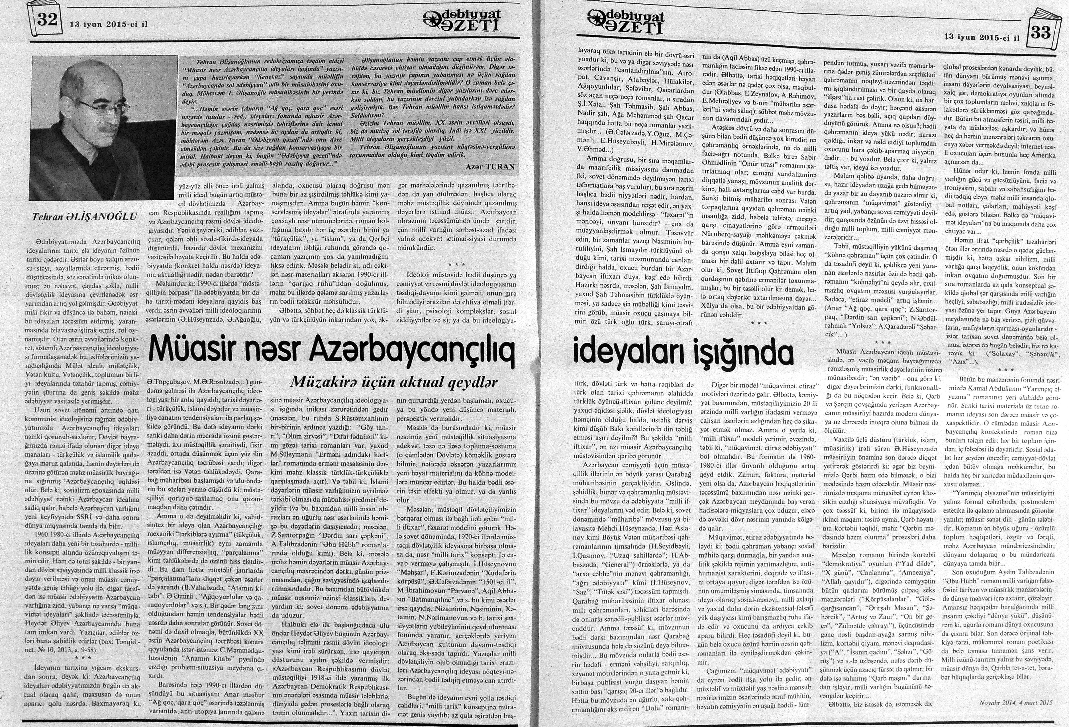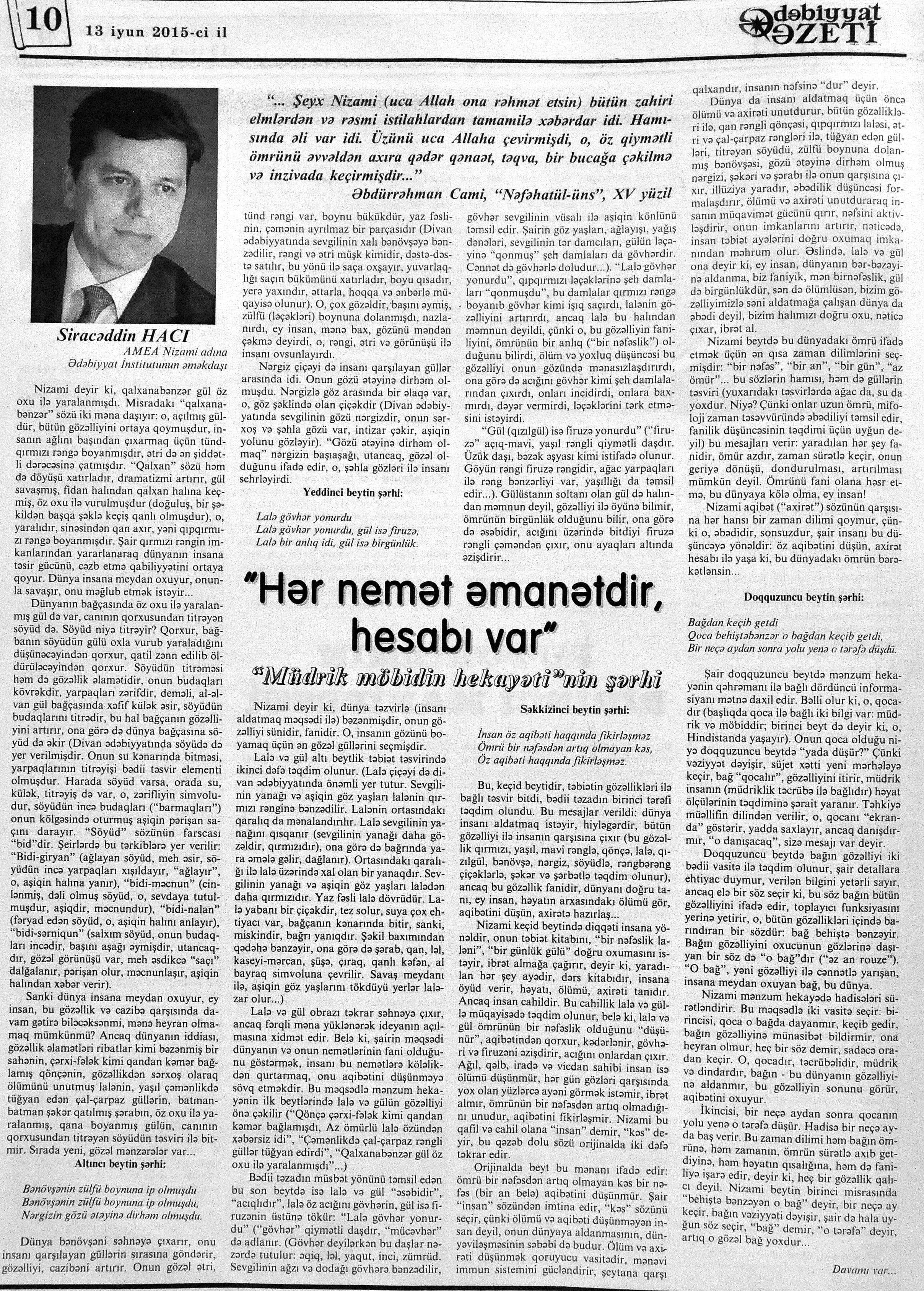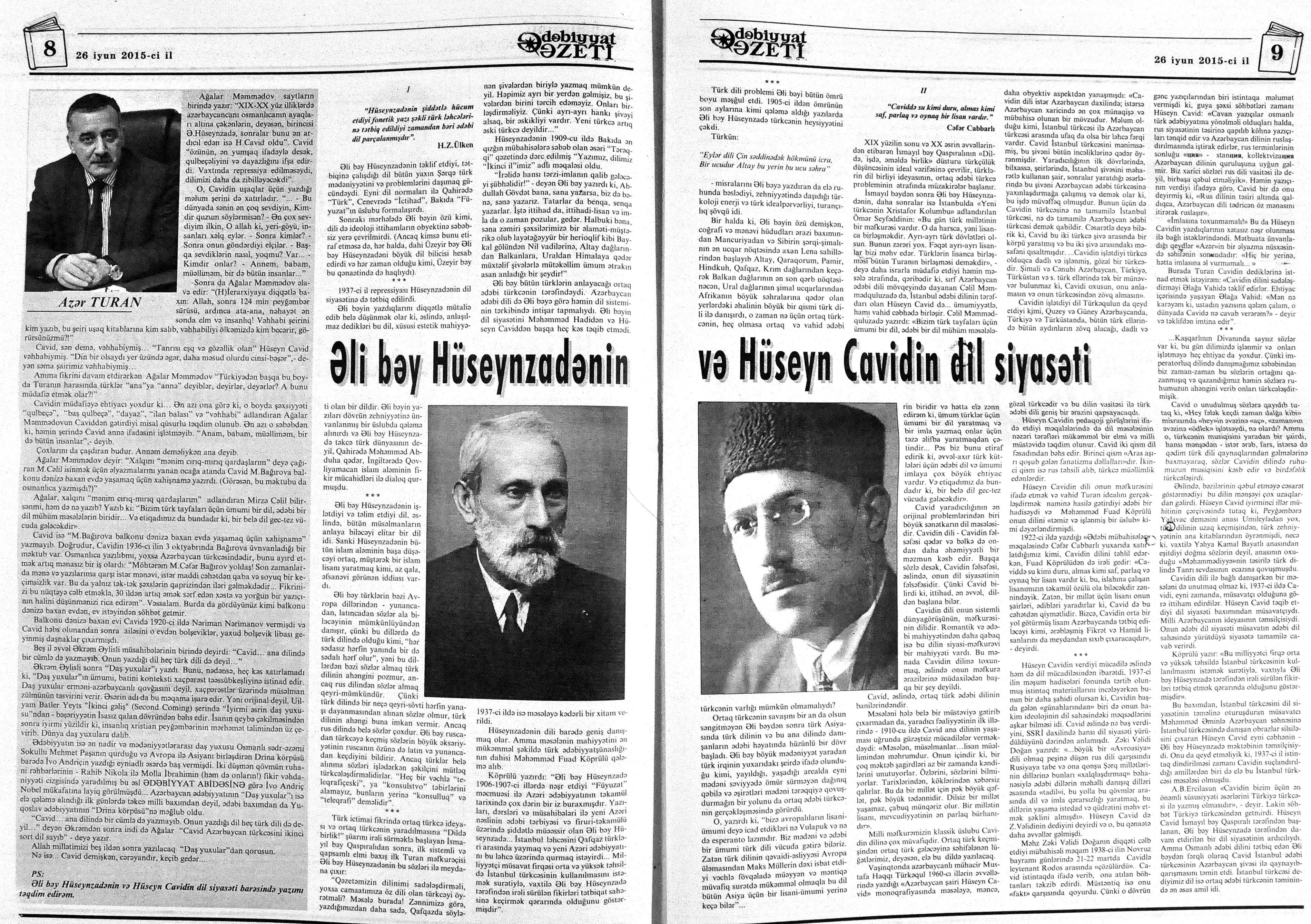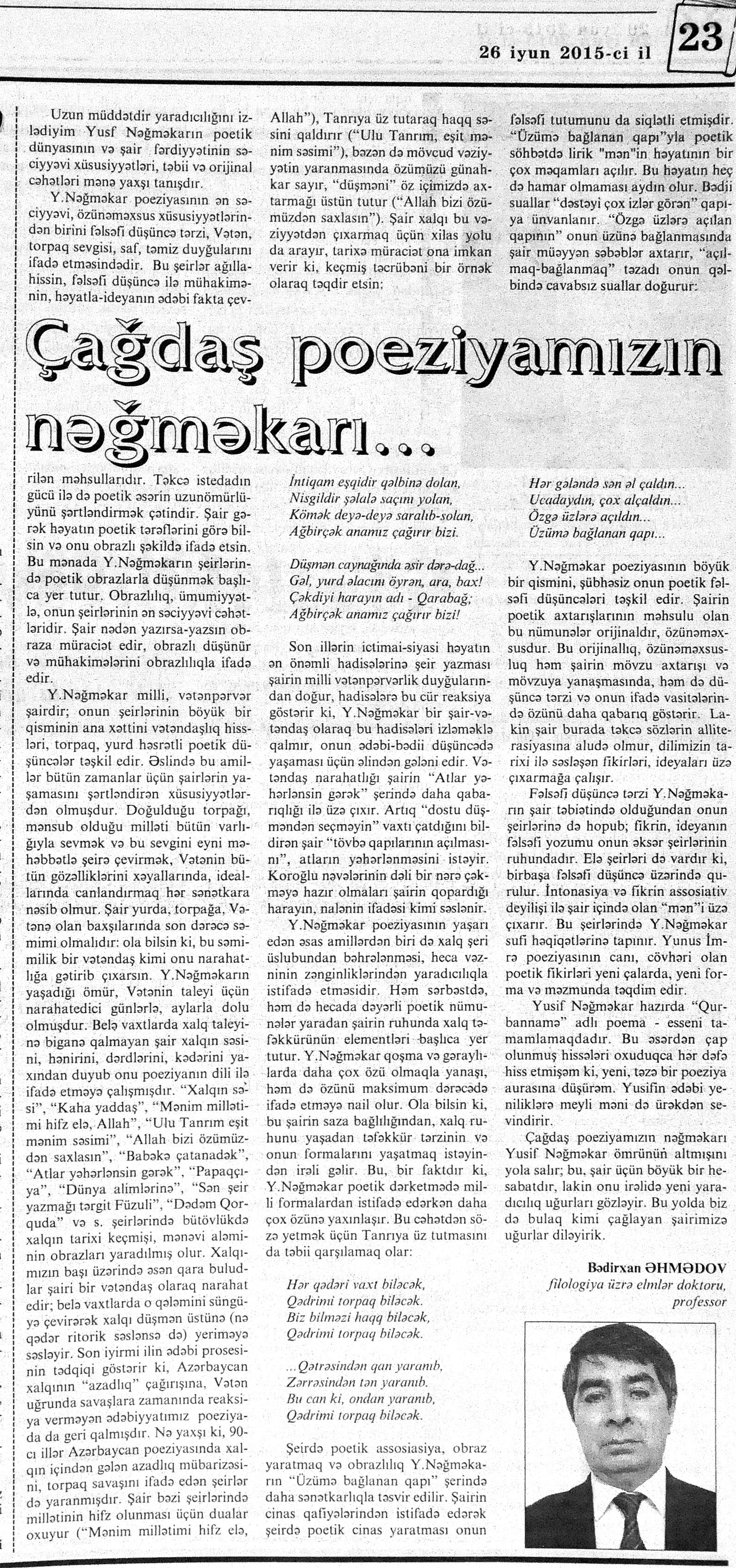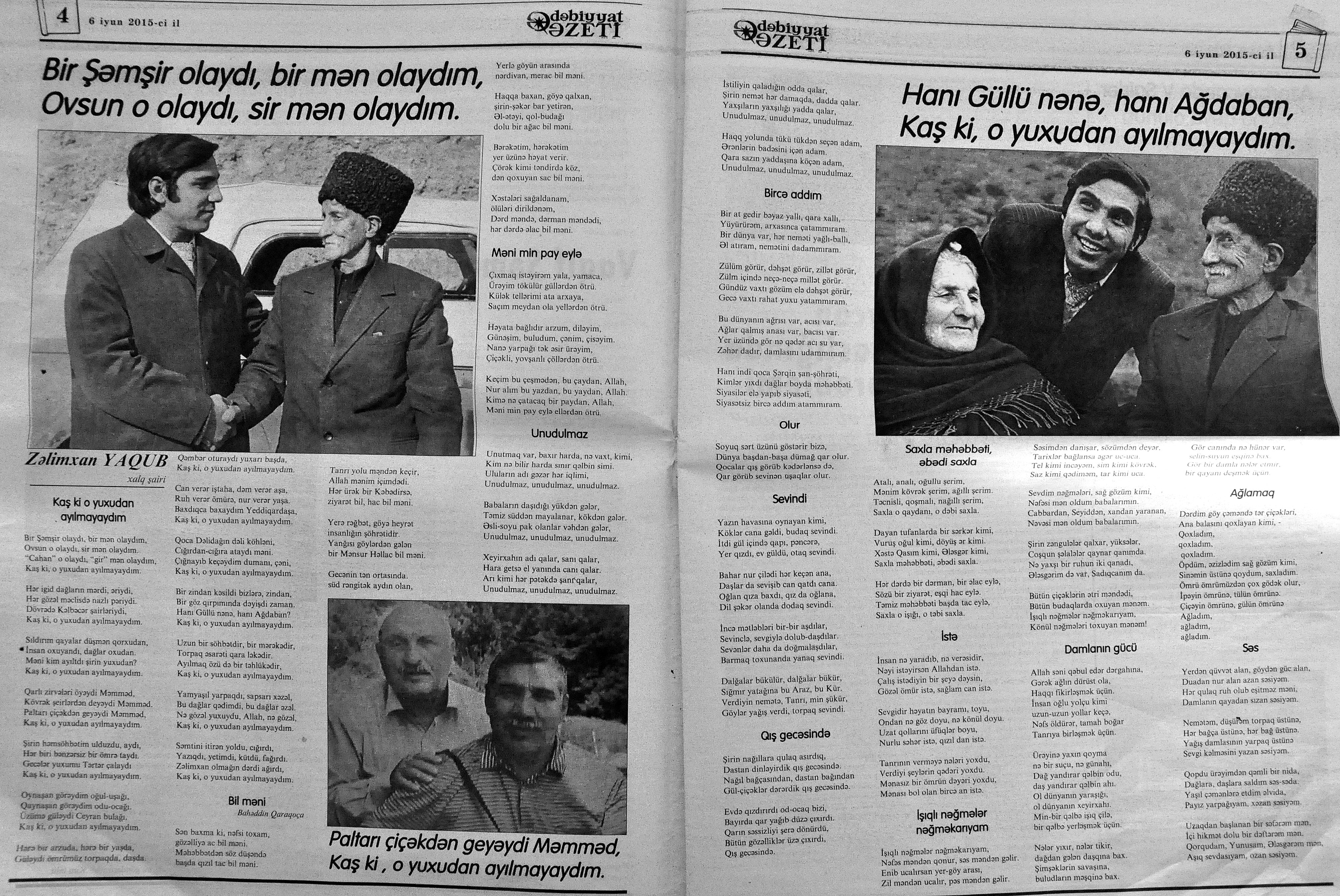 544. Kamal, Y. Əhvalatlar və rəvayətlər //Ədəbiyyat qəzeti.- 2015.- 6 iyun.- S.12-13. 545. Məmmədli, İ. Dahilər: //Ədəbiyyat qəzeti.- 2015.- 6 iyun.- S.15.
