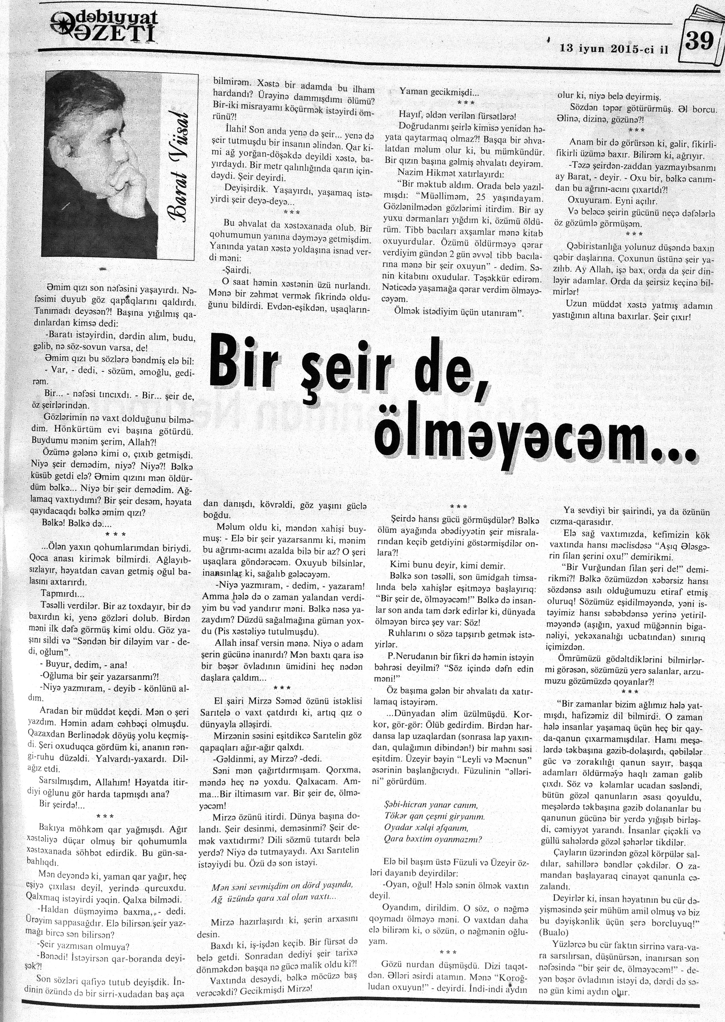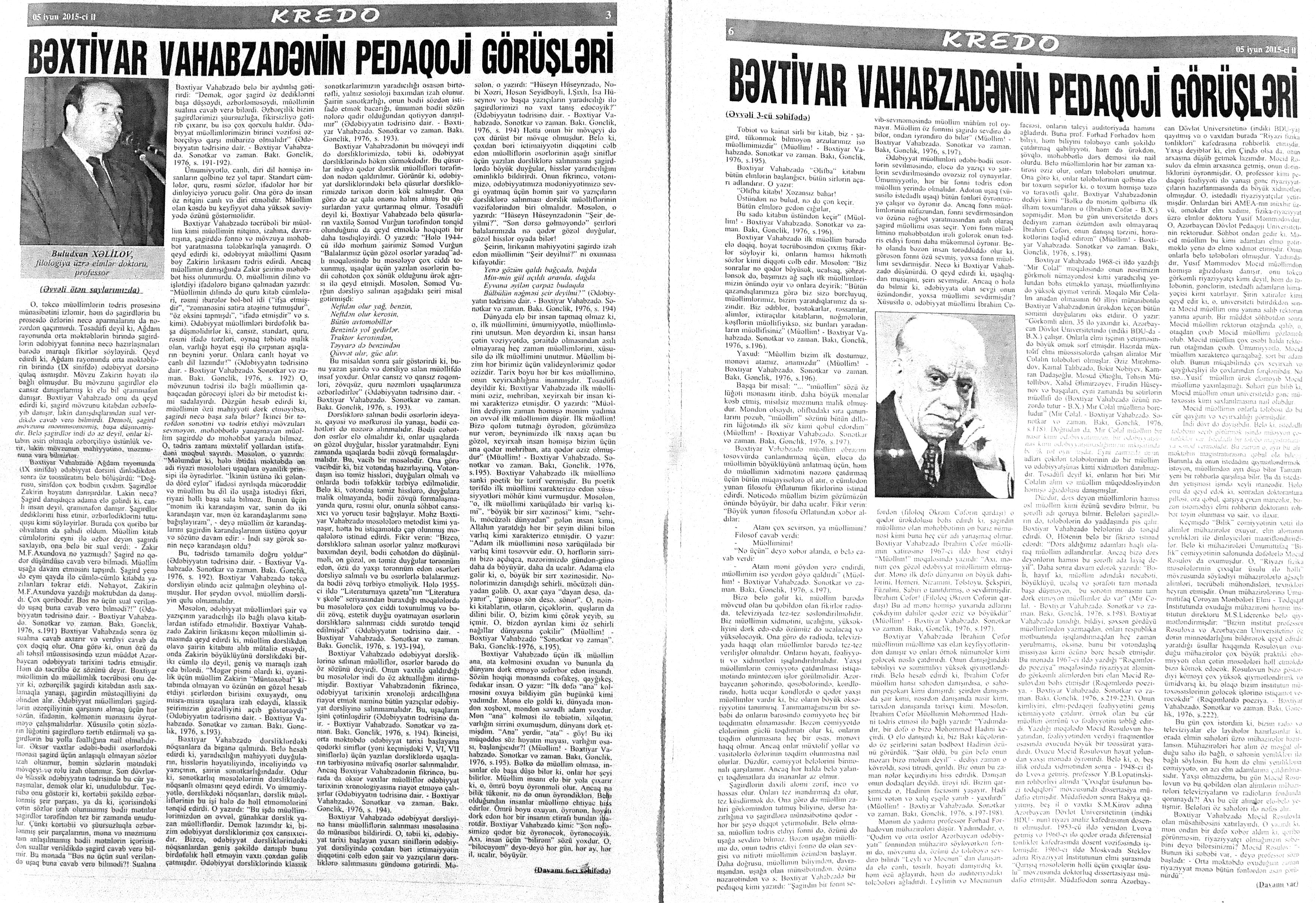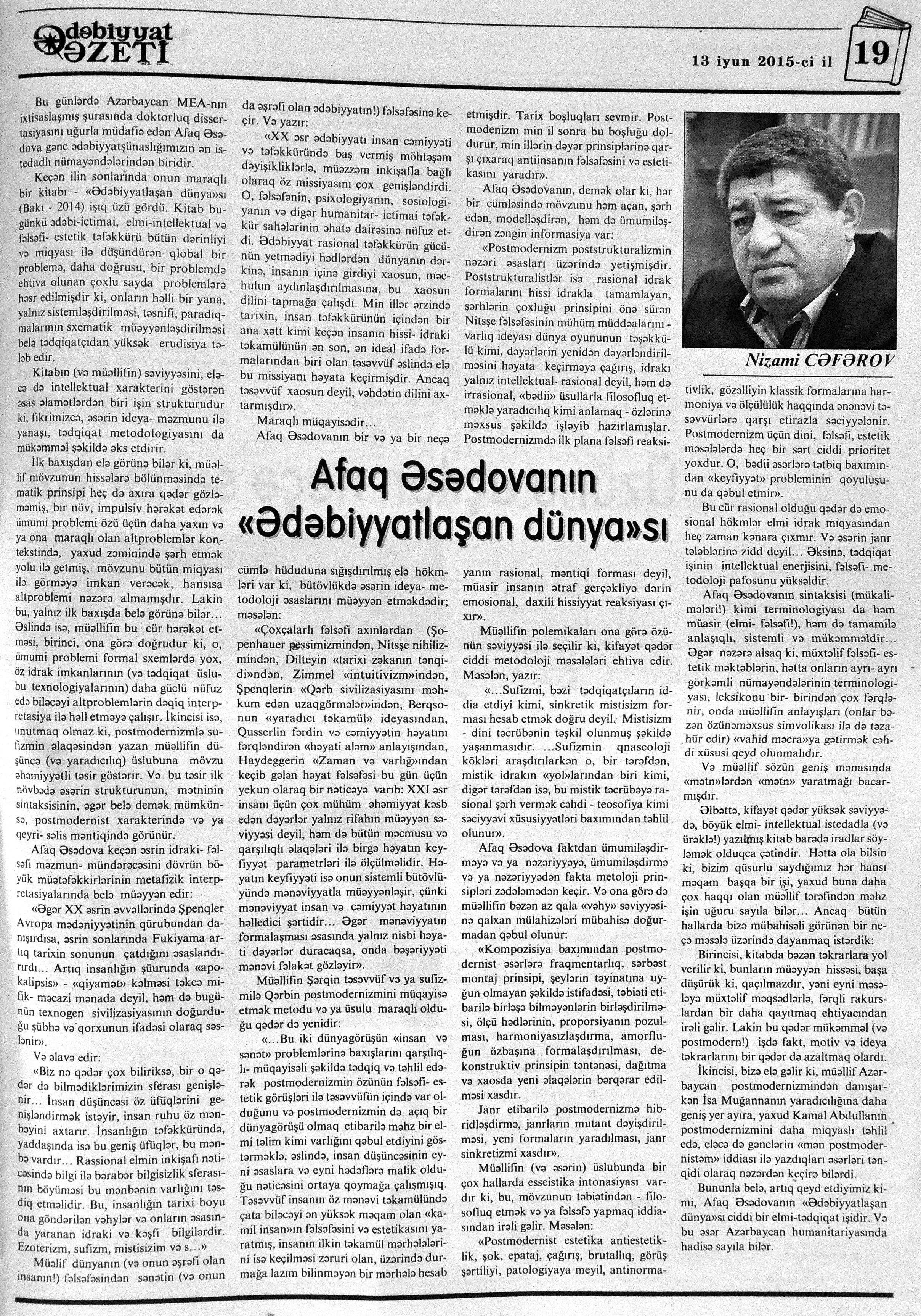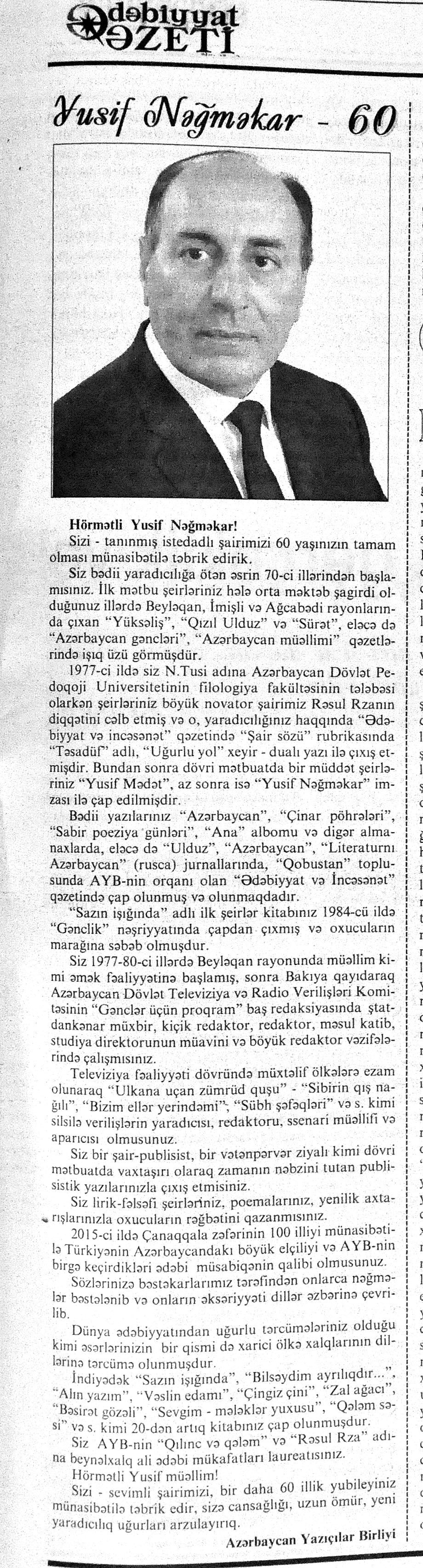 544. Kamal, Y. Əhvalatlar və rəvayətlər //Ədəbiyyat qəzeti.- 2015.- 6 iyun.- S.12-13. 545. Məmmədli, İ. Dahilər: //Ədəbiyyat qəzeti.- 2015.- 6 iyun.- S.15.