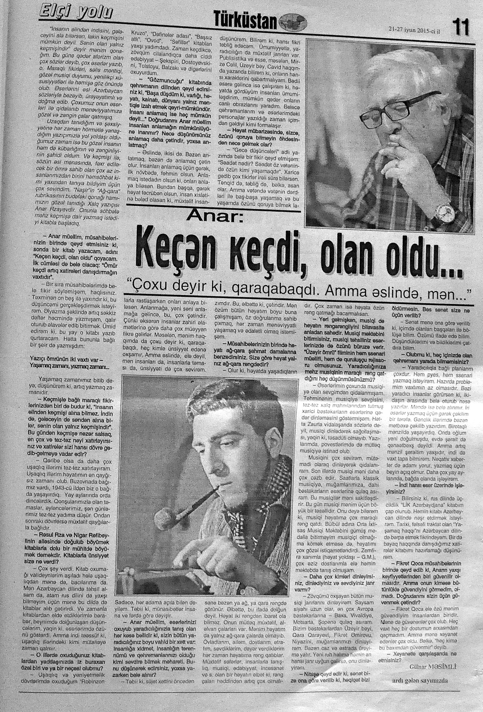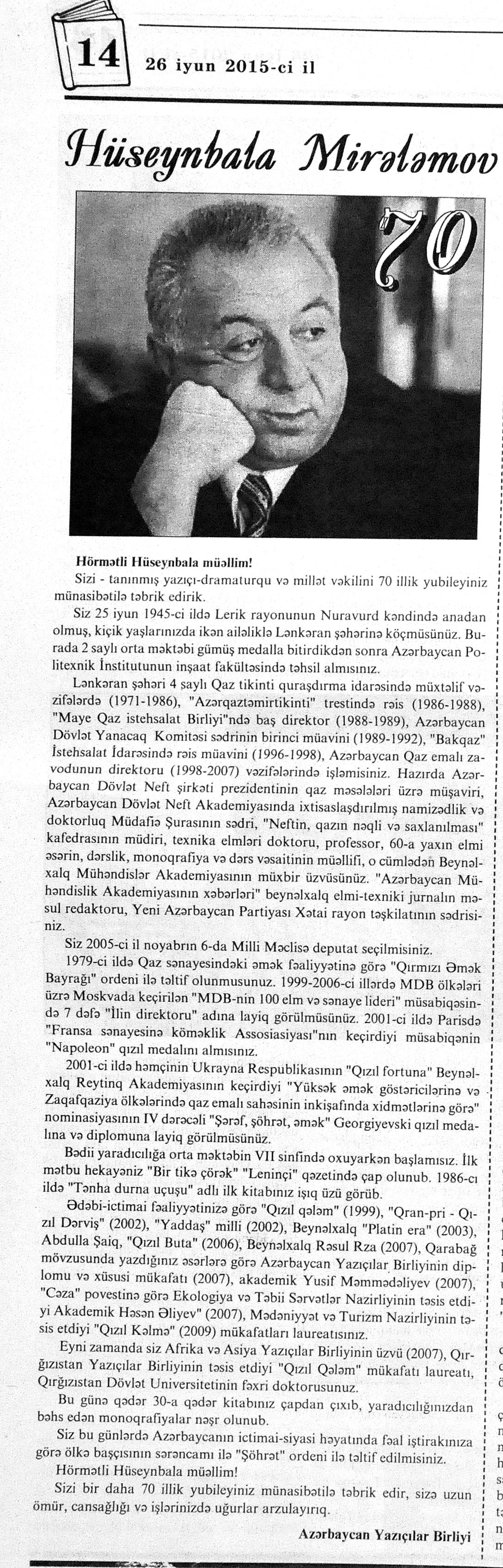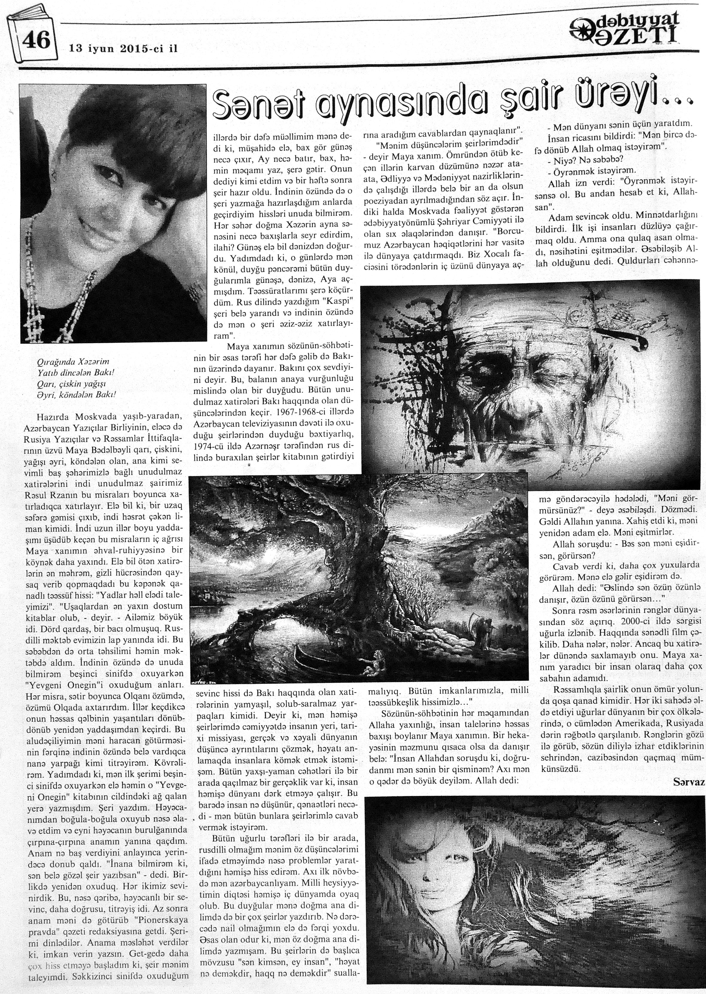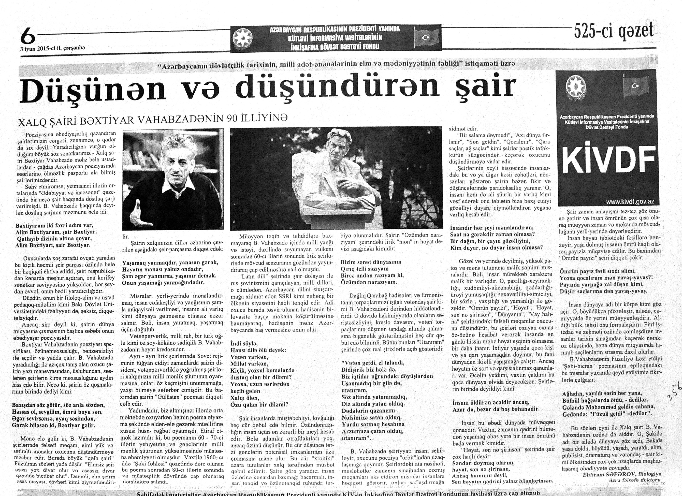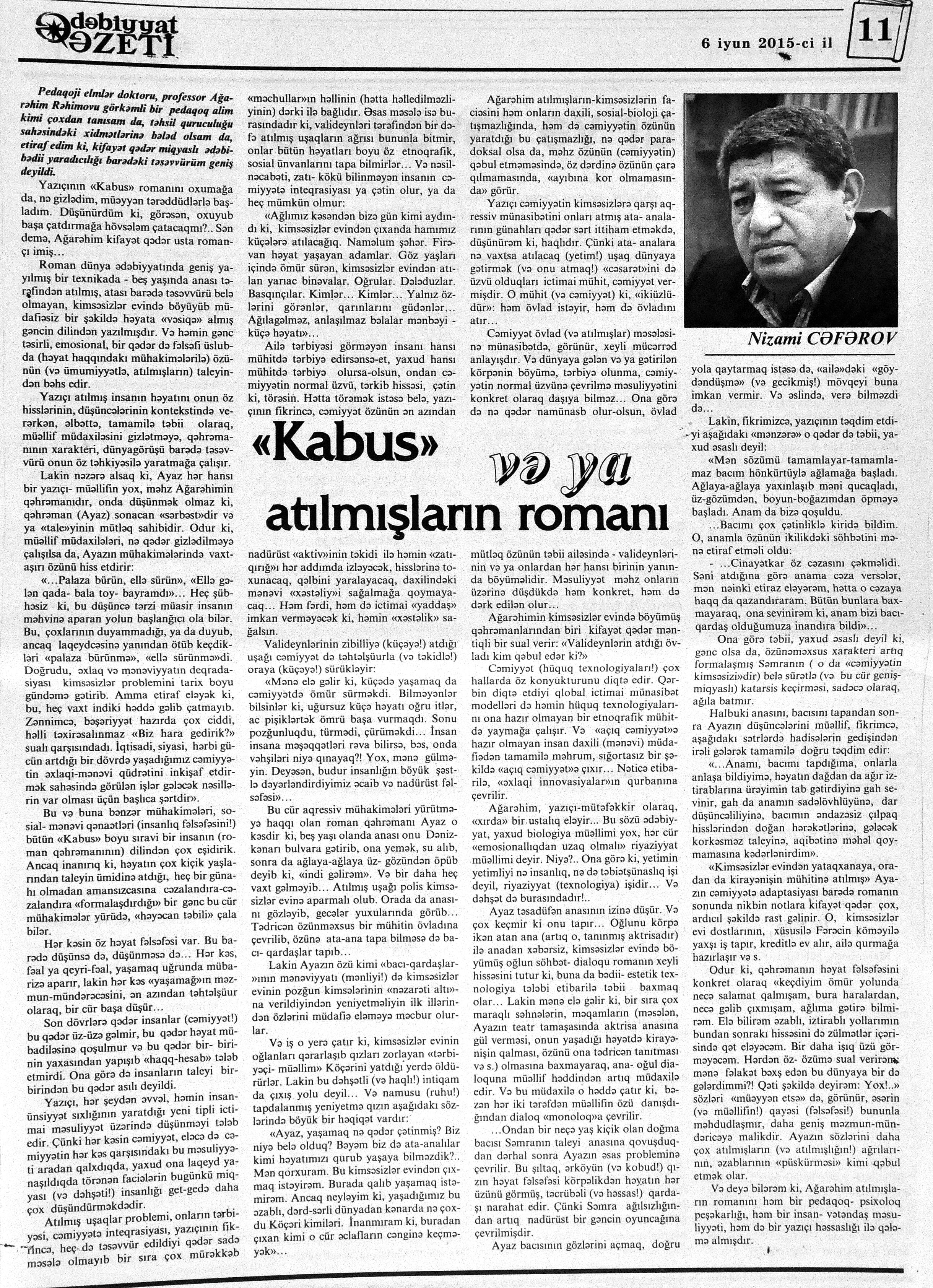 544. Kamal, Y. Əhvalatlar və rəvayətlər //Ədəbiyyat qəzeti.- 2015.- 6 iyun.- S.12-13. 545. Məmmədli, İ. Dahilər: //Ədəbiyyat qəzeti.- 2015.- 6 iyun.- S.15.