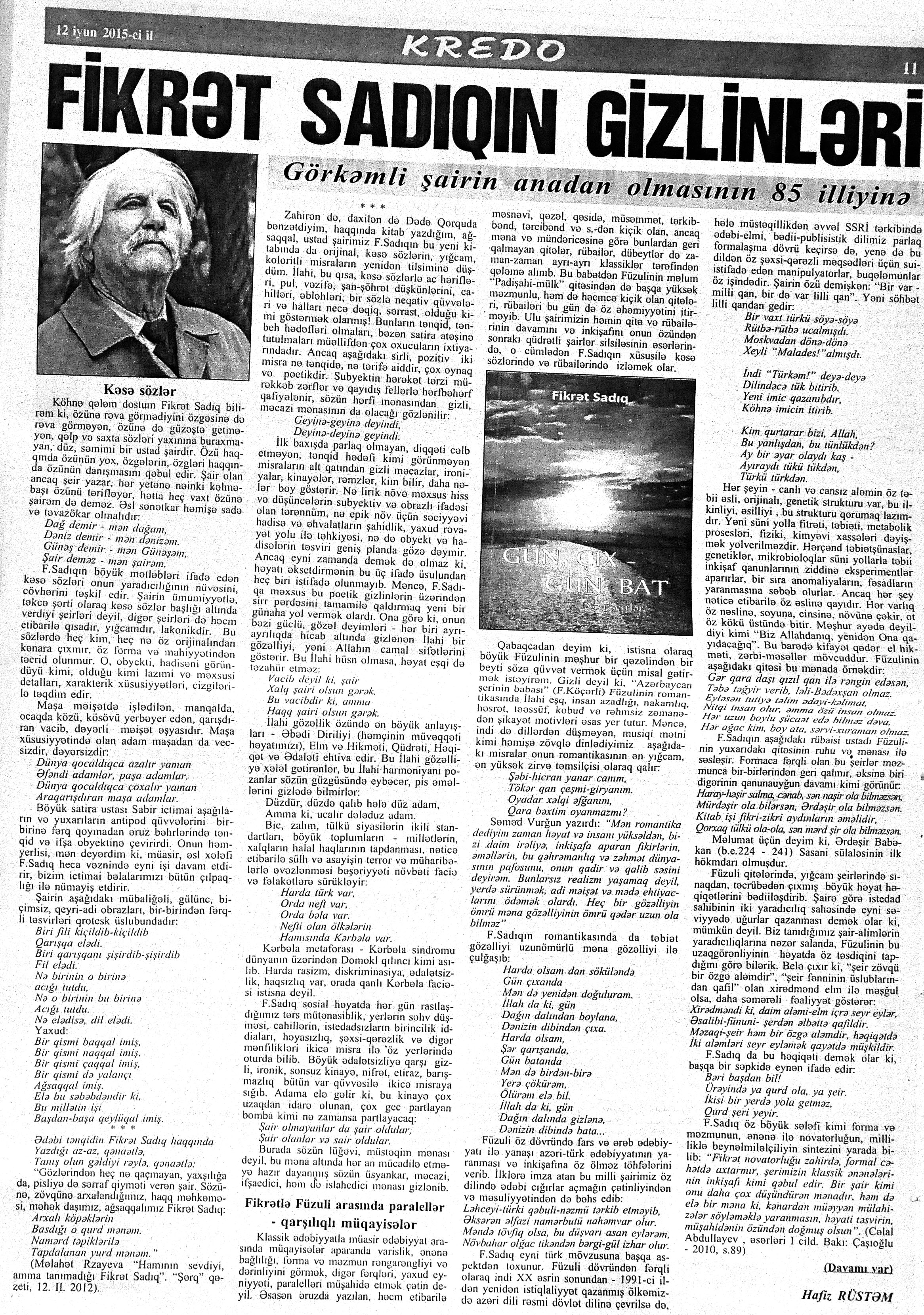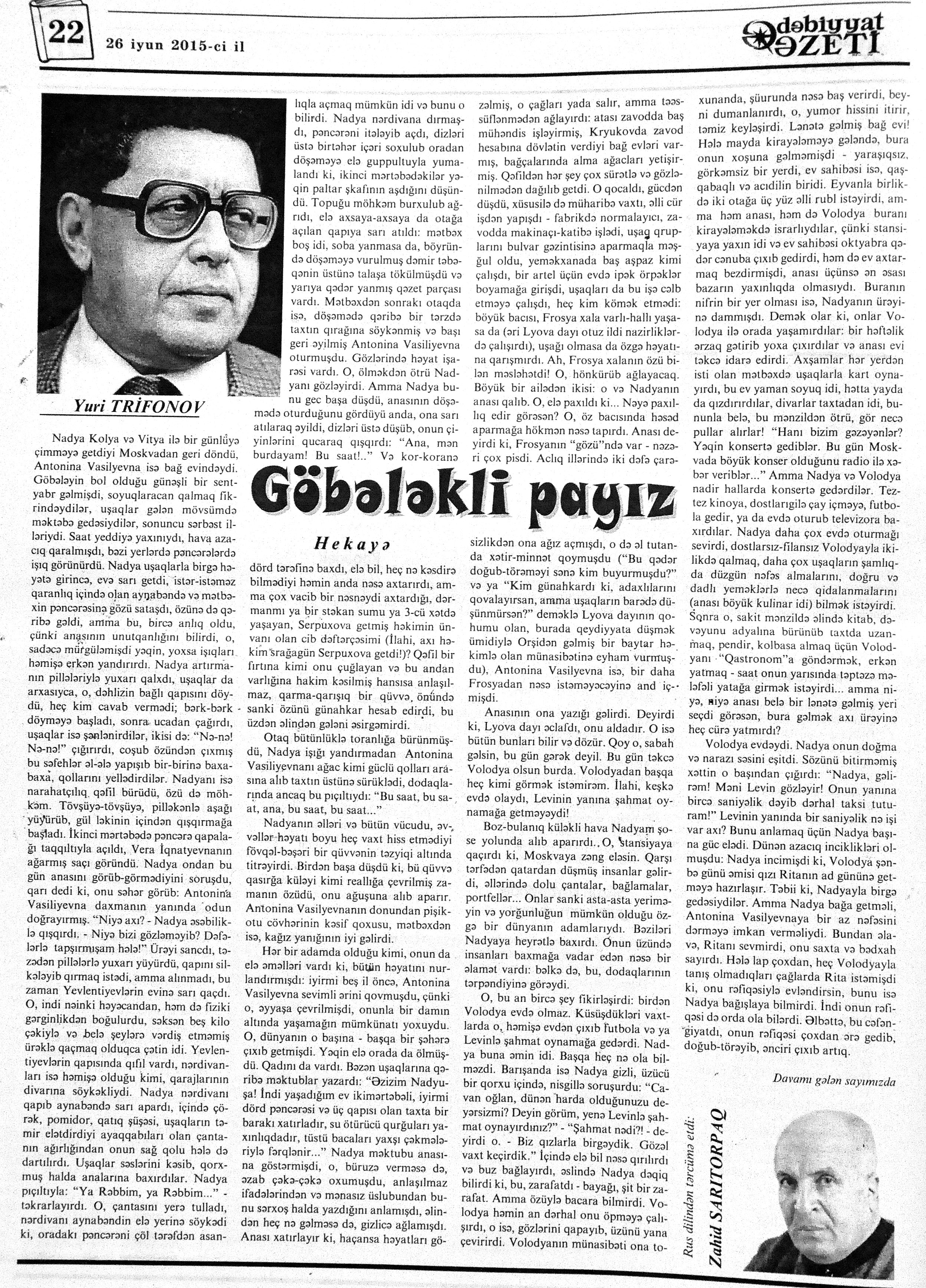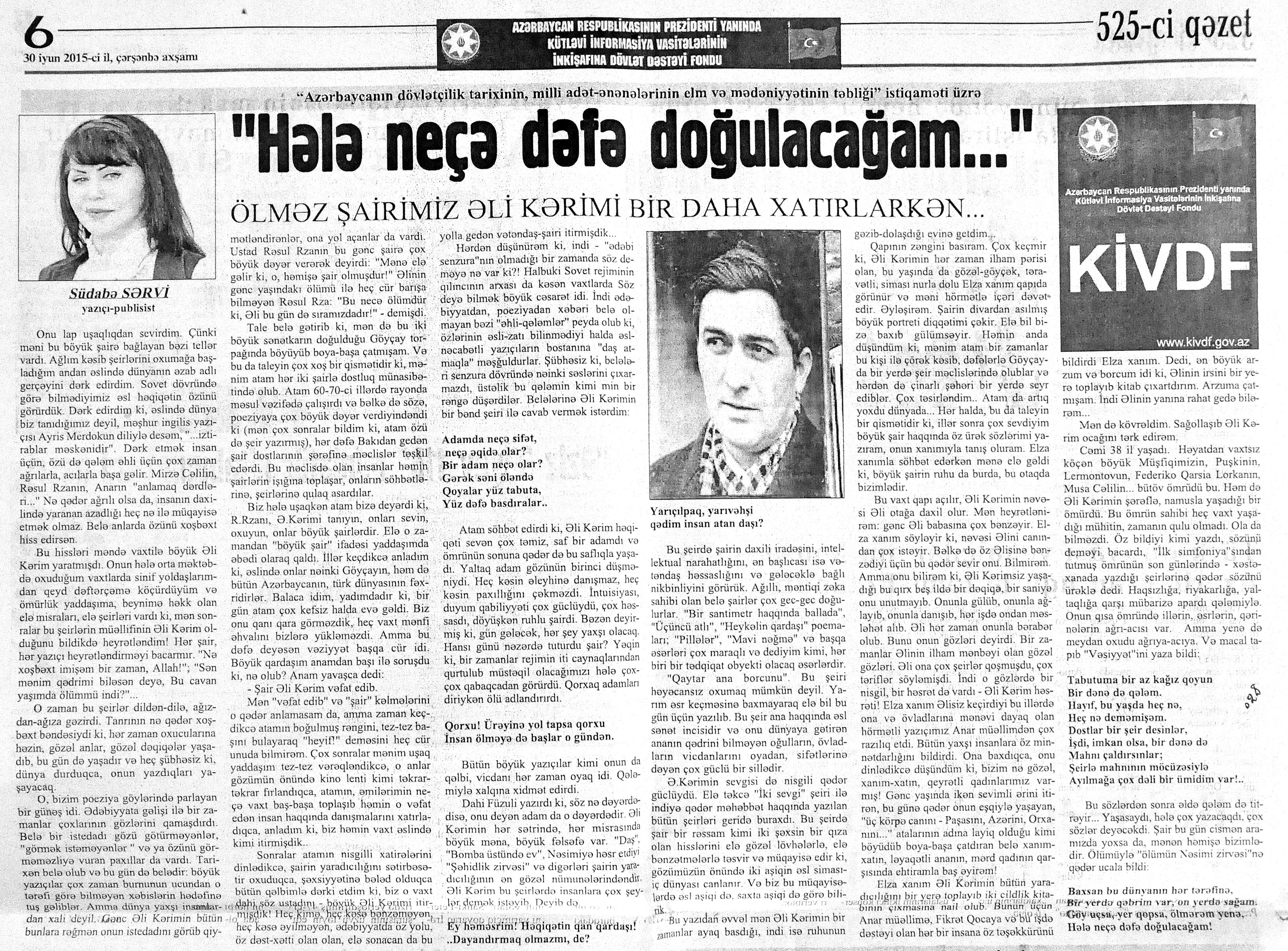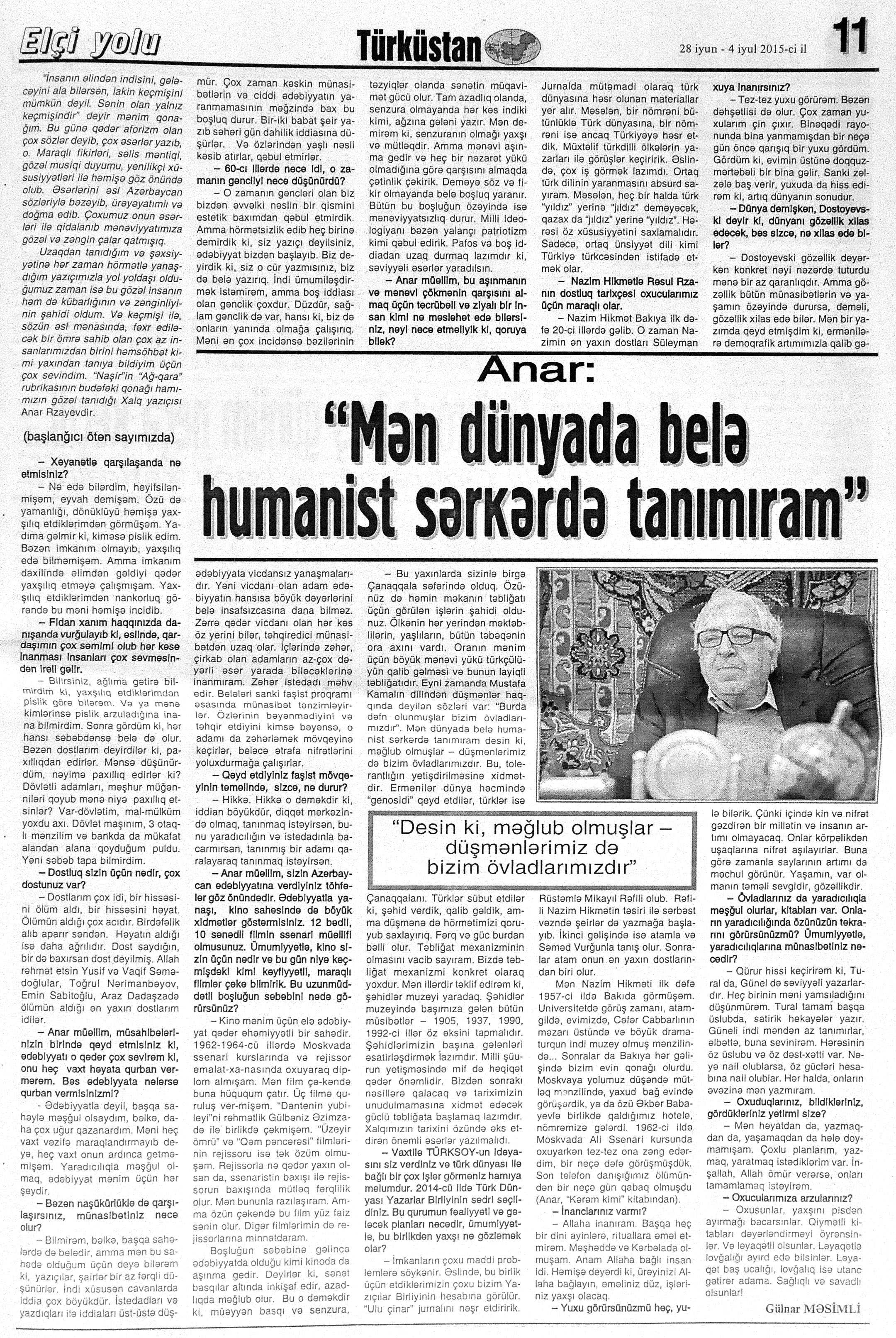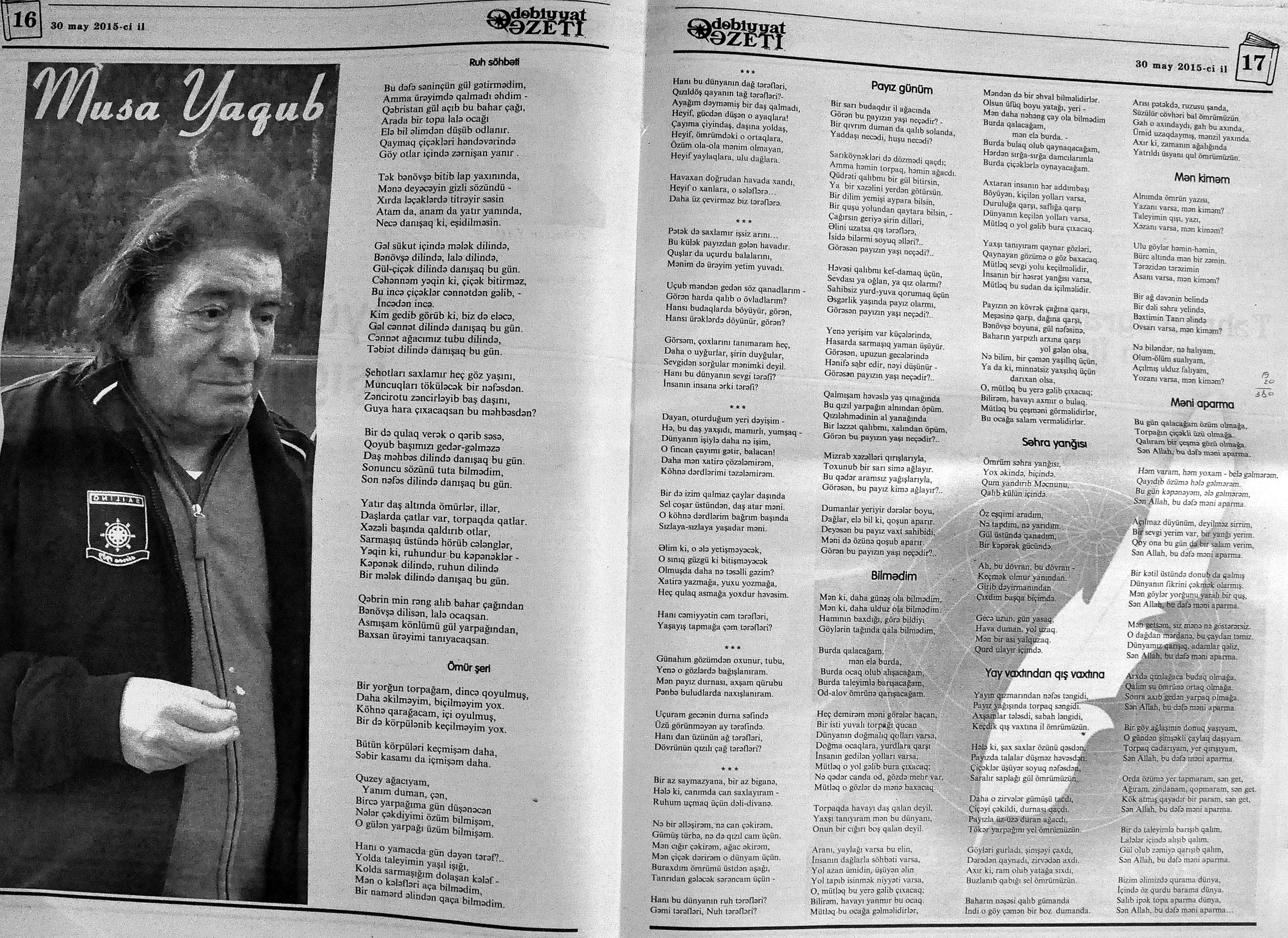 544. Kamal, Y. Əhvalatlar və rəvayətlər //Ədəbiyyat qəzeti.- 2015.- 6 iyun.- S.12-13. 545. Məmmədli, İ. Dahilər: //Ədəbiyyat qəzeti.- 2015.- 6 iyun.- S.15.