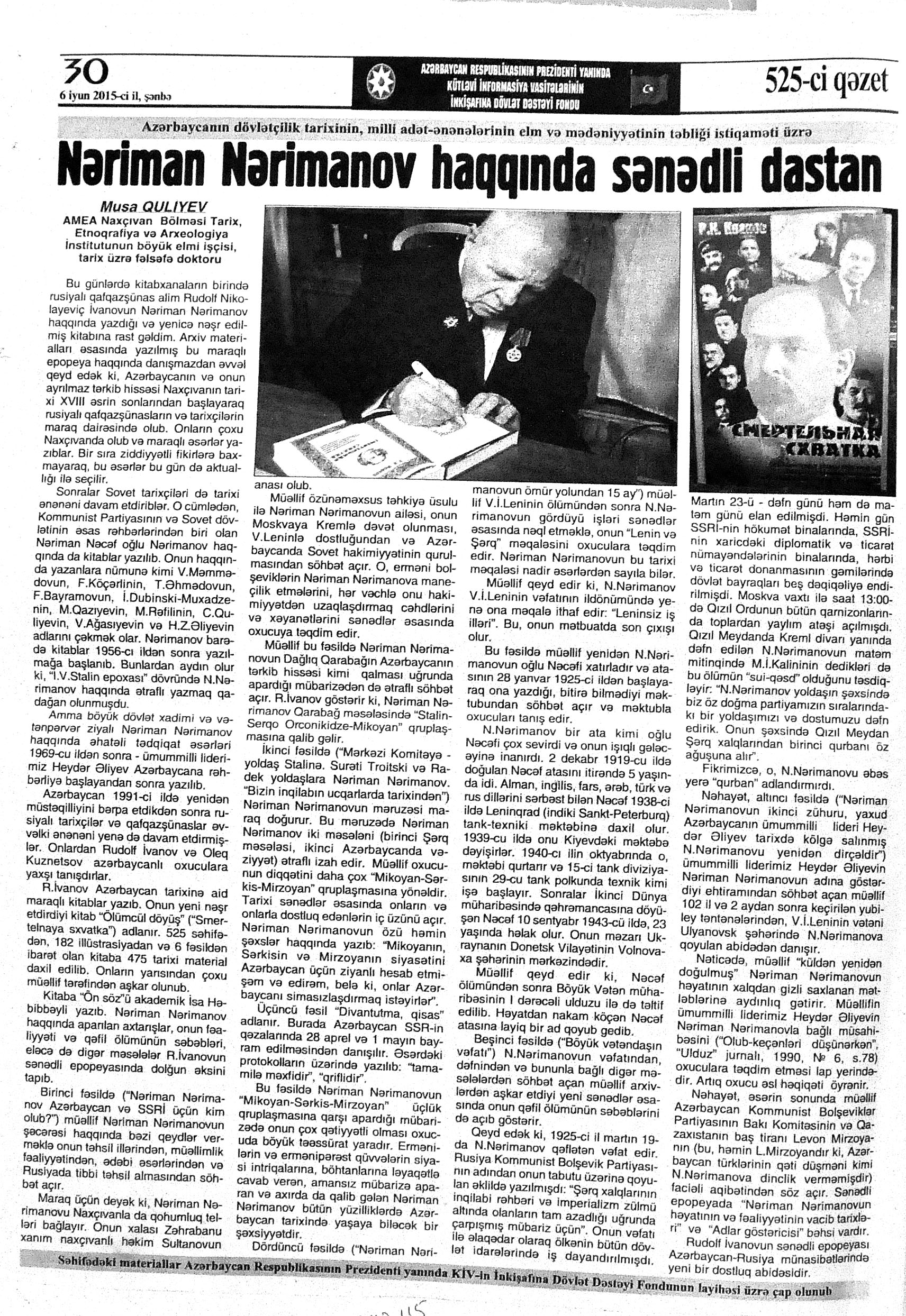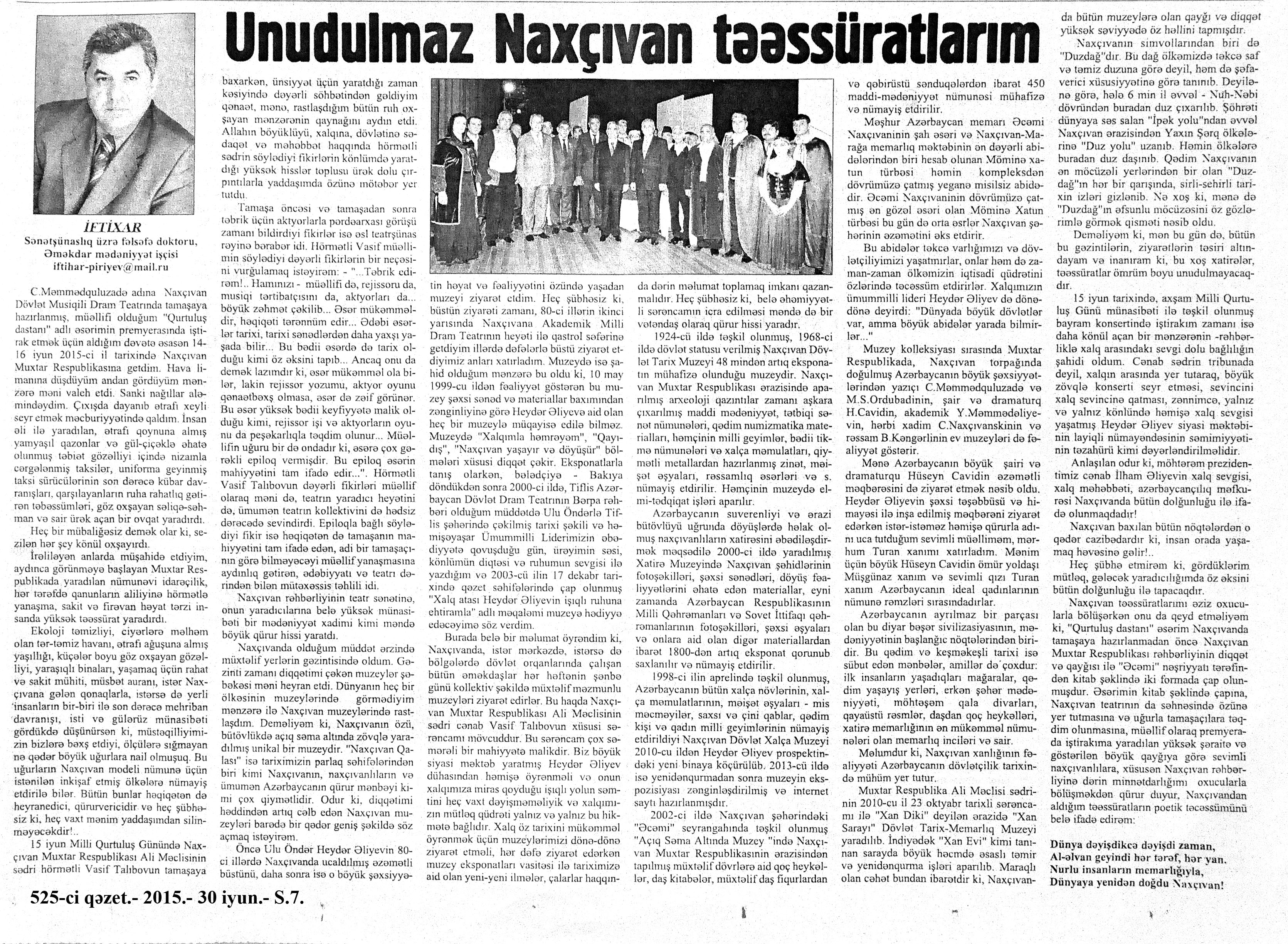 133. Qax şəhərində bayram konserti //Mədəniyyət.- 2015.- 19 iyun.- S.5. 134. “Qurtuluşa aparan yol”: [Binəqədi rayonundakı 11 saylı Uşaq musiqi məktəbində keçirilən tədbir haqqında] //Mədəniyyət.- 2015.- 12 iyun.- S.4. 135. “Məşəl kimi yanan ürək”: [Yasamal rayonundakı Heydər Əliyev Mərkəzində rayonda fəaliyyət göstərən mədəniyyət müəssisələrinin, uşaq musiqi və incəsənət məktəblərinin iştirakı ilə keçirilən tədbir haqqında] //Mədəniyyət.- 2015.- 17 iyun.- S.6. 136. Naxçıvan teatrında “Qurtuluş dastanı”: [Xalq artisti Kamran Quliyevin hazırladığı eyniadlı tamaşa haqqında] //Mədəniyyət. - 2015.- 17 iyun.- S.2. 137. Niyazinin mənzil-muzeyində Milli Qurtuluş Günü qeyd olunub //Mədəniyyət. - 2015.- 17 iyun.- S. 6. 138. Nizamiqızı, H. “Qurtuluş dastanı” Naxçıvan səhnəsində: [Kamran Quliyevin hazırladığı tamaşanın nümayişi haqqında] //Mədəniyyət.- 2015.- 24 iyun.- S.6. 139. Rəis, X. “Qurtuluş dastanı” Naxçıvanda: [C.Məmmədquluzadə adına Naxçıvan Dövlət Musiqili Dram Teatrında Kamran Quliyevin hazırladığı tamaşanın nümayişi haqqında] //Kaspi.- 2015.- 26-29 iyun.- S.12. 140. Tarixin dönüş anı: [keçirilən tədbirlər haqqında] //Mədəniyyət.- 2015.- 17 iyun.- S.14.