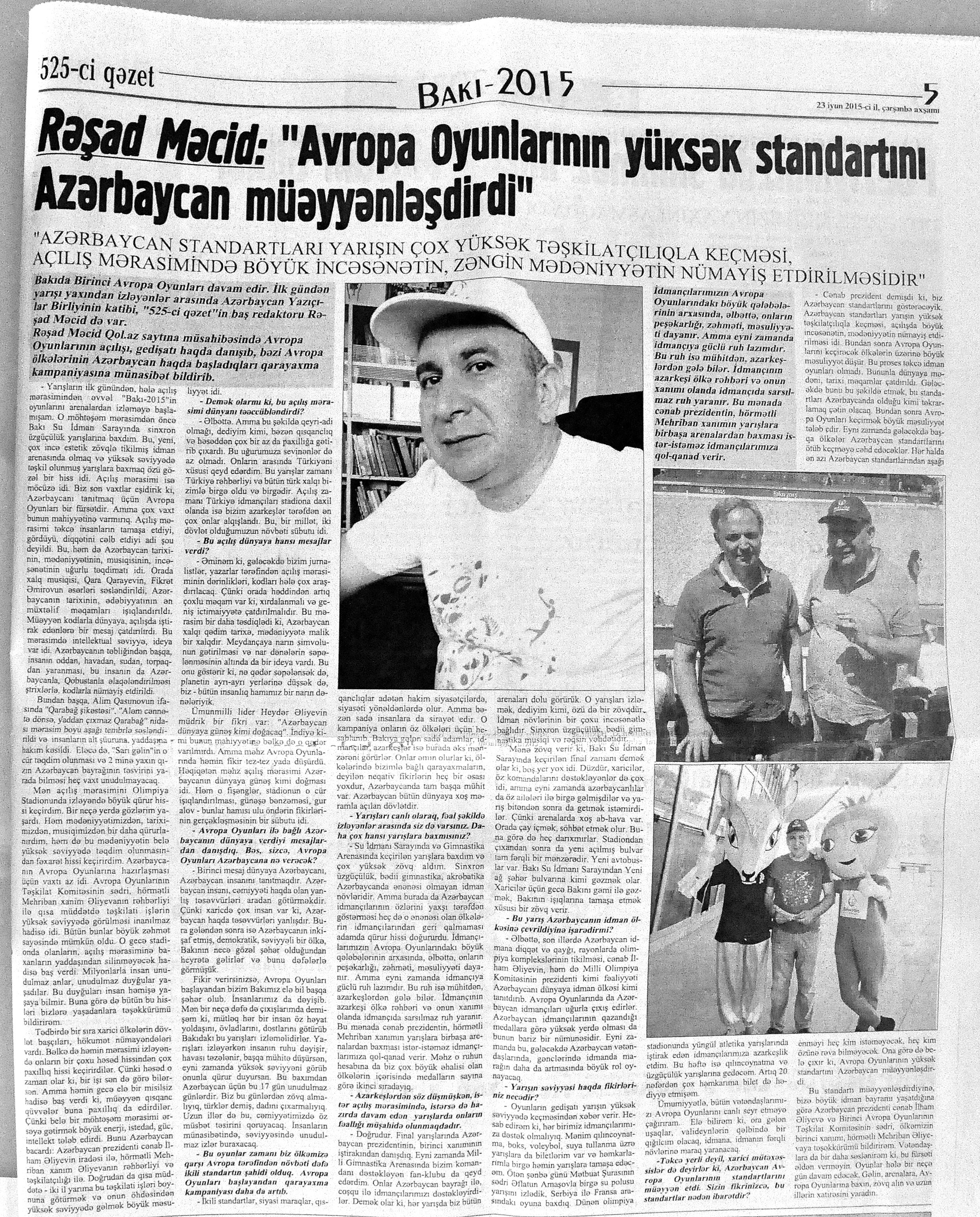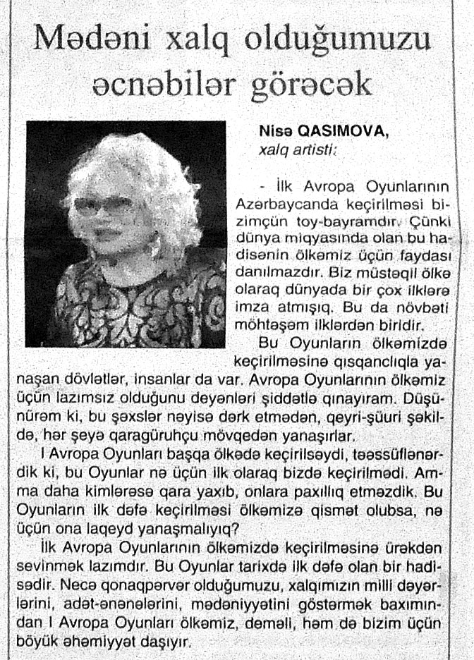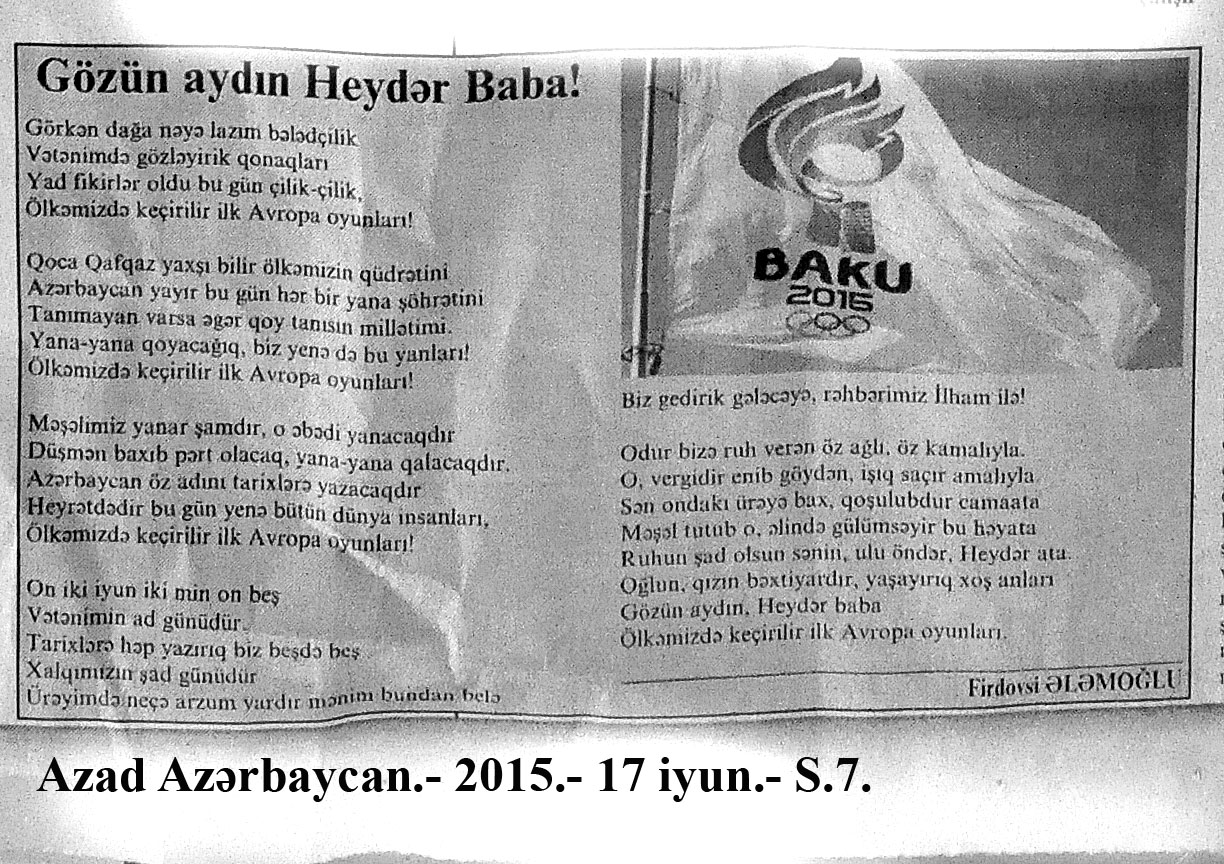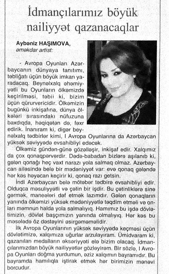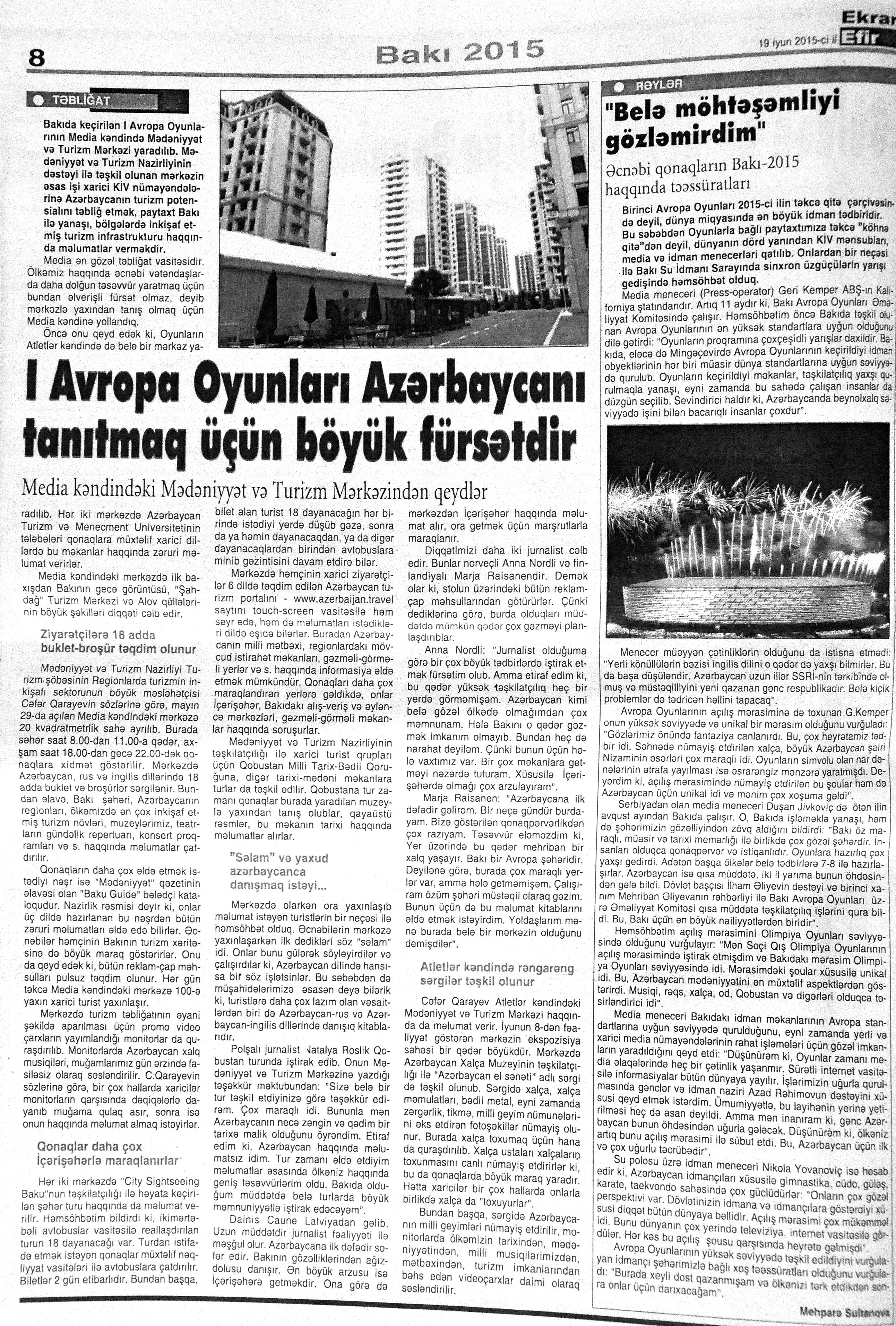 26. Abdullayeva, F. “Avropa Oyunları Azərbaycanda nəyi dəyişdirdi?” //Mədəniyyət.- 2015.- 19 iyun.- S.9. 27. Abdullayeva, F. Avropa Oyunları ölkəmizin təbliğatı üçün böyük fürsətdir: Media kəndindəki Mədəniyyət və Turizm Mərkəzindən zəngin təəssüratla //Mədəniyyət.- 2015.- 17 iyun.- S.7. 28. Abdullayeva, F. Avropa Oyunları turizm sektoru üçün yeni imkanlar açır: Ölkəmizə gələn turist sayında ciddi artım müşahidə edilir //Mədəniyyət.- 2015.- 24 iyun.- S.9. 29. Abdullayeva, F. Avropa Oyunları və turizm sektoru: Oyunlar müddətində Bakıdakı hotellərdə qonaqlara “Azerbaijan breakfast” brendli səhər yeməyi təklif olunacaq //Mədəniyyət.- 2015.- 5 iyun.- S.7. 30. Abdullayeva, F. Azərbaycanlı turistlər elektron ödəmədən daha çox istifadə edirlər //Mədəniyyət.- 2015.- 5 iyun.- S.7. 31. Abdullayeva, F. Bakı Avropanın idman paytaxtı olacaq: Avropa Oyunları ölkəmizdə turizmin inkişafına təkan verəcək //Mədəniyyət.- 2015.- 5 iyun.- S.7. 32. Abdullayeva, F. Çelyabinskidə Avropa Oyunlarına həsr edilən dostluq bayramı keçirilib //Azərbaycan.- 2015.-28 iyun.- S.14. 33. Abdullayeva, F. “City Sightseeing Baku” avtobusu ilə şəhər gəzintisi: Tur iştirakçıları təəssüratlarını qəzetimizlə bölüşdülər //Mədəniyyət.- 2015.- 26 iyun.- S.9. 34. Abdullayeva, F. Xorvatiyanın turizm imkanlarına həsr olunmuş görüş keçirilib //Mədəniyyət.- 2015.- 26 iyun.- S.8. 35. Abdullayeva, F. Qonaqlar Bakının mədəni irsinə xüsusi maraq göstərirlər //Mədəniyyət.- 2015.- 24 iyun.- S.9. 36. Abdullayeva, F. Qubaya turist axını artıb //Mədəniyyət.- 2015.- 19 iyun.- S.9. 37. Abdullayeva, F. Paytaxtımız Avropanın ən maraqlı 10 şəhəri siyahısında //Mədəniyyət.- 2015.- 24 iyun.- S.9. 38. Abdullayeva, S. Azərbaycanın turizm potensialı Dnepropetrovskda sərgilənir: [fotosərginin keçirilməsi haqqında] //525-ci qəzet.- 2015.- 24 iyun.- S.7; Mədəniyyət.- 2015.- 24 iyun.- S.8. 39. Abdullayeva, S. “Xoşbəxt anlar” başlanır: [eyniadlı fotomüsabiqənin başlanması haqqında] //525-ci qəzet.- 2015.- 18 iyun.- S.7. 40. Abdullayeva, S. “Qız qalası” beynəlxalq incəsənət festivalı başlanıb //525-ci qəzet.- 2015.- 12 iyun.- S.7. 41. Abdullayeva, S. “Qala” Qoruğunda daha bir beynəlxalq sərgi açılıb: [“VI Qız Qalası” Beynəlxalq İncəsənət Festivalının bağlanış mərasimi haqqında] //525-ci qəzet.- 2015.- 17 iyun.- S.7. 42. Abdullayeva, S. Muzey Mərkəzində “Kofe rəngi” sərgilənir: [rəsm əsərlərindən ibarət olan sərgidə Mədəniyyət və Turizm nazirinin müavini Ədalət Vəliyev çıxış edib] //525-ci qəzet.- 2015.- 23 iyun.- S.7. 43. Amerikalı alimlər Gənc Tamaşaçılar Teatrında //Mədəniyyət.- 2015.- 24 iyun.- S.3. 44. Avropa Oyunları Azərbaycanı dünyada tanıdır: [Aşıq Şəmşir” Mədəniyyət Ocağı İctimai Birliyində (İB) keçirilən tədbir haqqında] //Mədəniyyət.- 2015.- 26 iyun.- S.5. 45. Avropa Oyunları gənclərin təfəkküründə: [Qazax Rayon Mərkəzi Kitabxanasında keçirilən tədbir haqqında] //Mədəniyyət.- 2015.- 10 iyun.- S.11. 46. Avropa Oyunları günlərində Bakıda konsert proqramları //Mədəniyyət.- 2015.- 17 iyun.- S.3. 47. Avropa Oyunlarının Bakıda keçirilməsi türk dünyasının qürurudur //Mədəniyyət.- 2015.- 19 iyun.- S.4. 48. Avropa Oyunlarının “muzey gecələri” //Mədəniyyət.- 2015.- 5 iyun.- S.9. 49. Avropa Oyunlarının sənət çələngi: [Mədəniyyət və Turizm Nazirliyinin yerli sakinlər və ölkəmizə gələn turistlər üçün təşkil etdiyi konsert proqramları haqqında] //Mədəniyyət.- 2015.- 24 iyun.- S.3. 50. Avstraliya jurnalında Azərbaycan haqqında məqalə //Mədəniyyət.- 2015.- 24 iyun.- S.8; S.16 51. Aydəmirov, A. Odla oynayan oğlan: [Dövlət Rəqs Ansanbılının solisti Aydəmir Aydəmirovla müsahibə] /müsahibəni apardı Xəyalə Rəis //Kaspi.- 2015.- 19 iyun.- S.17. 52. Azərbaycan I Avropa Oyunlarının açılış mərasimində tarixini, mədəniyyətini, musiqisini və müasirliyini dünyaya təqdim edə bildi //Azərbaycan.- 2015.- 14 iyun.- S.8. 53. Azərbaycanın inkişafı, zəngin mədəniyyəti avstraliyalı jurnalistın gözü ilə: [Ben Qroundvaterin Azərbaycan haqqında təəssüratları] //Azərbaycan.- 2015.- 20 iyun.- S.12. 54. Azəri, L. “Cəngi” qələbəyə çağırış deməkdir : I Avropa Oyunlarına həsr olunmuş konsert atletlərimizin qələbələrinə musiqi töhfəsi oldu: [Rəşid Behbudov adına Mahnı Teatrında Mədəniyyət və Turizm Nazirliyinin təşkil etdiyi konsert proqramı haqqında] //Mədəniyyət.- 2015.- 24 iyun.- S.4. 55. Azəri, L. “Əsrlərin yaddaşı”: Avropa Oyunları ərəfəsində milli geyimlərimizi təbliğ edən layihənin təqdimatı keçirildi: [İçərişəhər Dövlət Memarlıq Qoruğunun “Muğam klubu”nda] //Mədəniyyət.- 2015.- 3 iyun.- S.3. 56. Azəri, L. Qədim Musiqi Alətləri Ansamblının idman bayramına töhfəsi: [Musiqi Mədəniyyəti Dövlət Muzeyinin nəzdində fəaliyyət göstərən Qədim Musiqi Alətləri Dövlət Ansamblının təşkil etdiyi konsert proqramı haqqında] //Mədəniyyət.- 2015.- 26 iyun.- S.7. 57. Azəri, L. Teatrlardakı yeniliklər qonaqların ürəyincədir: “Əslində biz yarışlara gəlmişdik, lakin mədəni proqramlar da hədsiz marağımıza səbəb oldu” //Mədəniyyət.- 2015.- 24 iyun.- S.5. 58. Babayev, A. Avropa Oyunlarını keçirməklə qapılarımızı dünyaya açacağıq: [Xalq artisti Arif Babayevlə müsahibə] /müsahibəni apardı Xəyalə Rəis //Kaspi.- 2015.- 10 iyun.- S.12. 59. Bağırzadə, B. Bəhram Bağırzadə: Avropa Oyunlarının ölkəmizdə keçirilməsinin ən böyük əhəmiyyəti uşaq və gənclərimizin idmana marağının daha da artması olacaq: [aktyor, rejissor və şoumenin müsahibəsi] /müsahibəni apardı Səa