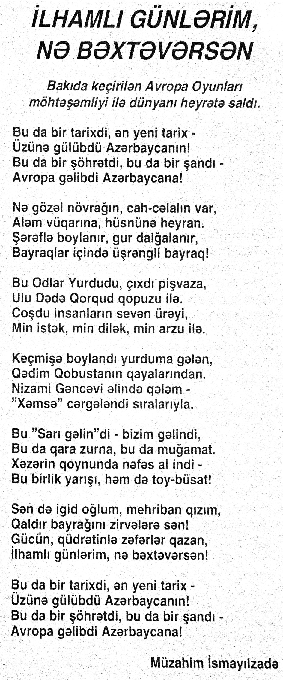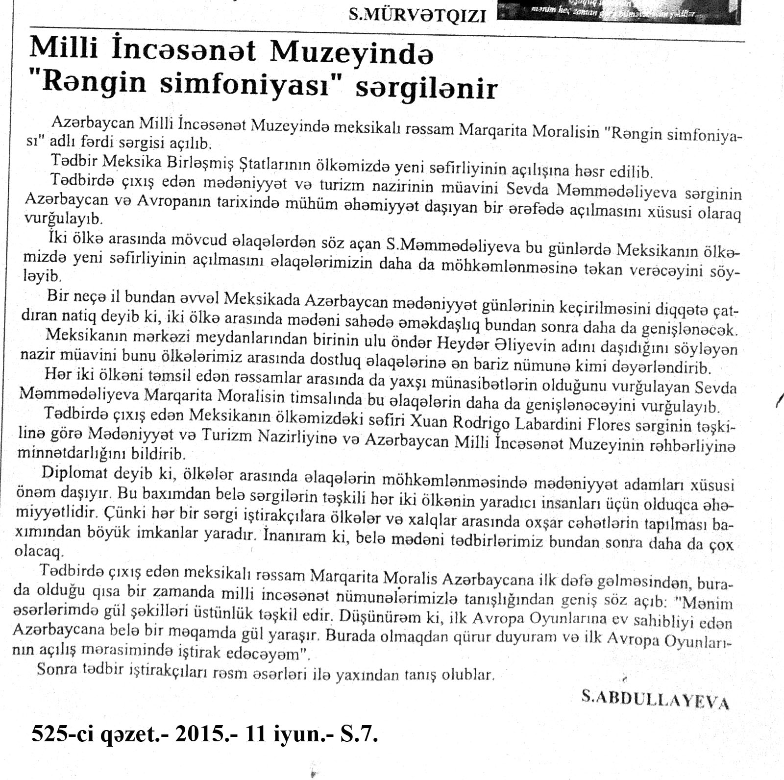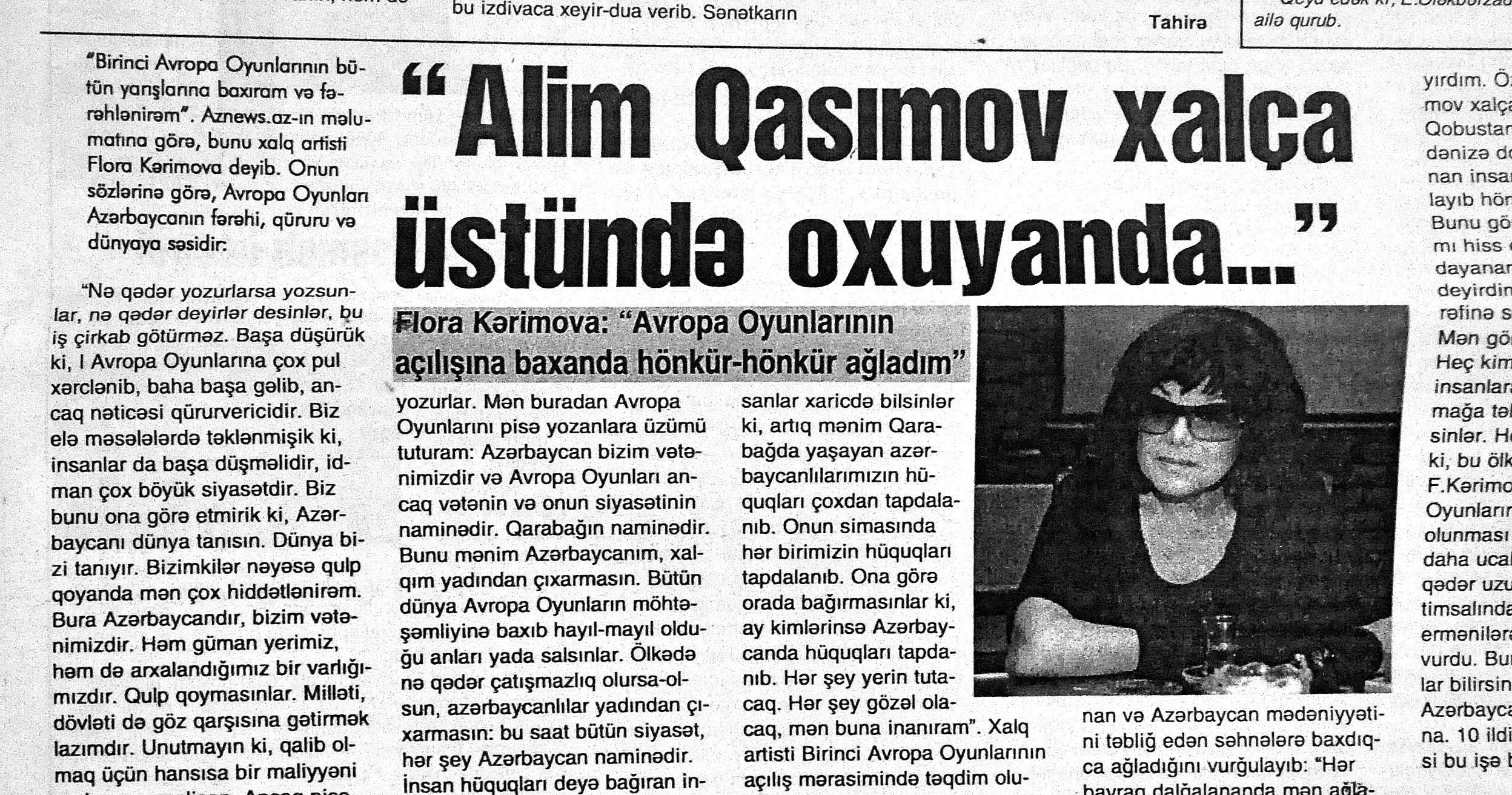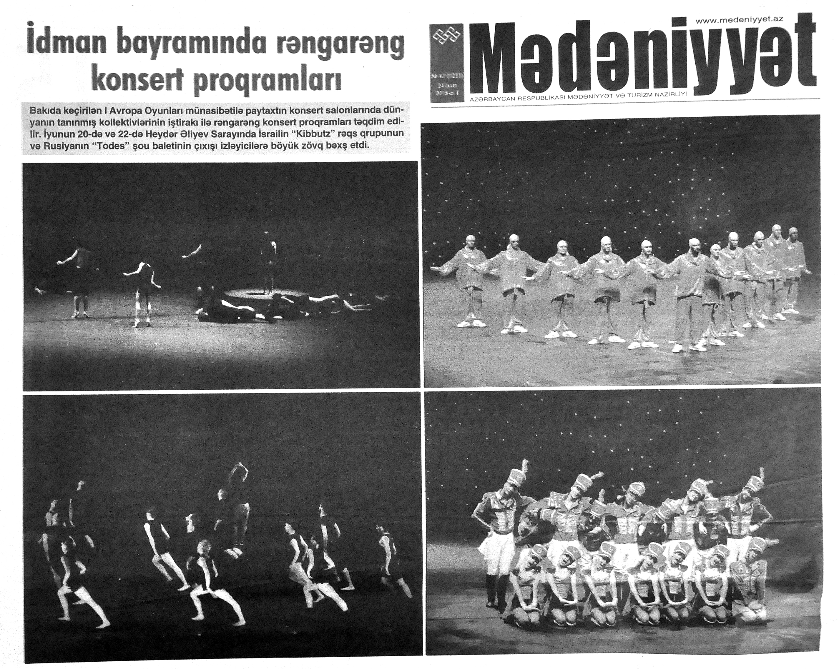 26. Abdullayeva, F. “Avropa Oyunları Azərbaycanda nəyi dəyişdirdi?” //Mədəniyyət.- 2015.- 19 iyun.- S.9. 27. Abdullayeva, F. Avropa Oyunları ölkəmizin təbliğatı üçün böyük fürsətdir: Media kəndindəki Mədəniyyət və Turizm Mərkəzindən zəngin təəssüratla //Mədəniyyət.- 2015.- 17 iyun.- S.7. 28. Abdullayeva, F. Avropa Oyunları turizm sektoru üçün yeni imkanlar açır: Ölkəmizə gələn turist sayında ciddi artım müşahidə edilir //Mədəniyyət.- 2015.- 24 iyun.- S.9. 29. Abdullayeva, F. Avropa Oyunları və turizm sektoru: Oyunlar müddətində Bakıdakı hotellərdə qonaqlara “Azerbaijan breakfast” brendli səhər yeməyi təklif olunacaq //Mədəniyyət.- 2015.- 5 iyun.- S.7. 30. Abdullayeva, F. Azərbaycanlı turistlər elektron ödəmədən daha çox istifadə edirlər //Mədəniyyət.- 2015.- 5 iyun.- S.7. 31. Abdullayeva, F. Bakı Avropanın idman paytaxtı olacaq: Avropa Oyunları ölkəmizdə turizmin inkişafına təkan verəcək //Mədəniyyət.- 2015.- 5 iyun.- S.7. 32. Abdullayeva, F. Çelyabinskidə Avropa Oyunlarına həsr edilən dostluq bayramı keçirilib //Azərbaycan.- 2015.-28 iyun.- S.14. 33. Abdullayeva, F. “City Sightseeing Baku” avtobusu ilə şəhər gəzintisi: Tur iştirakçıları təəssüratlarını qəzetimizlə bölüşdülər //Mədəniyyət.- 2015.- 26 iyun.- S.9. 34. Abdullayeva, F. Xorvatiyanın turizm imkanlarına həsr olunmuş görüş keçirilib //Mədəniyyət.- 2015.- 26 iyun.- S.8. 35. Abdullayeva, F. Qonaqlar Bakının mədəni irsinə xüsusi maraq göstərirlər //Mədəniyyət.- 2015.- 24 iyun.- S.9. 36. Abdullayeva, F. Qubaya turist axını artıb //Mədəniyyət.- 2015.- 19 iyun.- S.9. 37. Abdullayeva, F. Paytaxtımız Avropanın ən maraqlı 10 şəhəri siyahısında //Mədəniyyət.- 2015.- 24 iyun.- S.9. 38. Abdullayeva, S. Azərbaycanın turizm potensialı Dnepropetrovskda sərgilənir: [fotosərginin keçirilməsi haqqında] //525-ci qəzet.- 2015.- 24 iyun.- S.7; Mədəniyyət.- 2015.- 24 iyun.- S.8. 39. Abdullayeva, S. “Xoşbəxt anlar” başlanır: [eyniadlı fotomüsabiqənin başlanması haqqında] //525-ci qəzet.- 2015.- 18 iyun.- S.7. 40. Abdullayeva, S. “Qız qalası” beynəlxalq incəsənət festivalı başlanıb //525-ci qəzet.- 2015.- 12 iyun.- S.7. 41. Abdullayeva, S. “Qala” Qoruğunda daha bir beynəlxalq sərgi açılıb: [“VI Qız Qalası” Beynəlxalq İncəsənət Festivalının bağlanış mərasimi haqqında] //525-ci qəzet.- 2015.- 17 iyun.- S.7. 42. Abdullayeva, S. Muzey Mərkəzində “Kofe rəngi” sərgilənir: [rəsm əsərlərindən ibarət olan sərgidə Mədəniyyət və Turizm nazirinin müavini Ədalət Vəliyev çıxış edib] //525-ci qəzet.- 2015.- 23 iyun.- S.7. 43. Amerikalı alimlər Gənc Tamaşaçılar Teatrında //Mədəniyyət.- 2015.- 24 iyun.- S.3. 44. Avropa Oyunları Azərbaycanı dünyada tanıdır: [Aşıq Şəmşir” Mədəniyyət Ocağı İctimai Birliyində (İB) keçirilən tədbir haqqında] //Mədəniyyət.- 2015.- 26 iyun.- S.5. 45. Avropa Oyunları gənclərin təfəkküründə: [Qazax Rayon Mərkəzi Kitabxanasında keçirilən tədbir haqqında] //Mədəniyyət.- 2015.- 10 iyun.- S.11. 46. Avropa Oyunları günlərində Bakıda konsert proqramları //Mədəniyyət.- 2015.- 17 iyun.- S.3. 47. Avropa Oyunlarının Bakıda keçirilməsi türk dünyasının qürurudur //Mədəniyyət.- 2015.- 19 iyun.- S.4. 48. Avropa Oyunlarının “muzey gecələri” //Mədəniyyət.- 2015.- 5 iyun.- S.9. 49. Avropa Oyunlarının sənət çələngi: [Mədəniyyət və Turizm Nazirliyinin yerli sakinlər və ölkəmizə gələn turistlər üçün təşkil etdiyi konsert proqramları haqqında] //Mədəniyyət.- 2015.- 24 iyun.- S.3. 50. Avstraliya jurnalında Azərbaycan haqqında məqalə //Mədəniyyət.- 2015.- 24 iyun.- S.8; S.16 51. Aydəmirov, A. Odla oynayan oğlan: [Dövlət Rəqs Ansanbılının solisti Aydəmir Aydəmirovla müsahibə] /müsahibəni apardı Xəyalə Rəis //Kaspi.- 2015.- 19 iyun.- S.17. 52. Azərbaycan I Avropa Oyunlarının açılış mərasimində tarixini, mədəniyyətini, musiqisini və müasirliyini dünyaya təqdim edə bildi //Azərbaycan.- 2015.- 14 iyun.- S.8. 53. Azərbaycanın inkişafı, zəngin mədəniyyəti avstraliyalı jurnalistın gözü ilə: [Ben Qroundvaterin Azərbaycan haqqında təəssüratları] //Azərbaycan.- 2015.- 20 iyun.- S.12. 54. Azəri, L. “Cəngi” qələbəyə çağırış deməkdir : I Avropa Oyunlarına həsr olunmuş konsert atletlərimizin qələbələrinə musiqi töhfəsi oldu: [Rəşid Behbudov adına Mahnı Teatrında Mədəniyyət və Turizm Nazirliyinin təşkil etdiyi konsert proqramı haqqında] //Mədəniyyət.- 2015.- 24 iyun.- S.4. 55. Azəri, L. “Əsrlərin yaddaşı”: Avropa Oyunları ərəfəsində milli geyimlərimizi təbliğ edən layihənin təqdimatı keçirildi: [İçərişəhər Dövlət Memarlıq Qoruğunun “Muğam klubu”nda] //Mədəniyyət.- 2015.- 3 iyun.- S.3. 56. Azəri, L. Qədim Musiqi Alətləri Ansamblının idman bayramına töhfəsi: [Musiqi Mədəniyyəti Dövlət Muzeyinin nəzdində fəaliyyət göstərən Qədim Musiqi Alətləri Dövlət Ansamblının təşkil etdiyi konsert proqramı haqqında] //Mədəniyyət.- 2015.- 26 iyun.- S.7. 57. Azəri, L. Teatrlardakı yeniliklər qonaqların ürəyincədir: “Əslində biz yarışlara gəlmişdik, lakin mədəni proqramlar da hədsiz marağımıza səbəb oldu” //Mədəniyyət.- 2015.- 24 iyun.- S.5. 58. Babayev, A. Avropa Oyunlarını keçirməklə qapılarımızı dünyaya açacağıq: [Xalq artisti Arif Babayevlə müsahibə] /müsahibəni apardı Xəyalə Rəis //Kaspi.- 2015.- 10 iyun.- S.12. 59. Bağırzadə, B. Bəhram Bağırzadə: Avropa Oyunlarının ölkəmizdə keçirilməsinin ən böyük əhəmiyyəti uşaq və gənclərimizin idmana marağının daha da artması olacaq: [aktyor, rejissor və şoumenin müsahibəsi] /müsahibəni apardı Səa