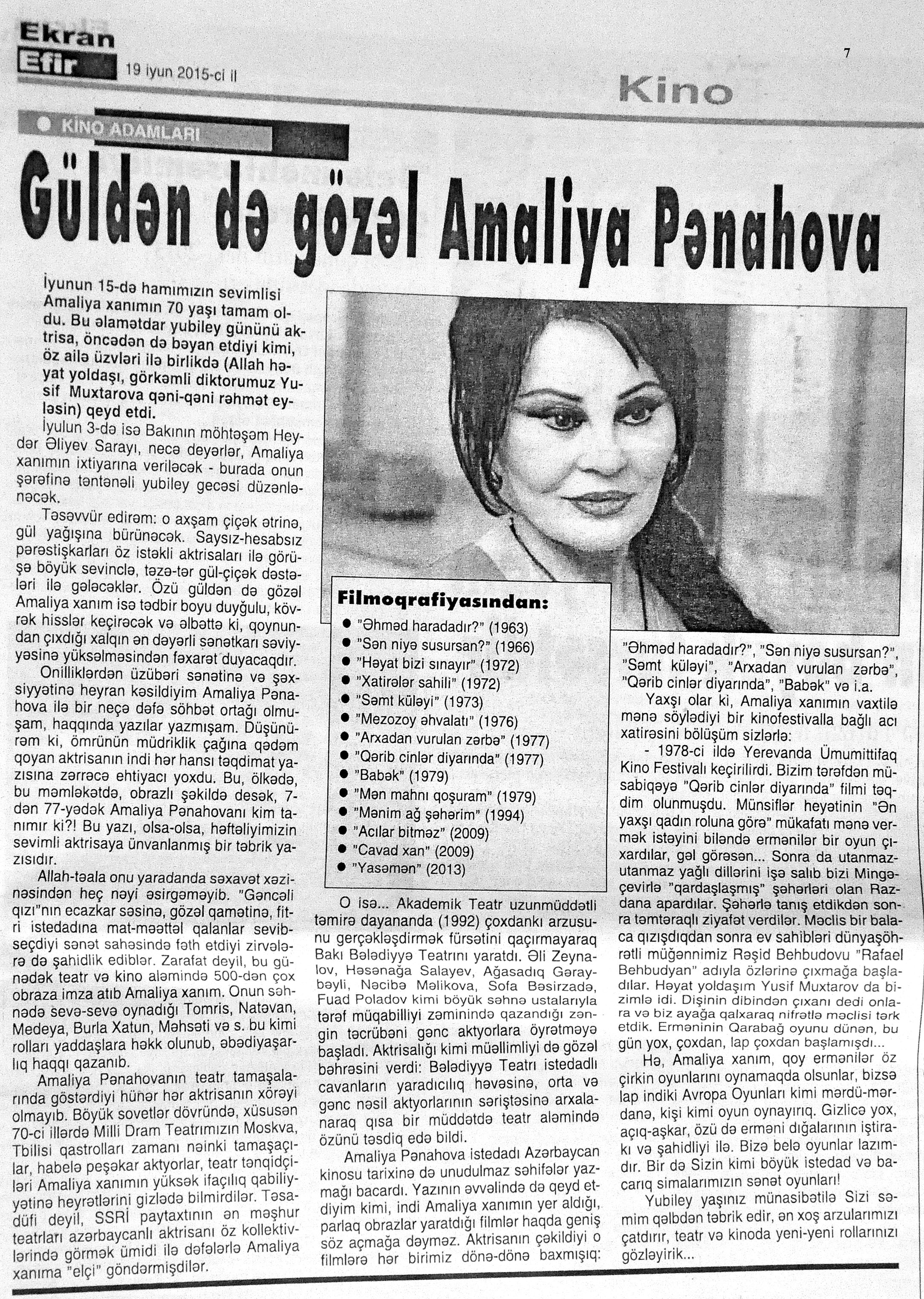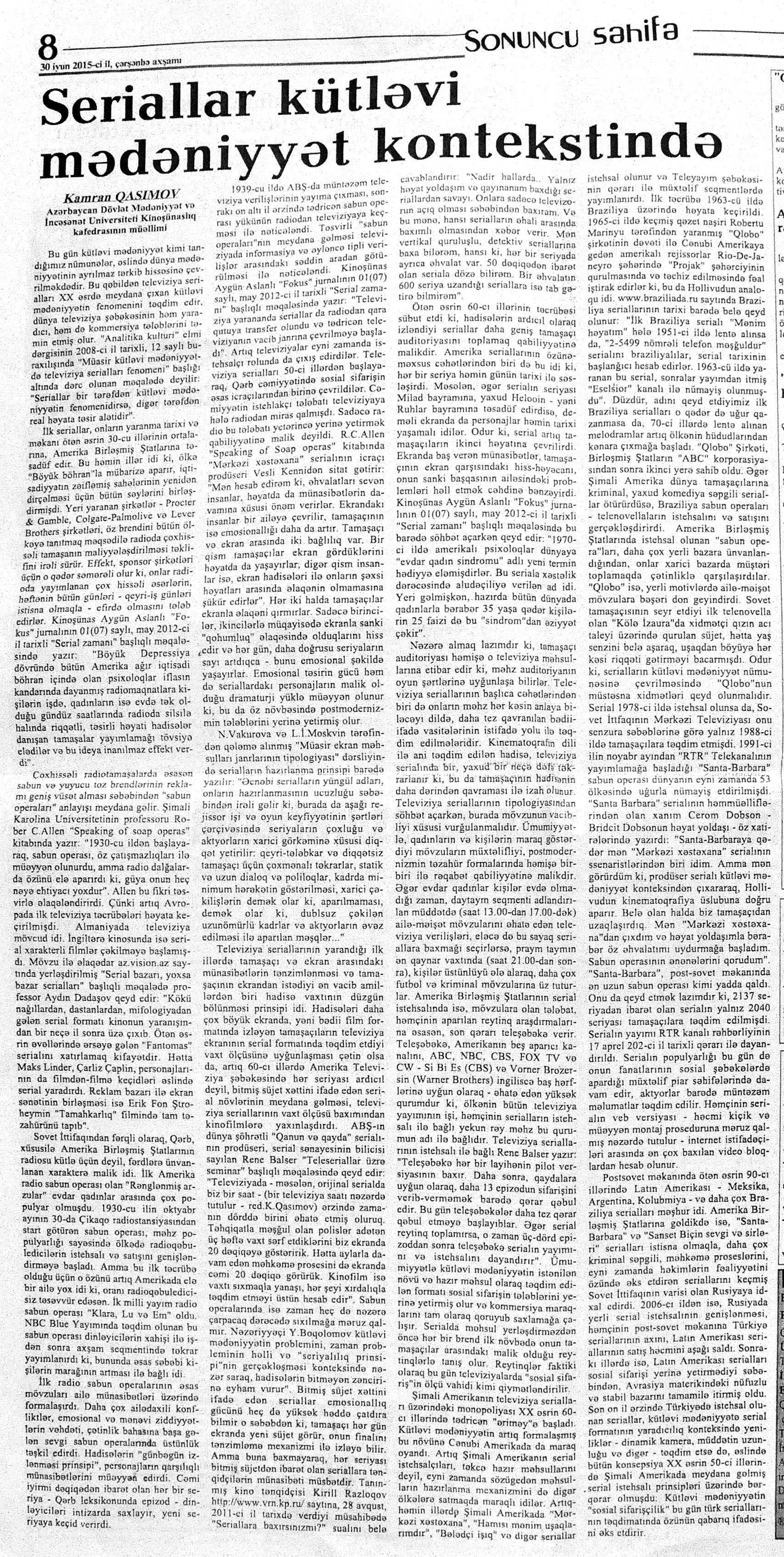 345. Abdullayev, K. Həsənağa Turabov elə sillə vurdu ki, gözlərimdən alov çıxdı...: Kazım Abdullayev: Adil İsgəndərov sadəcə bir kəlmə dedi: “Bağışlayın, sizin üçün heç bir şey edə bilmədim”: [Əməkdar artistlə müsahibə] //Ekspress.- 2015.- 23 iyun.- S.15. 346. Abdullayeva, S. “Köhnə saat”ımız Kiyevdə göstərilib: [rejissor Cavid Əhədovun hazırladığı eyniadlı film haqqında] //525-ci qəzet.- 2015.- 4 iyun.- S.7. 347. Abdullayeva, S. “Lahıc” sənədli filmi Polşada mükafat qazanıb: [Tofiq Şahverdiyevin hazırladığı film haqqında] //525-ci qəzet.- 2015.- 24 iyun.- S.7. 348. Ağa, M. “Qordi düyünü” və ya Həsən Seyidbəyli sovet milisinin 50 illik yubileyində Əminəni niyə öldürdü: [rejissorun “O qızı tapın” filmi haqqında] //Ədəbiyyat qəzeti.- 2015.- 26 iyun.- S.31. 349. Azəri, L. 60 ilin “Görüş”ü: [Tofiq Tağızadənin eyniadlı filmi haqqında] //Mədəniyyət.- 2015.- 19 iyun.- S.10. 350. Azəri, L. “Bakı gecələri” əsrarəngiz gözəllikləri ekrana gətirəcək: [“Debüt” studiyasında lentə alınan eyniadlı kinoalmanaxın çəkilişləri haqqında] //Mədəniyyət.- 2015.- 5 iyun.- S.6. 351. Azəri, L. “Bazar günü”: [Pərviz Əliyevin quruluşunda eyniadlı qısametrajlı bədii filmin çəkilişləri haqqında] //Mədəniyyət.- 2015.- 5 iyun.- S.6. 352. “Çölçü” filminin növbəti uğuru: [Şamil Əliyevin eyniadlı filminin İndoneziyada keçirilən beynəlxalq festivalda “Golden World Awards 2015” mükafatına layiq görülməsi haqqında] //Mədəniyyət.- 2015.- 3 iyun.- S.4. 353. Fərəcov, S. Bizim aktyor Süleymanımız!: Yaxud, məlum və məşhur filmdən sonra tək elə “bizim” yox, hamımızın Cəbiş müəllimimiz...: [Xalq artisti Süleyman Ələsgərov haqqında] //Mədəniyyət.- 2015.- 19 iyun.- S.13. 354. Fərəcov, S. Fərqli xarakterlərin mahir ifaçısı: [Xalq artisti Həqiqət Rzayeva haqqında] //Mədəniyyət.- 2015.- 3 iyun.- S.15. 355. Fərəcov, S. Kinokamera arxasındakı ömrün səhifələri: Əməkdar incəsənət xadimi Valeri Kərimovun xatirə gecəsi: [Dövlət Film Fondunda] //Mədəniyyət.- 2015.- 3 iyun.- S.14. 356. Qasımov, K. Seriallar kütləvi mədəniyyət kontekstində //525-ci qəzet.- 2015.- 30 iyun.- S.8. 357. Qurbanlı, R. Sənətdə uğurun Mehriban Zəki formulu: [Əməkdar artist haqqında] //525-ci qəzet.- 2015.- 13 iyun.- S.25. 358. Kazımzadə, A. Sənətdə imzasını qoymuş sənətkar: Kinooperator Valeri Kərimov 70 illiyində hörmətlə anılır //Kaspi.- 2015.- 17 iyun.- S.15. 359. Lalə. Nobel qardaşlarının Bakıdakı fəaliyyətindən bəhs edən film çəkilir: [Emin Mirabdullayevin hazırladığı “Postskriptum” adlı ekran əsəri haqqında] // Mədəniyyət.- 2015.- 24 iyun.- S.4. 360. Rumıniya telekanalında Bakı haqqında film:[“Bakı küləklərin qoynunda” adlı sənədli filmi] //Mədəniyyət.- 2015.- 17 iyun.- S.2. 361. Sarıyeva, İ. Azərbaycan kinosunun keçdiyi yol... //Bakı xəbər.- 2015.- 5 iyun.- S.15. 362. Sarıyeva, İ. Çağdaş Azərbaycan kinosuna dövlət dəstəyinin uğurlu nəticələri... //Bakı xəbər.- 2015.- 9 iyun.- S.15. 363. Sarıyeva, İ. Sovet dövrü Azərbaycan kinosu, yaxud müstəqilliyə doğru... //Bakı xəbər.- 2015.- 6-8 iyun.- S.15.