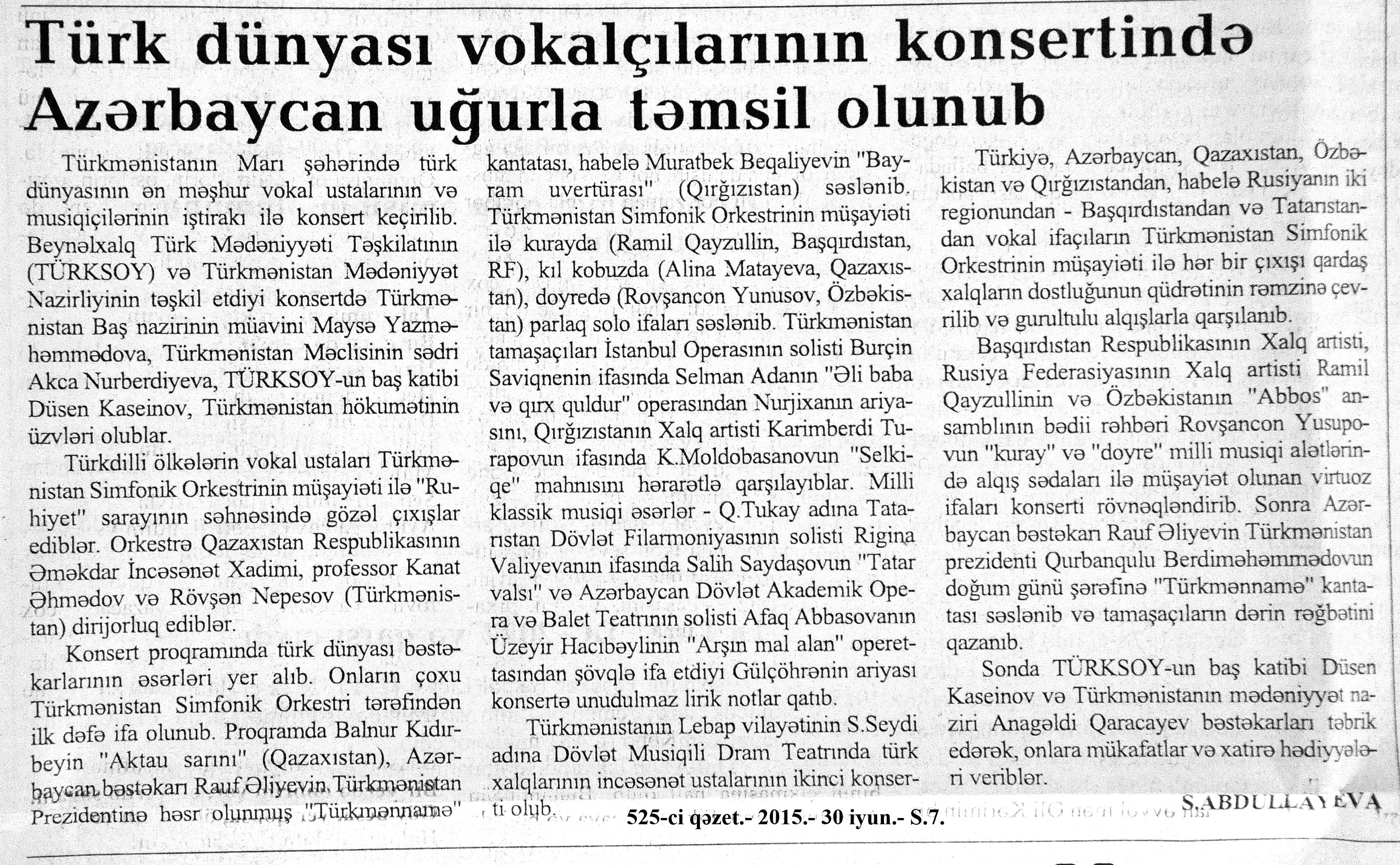 257. Abbaslı, T. Fatma şikəstə...: Bu sözü mənə diktə edən - “Kəsmə şikəstə” tanrısı Fatma xanımın Səsi!...: [Əməkdar artist Fatma Mehrəliyeva haqqında] //Mədəniyyət.- 2015.- 3 iyun.- S.13. 258. Abdullayeva, S. Azərbaycan muğamı Çində səslənib //525-ci qəzet.- 2015.- 2 iyun.- S.7. 259. Abdullayeva, S. Xalq artisti Alim Qasımovdan yeni sənət layihəsi: [“Pərişanın” adlı sənət layihəsi haqqında] //525-ci qəzet.- 2015.- 4 iyun.- S.7. 260. Abdullayeva, S. V Muğam Televiziya Müsabiqəsi yekunlaşıb //525-ci qəzet.- 2015.- 2 iyun.- S.7. 261. Adı “Qızıl kitab”a yazılan rəqqasə: [Çinarə Quliyeva haqqında] //Azərbaycan müəllimi.- 2015.- 20 iyun.- S.10. 262. “Alim Qasımov xalça üstündə oxuyanda”: Flora Kərimova: Avropa Oyunlarınin açilişina baxanda hönkür - hönkür ağladım //Şərq.- 2015.- 19 iyun.- S.13. 263. Amerika Musiqi və Dram Akademiyasının azərbaycanlı tələbəsi: [Azərbaycanın gənc vokalçısı, beynəlxalq müsabiqələr laureatı Emin Eminzadə haqqında] //Mədəniyyət.- 2015.- 12 iyun.- S.6. 264. Amerika Musiqili və Dramatik Akademiyasının ilk azərbaycanlı tələbəsi: [gənc vokalçı Emin Eminzadə haqqında] //Azərbaycan müəllimi.- 2015.- 26 iyun.- S.14. 265. Azəri, L. Gözləri əllərini görməsə də...: Bir musiqi məktəbinin uğur mənzərəsi: [gözdən əlil uşaqlar üçün 38 saylı onbirillik musiqi məktəbinin direktoru Əsəd Əliyevin söhbəti] //Mədəniyyət.- 2015.- 5 iyun.- S.15. 266. Azəri, L. Görkəmli sənətkar Rəşid Behbudovun xatirəsi anıldı : [Fəxri xiyabanda] //Mədəniyyət.- 2015.- 10 iyun.- S.5. 267. Bayramda onlar da unudulmadı: [Nizami rayonundakı Daun sindromlu şəxslərin Reabilitasiya Mərkəzində Beynəlxalq Uşaqları Müdafiə Günü ilə əlaqədar keçirilən konsert haqqında] //Mədəniyyət.- 2015.- 3 iyun.- S.7. 268. Bəstəkar və musiqişünaslara yeni töhfə: [Bəstəkarlar İttifaqının sədri Firəngiz Əlizadənin ilk nəşrlərinin təqdimatı keçirilən “Azərbaycan bəstəkarları və musiqişünasları” layihəsi ilə bağlı fikirləri] //Mədəniyyət.- 2015.- 19 iyun.- S.11. 269. Bülbül adına orta ixtisas musiqi məktəbinin şagirdi V Muğam müsabiqəsinin qalibidir: [muğam ifaçısı Nisbət Sədrayeva haqqında] //Azərbaycan müəllimi.- 2015.- 6 iyun.- S.6. 270. Cəfərov, Ş. “Qarabağ şikəstəsi”nin sədası Çindən gəlir: [“Pekində görüş” beynəlxalq incəsənət festivalı haqqında] //Azərbaycan.- 2015.- 2 iyun.- S.12. 271. Cəlaloğlu, E. Gözəllik mücəssəməsi – Flora Kərimova //Türküstan.- 2015.- 7-13 iyun.- S.13. 272. Cəlilov, K. “Mən qaboyu xalqa tanıtdım, qaboy da məni xalqa tanıtdı”: [Xalq artisti Kamil Cəlilovun müsahibəsi] //Xalq cəbhəsi.- 2015.- 30 iyun.- S.15. 273. Cəlilov, K. Sənətdə söz-söhbət həmişə olub...: Kamil Cəlilov: “İstedadıma görə mənə o qədər əzab veriblər, o qədər paxıllığımı çəkiblər ki...”: [Xalq artistinin müsahibəsi] //Ekspress.- 2015.- 30 iyun.- S.15. 274. Dahi Bülbülün xatirəsi yad edilib //Mədəniyyət.- 2015.- 24 iyun.- S.6. 275. Əhmədova, M. İmruz Əfəndiyevanın musiqidə keçən ömrü: [Əməkdar incəsənət xadiminin yaradıcılığı haqqında] //Ədəbiyyat qəzeti.- 2015.- 13 iyun.- S.23. 276. Fərəcov, S. Azərbaycan bəstəkarları və musiqişünasları haqqında nəşrlərin təqdimatı: [Azərbaycan Bəstəkarlar İttifaqında] //Mədəniyyət.- 2015.- 10 iyun.- S.4. 277. Fərəcov, S. “İpək Yolu” yenə Şəkidən keçəcək: Ənənəvi beynəlxalq musiqi festivalına hazırlıq görülür //Mədəniyyət.- 2015.- 26 iyun.- S.4. 278. Fərəcov, S. Üzeyir Hacıbəyli və onu sevənlər: [Üzeyir Hacıbəylinin ev-muzeyində keçirilən tədbir haqqında] //Mədəniyyət.- 2015.- 5 iyun.- S.4. 279. Fərhadov, P. “Kamançada insanı cəlb edən xüsusi bir qüvvə var” : [gənc kamança ifaçısı Pərviz Fərhadovla müsahibə] /müsahibəni apardı Lalə Azəri //Mədəniyyət. - 2015.- 10 iyun.- S.7. 280. Frederik Şopenin musiqisi səsləndirilib: [Niyazinin mənzil-muzeyində böyük polyak bəstəkarı Frederik Şopenin yaradıcılığına həsr edilmiş konsert haqqında] //Mədəniyyət.- 2015.- 5 iyun.- S.4. 281. Gənc ifaçı beynəlxalq müsabiqənin qızıl medalına layiq görülüb: [fortepiano ifaçısı Eldəniz Ələkbərzadə haqqında] //Azərbaycan müəllimi.- 2015.- 20 iyun.- S.10. 282. Gənc istedadlar Uşaq Musiqi Akademiyasında: [Rusiya Federasiyasının Samara vilayətində işə başlayan MDB və Baltikyanı ölkələrin V Uşaq Musiqi Akademiyasında Azərbaycanın istedadlı gənc musiqiçiləriinin iştirakı haqqında] //Mədəniyyət.- 2015.- 5 iyun.- S.6. 283. “Gəncləşən muğam”ın növbəti təqdimatı: [Heydər Əliyev Sarayında] //Mədəniyyət.- 2015.- 5 iyun.- S.5. 284. Günaydın, Y. Üzeyir Hacıbəylinin qəzetçiliyinin erkən dövrü və o vaxtın Bakısında ictiami-siyasi durum //525-ci qəzet.- 2015.- 20 iyun.- S.26. 285. Heydər Əliyev Mərkəzində Elvin Qəniyevin iştirakı ilə klassik musiqi gecəsi keçirilib //Azərbaycan.- 2015.- 12 iyun.- S.13. 286. Heydər Əliyev Mərkəzində gənc virtuoz ifaçının musiqi gecəsi: [skripka ifaçısı Elvin Qəniyev haqqında] //Mədəniyyət.- 2015.- 12 iyun.- S.3. 287. Həmidə. Musiqişünaslığa yeni töhfə: [sənətşünaslıq doktoru Ülkər Əliyevanın “Musiqidə təsvirilik: mahiyyəti, spesifik xüsusiyyətləri və təsnifatı” adlı kitabı haqqında] //Mədəniyyət.- 2015.- 4 iyun.- S.7. 288. Həmidə. Tarın sehrindəki Fəxri: [Tofiq Quliyev adına 12 saylı onbirillik Musiqi məktəbinin tar ixtisası üzrə 5-ci sinif şagirdi Fəxri Axundov haqqında] //Mədəniyyət.- 2015.- 3 iyun.- S.7. 289. Hüseynli, O. “Bir şeyi sevmək üçün ona dəlicəsinə inanmalısan”: “Heydər Əliyev Fondu muğamımızı