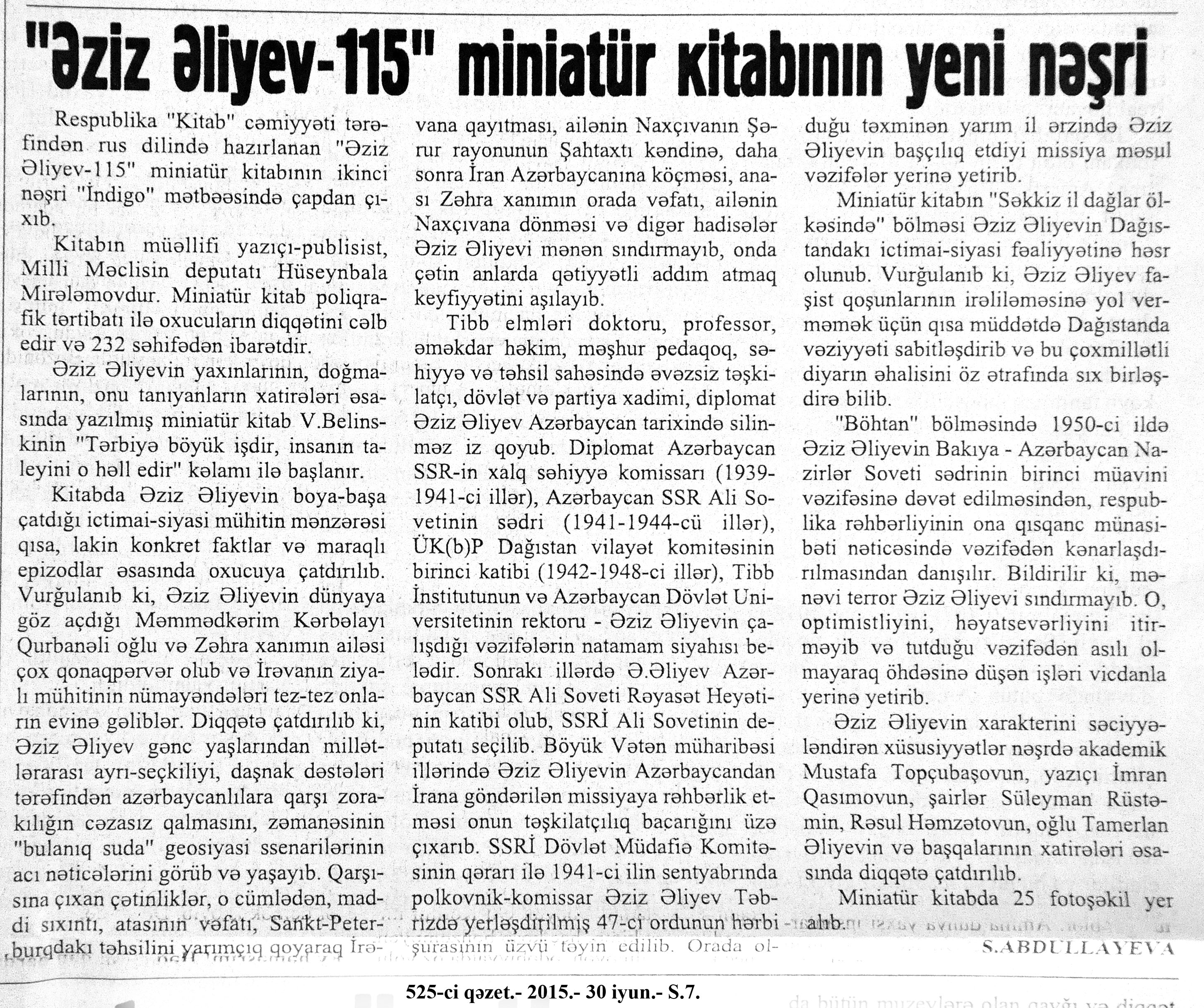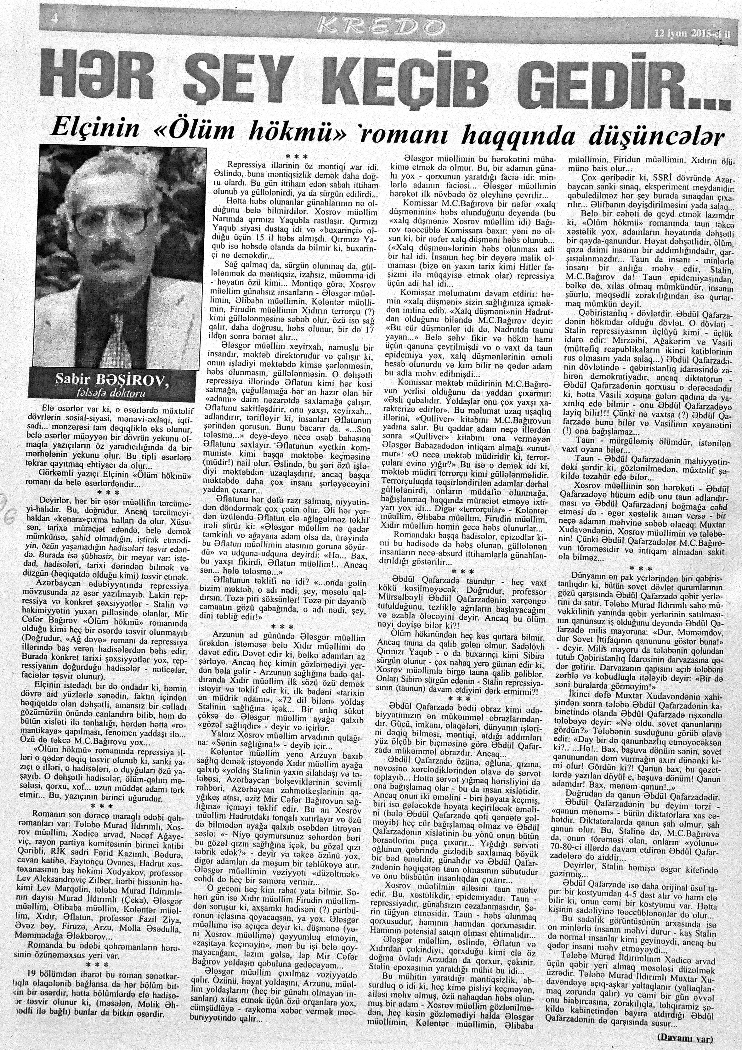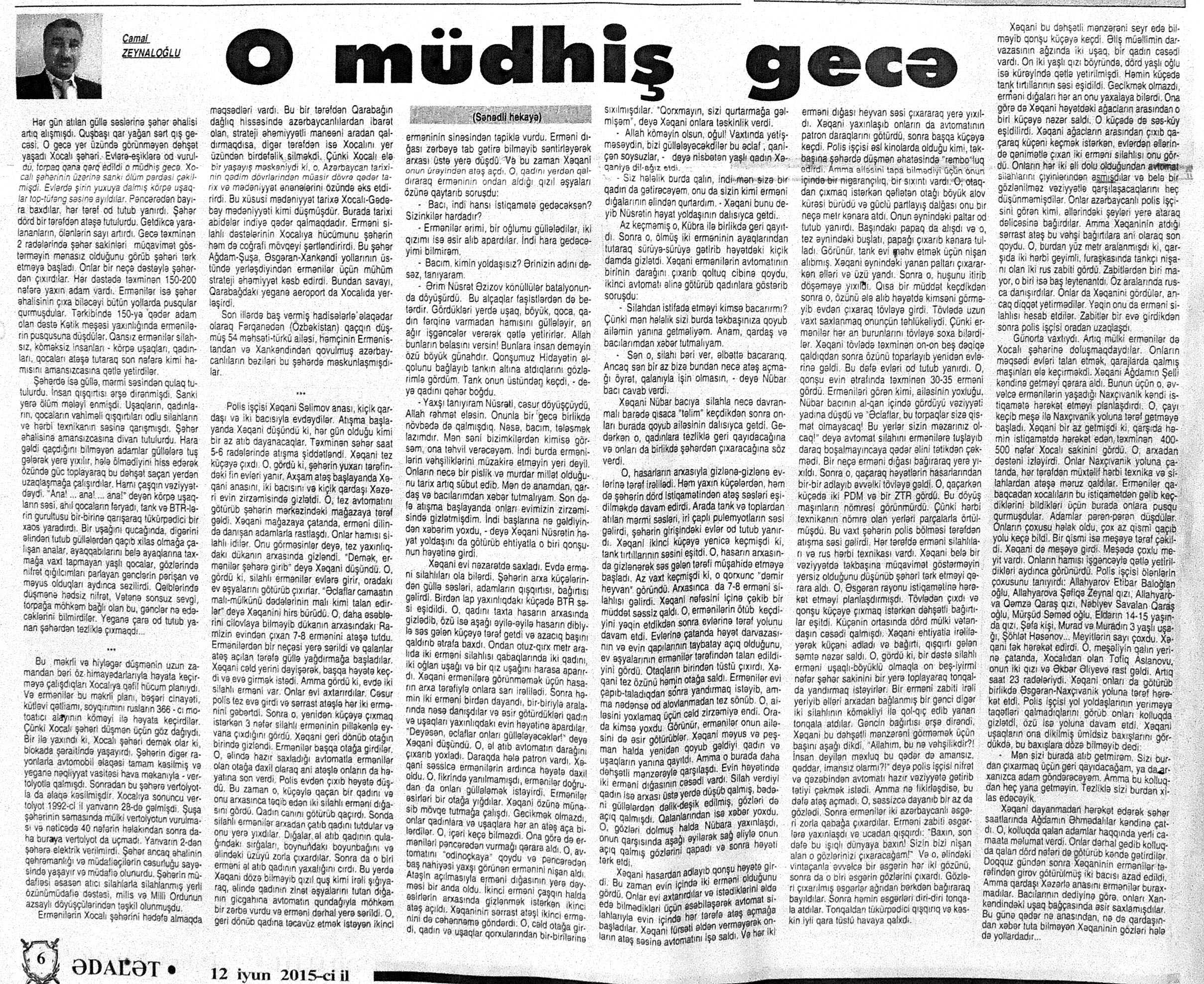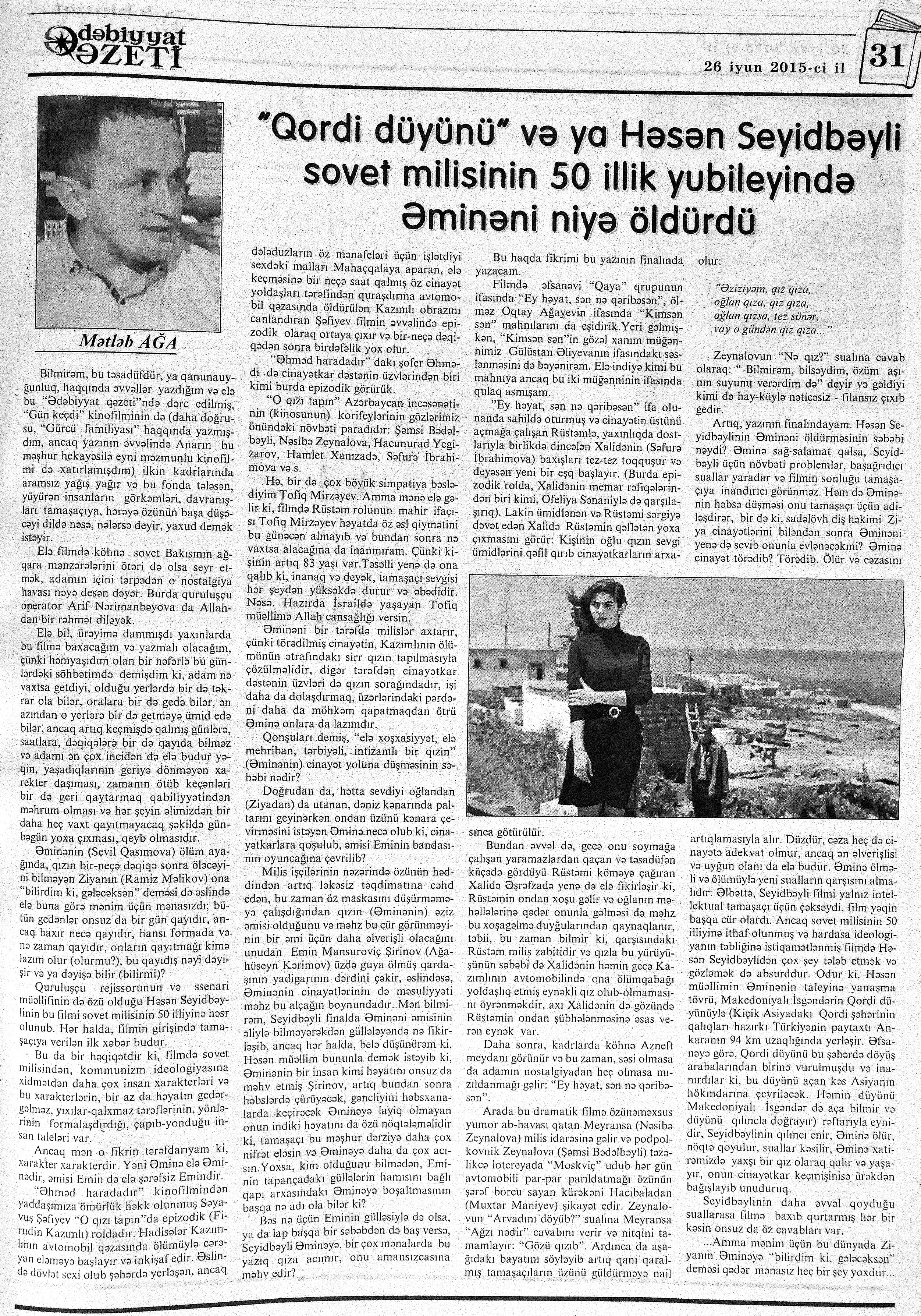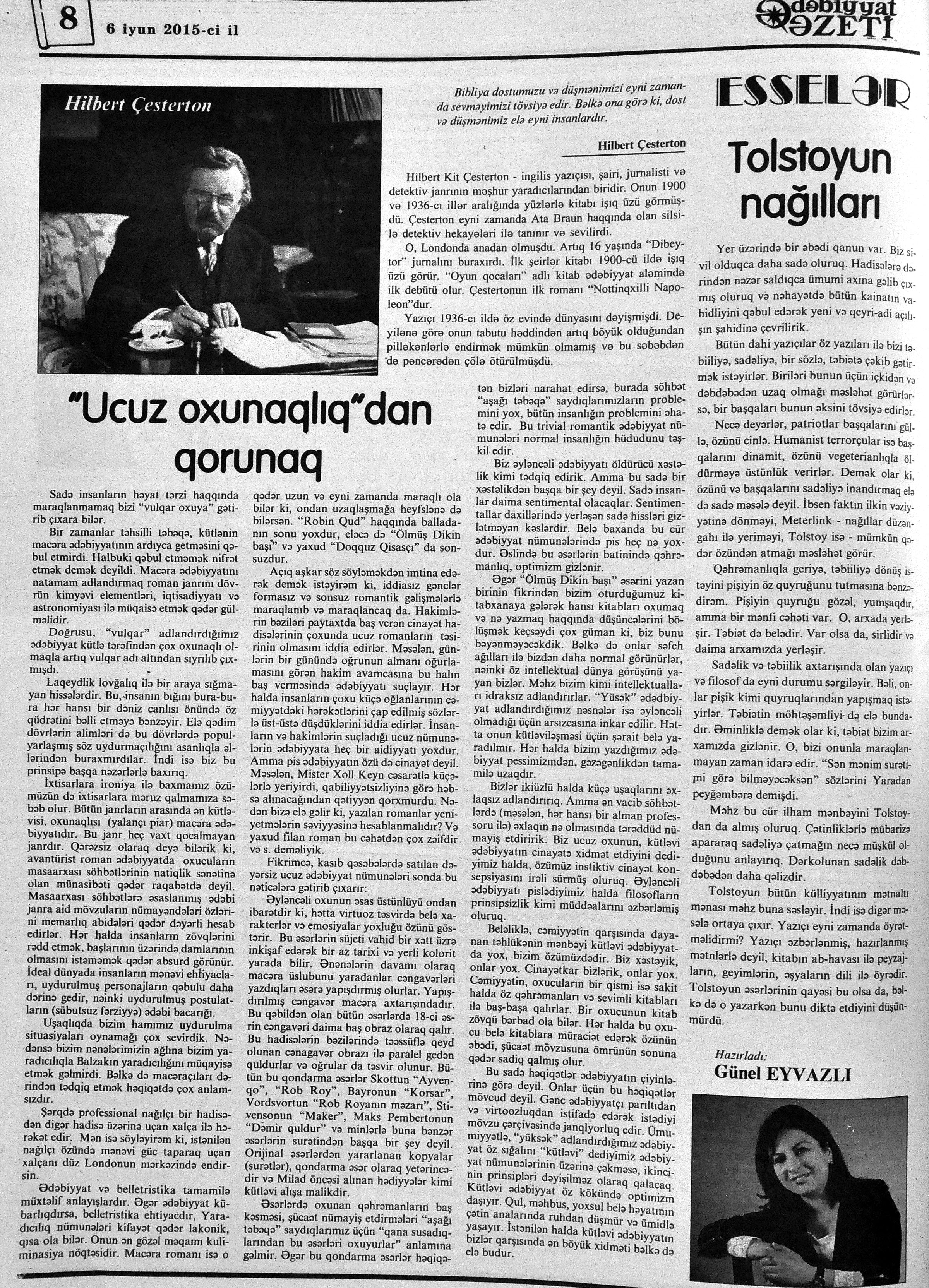 546. Abdulla, K. Düma ilə Coys arasında və yaxud Don Kixotun ölümü //525-ci qəzet.- 2015.- 13 iyun. - S.19. 547. Çesterton, H. “Ucuz oxunaqlıq”dan qorunaq: //Ədəbiyyat qəzeti.- 2015.- 6 iyun.- S.8. 548. Mehdi, Q. Zülmət olmasa... //525-ci qəzet.- 2015.- 12 iyun.- S.7. 549. Zeynaloğlu, C. O gecə ölüm mələyi enmişdi yerə //Ədalət.- 2015.- 18 iyun.- S.7.