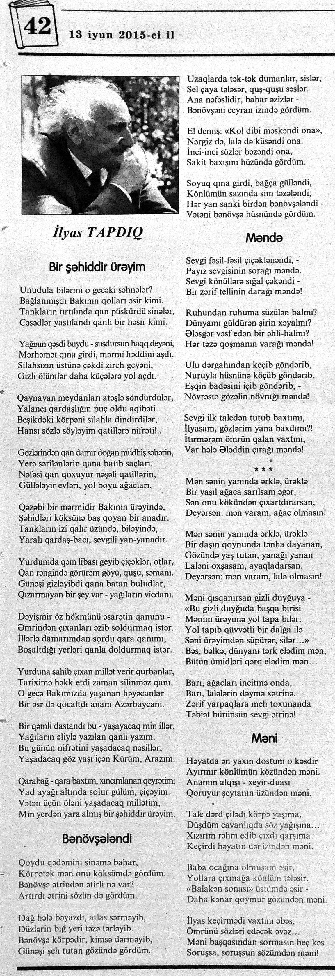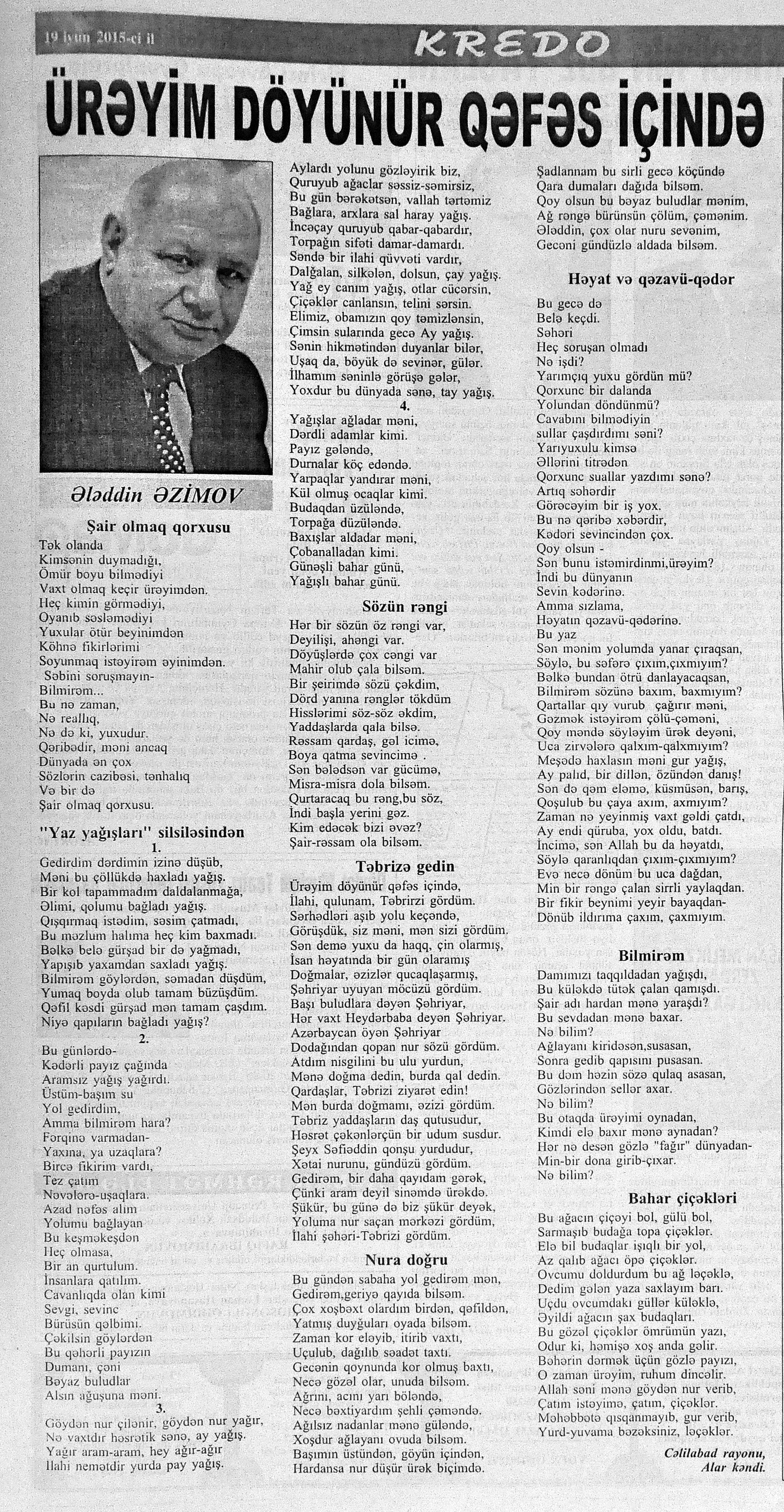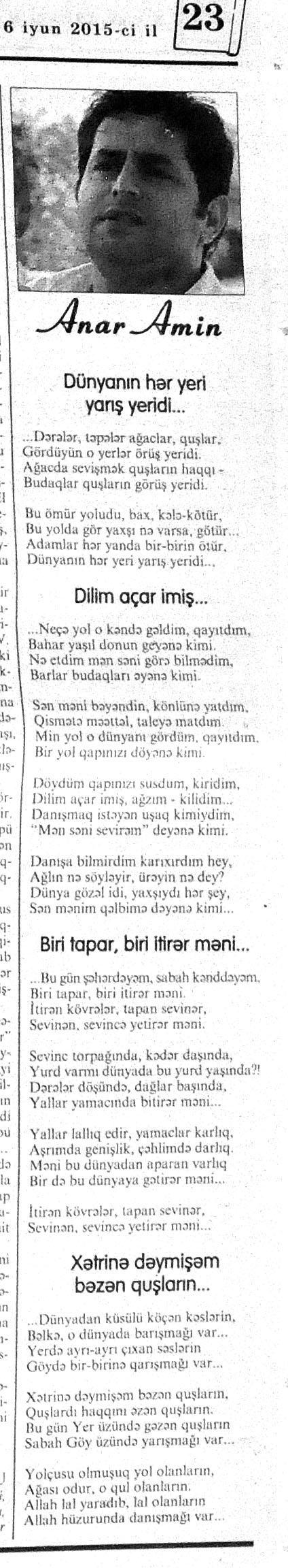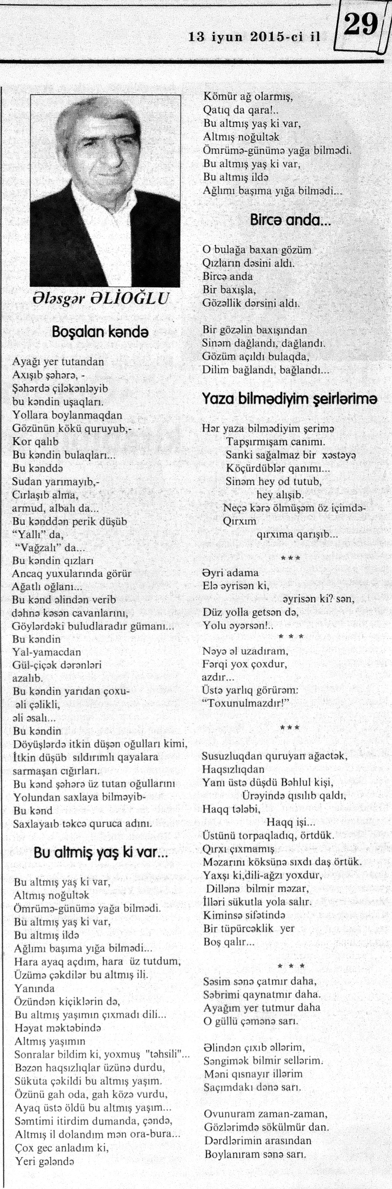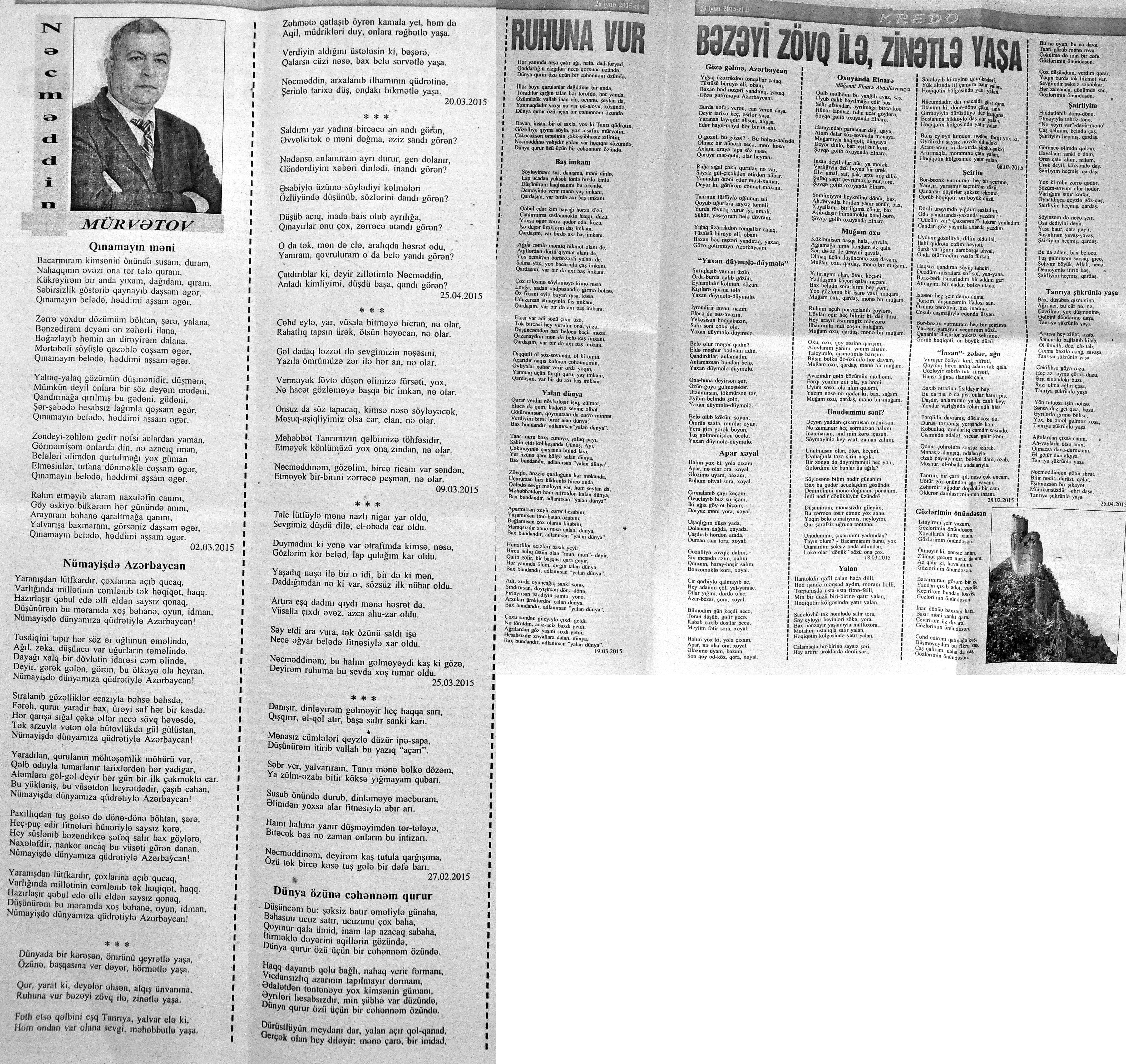 426. Abuzərli, N. Fateh-Sultan Dastanı və ya ürəkdən doğulanlar //Kredo.- 2015.- 19 iyun.- S.7. 427. Amin, A. Dünyanın hər yeri yarış yeridi...; Dilim açar imiş...; Biri tapar, biri itirər məni... və s. //Ədəbiyyat qəzeti.- 2015.- 6 iyun.- S.23. 428. Anar. Vaqifin Vaqifsiz ilk doğum günü: [Vaqif Səmədoğluna həsr olunub] //525-ci qəzet.- 2015.- 4 iyun.- S.7. 429. Asena, N. Xoş gəlmisən, Sən ömrümə 60 yaşım //Ədalət.- 2015.- 9 iyun.- S.8. 430. Aslan, M. Son nazlama; Kənardan baxana döyüş asan gələr; Qazi Gülxanə paşa və s. //525-ci qəzet.- 2015.- 6 iyun.- S.29. 431. Aslan, V. “Kəndin payızı” silsiləsindənı; Söz; Bir ürəyin iki üzü //525-ci qəzet.- 2015.- 20 iyun.- S.29. 432. Baxış, E. İndinin böyük şairi: Bu torpaq; Oğlu Andayın itkisinə yazdığı şeir; Məhəmməd Hadiyə və s. //Ədalət.- 2015.- 26 iyun.- S.14. 433. Behrudi, R. Qorxu, və yaxud görən niyə susub Allah; Qorxu; Xarabalıq və s. //Azadlıq.- 2015.- 30 iyun.- S.13. 434. Bəhmənli, V. İyirmi beş şeir: Bəxt; Rübai-Qoşma; Bir xatirə və s. //Azərbaycan : jurnal.- 2015.- №1.- S.7-29. 435. Borçalı, E. Səksənə doğru; Al! – dedi, çal! – dedi...; Bu gecə və s. //Ədəbiyyat qəzeti.- 2015.- 13 iyun.- S.44. 436. Cavanşir. Tənhayam bu tutqun payız axşamı; Ölüm nə, itim nə, bilməyəcəkdin...; Mən hər şeyə ağlayıram və s. //Ədəbiyyat qəzeti.- 2015.- 13 iyun.- S.13. 437. Çalğın, M. Bir polis dostu da olmadı anamın...; Təbriz qızarır uzaqlardan...; Dərd şirin... və s. //525-ci qəzet.- 2015.- 10 iyun.- S.8. 438. Çalğın, M. Xına gözlərində...; Kainatda təkrar yox...; Yellərin dodaqlarına kəpənəklərin qanadlarından... //Ədəbiyyat qəzeti.- 2015.- 13 iyun.- S.8. 439. Çərkəzoğlu. Söz //Ədalət.- 2015.- 11 iyun.- S.6. 440. Eyvazlı, G. Qaçdıq //Azərbaycan müəllimi.- 2015.- 13 iyun.- S.12. 441. Əhmədgil, A. Çanaqqala, bağışla, mən Şuşadan gəlmişəm: Çanaqqala savaşının 100 illiyinə //Ədəbiyyat qəzeti.- 2015.- 6 iyun.- S.32. 442. Ələkbərli, M. Dünya bir nəğmədir...: İstedadlı şair dostum Yusif Nəğməkarın 60 illik yubileyi münasibətilə //525-ci qəzet.- 2015.- 26 iyun.- S. 29. 443. Ələmoğlu, F. Gözün aydın Heydər Baba! //Azad Azərbaycan.- 2015.- 17 iyun.- S.7. 444. Əli, H. Demirəm; Neyləmək?!; Axırda və s. //Kredo.- 2015.- 5 iyun.- S.11. 445. Əlioğlu, Ə. Boşalan kəndə; Bu altmış yaş ki var...; Bircə anda və s. //Ədəbiyyat qəzeti.- 2015.- 13 iyun.- S.29. 446. Əsəd, F. Xatirə toranlığı...; Ömür deyilən çiçəkmiş...; Mən gedirəm sən də gəl... və s. //Azərbaycan: jurnal.- 2015.- №2.- S.97-99. 447. Əzimov, Ə. Ürəyim döyünür qəfəs içində: Şair olmaq qorxusu; “Yaz yağışları” silsiləsindən; Sözün rəngi və s. //Kredo.- 2015.- 19 iyun.- S.15. 448. Əziz, M. Ana, bizə indən belə gərəksən; Anam xəstələnib; Ana və s. //Ədalət.- 2015.- 4 iyun.- S.7. 449. Əzizxanlı, Q. Çanaqqala etüdləri //Kaspi.- 2015.- 6-8 iyun.- S.24. 450. Fikrət Sadıqın şeirləri: Vətəni tanımadım; Bilik üstə; Keşgə və s. //Kredo.- 2015.- 19 iyun.- S.8. 451. Göyçəli, M. Oğlum; Bu səs; Səbrinizə qurban olum və s. //Ədəbiyyat qəzeti.- 2015.- 13 iyun.- S.34. 452. Gülayə. Gəldim; Yarası ağrayır şeir balamın; Torpağın üstündə bir şeir gəzir //Kaspi.- 2015.-20-22 iyun.- S.24. 453. Gültac, N. Yük; ölüm ayrılıq deyil...; Dəsmal və s. //Azərbaycan: jurnal.- 2015.- № 3.- S.130-131. 454. Gün, N. Yol gedirəm; Döydüm qapını; Fırlanğıc //Kaspi.- 2015.- 6-8 iyun.- S.18. 455. Hacıheydərli, N. Yarandın: (Mübariz İbrahimov üçün) //Olaylar.- 2015.- 19 iyun.- S.15. 456. Herisçi, H. Tərsa qızı; Suiti; Edison lampası və s. //Azərbaycan: jurnal.- 2015.- №2.- S.53-62. 457. Həbiboğlu, A. Adını bilmədiyim şeir və ya “L” əfsanəsi; Qonaq //Ədəbiyyat qəzeti.- 2015.- 13 iyun.- S.25. 458. Həsənqulu, K. Qlobusun göz yaşları; Kiçik formatda küçə; Qarğa səsləri və s. //Azərbaycan: jurnal.- 2015.- №2.- S.144-153. 459. Həsənli, G. Daş; Dünya; Axtarır //Kaspi.- 2015.- 6-8 iyun.- S.18. //Kaspi.- 2015.- 6-8 iyun.- S.18. 460. Həsənzadə, F. Dostum; Yandır yağışı; Hərdən səni istəyirəm və s. //Azərbaycan: jurnal.- 2015.- №3.- S.143-146. 461. Həsrət, Ə. Səni yaralı sevdim; Görək kim gözəl ayrılır; Dünyanın düzəlmək təhlükəsi var və s. //Azərbaycan: jurnal.- 2015.- № 2. - S.154-156. 462. Horovlu, Ş. Bilirəm, gəlməzsən...; Gedən adam; Özümlə görüşə bilsəm... və s. //525-ci qəzet.- 2015.- 4 iyun.- S.7. 463. Hüseyn, F. Anlayıram; 25 yaşın şeiri; İstanbul gecəsinə və s. //Kaspi.- 2015.- 6-8 iyun.- S.10. 464. Xanəmir. İbn arabi həzrətlərinə; Mənə soyuq qalacaq //Ədəbiyyat qəzeti.- 2015.- 13 iyun.- S.8. 465. İsrafilqızı, N. Nar giləsi, nar dənəsi, Azərbaycan təntənəsi //Ədalət.- 2015.- 26 iyun.- S.6. 466. Kərimi, G. Qar gəlir; Göyərçin; Zəminxarə və s. //Azərbaycan: jurnal.- 2015.- № 3.- S. 158-161. 467. Qafarlı, Z. Yaşadım: Verdin; Böyründə üşüyürəm və s. //Azərbaycan : jurnal.- 2015.- №1.- S.122-126. 468. Qarabulaq, H. Günahsız ölüm - gözəl...: Dünya və biz; Ölümlərin içində; Dünyanın axırı və s. //Kredo.- 2015.- 26 iyun.- S.11. 469. Qaraçaylı, Q. Çiynimə düşən yarpaq; Məni çəkmə, ay rəssam qız; Sevdim səni və s. //Ədəbiyyat qəzeti.- 2015.- 6 iyun.- S.13. 470. Qaraişıq, R. Sevgili dostum; Bilmədim; Ad günüm və s. //Kaspi.- 2015.- 13-16 iyun.- S.20. 471. Qəhrəman, İ. Səni sevmək; Kim halından halı bilər...; Qürur və s. //Azərbaycan: jurnal.- 2015.- № 2.- S. 92-96. 472. Qoca Zadə, B. Səni sevmək günahımdır: Qarabağım yenə ürək dağlayır; Düşman tökür bombaları...; Qayıt mənə və s. //Ədalət.- 2015.- 5 iyun.- S.7. 473. Qurbanov, S. Yeridi; Başladı; Ağ