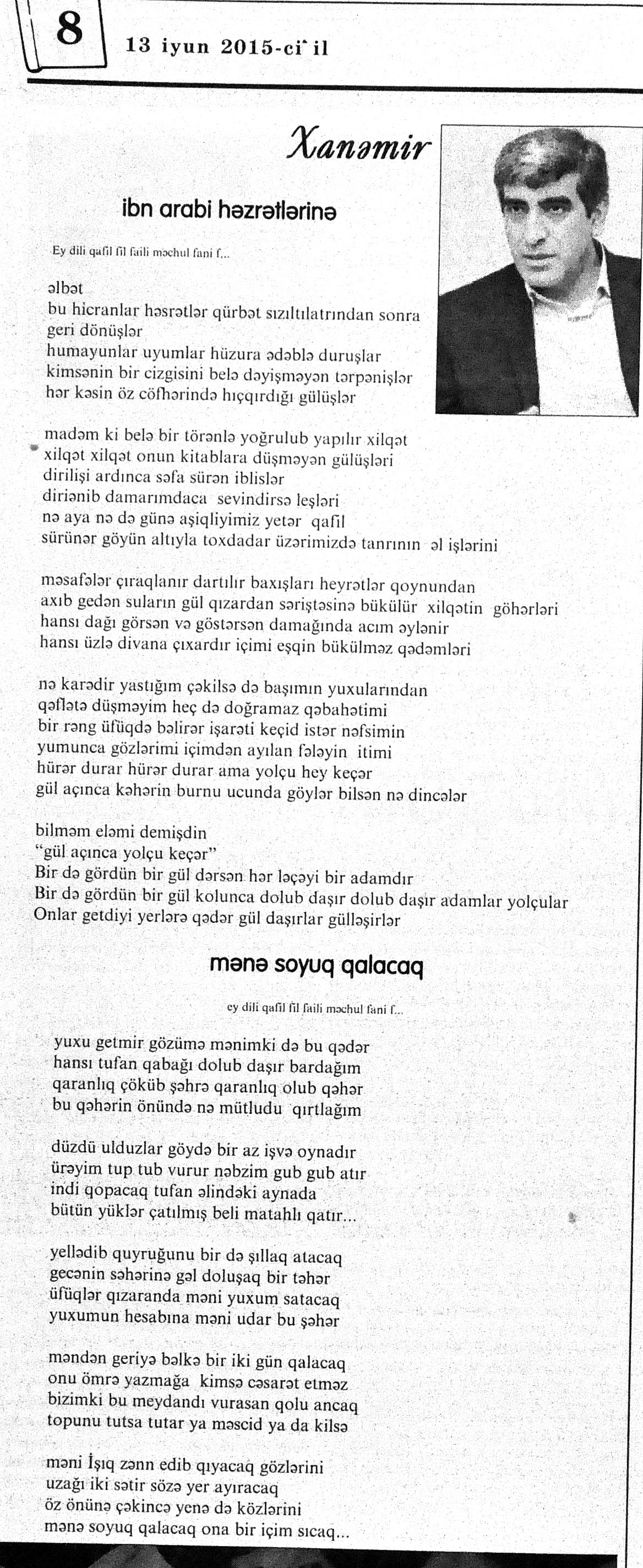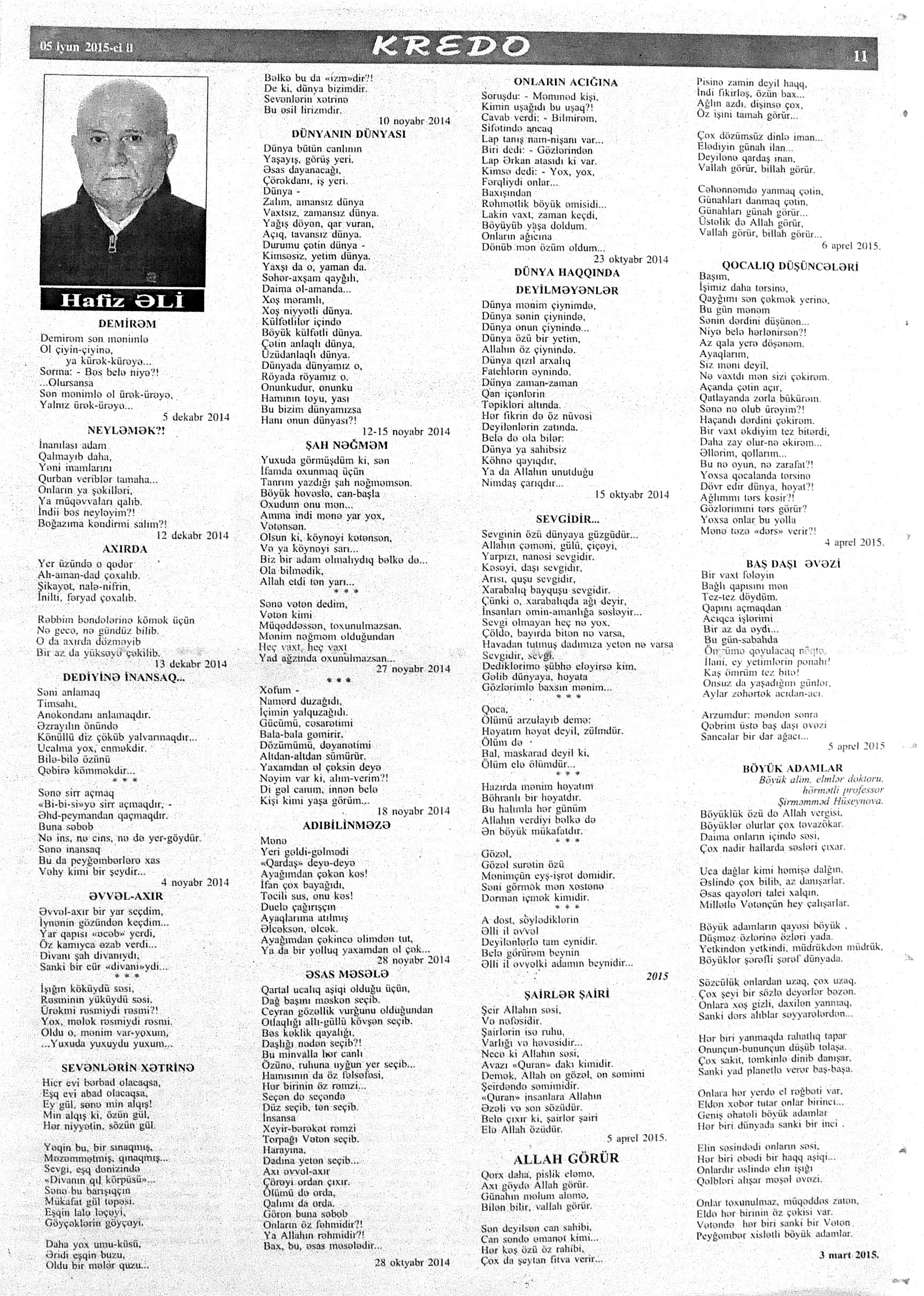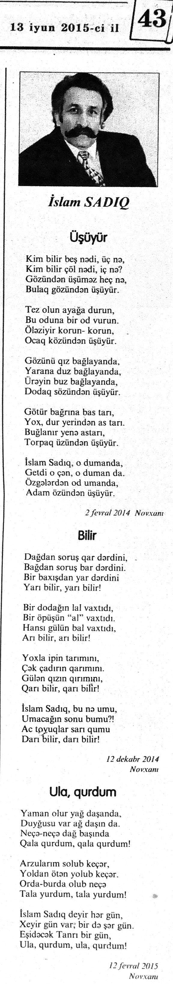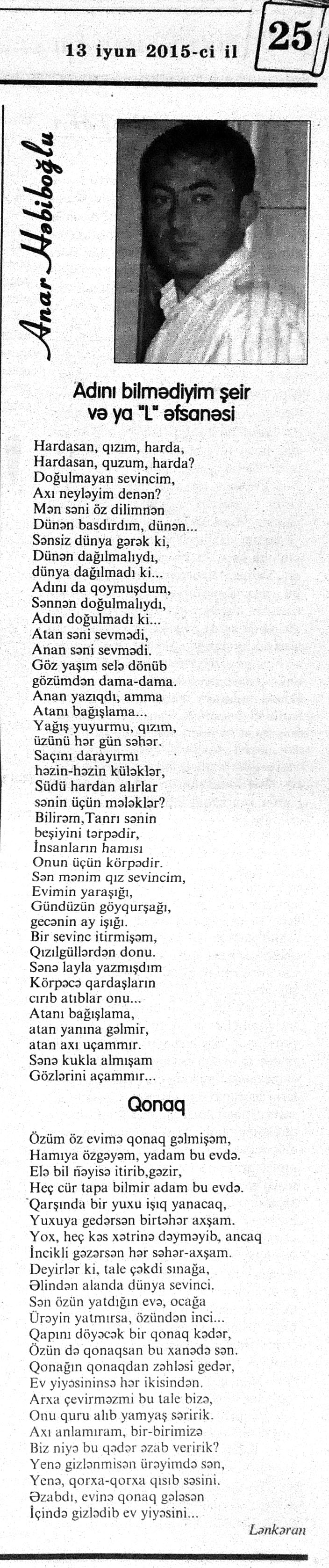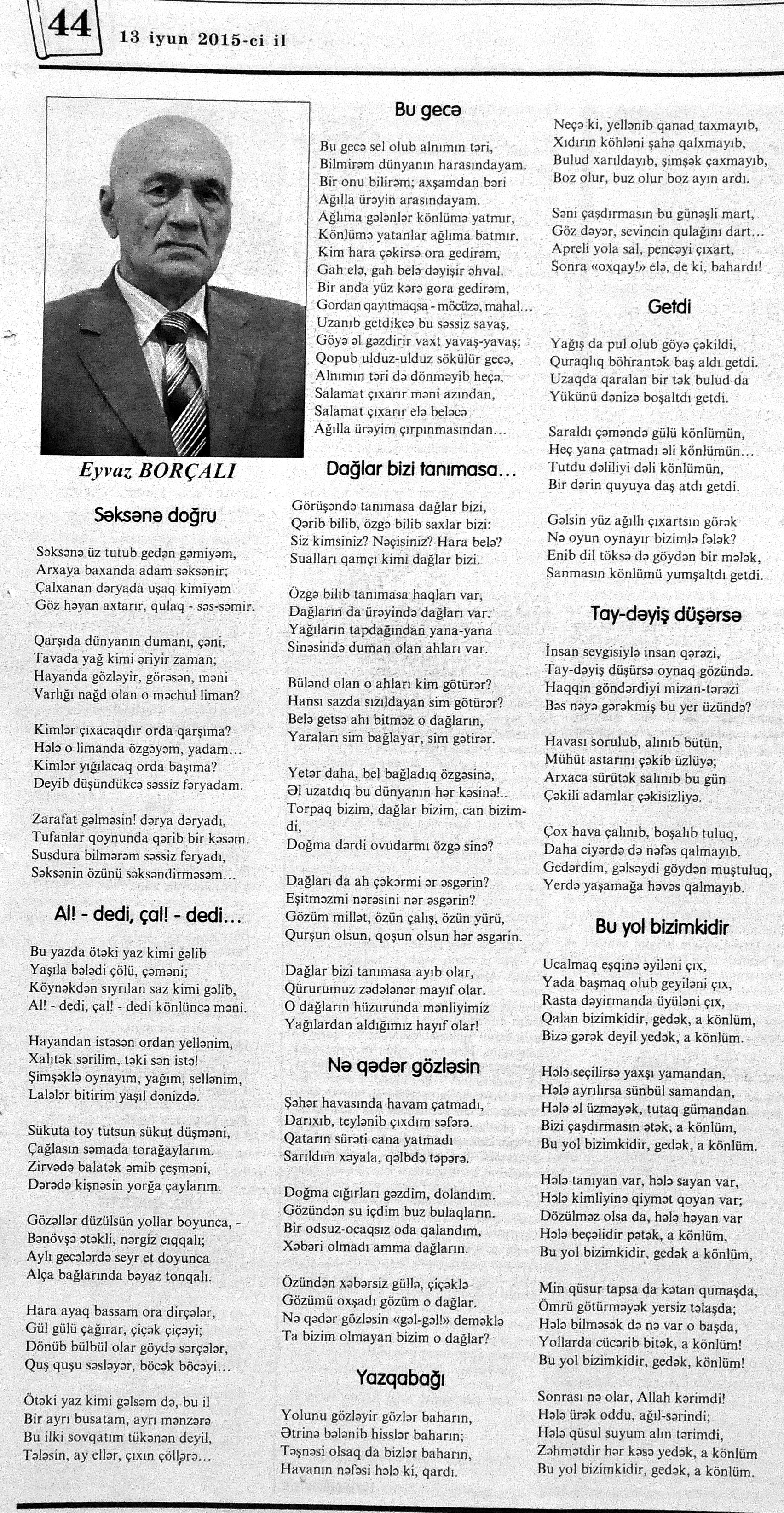 426. Abuzərli, N. Fateh-Sultan Dastanı və ya ürəkdən doğulanlar //Kredo.- 2015.- 19 iyun.- S.7. 427. Amin, A. Dünyanın hər yeri yarış yeridi...; Dilim açar imiş...; Biri tapar, biri itirər məni... və s. //Ədəbiyyat qəzeti.- 2015.- 6 iyun.- S.23. 428. Anar. Vaqifin Vaqifsiz ilk doğum günü: [Vaqif Səmədoğluna həsr olunub] //525-ci qəzet.- 2015.- 4 iyun.- S.7. 429. Asena, N. Xoş gəlmisən, Sən ömrümə 60 yaşım //Ədalət.- 2015.- 9 iyun.- S.8. 430. Aslan, M. Son nazlama; Kənardan baxana döyüş asan gələr; Qazi Gülxanə paşa və s. //525-ci qəzet.- 2015.- 6 iyun.- S.29. 431. Aslan, V. “Kəndin payızı” silsiləsindənı; Söz; Bir ürəyin iki üzü //525-ci qəzet.- 2015.- 20 iyun.- S.29. 432. Baxış, E. İndinin böyük şairi: Bu torpaq; Oğlu Andayın itkisinə yazdığı şeir; Məhəmməd Hadiyə və s. //Ədalət.- 2015.- 26 iyun.- S.14. 433. Behrudi, R. Qorxu, və yaxud görən niyə susub Allah; Qorxu; Xarabalıq və s. //Azadlıq.- 2015.- 30 iyun.- S.13. 434. Bəhmənli, V. İyirmi beş şeir: Bəxt; Rübai-Qoşma; Bir xatirə və s. //Azərbaycan : jurnal.- 2015.- №1.- S.7-29. 435. Borçalı, E. Səksənə doğru; Al! – dedi, çal! – dedi...; Bu gecə və s. //Ədəbiyyat qəzeti.- 2015.- 13 iyun.- S.44. 436. Cavanşir. Tənhayam bu tutqun payız axşamı; Ölüm nə, itim nə, bilməyəcəkdin...; Mən hər şeyə ağlayıram və s. //Ədəbiyyat qəzeti.- 2015.- 13 iyun.- S.13. 437. Çalğın, M. Bir polis dostu da olmadı anamın...; Təbriz qızarır uzaqlardan...; Dərd şirin... və s. //525-ci qəzet.- 2015.- 10 iyun.- S.8. 438. Çalğın, M. Xına gözlərində...; Kainatda təkrar yox...; Yellərin dodaqlarına kəpənəklərin qanadlarından... //Ədəbiyyat qəzeti.- 2015.- 13 iyun.- S.8. 439. Çərkəzoğlu. Söz //Ədalət.- 2015.- 11 iyun.- S.6. 440. Eyvazlı, G. Qaçdıq //Azərbaycan müəllimi.- 2015.- 13 iyun.- S.12. 441. Əhmədgil, A. Çanaqqala, bağışla, mən Şuşadan gəlmişəm: Çanaqqala savaşının 100 illiyinə //Ədəbiyyat qəzeti.- 2015.- 6 iyun.- S.32. 442. Ələkbərli, M. Dünya bir nəğmədir...: İstedadlı şair dostum Yusif Nəğməkarın 60 illik yubileyi münasibətilə //525-ci qəzet.- 2015.- 26 iyun.- S. 29. 443. Ələmoğlu, F. Gözün aydın Heydər Baba! //Azad Azərbaycan.- 2015.- 17 iyun.- S.7. 444. Əli, H. Demirəm; Neyləmək?!; Axırda və s. //Kredo.- 2015.- 5 iyun.- S.11. 445. Əlioğlu, Ə. Boşalan kəndə; Bu altmış yaş ki var...; Bircə anda və s. //Ədəbiyyat qəzeti.- 2015.- 13 iyun.- S.29. 446. Əsəd, F. Xatirə toranlığı...; Ömür deyilən çiçəkmiş...; Mən gedirəm sən də gəl... və s. //Azərbaycan: jurnal.- 2015.- №2.- S.97-99. 447. Əzimov, Ə. Ürəyim döyünür qəfəs içində: Şair olmaq qorxusu; “Yaz yağışları” silsiləsindən; Sözün rəngi və s. //Kredo.- 2015.- 19 iyun.- S.15. 448. Əziz, M. Ana, bizə indən belə gərəksən; Anam xəstələnib; Ana və s. //Ədalət.- 2015.- 4 iyun.- S.7. 449. Əzizxanlı, Q. Çanaqqala etüdləri //Kaspi.- 2015.- 6-8 iyun.- S.24. 450. Fikrət Sadıqın şeirləri: Vətəni tanımadım; Bilik üstə; Keşgə və s. //Kredo.- 2015.- 19 iyun.- S.8. 451. Göyçəli, M. Oğlum; Bu səs; Səbrinizə qurban olum və s. //Ədəbiyyat qəzeti.- 2015.- 13 iyun.- S.34. 452. Gülayə. Gəldim; Yarası ağrayır şeir balamın; Torpağın üstündə bir şeir gəzir //Kaspi.- 2015.-20-22 iyun.- S.24. 453. Gültac, N. Yük; ölüm ayrılıq deyil...; Dəsmal və s. //Azərbaycan: jurnal.- 2015.- № 3.- S.130-131. 454. Gün, N. Yol gedirəm; Döydüm qapını; Fırlanğıc //Kaspi.- 2015.- 6-8 iyun.- S.18. 455. Hacıheydərli, N. Yarandın: (Mübariz İbrahimov üçün) //Olaylar.- 2015.- 19 iyun.- S.15. 456. Herisçi, H. Tərsa qızı; Suiti; Edison lampası və s. //Azərbaycan: jurnal.- 2015.- №2.- S.53-62. 457. Həbiboğlu, A. Adını bilmədiyim şeir və ya “L” əfsanəsi; Qonaq //Ədəbiyyat qəzeti.- 2015.- 13 iyun.- S.25. 458. Həsənqulu, K. Qlobusun göz yaşları; Kiçik formatda küçə; Qarğa səsləri və s. //Azərbaycan: jurnal.- 2015.- №2.- S.144-153. 459. Həsənli, G. Daş; Dünya; Axtarır //Kaspi.- 2015.- 6-8 iyun.- S.18. //Kaspi.- 2015.- 6-8 iyun.- S.18. 460. Həsənzadə, F. Dostum; Yandır yağışı; Hərdən səni istəyirəm və s. //Azərbaycan: jurnal.- 2015.- №3.- S.143-146. 461. Həsrət, Ə. Səni yaralı sevdim; Görək kim gözəl ayrılır; Dünyanın düzəlmək təhlükəsi var və s. //Azərbaycan: jurnal.- 2015.- № 2. - S.154-156. 462. Horovlu, Ş. Bilirəm, gəlməzsən...; Gedən adam; Özümlə görüşə bilsəm... və s. //525-ci qəzet.- 2015.- 4 iyun.- S.7. 463. Hüseyn, F. Anlayıram; 25 yaşın şeiri; İstanbul gecəsinə və s. //Kaspi.- 2015.- 6-8 iyun.- S.10. 464. Xanəmir. İbn arabi həzrətlərinə; Mənə soyuq qalacaq //Ədəbiyyat qəzeti.- 2015.- 13 iyun.- S.8. 465. İsrafilqızı, N. Nar giləsi, nar dənəsi, Azərbaycan təntənəsi //Ədalət.- 2015.- 26 iyun.- S.6. 466. Kərimi, G. Qar gəlir; Göyərçin; Zəminxarə və s. //Azərbaycan: jurnal.- 2015.- № 3.- S. 158-161. 467. Qafarlı, Z. Yaşadım: Verdin; Böyründə üşüyürəm və s. //Azərbaycan : jurnal.- 2015.- №1.- S.122-126. 468. Qarabulaq, H. Günahsız ölüm - gözəl...: Dünya və biz; Ölümlərin içində; Dünyanın axırı və s. //Kredo.- 2015.- 26 iyun.- S.11. 469. Qaraçaylı, Q. Çiynimə düşən yarpaq; Məni çəkmə, ay rəssam qız; Sevdim səni və s. //Ədəbiyyat qəzeti.- 2015.- 6 iyun.- S.13. 470. Qaraişıq, R. Sevgili dostum; Bilmədim; Ad günüm və s. //Kaspi.- 2015.- 13-16 iyun.- S.20. 471. Qəhrəman, İ. Səni sevmək; Kim halından halı bilər...; Qürur və s. //Azərbaycan: jurnal.- 2015.- № 2.- S. 92-96. 472. Qoca Zadə, B. Səni sevmək günahımdır: Qarabağım yenə ürək dağlayır; Düşman tökür bombaları...; Qayıt mənə və s. //Ədalət.- 2015.- 5 iyun.- S.7. 473. Qurbanov, S. Yeridi; Başladı; Ağ