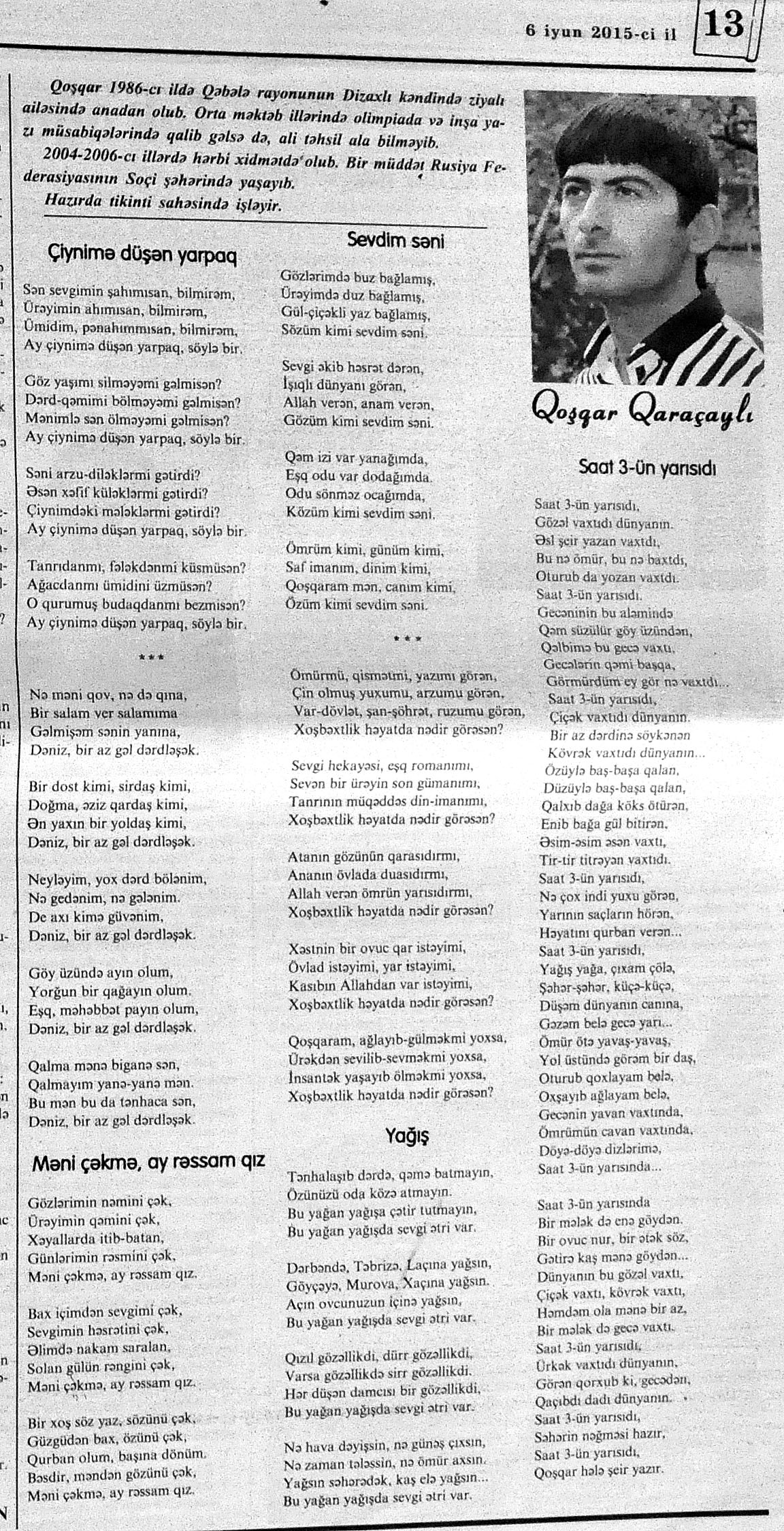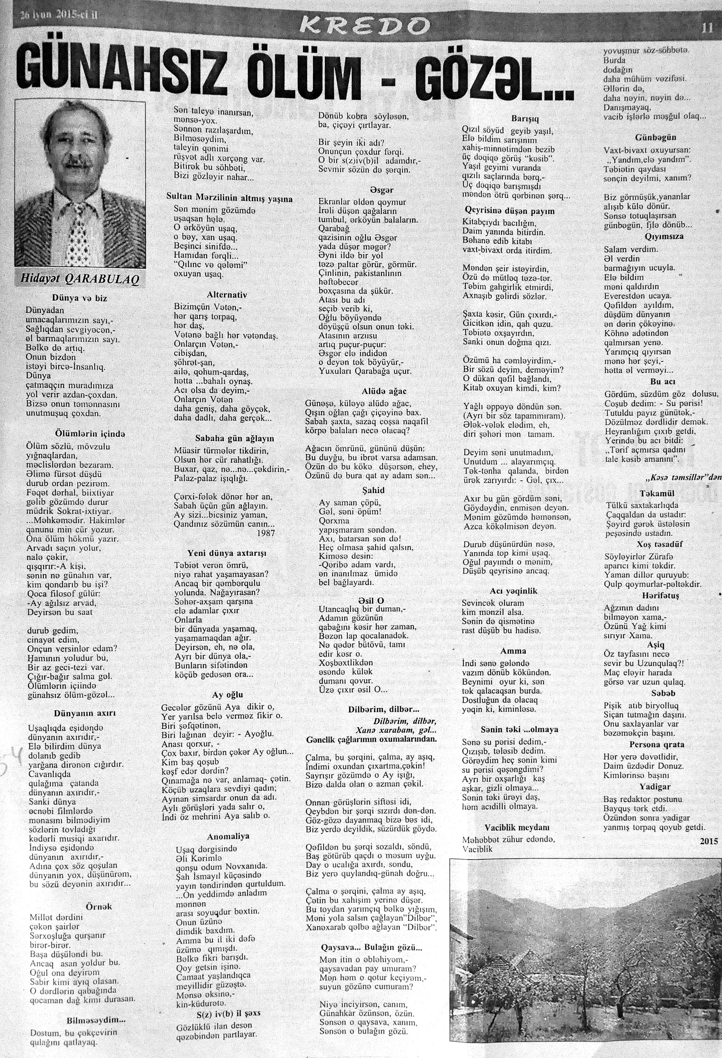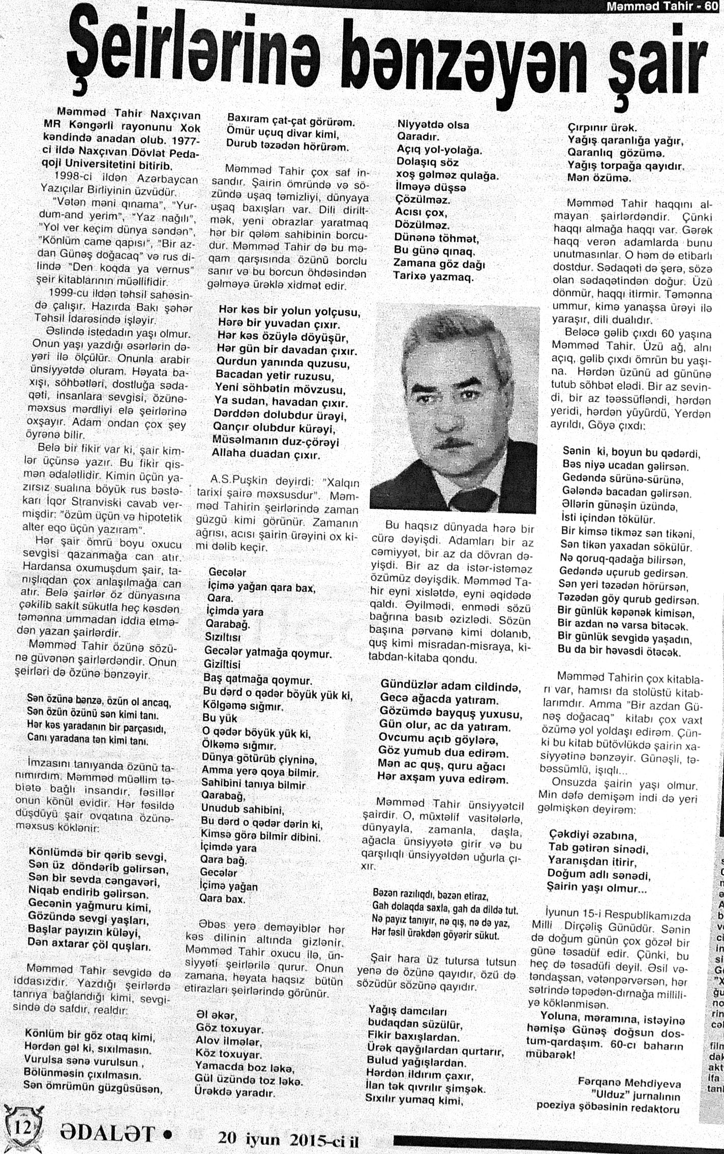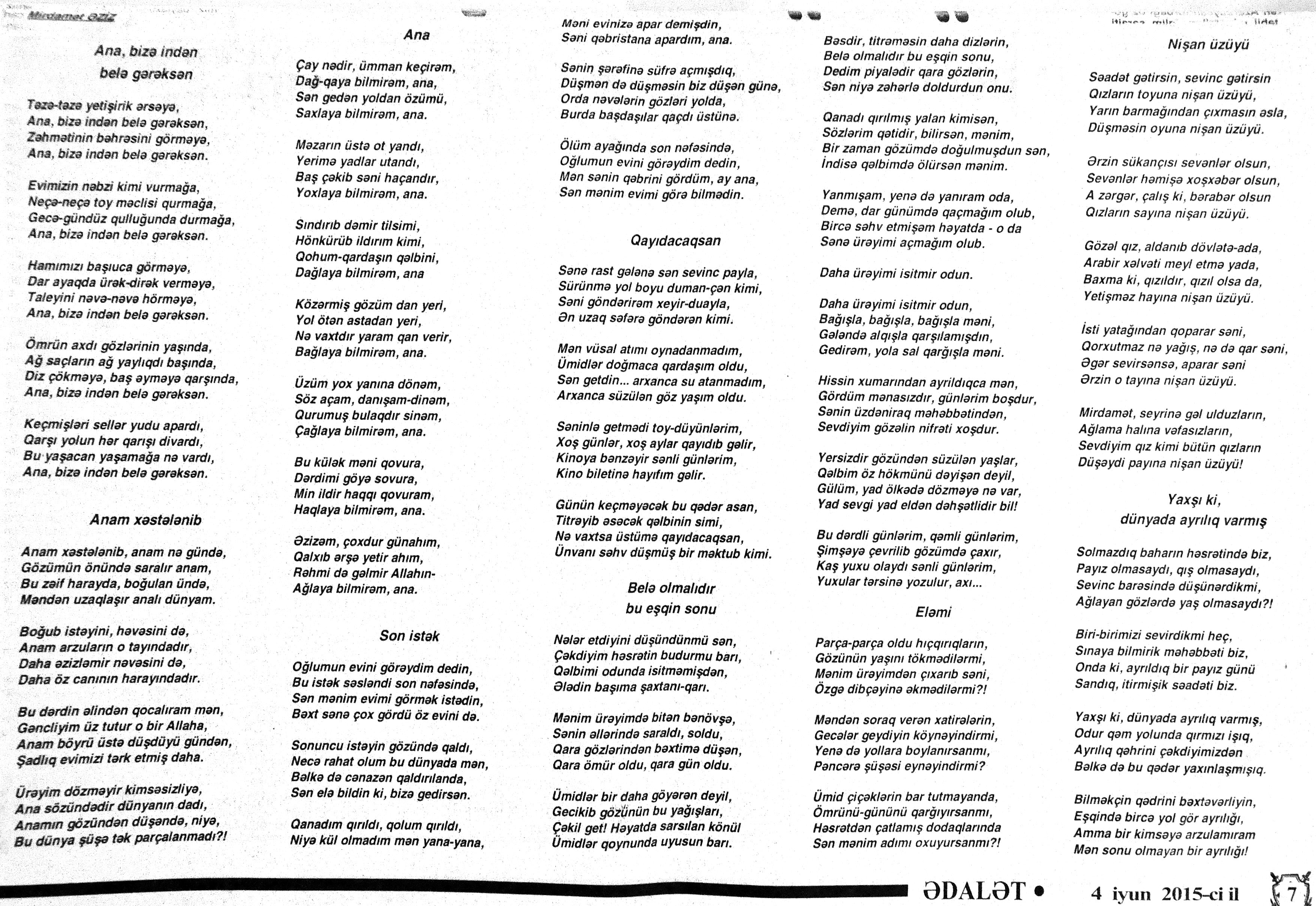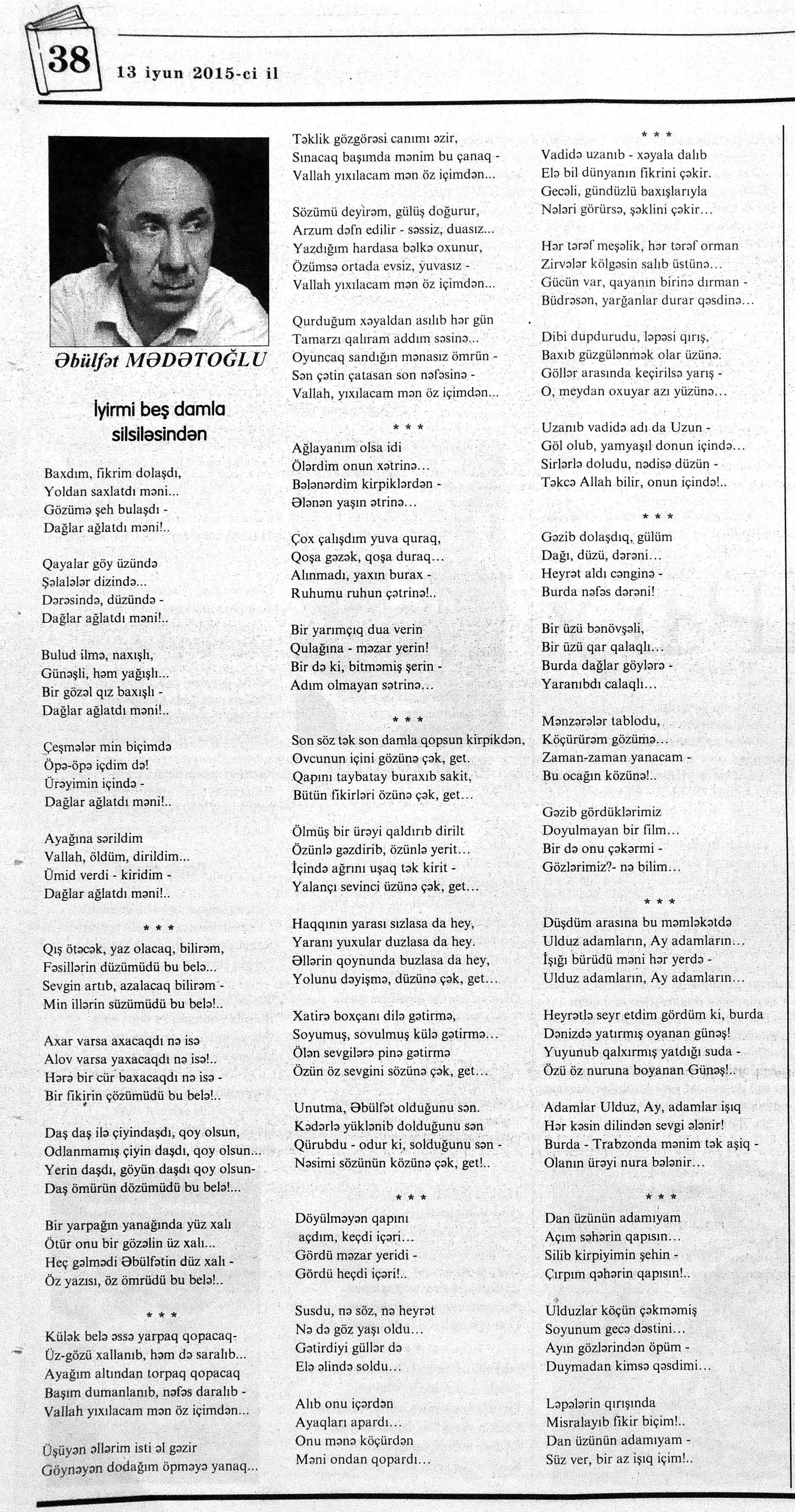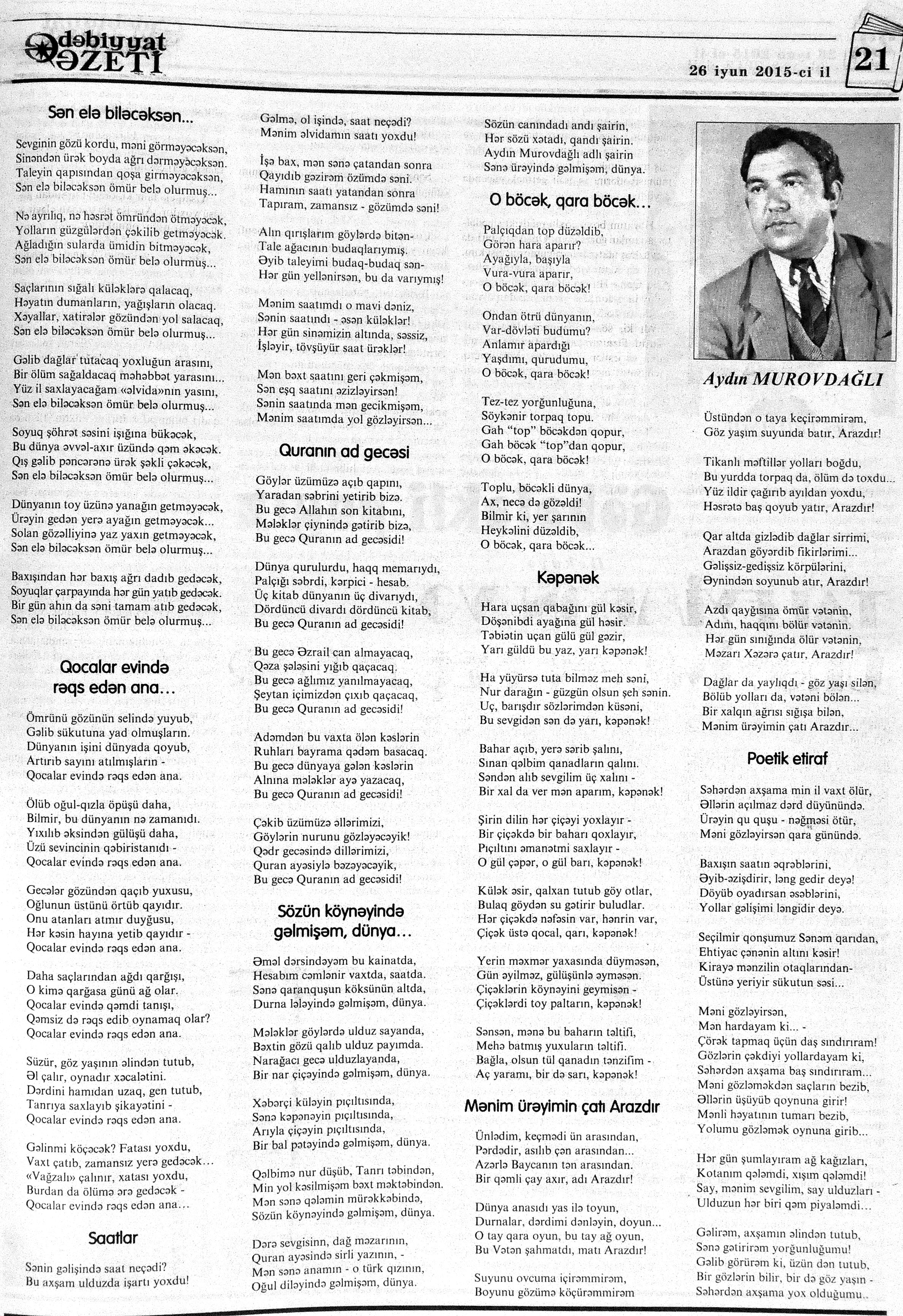 426. Abuzərli, N. Fateh-Sultan Dastanı və ya ürəkdən doğulanlar //Kredo.- 2015.- 19 iyun.- S.7. 427. Amin, A. Dünyanın hər yeri yarış yeridi...; Dilim açar imiş...; Biri tapar, biri itirər məni... və s. //Ədəbiyyat qəzeti.- 2015.- 6 iyun.- S.23. 428. Anar. Vaqifin Vaqifsiz ilk doğum günü: [Vaqif Səmədoğluna həsr olunub] //525-ci qəzet.- 2015.- 4 iyun.- S.7. 429. Asena, N. Xoş gəlmisən, Sən ömrümə 60 yaşım //Ədalət.- 2015.- 9 iyun.- S.8. 430. Aslan, M. Son nazlama; Kənardan baxana döyüş asan gələr; Qazi Gülxanə paşa və s. //525-ci qəzet.- 2015.- 6 iyun.- S.29. 431. Aslan, V. “Kəndin payızı” silsiləsindənı; Söz; Bir ürəyin iki üzü //525-ci qəzet.- 2015.- 20 iyun.- S.29. 432. Baxış, E. İndinin böyük şairi: Bu torpaq; Oğlu Andayın itkisinə yazdığı şeir; Məhəmməd Hadiyə və s. //Ədalət.- 2015.- 26 iyun.- S.14. 433. Behrudi, R. Qorxu, və yaxud görən niyə susub Allah; Qorxu; Xarabalıq və s. //Azadlıq.- 2015.- 30 iyun.- S.13. 434. Bəhmənli, V. İyirmi beş şeir: Bəxt; Rübai-Qoşma; Bir xatirə və s. //Azərbaycan : jurnal.- 2015.- №1.- S.7-29. 435. Borçalı, E. Səksənə doğru; Al! – dedi, çal! – dedi...; Bu gecə və s. //Ədəbiyyat qəzeti.- 2015.- 13 iyun.- S.44. 436. Cavanşir. Tənhayam bu tutqun payız axşamı; Ölüm nə, itim nə, bilməyəcəkdin...; Mən hər şeyə ağlayıram və s. //Ədəbiyyat qəzeti.- 2015.- 13 iyun.- S.13. 437. Çalğın, M. Bir polis dostu da olmadı anamın...; Təbriz qızarır uzaqlardan...; Dərd şirin... və s. //525-ci qəzet.- 2015.- 10 iyun.- S.8. 438. Çalğın, M. Xına gözlərində...; Kainatda təkrar yox...; Yellərin dodaqlarına kəpənəklərin qanadlarından... //Ədəbiyyat qəzeti.- 2015.- 13 iyun.- S.8. 439. Çərkəzoğlu. Söz //Ədalət.- 2015.- 11 iyun.- S.6. 440. Eyvazlı, G. Qaçdıq //Azərbaycan müəllimi.- 2015.- 13 iyun.- S.12. 441. Əhmədgil, A. Çanaqqala, bağışla, mən Şuşadan gəlmişəm: Çanaqqala savaşının 100 illiyinə //Ədəbiyyat qəzeti.- 2015.- 6 iyun.- S.32. 442. Ələkbərli, M. Dünya bir nəğmədir...: İstedadlı şair dostum Yusif Nəğməkarın 60 illik yubileyi münasibətilə //525-ci qəzet.- 2015.- 26 iyun.- S. 29. 443. Ələmoğlu, F. Gözün aydın Heydər Baba! //Azad Azərbaycan.- 2015.- 17 iyun.- S.7. 444. Əli, H. Demirəm; Neyləmək?!; Axırda və s. //Kredo.- 2015.- 5 iyun.- S.11. 445. Əlioğlu, Ə. Boşalan kəndə; Bu altmış yaş ki var...; Bircə anda və s. //Ədəbiyyat qəzeti.- 2015.- 13 iyun.- S.29. 446. Əsəd, F. Xatirə toranlığı...; Ömür deyilən çiçəkmiş...; Mən gedirəm sən də gəl... və s. //Azərbaycan: jurnal.- 2015.- №2.- S.97-99. 447. Əzimov, Ə. Ürəyim döyünür qəfəs içində: Şair olmaq qorxusu; “Yaz yağışları” silsiləsindən; Sözün rəngi və s. //Kredo.- 2015.- 19 iyun.- S.15. 448. Əziz, M. Ana, bizə indən belə gərəksən; Anam xəstələnib; Ana və s. //Ədalət.- 2015.- 4 iyun.- S.7. 449. Əzizxanlı, Q. Çanaqqala etüdləri //Kaspi.- 2015.- 6-8 iyun.- S.24. 450. Fikrət Sadıqın şeirləri: Vətəni tanımadım; Bilik üstə; Keşgə və s. //Kredo.- 2015.- 19 iyun.- S.8. 451. Göyçəli, M. Oğlum; Bu səs; Səbrinizə qurban olum və s. //Ədəbiyyat qəzeti.- 2015.- 13 iyun.- S.34. 452. Gülayə. Gəldim; Yarası ağrayır şeir balamın; Torpağın üstündə bir şeir gəzir //Kaspi.- 2015.-20-22 iyun.- S.24. 453. Gültac, N. Yük; ölüm ayrılıq deyil...; Dəsmal və s. //Azərbaycan: jurnal.- 2015.- № 3.- S.130-131. 454. Gün, N. Yol gedirəm; Döydüm qapını; Fırlanğıc //Kaspi.- 2015.- 6-8 iyun.- S.18. 455. Hacıheydərli, N. Yarandın: (Mübariz İbrahimov üçün) //Olaylar.- 2015.- 19 iyun.- S.15. 456. Herisçi, H. Tərsa qızı; Suiti; Edison lampası və s. //Azərbaycan: jurnal.- 2015.- №2.- S.53-62. 457. Həbiboğlu, A. Adını bilmədiyim şeir və ya “L” əfsanəsi; Qonaq //Ədəbiyyat qəzeti.- 2015.- 13 iyun.- S.25. 458. Həsənqulu, K. Qlobusun göz yaşları; Kiçik formatda küçə; Qarğa səsləri və s. //Azərbaycan: jurnal.- 2015.- №2.- S.144-153. 459. Həsənli, G. Daş; Dünya; Axtarır //Kaspi.- 2015.- 6-8 iyun.- S.18. //Kaspi.- 2015.- 6-8 iyun.- S.18. 460. Həsənzadə, F. Dostum; Yandır yağışı; Hərdən səni istəyirəm və s. //Azərbaycan: jurnal.- 2015.- №3.- S.143-146. 461. Həsrət, Ə. Səni yaralı sevdim; Görək kim gözəl ayrılır; Dünyanın düzəlmək təhlükəsi var və s. //Azərbaycan: jurnal.- 2015.- № 2. - S.154-156. 462. Horovlu, Ş. Bilirəm, gəlməzsən...; Gedən adam; Özümlə görüşə bilsəm... və s. //525-ci qəzet.- 2015.- 4 iyun.- S.7. 463. Hüseyn, F. Anlayıram; 25 yaşın şeiri; İstanbul gecəsinə və s. //Kaspi.- 2015.- 6-8 iyun.- S.10. 464. Xanəmir. İbn arabi həzrətlərinə; Mənə soyuq qalacaq //Ədəbiyyat qəzeti.- 2015.- 13 iyun.- S.8. 465. İsrafilqızı, N. Nar giləsi, nar dənəsi, Azərbaycan təntənəsi //Ədalət.- 2015.- 26 iyun.- S.6. 466. Kərimi, G. Qar gəlir; Göyərçin; Zəminxarə və s. //Azərbaycan: jurnal.- 2015.- № 3.- S. 158-161. 467. Qafarlı, Z. Yaşadım: Verdin; Böyründə üşüyürəm və s. //Azərbaycan : jurnal.- 2015.- №1.- S.122-126. 468. Qarabulaq, H. Günahsız ölüm - gözəl...: Dünya və biz; Ölümlərin içində; Dünyanın axırı və s. //Kredo.- 2015.- 26 iyun.- S.11. 469. Qaraçaylı, Q. Çiynimə düşən yarpaq; Məni çəkmə, ay rəssam qız; Sevdim səni və s. //Ədəbiyyat qəzeti.- 2015.- 6 iyun.- S.13. 470. Qaraişıq, R. Sevgili dostum; Bilmədim; Ad günüm və s. //Kaspi.- 2015.- 13-16 iyun.- S.20. 471. Qəhrəman, İ. Səni sevmək; Kim halından halı bilər...; Qürur və s. //Azərbaycan: jurnal.- 2015.- № 2.- S. 92-96. 472. Qoca Zadə, B. Səni sevmək günahımdır: Qarabağım yenə ürək dağlayır; Düşman tökür bombaları...; Qayıt mənə və s. //Ədalət.- 2015.- 5 iyun.- S.7. 473. Qurbanov, S. Yeridi; Başladı; Ağ