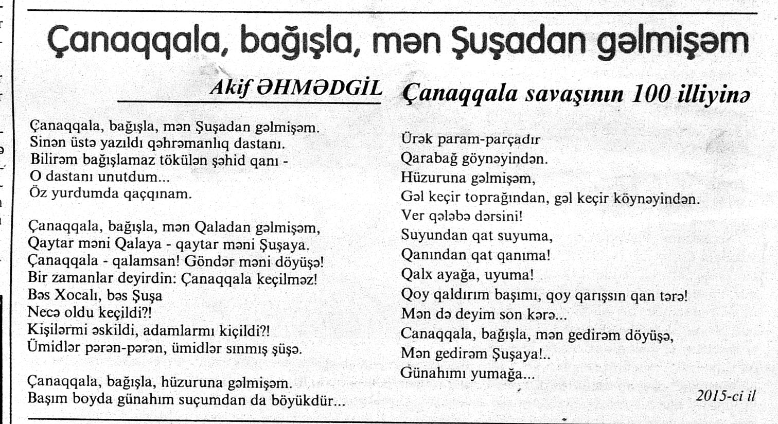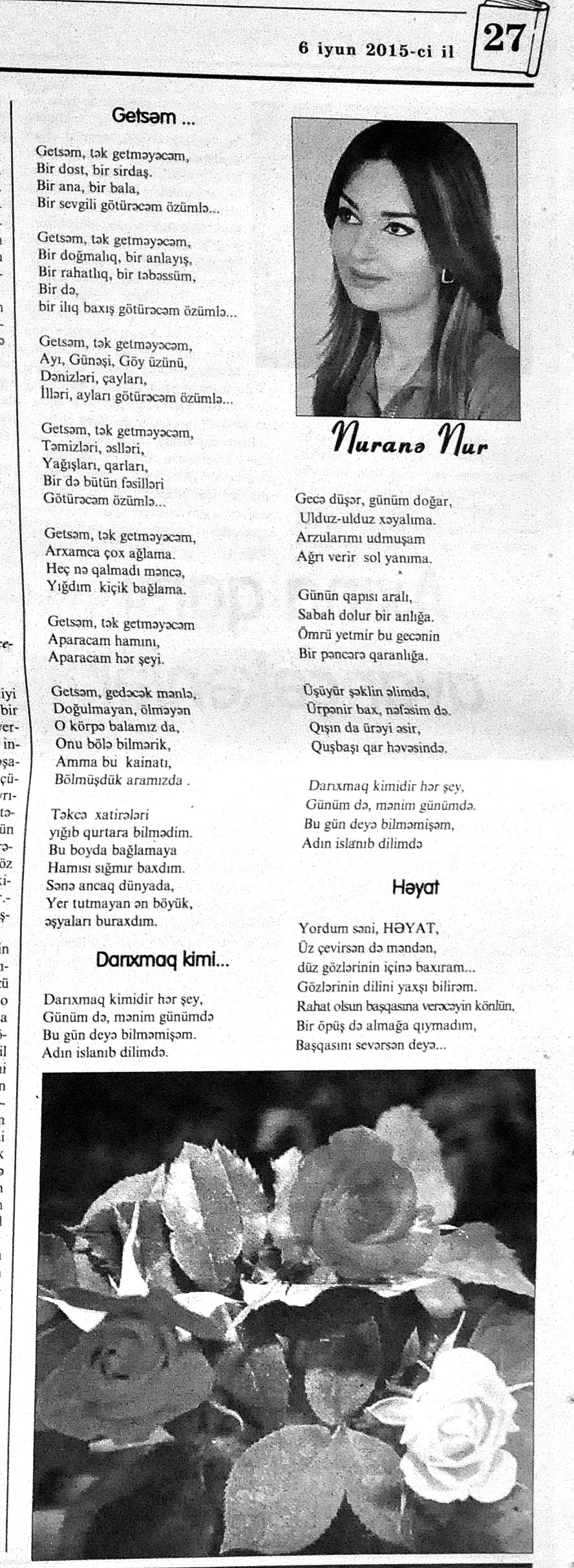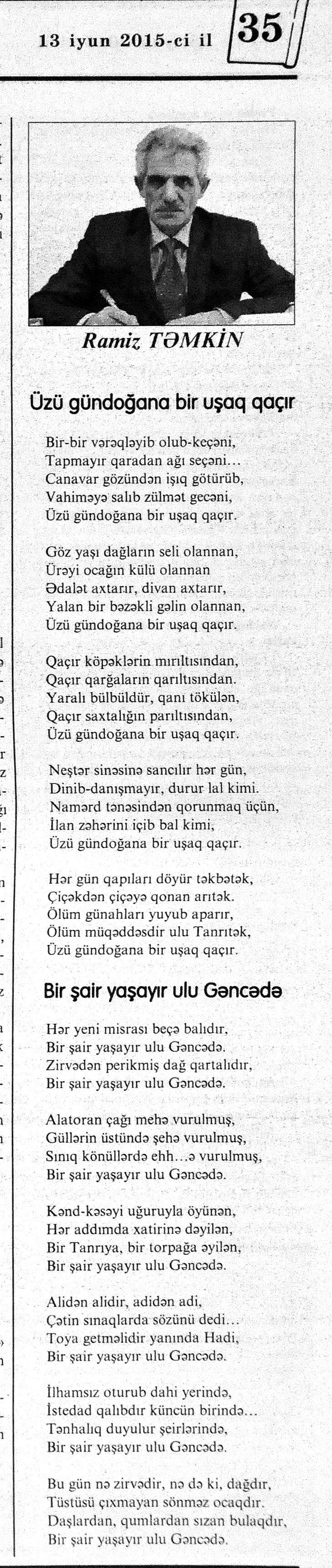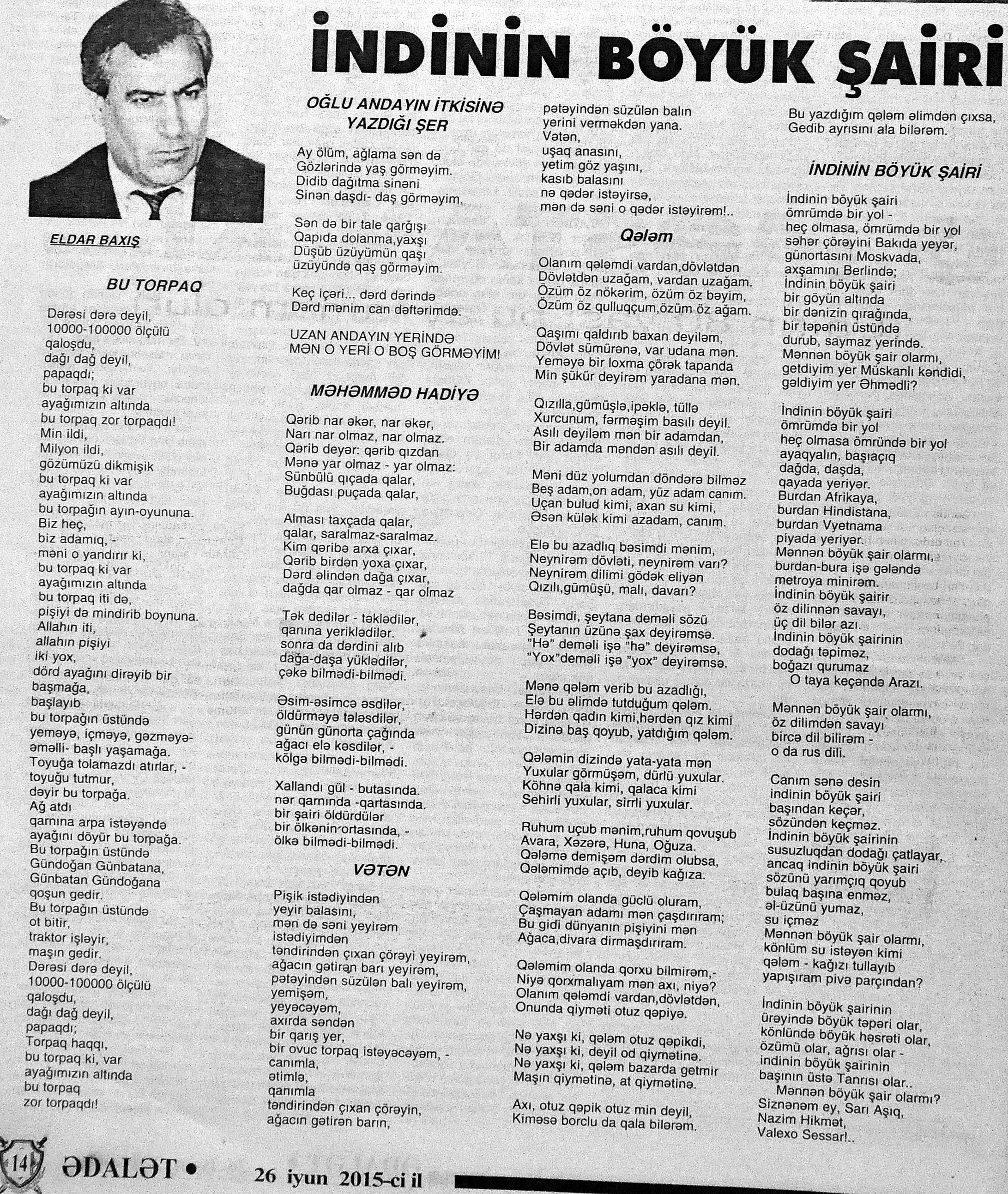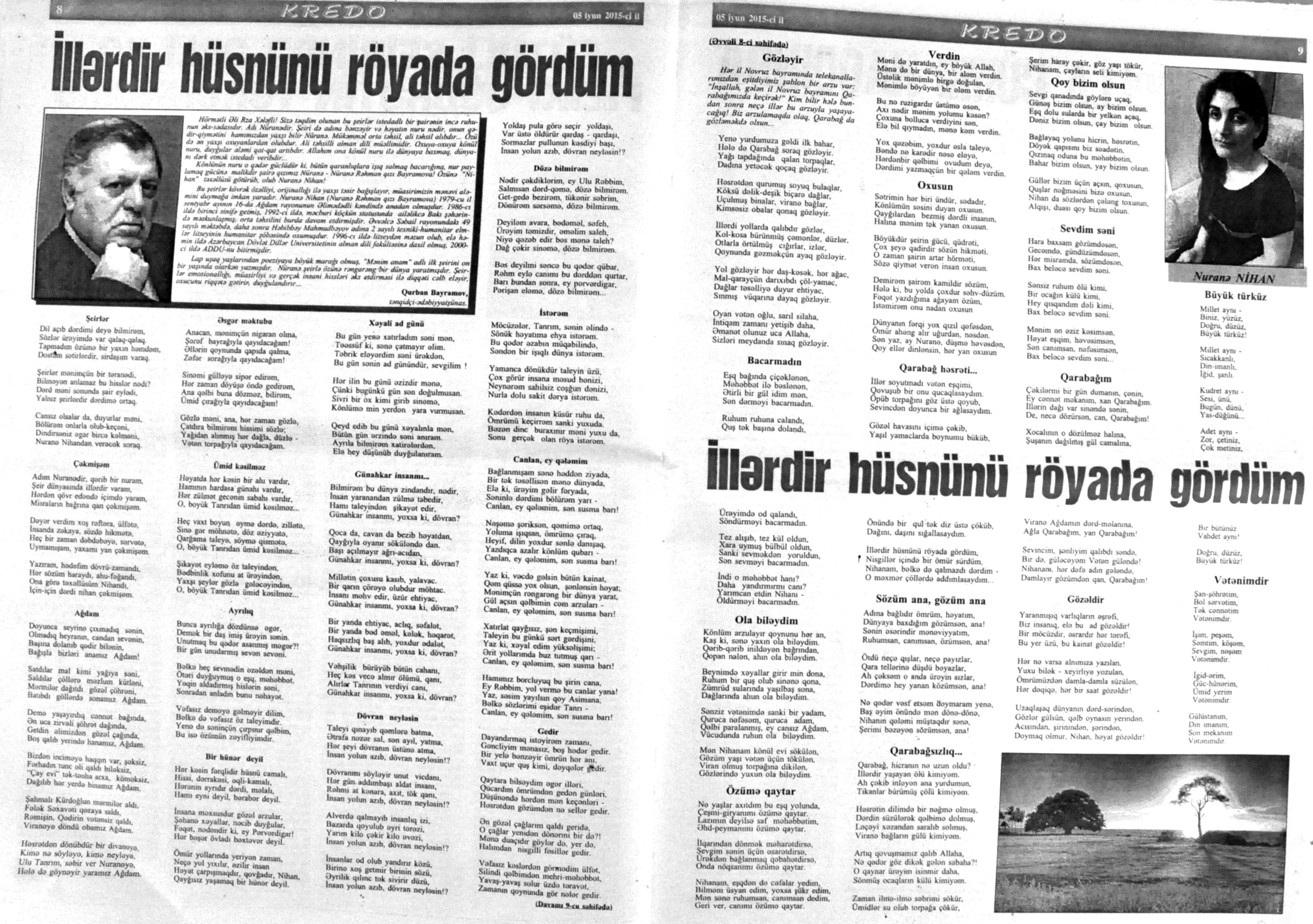 426. Abuzərli, N. Fateh-Sultan Dastanı və ya ürəkdən doğulanlar //Kredo.- 2015.- 19 iyun.- S.7. 427. Amin, A. Dünyanın hər yeri yarış yeridi...; Dilim açar imiş...; Biri tapar, biri itirər məni... və s. //Ədəbiyyat qəzeti.- 2015.- 6 iyun.- S.23. 428. Anar. Vaqifin Vaqifsiz ilk doğum günü: [Vaqif Səmədoğluna həsr olunub] //525-ci qəzet.- 2015.- 4 iyun.- S.7. 429. Asena, N. Xoş gəlmisən, Sən ömrümə 60 yaşım //Ədalət.- 2015.- 9 iyun.- S.8. 430. Aslan, M. Son nazlama; Kənardan baxana döyüş asan gələr; Qazi Gülxanə paşa və s. //525-ci qəzet.- 2015.- 6 iyun.- S.29. 431. Aslan, V. “Kəndin payızı” silsiləsindənı; Söz; Bir ürəyin iki üzü //525-ci qəzet.- 2015.- 20 iyun.- S.29. 432. Baxış, E. İndinin böyük şairi: Bu torpaq; Oğlu Andayın itkisinə yazdığı şeir; Məhəmməd Hadiyə və s. //Ədalət.- 2015.- 26 iyun.- S.14. 433. Behrudi, R. Qorxu, və yaxud görən niyə susub Allah; Qorxu; Xarabalıq və s. //Azadlıq.- 2015.- 30 iyun.- S.13. 434. Bəhmənli, V. İyirmi beş şeir: Bəxt; Rübai-Qoşma; Bir xatirə və s. //Azərbaycan : jurnal.- 2015.- №1.- S.7-29. 435. Borçalı, E. Səksənə doğru; Al! – dedi, çal! – dedi...; Bu gecə və s. //Ədəbiyyat qəzeti.- 2015.- 13 iyun.- S.44. 436. Cavanşir. Tənhayam bu tutqun payız axşamı; Ölüm nə, itim nə, bilməyəcəkdin...; Mən hər şeyə ağlayıram və s. //Ədəbiyyat qəzeti.- 2015.- 13 iyun.- S.13. 437. Çalğın, M. Bir polis dostu da olmadı anamın...; Təbriz qızarır uzaqlardan...; Dərd şirin... və s. //525-ci qəzet.- 2015.- 10 iyun.- S.8. 438. Çalğın, M. Xına gözlərində...; Kainatda təkrar yox...; Yellərin dodaqlarına kəpənəklərin qanadlarından... //Ədəbiyyat qəzeti.- 2015.- 13 iyun.- S.8. 439. Çərkəzoğlu. Söz //Ədalət.- 2015.- 11 iyun.- S.6. 440. Eyvazlı, G. Qaçdıq //Azərbaycan müəllimi.- 2015.- 13 iyun.- S.12. 441. Əhmədgil, A. Çanaqqala, bağışla, mən Şuşadan gəlmişəm: Çanaqqala savaşının 100 illiyinə //Ədəbiyyat qəzeti.- 2015.- 6 iyun.- S.32. 442. Ələkbərli, M. Dünya bir nəğmədir...: İstedadlı şair dostum Yusif Nəğməkarın 60 illik yubileyi münasibətilə //525-ci qəzet.- 2015.- 26 iyun.- S. 29. 443. Ələmoğlu, F. Gözün aydın Heydər Baba! //Azad Azərbaycan.- 2015.- 17 iyun.- S.7. 444. Əli, H. Demirəm; Neyləmək?!; Axırda və s. //Kredo.- 2015.- 5 iyun.- S.11. 445. Əlioğlu, Ə. Boşalan kəndə; Bu altmış yaş ki var...; Bircə anda və s. //Ədəbiyyat qəzeti.- 2015.- 13 iyun.- S.29. 446. Əsəd, F. Xatirə toranlığı...; Ömür deyilən çiçəkmiş...; Mən gedirəm sən də gəl... və s. //Azərbaycan: jurnal.- 2015.- №2.- S.97-99. 447. Əzimov, Ə. Ürəyim döyünür qəfəs içində: Şair olmaq qorxusu; “Yaz yağışları” silsiləsindən; Sözün rəngi və s. //Kredo.- 2015.- 19 iyun.- S.15. 448. Əziz, M. Ana, bizə indən belə gərəksən; Anam xəstələnib; Ana və s. //Ədalət.- 2015.- 4 iyun.- S.7. 449. Əzizxanlı, Q. Çanaqqala etüdləri //Kaspi.- 2015.- 6-8 iyun.- S.24. 450. Fikrət Sadıqın şeirləri: Vətəni tanımadım; Bilik üstə; Keşgə və s. //Kredo.- 2015.- 19 iyun.- S.8. 451. Göyçəli, M. Oğlum; Bu səs; Səbrinizə qurban olum və s. //Ədəbiyyat qəzeti.- 2015.- 13 iyun.- S.34. 452. Gülayə. Gəldim; Yarası ağrayır şeir balamın; Torpağın üstündə bir şeir gəzir //Kaspi.- 2015.-20-22 iyun.- S.24. 453. Gültac, N. Yük; ölüm ayrılıq deyil...; Dəsmal və s. //Azərbaycan: jurnal.- 2015.- № 3.- S.130-131. 454. Gün, N. Yol gedirəm; Döydüm qapını; Fırlanğıc //Kaspi.- 2015.- 6-8 iyun.- S.18. 455. Hacıheydərli, N. Yarandın: (Mübariz İbrahimov üçün) //Olaylar.- 2015.- 19 iyun.- S.15. 456. Herisçi, H. Tərsa qızı; Suiti; Edison lampası və s. //Azərbaycan: jurnal.- 2015.- №2.- S.53-62. 457. Həbiboğlu, A. Adını bilmədiyim şeir və ya “L” əfsanəsi; Qonaq //Ədəbiyyat qəzeti.- 2015.- 13 iyun.- S.25. 458. Həsənqulu, K. Qlobusun göz yaşları; Kiçik formatda küçə; Qarğa səsləri və s. //Azərbaycan: jurnal.- 2015.- №2.- S.144-153. 459. Həsənli, G. Daş; Dünya; Axtarır //Kaspi.- 2015.- 6-8 iyun.- S.18. //Kaspi.- 2015.- 6-8 iyun.- S.18. 460. Həsənzadə, F. Dostum; Yandır yağışı; Hərdən səni istəyirəm və s. //Azərbaycan: jurnal.- 2015.- №3.- S.143-146. 461. Həsrət, Ə. Səni yaralı sevdim; Görək kim gözəl ayrılır; Dünyanın düzəlmək təhlükəsi var və s. //Azərbaycan: jurnal.- 2015.- № 2. - S.154-156. 462. Horovlu, Ş. Bilirəm, gəlməzsən...; Gedən adam; Özümlə görüşə bilsəm... və s. //525-ci qəzet.- 2015.- 4 iyun.- S.7. 463. Hüseyn, F. Anlayıram; 25 yaşın şeiri; İstanbul gecəsinə və s. //Kaspi.- 2015.- 6-8 iyun.- S.10. 464. Xanəmir. İbn arabi həzrətlərinə; Mənə soyuq qalacaq //Ədəbiyyat qəzeti.- 2015.- 13 iyun.- S.8. 465. İsrafilqızı, N. Nar giləsi, nar dənəsi, Azərbaycan təntənəsi //Ədalət.- 2015.- 26 iyun.- S.6. 466. Kərimi, G. Qar gəlir; Göyərçin; Zəminxarə və s. //Azərbaycan: jurnal.- 2015.- № 3.- S. 158-161. 467. Qafarlı, Z. Yaşadım: Verdin; Böyründə üşüyürəm və s. //Azərbaycan : jurnal.- 2015.- №1.- S.122-126. 468. Qarabulaq, H. Günahsız ölüm - gözəl...: Dünya və biz; Ölümlərin içində; Dünyanın axırı və s. //Kredo.- 2015.- 26 iyun.- S.11. 469. Qaraçaylı, Q. Çiynimə düşən yarpaq; Məni çəkmə, ay rəssam qız; Sevdim səni və s. //Ədəbiyyat qəzeti.- 2015.- 6 iyun.- S.13. 470. Qaraişıq, R. Sevgili dostum; Bilmədim; Ad günüm və s. //Kaspi.- 2015.- 13-16 iyun.- S.20. 471. Qəhrəman, İ. Səni sevmək; Kim halından halı bilər...; Qürur və s. //Azərbaycan: jurnal.- 2015.- № 2.- S. 92-96. 472. Qoca Zadə, B. Səni sevmək günahımdır: Qarabağım yenə ürək dağlayır; Düşman tökür bombaları...; Qayıt mənə və s. //Ədalət.- 2015.- 5 iyun.- S.7. 473. Qurbanov, S. Yeridi; Başladı; Ağ