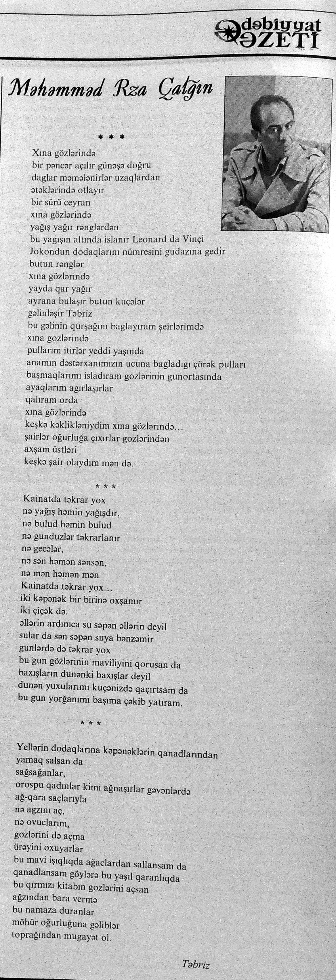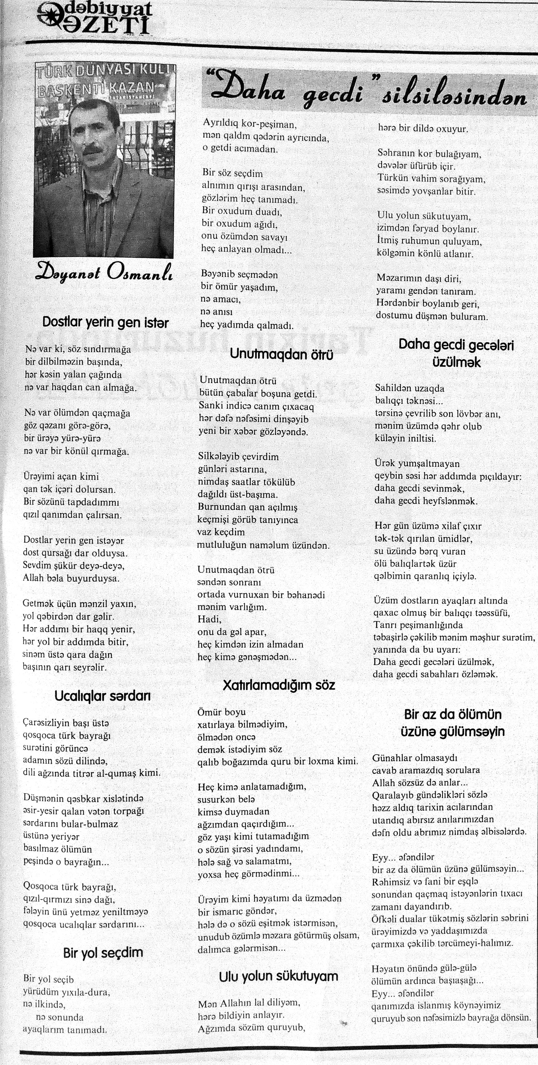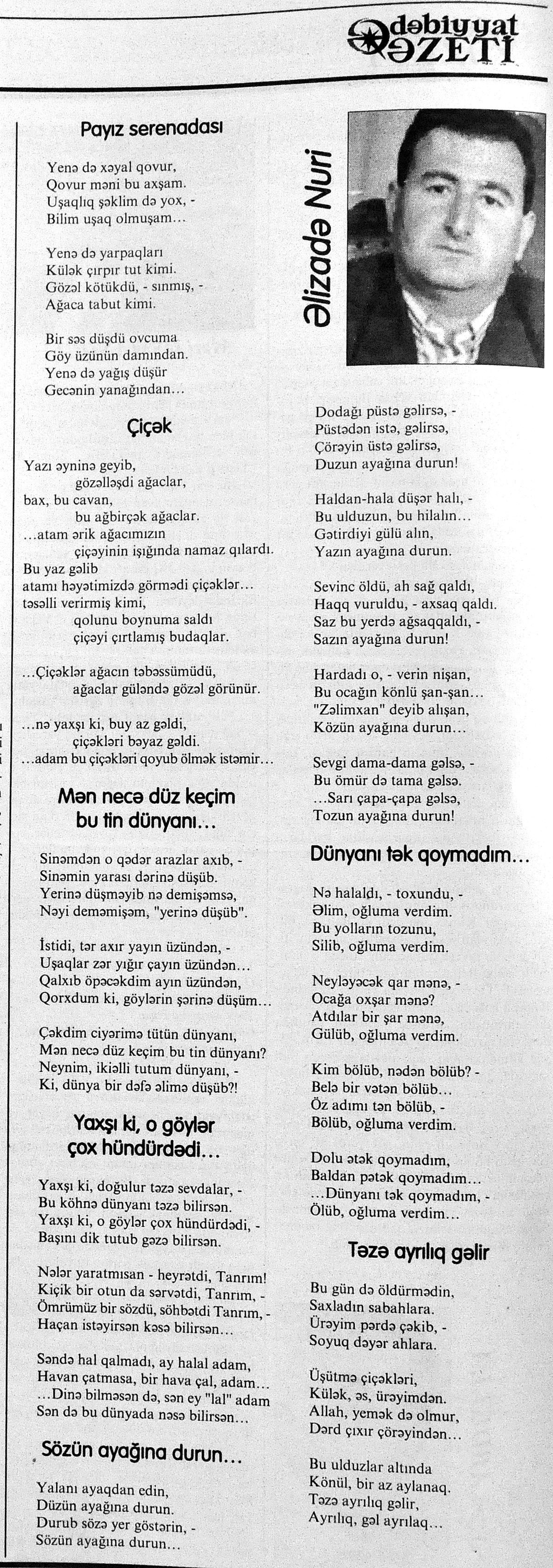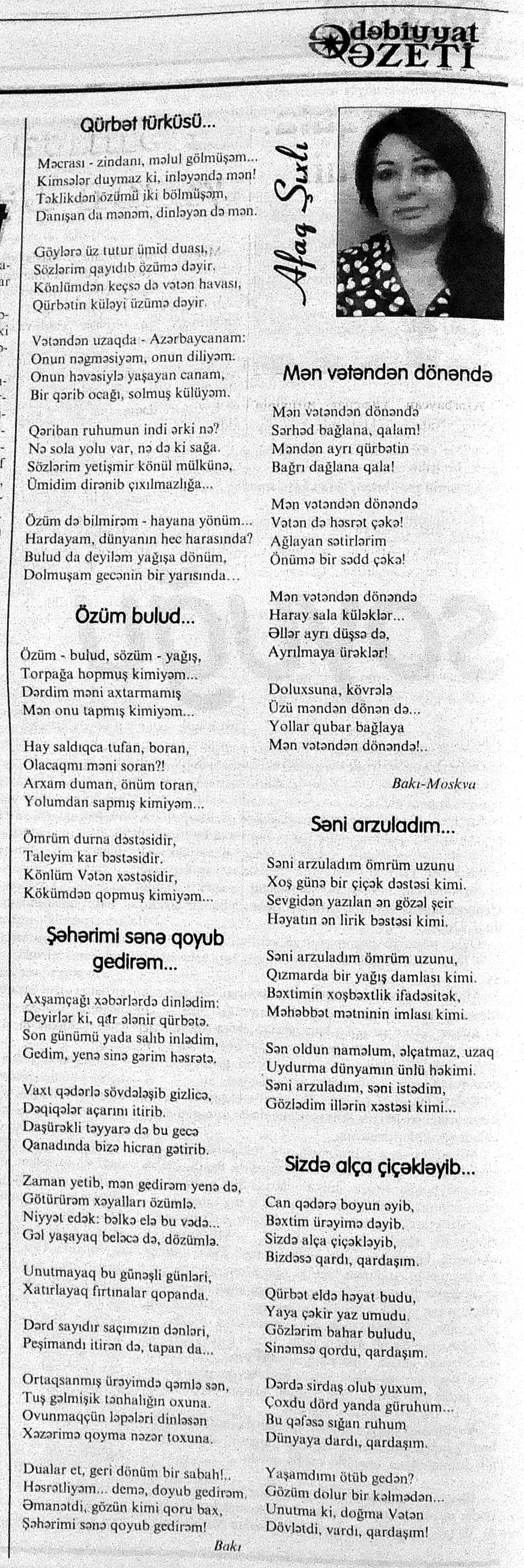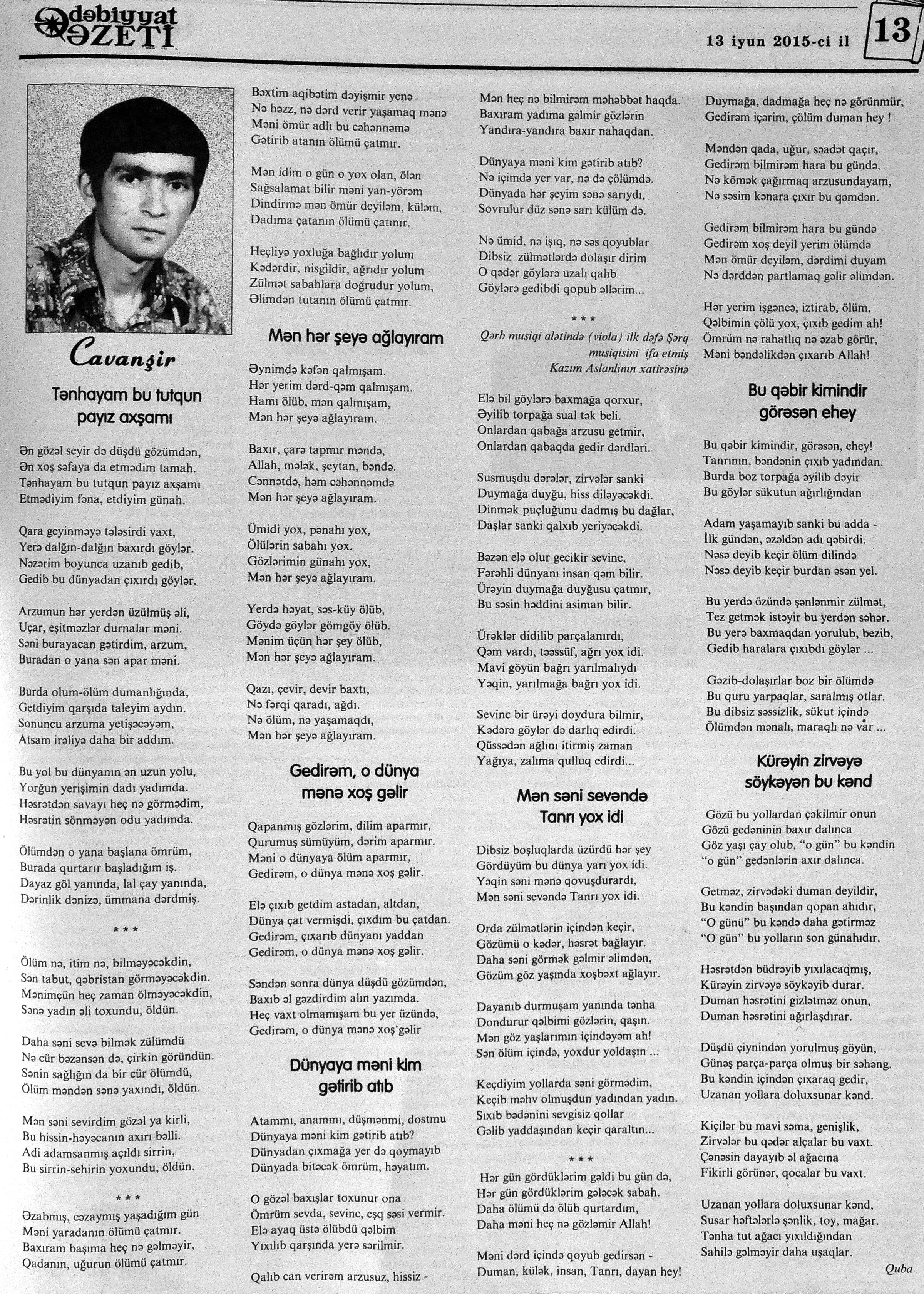426. Abuzərli, N. Fateh-Sultan Dastanı və ya ürəkdən doğulanlar //Kredo.- 2015.- 19 iyun.- S.7. 427. Amin, A. Dünyanın hər yeri yarış yeridi...; Dilim açar imiş...; Biri tapar, biri itirər məni... və s. //Ədəbiyyat qəzeti.- 2015.- 6 iyun.- S.23. 428. Anar. Vaqifin Vaqifsiz ilk doğum günü: [Vaqif Səmədoğluna həsr olunub] //525-ci qəzet.- 2015.- 4 iyun.- S.7. 429. Asena, N. Xoş gəlmisən, Sən ömrümə 60 yaşım //Ədalət.- 2015.- 9 iyun.- S.8. 430. Aslan, M. Son nazlama; Kənardan baxana döyüş asan gələr; Qazi Gülxanə paşa və s. //525-ci qəzet.- 2015.- 6 iyun.- S.29. 431. Aslan, V. “Kəndin payızı” silsiləsindənı; Söz; Bir ürəyin iki üzü //525-ci qəzet.- 2015.- 20 iyun.- S.29. 432. Baxış, E. İndinin böyük şairi: Bu torpaq; Oğlu Andayın itkisinə yazdığı şeir; Məhəmməd Hadiyə və s. //Ədalət.- 2015.- 26 iyun.- S.14. 433. Behrudi, R. Qorxu, və yaxud görən niyə susub Allah; Qorxu; Xarabalıq və s. //Azadlıq.- 2015.- 30 iyun.- S.13. 434. Bəhmənli, V. İyirmi beş şeir: Bəxt; Rübai-Qoşma; Bir xatirə və s. //Azərbaycan : jurnal.- 2015.- №1.- S.7-29. 435. Borçalı, E. Səksənə doğru; Al! – dedi, çal! – dedi...; Bu gecə və s. //Ədəbiyyat qəzeti.- 2015.- 13 iyun.- S.44. 436. Cavanşir. Tənhayam bu tutqun payız axşamı; Ölüm nə, itim nə, bilməyəcəkdin...; Mən hər şeyə ağlayıram və s. //Ədəbiyyat qəzeti.- 2015.- 13 iyun.- S.13. 437. Çalğın, M. Bir polis dostu da olmadı anamın...; Təbriz qızarır uzaqlardan...; Dərd şirin... və s. //525-ci qəzet.- 2015.- 10 iyun.- S.8. 438. Çalğın, M. Xına gözlərində...; Kainatda təkrar yox...; Yellərin dodaqlarına kəpənəklərin qanadlarından... //Ədəbiyyat qəzeti.- 2015.- 13 iyun.- S.8. 439. Çərkəzoğlu. Söz //Ədalət.- 2015.- 11 iyun.- S.6. 440. Eyvazlı, G. Qaçdıq //Azərbaycan müəllimi.- 2015.- 13 iyun.- S.12. 441. Əhmədgil, A. Çanaqqala, bağışla, mən Şuşadan gəlmişəm: Çanaqqala savaşının 100 illiyinə //Ədəbiyyat qəzeti.- 2015.- 6 iyun.- S.32. 442. Ələkbərli, M. Dünya bir nəğmədir...: İstedadlı şair dostum Yusif Nəğməkarın 60 illik yubileyi münasibətilə //525-ci qəzet.- 2015.- 26 iyun.- S. 29. 443. Ələmoğlu, F. Gözün aydın Heydər Baba! //Azad Azərbaycan.- 2015.- 17 iyun.- S.7. 444. Əli, H. Demirəm; Neyləmək?!; Axırda və s. //Kredo.- 2015.- 5 iyun.- S.11. 445. Əlioğlu, Ə. Boşalan kəndə; Bu altmış yaş ki var...; Bircə anda və s. //Ədəbiyyat qəzeti.- 2015.- 13 iyun.- S.29. 446. Əsəd, F. Xatirə toranlığı...; Ömür deyilən çiçəkmiş...; Mən gedirəm sən də gəl... və s. //Azərbaycan: jurnal.- 2015.- №2.- S.97-99. 447. Əzimov, Ə. Ürəyim döyünür qəfəs içində: Şair olmaq qorxusu; “Yaz yağışları” silsiləsindən; Sözün rəngi və s. //Kredo.- 2015.- 19 iyun.- S.15. 448. Əziz, M. Ana, bizə indən belə gərəksən; Anam xəstələnib; Ana və s. //Ədalət.- 2015.- 4 iyun.- S.7. 449. Əzizxanlı, Q. Çanaqqala etüdləri //Kaspi.- 2015.- 6-8 iyun.- S.24. 450. Fikrət Sadıqın şeirləri: Vətəni tanımadım; Bilik üstə; Keşgə və s. //Kredo.- 2015.- 19 iyun.- S.8. 451. Göyçəli, M. Oğlum; Bu səs; Səbrinizə qurban olum və s. //Ədəbiyyat qəzeti.- 2015.- 13 iyun.- S.34. 452. Gülayə. Gəldim; Yarası ağrayır şeir balamın; Torpağın üstündə bir şeir gəzir //Kaspi.- 2015.-20-22 iyun.- S.24. 453. Gültac, N. Yük; ölüm ayrılıq deyil...; Dəsmal və s. //Azərbaycan: jurnal.- 2015.- № 3.- S.130-131. 454. Gün, N. Yol gedirəm; Döydüm qapını; Fırlanğıc //Kaspi.- 2015.- 6-8 iyun.- S.18. 455. Hacıheydərli, N. Yarandın: (Mübariz İbrahimov üçün) //Olaylar.- 2015.- 19 iyun.- S.15. 456. Herisçi, H. Tərsa qızı; Suiti; Edison lampası və s. //Azərbaycan: jurnal.- 2015.- №2.- S.53-62. 457. Həbiboğlu, A. Adını bilmədiyim şeir və ya “L” əfsanəsi; Qonaq //Ədəbiyyat qəzeti.- 2015.- 13 iyun.- S.25. 458. Həsənqulu, K. Qlobusun göz yaşları; Kiçik formatda küçə; Qarğa səsləri və s. //Azərbaycan: jurnal.- 2015.- №2.- S.144-153. 459. Həsənli, G. Daş; Dünya; Axtarır //Kaspi.- 2015.- 6-8 iyun.- S.18. //Kaspi.- 2015.- 6-8 iyun.- S.18. 460. Həsənzadə, F. Dostum; Yandır yağışı; Hərdən səni istəyirəm və s. //Azərbaycan: jurnal.- 2015.- №3.- S.143-146. 461. Həsrət, Ə. Səni yaralı sevdim; Görək kim gözəl ayrılır; Dünyanın düzəlmək təhlükəsi var və s. //Azərbaycan: jurnal.- 2015.- № 2. - S.154-156. 462. Horovlu, Ş. Bilirəm, gəlməzsən...; Gedən adam; Özümlə görüşə bilsəm... və s. //525-ci qəzet.- 2015.- 4 iyun.- S.7. 463. Hüseyn, F. Anlayıram; 25 yaşın şeiri; İstanbul gecəsinə və s. //Kaspi.- 2015.- 6-8 iyun.- S.10. 464. Xanəmir. İbn arabi həzrətlərinə; Mənə soyuq qalacaq //Ədəbiyyat qəzeti.- 2015.- 13 iyun.- S.8. 465. İsrafilqızı, N. Nar giləsi, nar dənəsi, Azərbaycan təntənəsi //Ədalət.- 2015.- 26 iyun.- S.6. 466. Kərimi, G. Qar gəlir; Göyərçin; Zəminxarə və s. //Azərbaycan: jurnal.- 2015.- № 3.- S. 158-161. 467. Qafarlı, Z. Yaşadım: Verdin; Böyründə üşüyürəm və s. //Azərbaycan : jurnal.- 2015.- №1.- S.122-126. 468. Qarabulaq, H. Günahsız ölüm - gözəl...: Dünya və biz; Ölümlərin içində; Dünyanın axırı və s. //Kredo.- 2015.- 26 iyun.- S.11. 469. Qaraçaylı, Q. Çiynimə düşən yarpaq; Məni çəkmə, ay rəssam qız; Sevdim səni və s. //Ədəbiyyat qəzeti.- 2015.- 6 iyun.- S.13. 470. Qaraişıq, R. Sevgili dostum; Bilmədim; Ad günüm və s. //Kaspi.- 2015.- 13-16 iyun.- S.20. 471. Qəhrəman, İ. Səni sevmək; Kim halından halı bilər...; Qürur və s. //Azərbaycan: jurnal.- 2015.- № 2.- S. 92-96. 472. Qoca Zadə, B. Səni sevmək günahımdır: Qarabağım yenə ürək dağlayır; Düşman tökür bombaları...; Qayıt mənə və s. //Ədalət.- 2015.- 5 iyun.- S.7. 473. Qurbanov, S. Yeridi; Başladı; Ağ