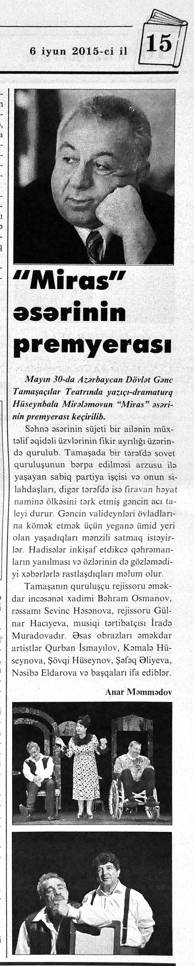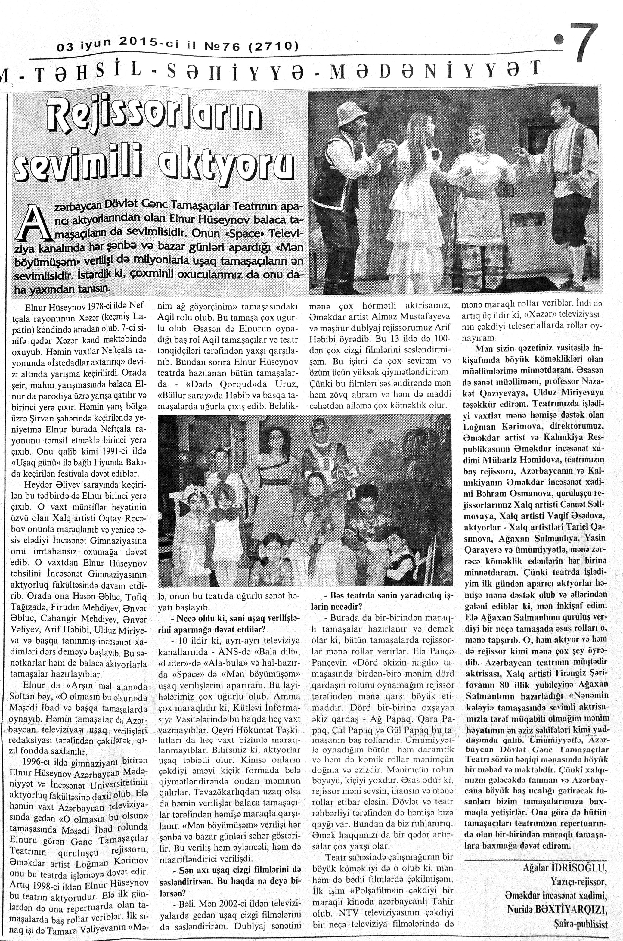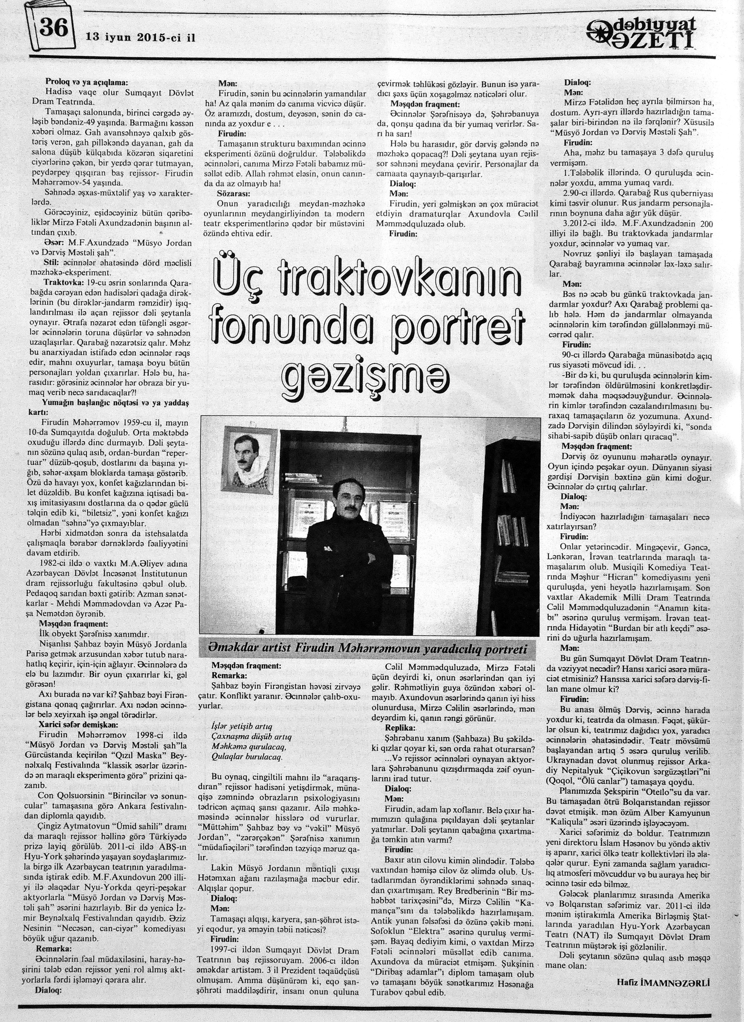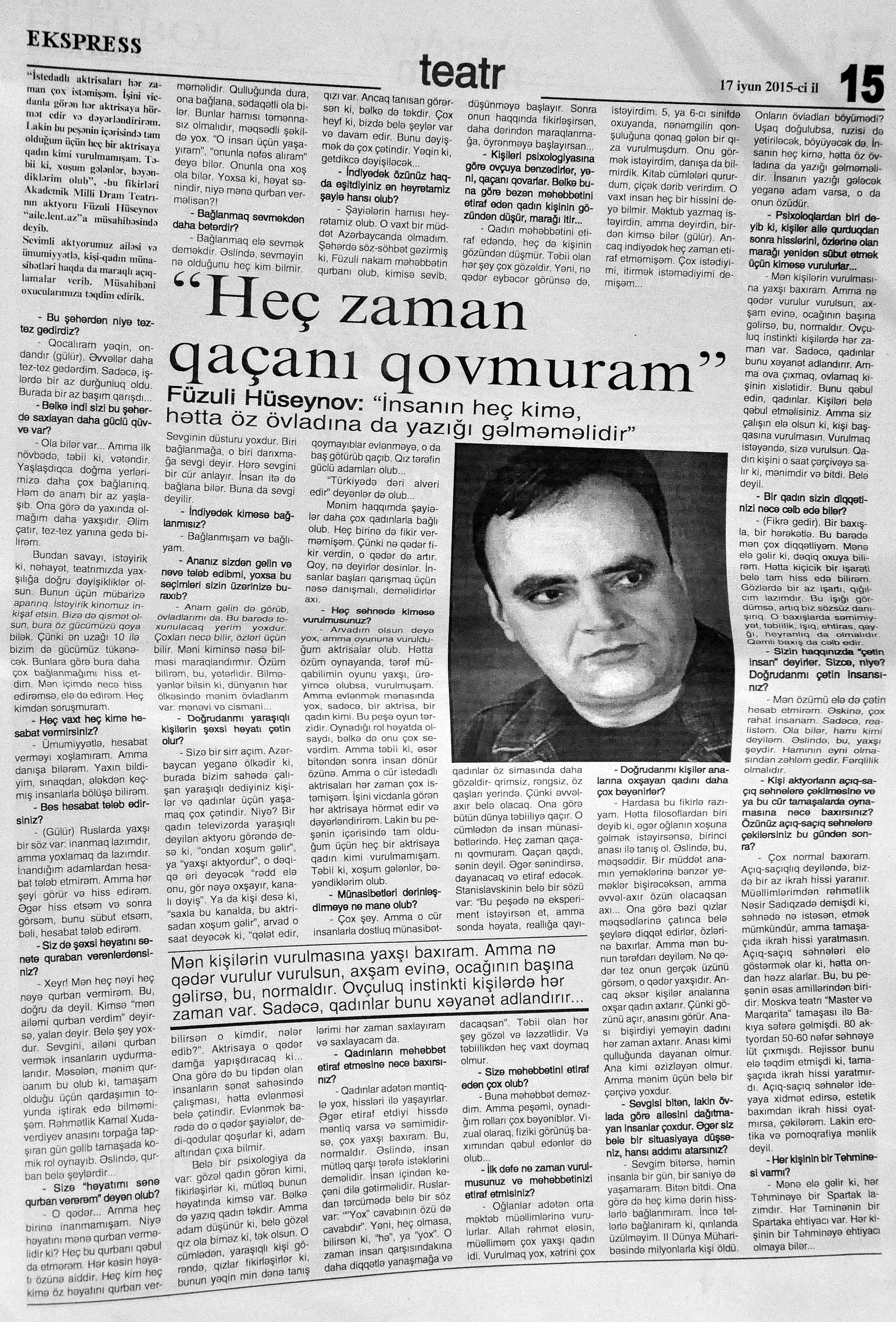 399. Hüseynov, F. “Heç zaman qaçanı qovmuram”: Füzuli Hüseynov: “İnsanın heç kimə, hətta öz övladına da yazığı gəlməməlidir”: [Əməkdar artistin müsahibəsi] //Ekspress.- 2015.- 17 iyun S.15. 400. Kazımov, A. Onun böyük uğuru: [teatrda İtalyan Eduardo de Filipponun “Silindr” komediyası Xalq artisti Ramiz Novruzun quruluşunda] //Respublika.- 2015.- 24 iyun.- S.7. 401. Musaqızı, L. Akademik Milii Dram Teatrının kollektivinə beynəlxalq festivalın diplomu və TÜRKSOY-un medalı təqdim olunub //Kaspi.- 2015.- 12 iyun.- S.10. 402. Musaqızı, L. Uşaqlığı cibində olan adam: Ramiz Novruz: “Üçüncü kursda atam xəbər tutdu ki, İncəsənət İnstitutunda təhsil alıram”: [Xalq artisti haqqında] //Kaspi. - 2015.- 12 iyun.- S.21. 403. “Nağıllar aləmində”: [Xalq artisti Bəsti Cəfərovanın quruluşunda] //Mədəniyyət.- 2015.- 17 iyun.- S.5. 404. Nizamiqızı, H. “İlahi oyun”un Kazan zəfəri: [Akademik Milli Dram Teatrının Tatarıstanın Kazan şəhərində keçirilmiş XII Novruz Beynəlxalq Teatr Festivalında Mikayıl Mikayılovun hazırladığı tamaşa ilə iştirakı haqqında] //Mədəniyyət.- 2015.- 12 iyun.- S.5. 405. Tahirə. “Mən Azdramanı saçımla süpürmüşəm”: Amaliya Pənahova: “Bu gün şəxsən mənə heç nə lazım deyil. Bir teatr binası istəyirəm, onu da bu kollektiv üçün” //Şərq.- 2015.-18 iyun.- S.14.