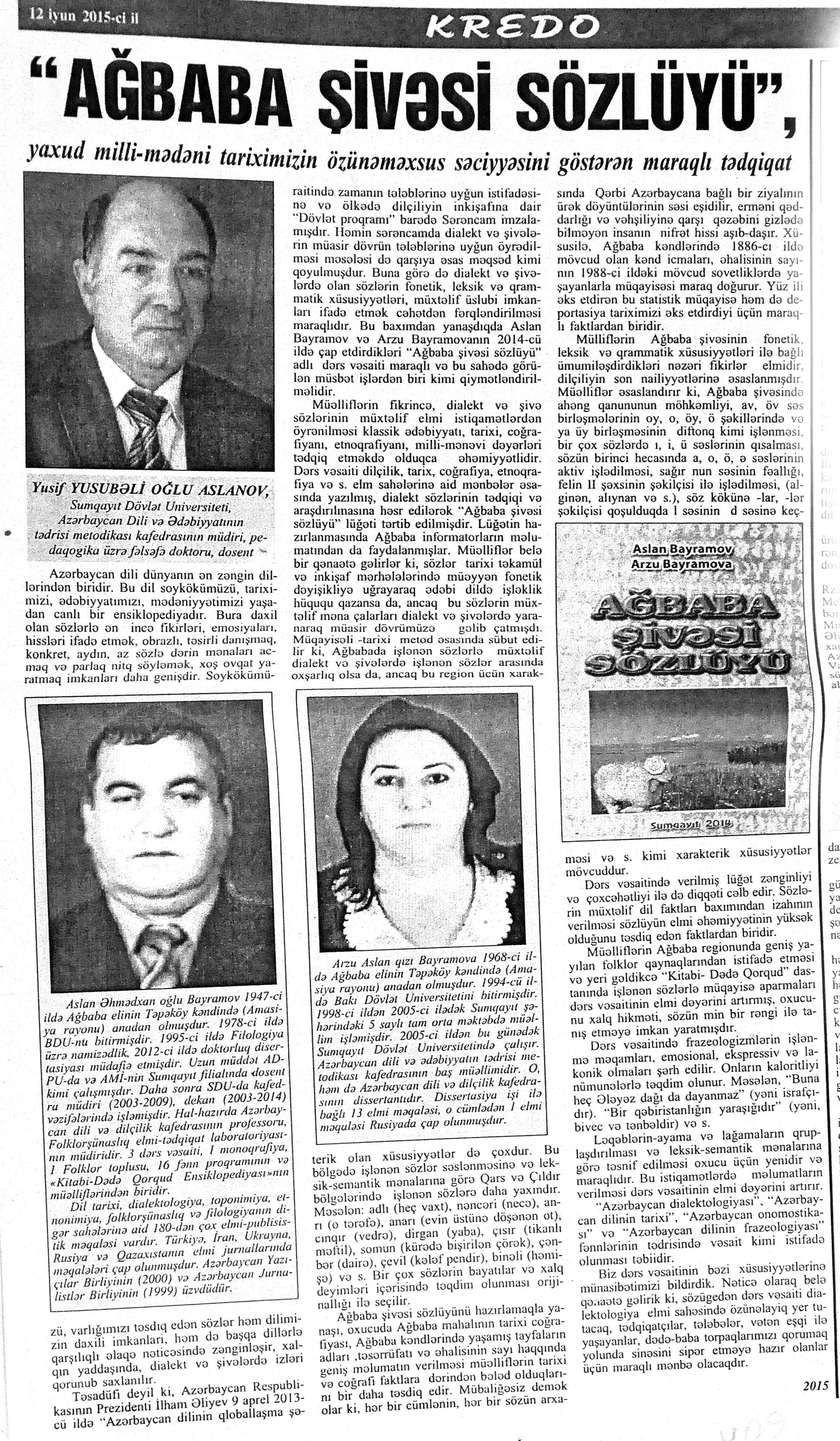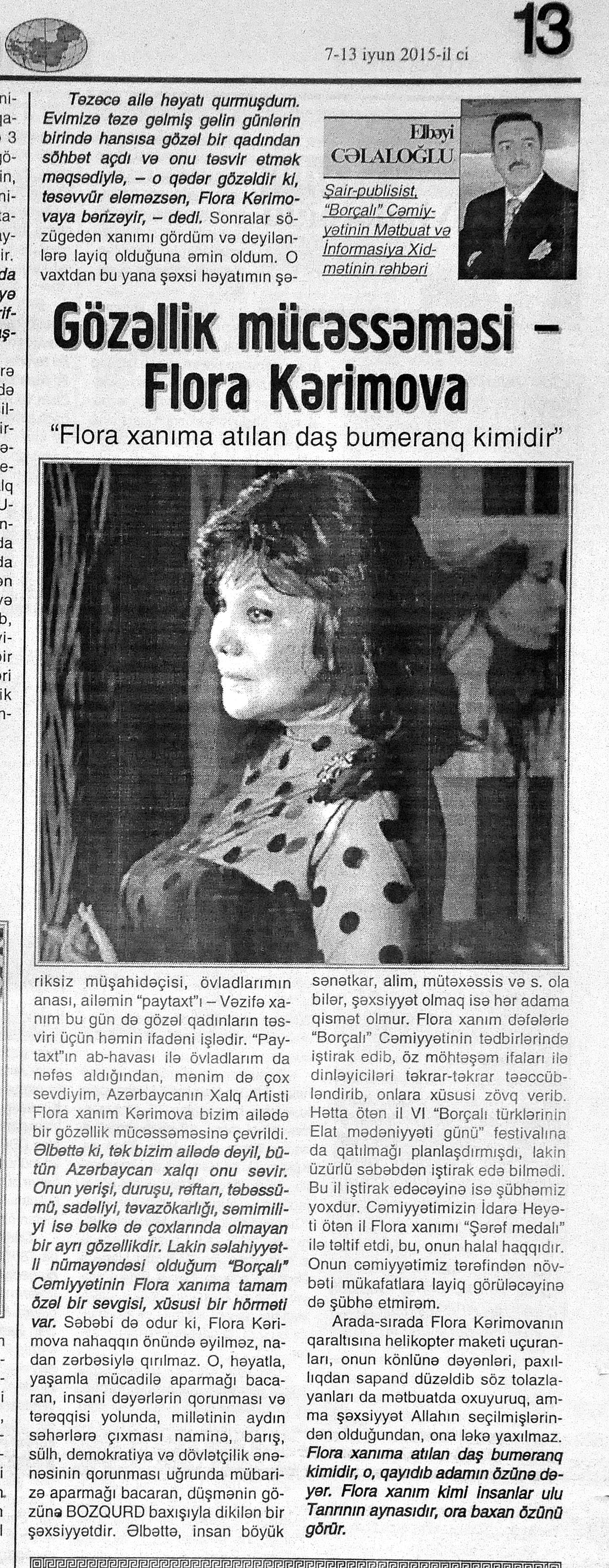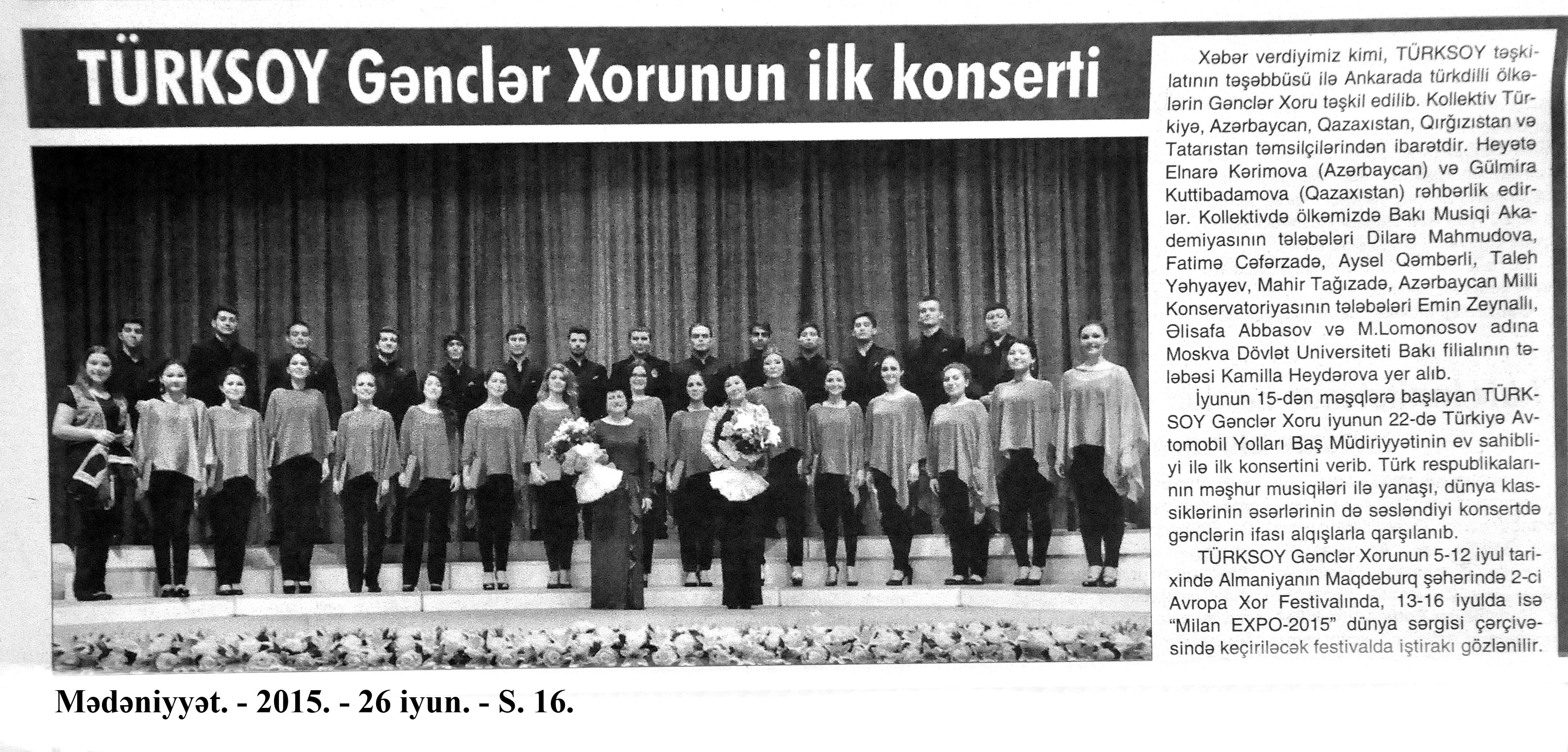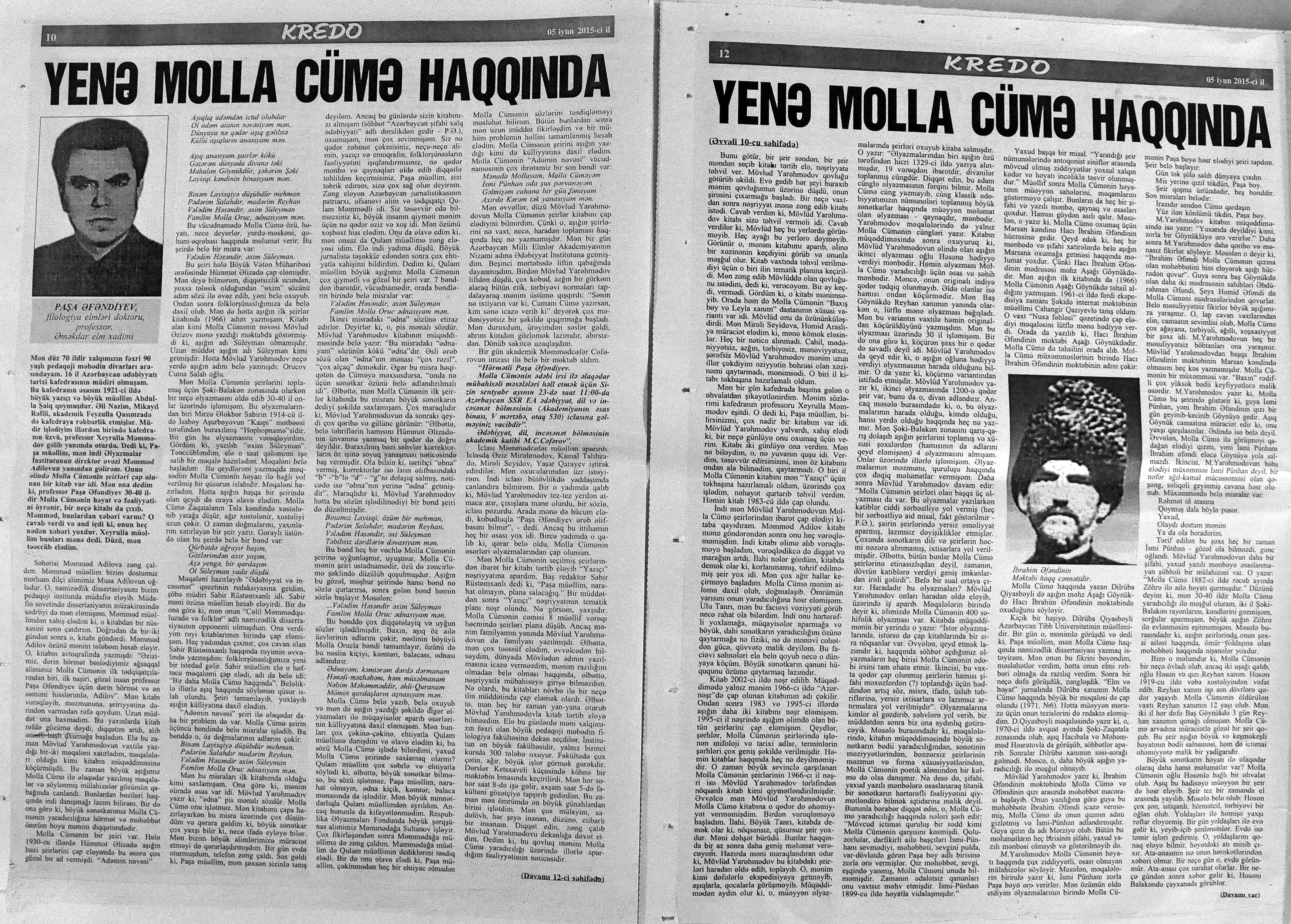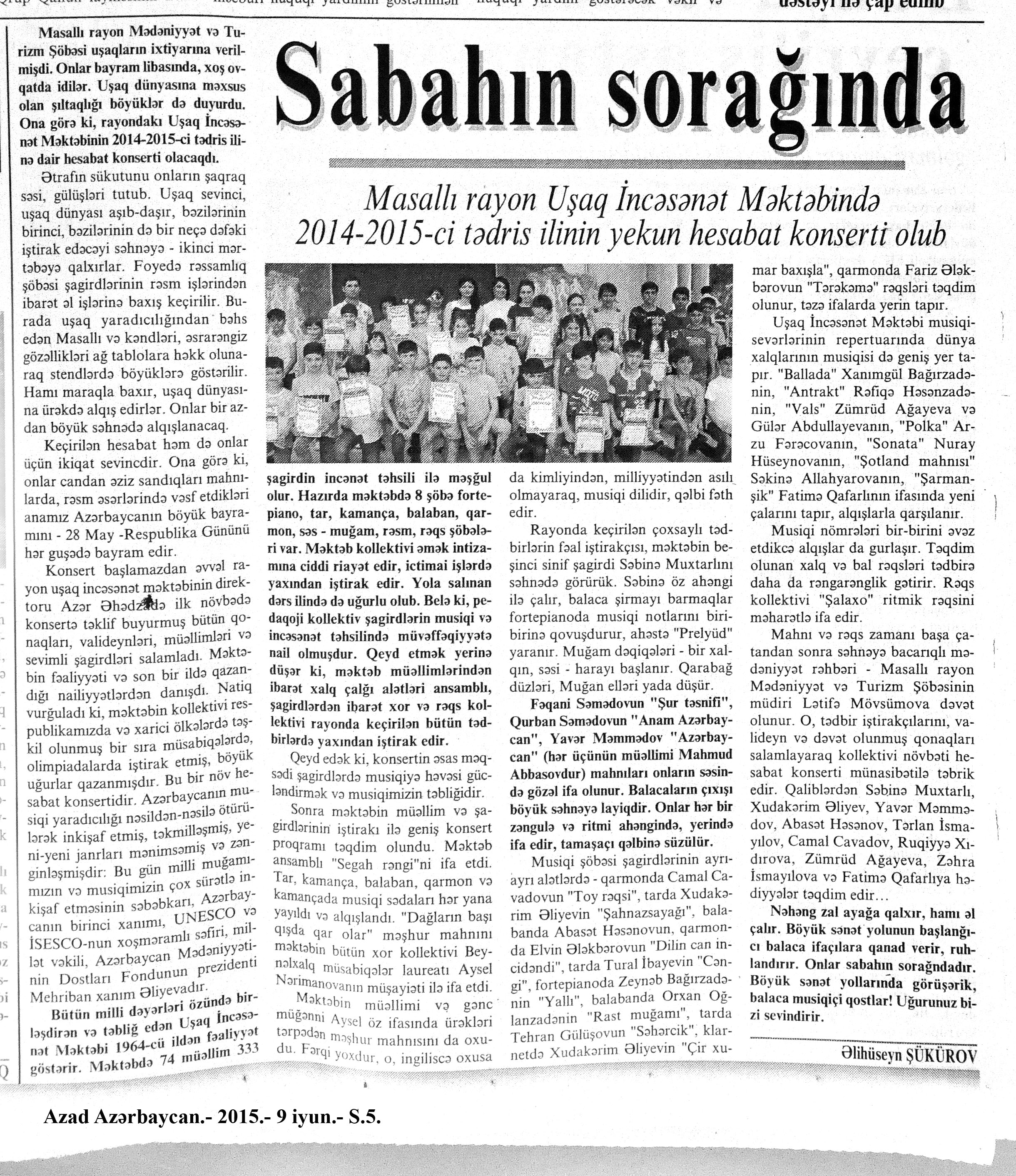 320. Əfəndiyev, P. Yenə Molla Cümə haqqında: [aşığın yaradıcılığı haqqında] //Kredo.- 2015.- 5 iyun.- S.10-12; 12 iyun.- S.10; 19 iyun.- S.10. 321. “Gəncliyin səsi” aşıq konserti: [Rəşid Behbudov adına Azərbaycan Dövlət Mahnı Teatrında] //Mədəniyyət.- 2015.- 3 iyun.- S.11. 322. Məhərrəmova, T. Uşaq dünyasından boylanan rəsmlər: Kaspi Liseyi şagirdlərinin əl işləri və rəsm əsərlərindən ibarət sərgi uşaqların yaradıcı potensialının aşkarlanmasına hesablanıb //Kaspi.- 2015.- 2 iyun.- S.7. 323. Şükürov, Ə. Sabahın sorağında: Masallı rayon Uşaq İncəsənət Məktəbində 2014-2015-ci tədris ilinin yekun konserti olub //Azad Azərbaycan.- 2015.- 9 iyun.- S.5. 324. Vaqıfqızı, L. Qarabağ bayatıları: Qarabağ bölgəsinin söyləyiciləri bayatıları da avazla söyləyirlər //Xalq cəbhəsi.- 2015.- 24 iyun.- S.14.