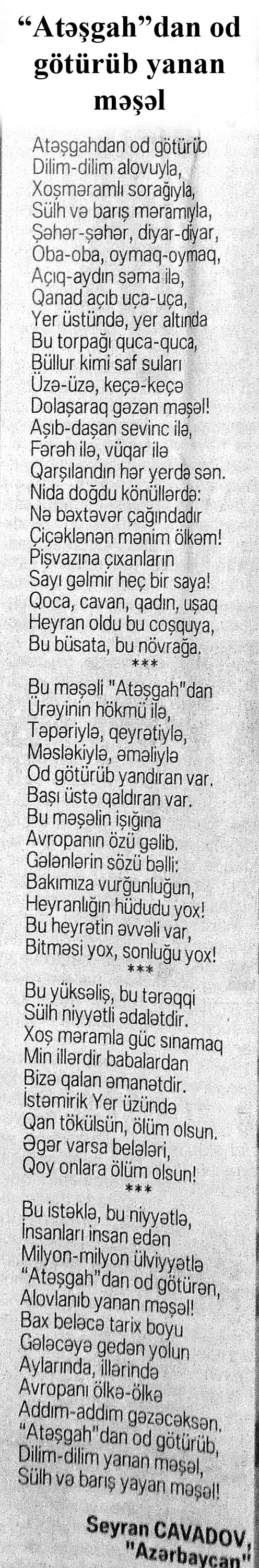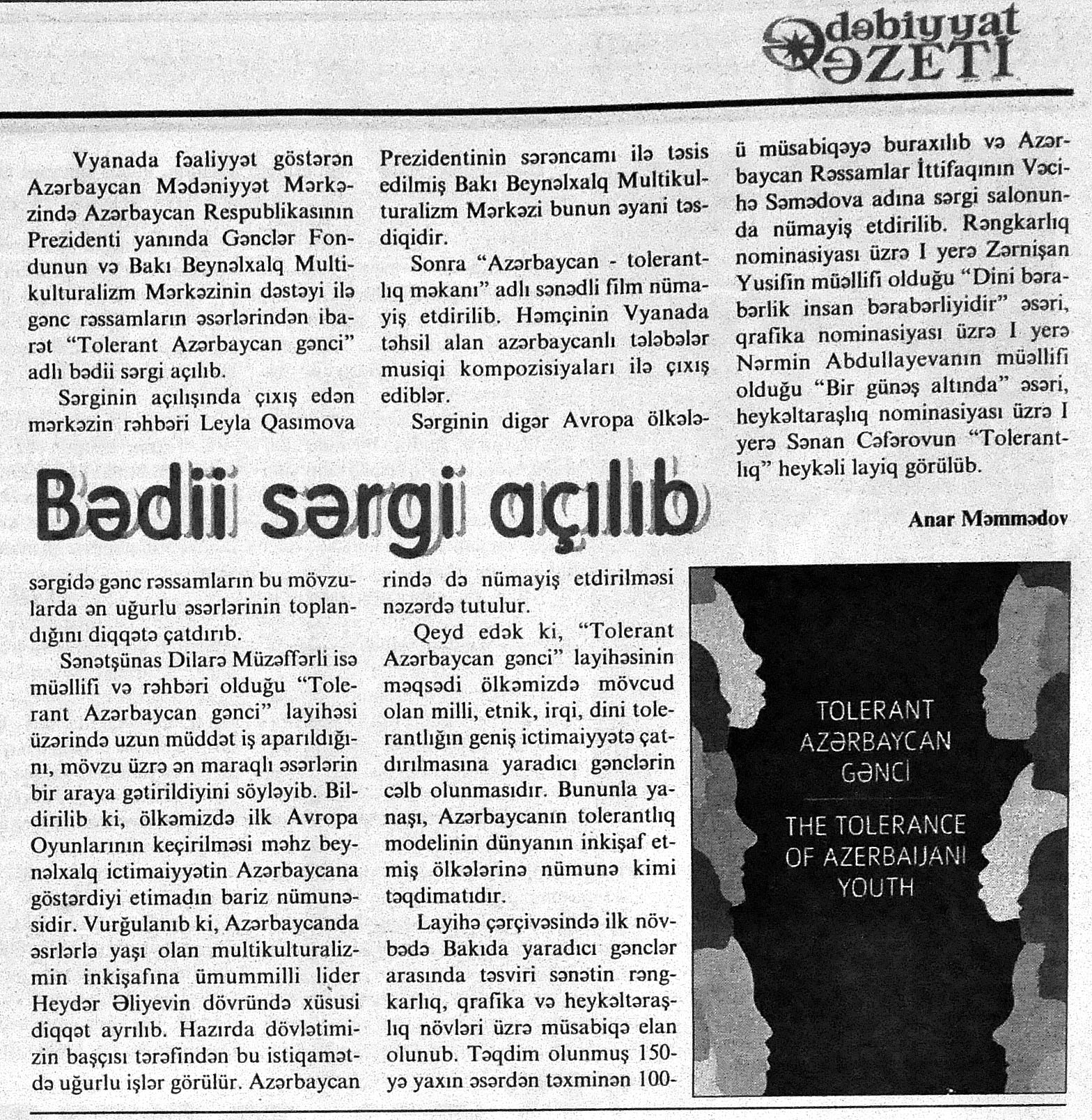 8. Абдуллаев, К. Принципы мультикультуральной безопасности в Азербайджане //Бакинский рабочий.- 2015.- 30 июня.- С.14. 9. Асадова, И. «Бакинская симфония»: Представлена книга-альбом в рамках проекта «Наследие»: [посвященная культурному наследию столицы] //Эхо.- 2015.-5 июня.- С.8. 10. Асадова, И. Вышел новый номер Mədəniyyət.AZ: В издании представлены материалы о значимых событиях в культурной жизни Азербайджана //Эхо.- 2015.-20 июня.- С.10. 11. Баку — столица межкультурного диалога: [о III-ем Всемирном форуме по межкультурному диалогу] //Бакинский рабочий.- 2015.- 9 июня. - С.5.
