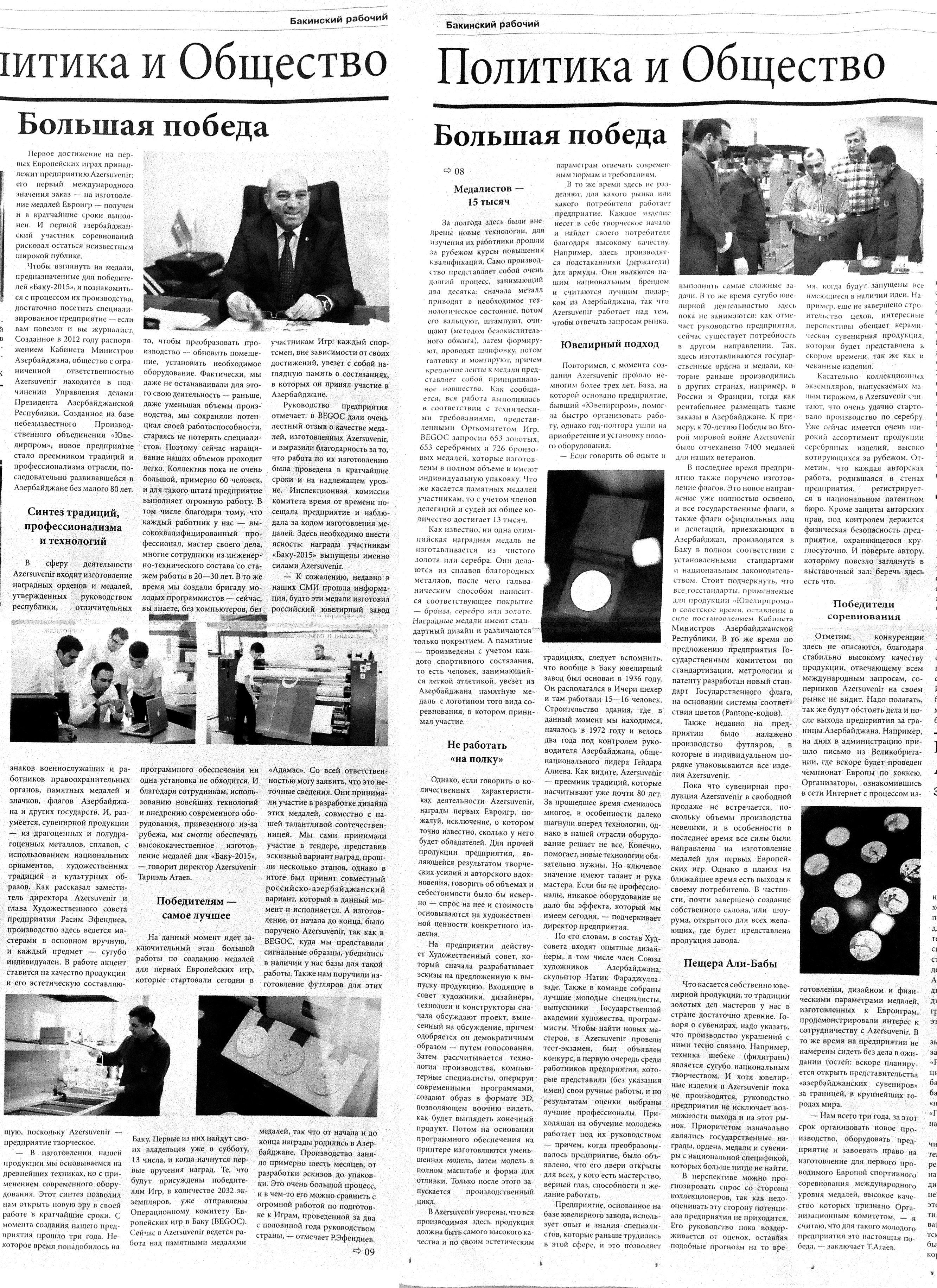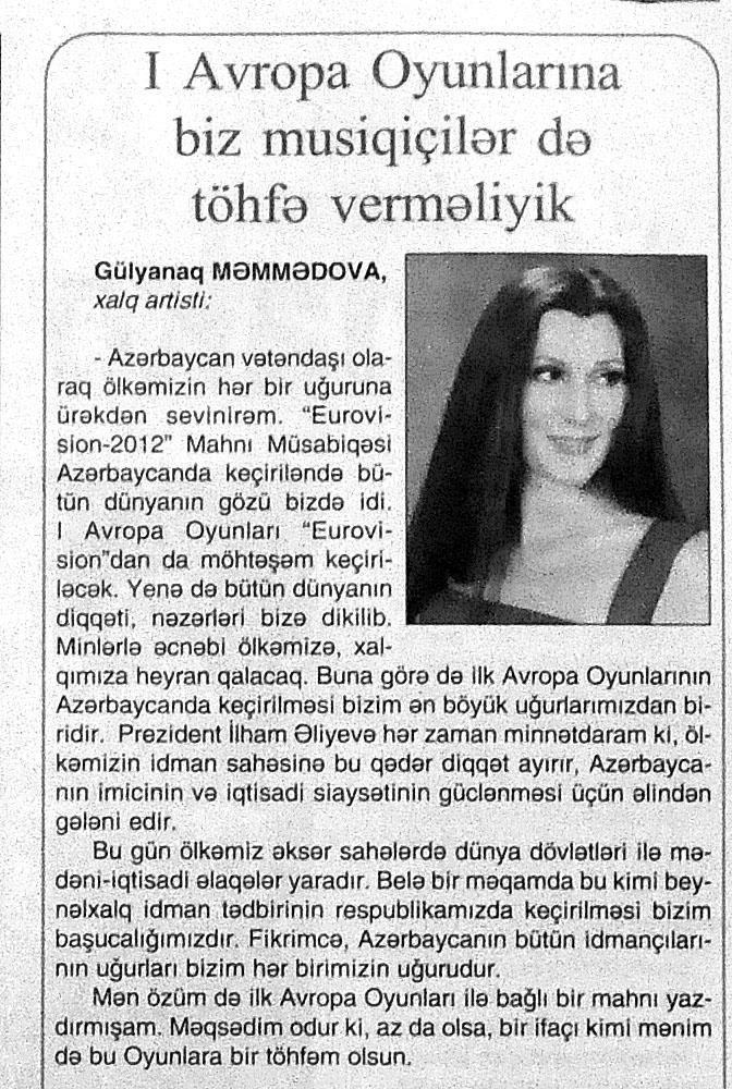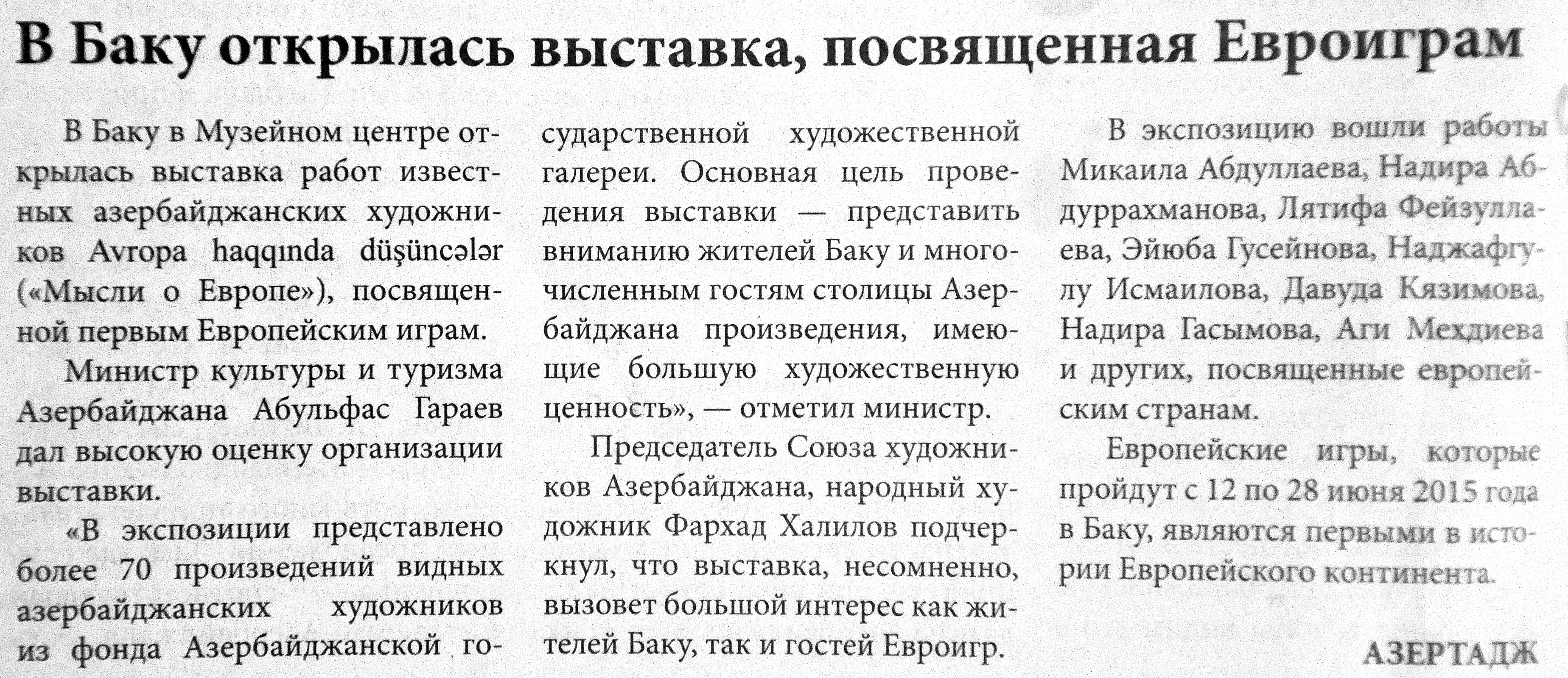 12. Агаева, Т. Высокие критерии: Тунзаля Агаева: Успех Евроигр зависит от каждого из нас //Каспiй.- 2015.- 13 июня.- С.6. 13. Азербайджан на церемонии открытия первых Европейских игр сумел представить всему миру свою историю, культуру, музыку и современность //Бакинский рабочий.- 2015.- 14 июня.- С.9. 14. Азербайджанский модельер-дизайнер преподнесла победителю первых Европейских игр панно ручной работы: [доктор философии по искусствоведению Гюльнара Халилова] //Бакинский рабочий.- 2015.- 17 июня.- С.5. 15. Алиева, М. Грандиозная церемония закрытия первых Европейских игр «Баку-2015»: В церемонии принял участие Президент Азербайджана Ильхам Алиев: [Выступление первой леди Мехрибан Алиевой] //Бакинский рабочий.- 2015.- 30 июня.- С.2. 16. Асадова, И. «Baku-2015» - Культурный отдых в режиме нон - стоп: Музеи, театры и City Sightseeing Baku во время Евроигр будут работать до позднего вечера //Эхо.- 2015.- 12 июня.- С. 8. 17. Асадова, И. Внимание, «Тодес»!: В Баку выступит знаменитый балет Аллы Духовой //Эхо.-2015.- 5 июня.- С.8 18. Асадова, И. Концерт народной музыки: Состоялся в Междунарном центре мугама //Эхо.- 2015.- 20 июня.- С.10. 19. Асадова, И. Музыка из Аргентины в честь Евроигр: В Международном центре мугама прошел концерт оркестра Sexteto Mayor //Эхо.- 2015.- 19 июня.- С.8. 20. Асадова, И. Панно ручной работы с талисманами соревнований: Преподнесла известный азербайджанский модельер Рафаэлю Агаеву: [Гюльнара Халилова] //Эхо.- 2015.- 17 июня.- С.8. 21. Асадова, И. «Счастливые мгновения»: В Баку стартовал фотоконкурс, посвященный первым Европейским Играм //Эхо.- 2015.- 19 июня.- С.8. 22. Асадова, И. Тунзаля Агаева выступила в Центре Гейдара Алиева: С грандиозной сольной программой, посвященной Европейским играм в Баку //Эхо.- 2015.- 3 июня.- С. 8. 23. Ахундов, А. Отдых дома по доступным ценам: Столичные отели и туристические объекты с честью справились с приемом прибывших на Евроигры гостей //Азербайджанские известия.- 2015.- 23 июня.- С.2. 24. Баннаева, Н. Живописные «Мысли о Европе»: В пред-дверии Евроигр в Баку открылась выставка зарубежных пейзажей азербайджанских художников: [в Музейном Центре] //Азербайджанские известия.- 2015.- 12 июня.- С.4. 25. Большая победа: [о деятельности «Азерсувенир» ООО, специализирующейся на изготовлении медалей и орденов] //Бакинский рабочий.- 2015.- 12 июня.- С.8-9. 26. В Бакинском городке «Малая Венеция» открылся Европейский клуб гостеприимства: В церемонии открытия приняла участие первая леди Азербайджана Мехрибан Алиева //Бакинский рабочий.- 2015.- 11 июня.- С.2. 27. В Баку открылась выставка, посвященная Евроиграм: [в Музейном Центре] //Бакинский рабочий.- 2015.- 12 июня.- С.4. 28. В Баку прошел фестиваль детской моды, посвященный Евроиграм: [организованный Общественным объединением «Волонтеры Азербайджана»] //Бакинский рабочий.- 2015.- 14 июня. - С.10. 29. В Баку состоялась встреча с представителями туриндустрии Хорватии //Бакинский рабочий.- 2015.- 25 июня.- С.9. 30. В галерее ТАСС представлены фотографии АЗЕРТАДЖ на тему «Баку накануне Европейских игр» //Бакинский рабочий.- 2015.- 12 июня.- С.6. 31. В Москве открылась фотовыставка, посвященная Европейским играм в Баку //Бакинский рабочий.- 2015.- 9 июня.- С. 10. 32. В Париже открылась выставка «Азербайджан: В фокусе – спорт» //Бакинский рабочий.- 2015.- 9 июня.- С. 8. 33. В последний день путешествия по регионам факел «Баку-2015», озарив прошлое человечества, возвращается в столицу //Бакинский рабочий.- 2015.- 9 июня.- С.6. 34. В Страну огней: До старта Европейски