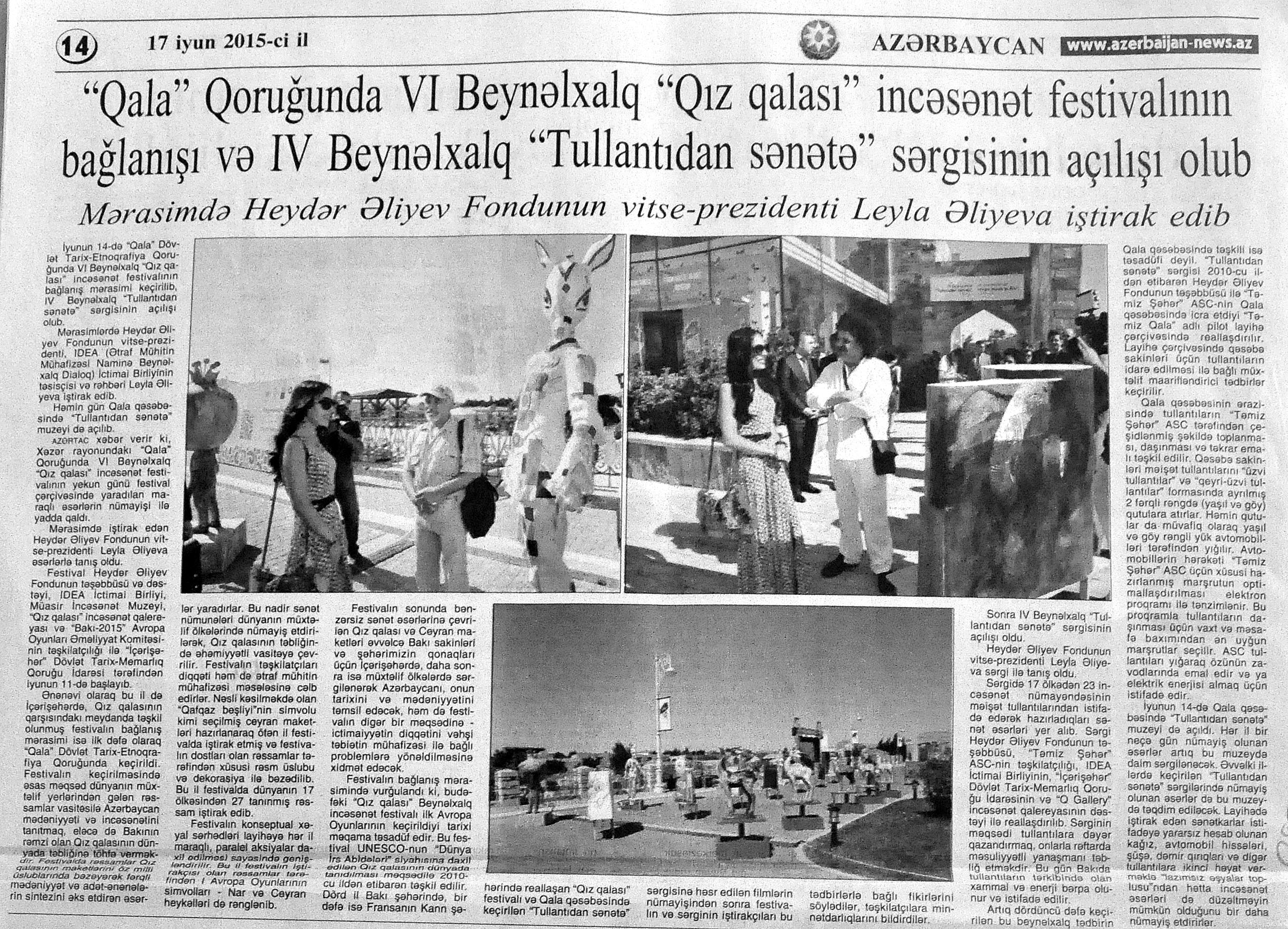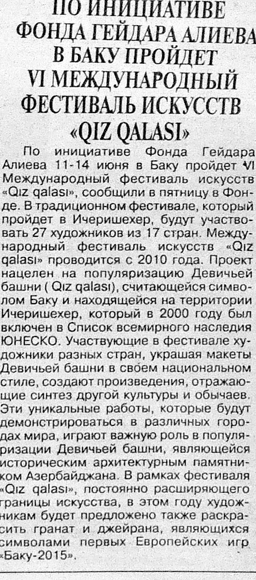 86. Алиева, Г. Протест против правил: Искусство — самый лучший способ привлечь внимание людей к природоохранной тематике //Азербайджанские известия.-2015.- 25 июня.- С.3. 87. Асадова, И. A Drop of Sky: В Баку стартует III паблик-арт-фестиваль: Участниками проекта станут художники из разных стран //Каспiй.- 2015.- 12 июня.-С.- 8. 88. Асадова, И. Очередной городской шедевр – напротив станции метро «28 Мая»: Будет представлен в рамках III Паблик арт-фестиваля «Капля с неба» //Эхо.- 2015.- 23 июня.-С.8. 89. Баннаева, Н. Магия ароматного напитка: В Музейном центре стартовал арт-проект «Цвет кофе» //Азербайджанские известия.- 2015.- 20 июня.- С.3. 90. В Баку открыт музей «От отходов — к искусству» //Бакинский рабочий.- 2015.- 19 июня.- С.7 91. В Баку проходит III Бакинский Паблик-арт фестиваль искусств «Капля с неба» //Бакинский рабочий.- 2015.- 23 июня.- С.9. 92. В заповеднике «Гала» состоялась церемония закрытия VI Международного фестиваля искусств «Девичья Башня» и открытие IV Международной выставки «Из отходов — в искусство» //Бакинский рабочий.- 2015.- 17 июня.- С.9. 93. Гасанзаде, Д. Азербайджанская миниатюра конца XVI и начала XVII веков //IRS Наследие.- 2015.- №3 (75) - С.32-37. 94. Ознакомление с первым постоянным пространством Центра современного искусства YARAT //Бакинский рабочий.- 2015.- 9 июня.- С.4. 95. Открылась экспозиция «Живопись Азербайджана ХХ-ХХI века», являющаяся новым проектом Фонда Гейдара Алиева //Бакинский рабочий.- 2015.- 9 июня.- С.3. 96. По инициативе Фонда Гейдара Алиева в Баку пройдет VI Международный фестиваль искусств «Гыз галасы»// Бакинский рабочий.- 2015.- 6 июня.- С.7. 97. По инициативе Фонда Гейдара Алиева в Баку пройдет VI Международный фестиваль искусств «Гыз галасы» //Вышка.- 2015. - 12 июня.- С.11. 98. Руслан, М. «Из отходов – в искусство»: В Баку проходит IV Международная выставка //Эхо.- 2015.- 18 июня.- С.8. 99. Успех «Ночи в Музее» превзошел все ожидания //Бакинский рабочий.- 2015.- 10 июня.- С.10.