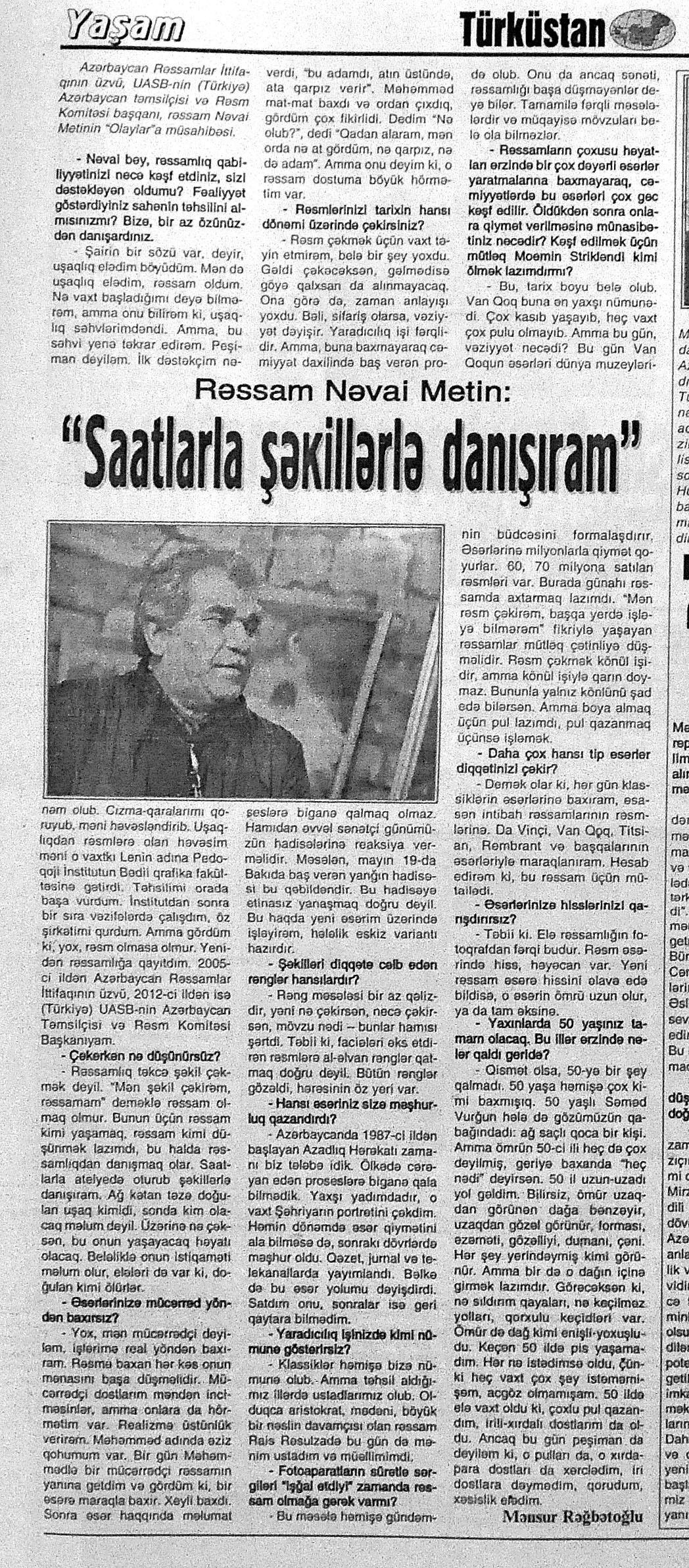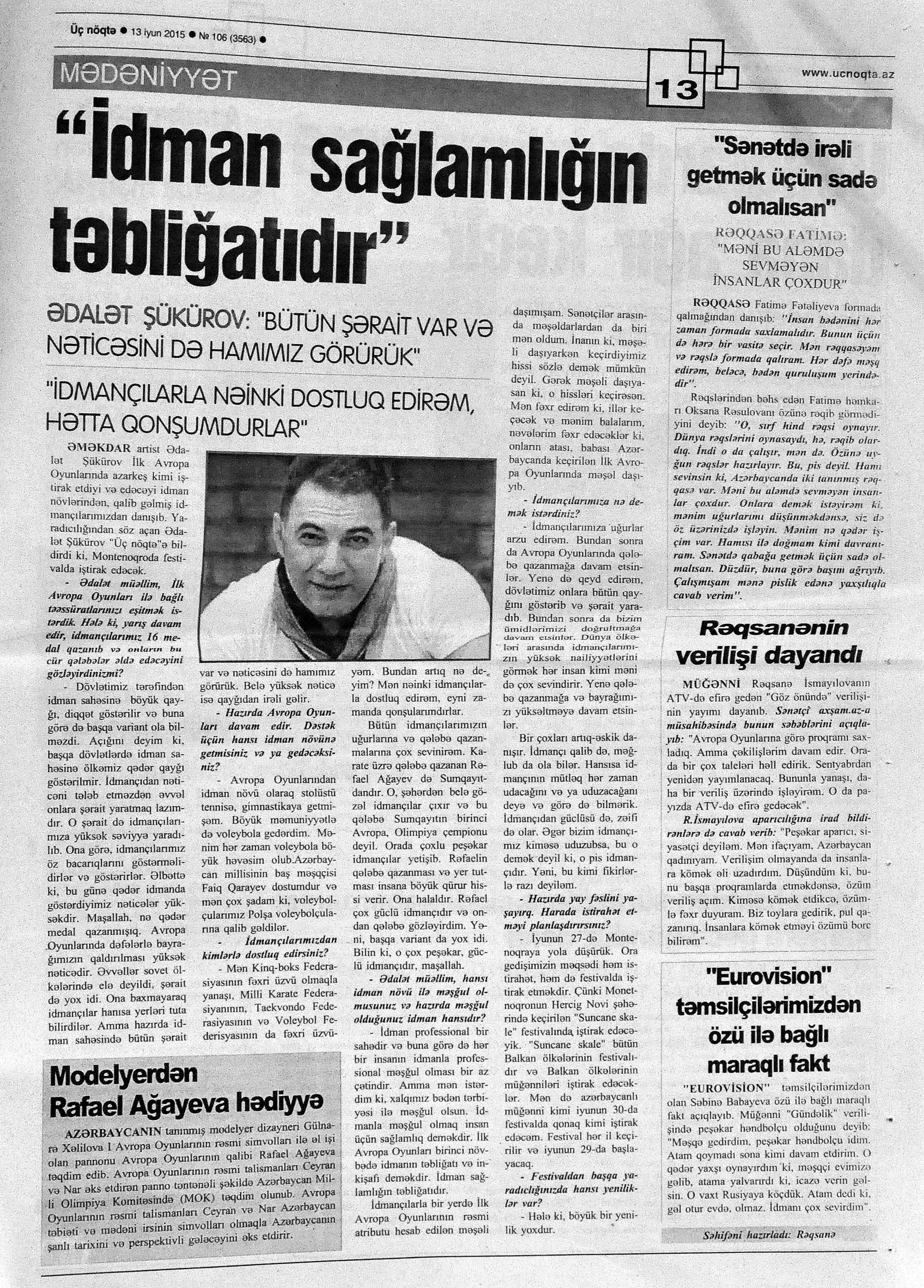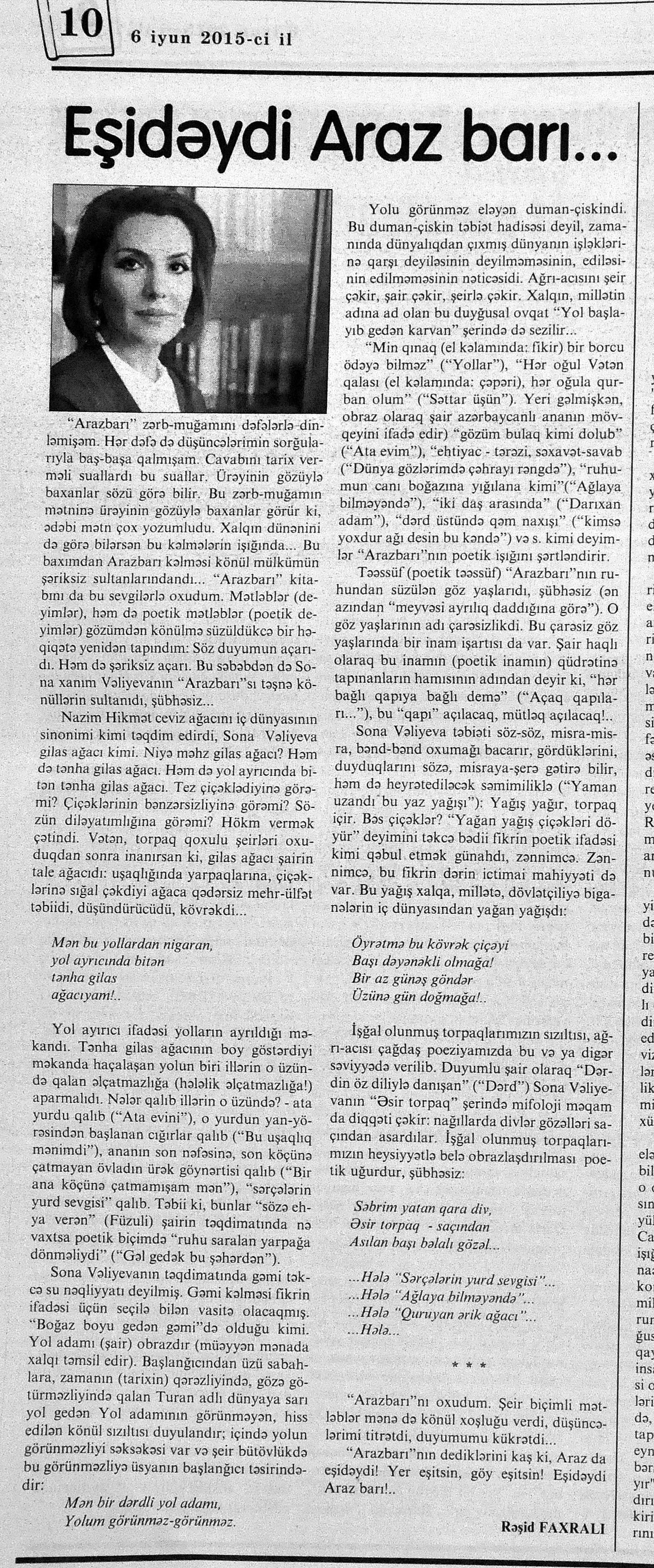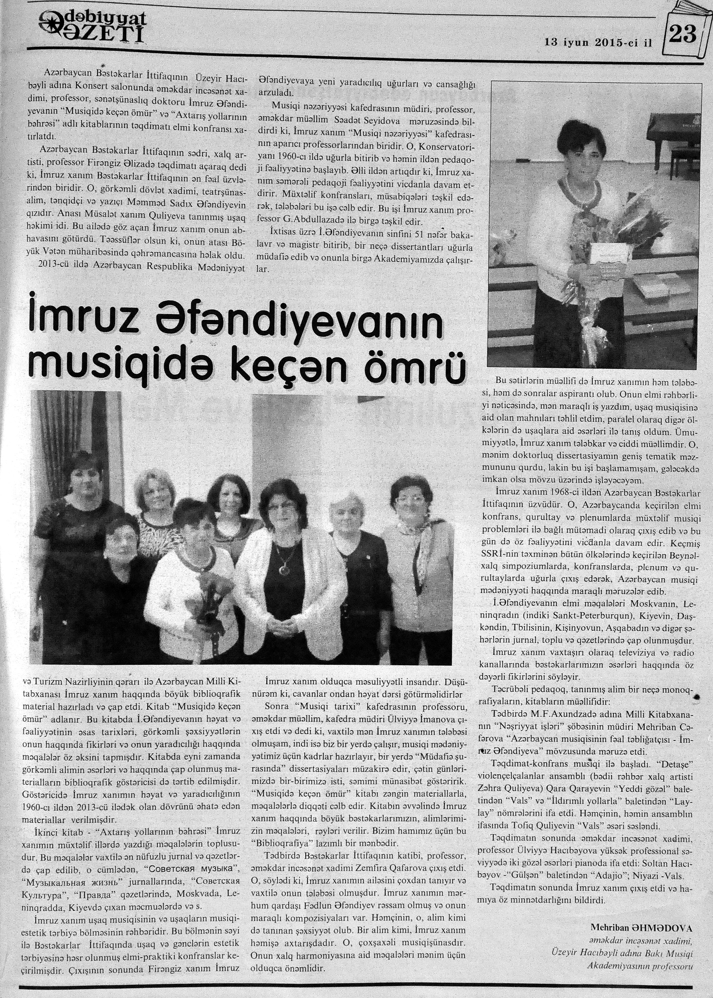 217. Cavadov, Z. Gülablı kənd musiqi məktəbi: [Ağdam rayonundakı məktəbin direktoru A.Hüseynova ilə söhbət] //Respublika.- 2015.- 18 iyun.- S.12. 218. Eldarqızı, Z. Bədii qiraət ustaları arasında parlayan səs sahibi - Zülfiyyə Eldarqızı...: [sənətşünaslıq üzrə fəlsəfə doktoru ilə müsahibə] /müsahibəni apardı İradə Sarıyeva //Bakı xəbər.- 2015.- 20-22 iyun.- S.12. 219. YARAT Müasir İncəsənət Mərkəzinin ilk daimi məkanı ilə tanışlıq //Azərbaycan.- 2015.- 9 iyun.- S.4. 220. Yubilyar məktəblər təltif olunub: [Hacıqabul Şəhər Uşaq musiqi məktəbinin yaradılmasının 25, Ağcabədi şəhər Ü.Hacıbəyli adına Uşaq İncəsənət məktəbinin 50 illik yubileyi haqqında] //Mədəniyyət.- 2015.- 3 iyun.- S.7. 221. Zeynalova, E. “İndiki bəstəkarlar klassik musiqi janrına, vokal musiqisinə müraciət etmirlər”: [Respublika İncəsənət Gimnaziyasının Musiqi şöbəsinin vokal müəllimi Emma Zeynalova ilə müsahibə] /müsahibəni apardı Xəyalə Günəş //Palitra.- 2015.- 11 iyun.- S.13.