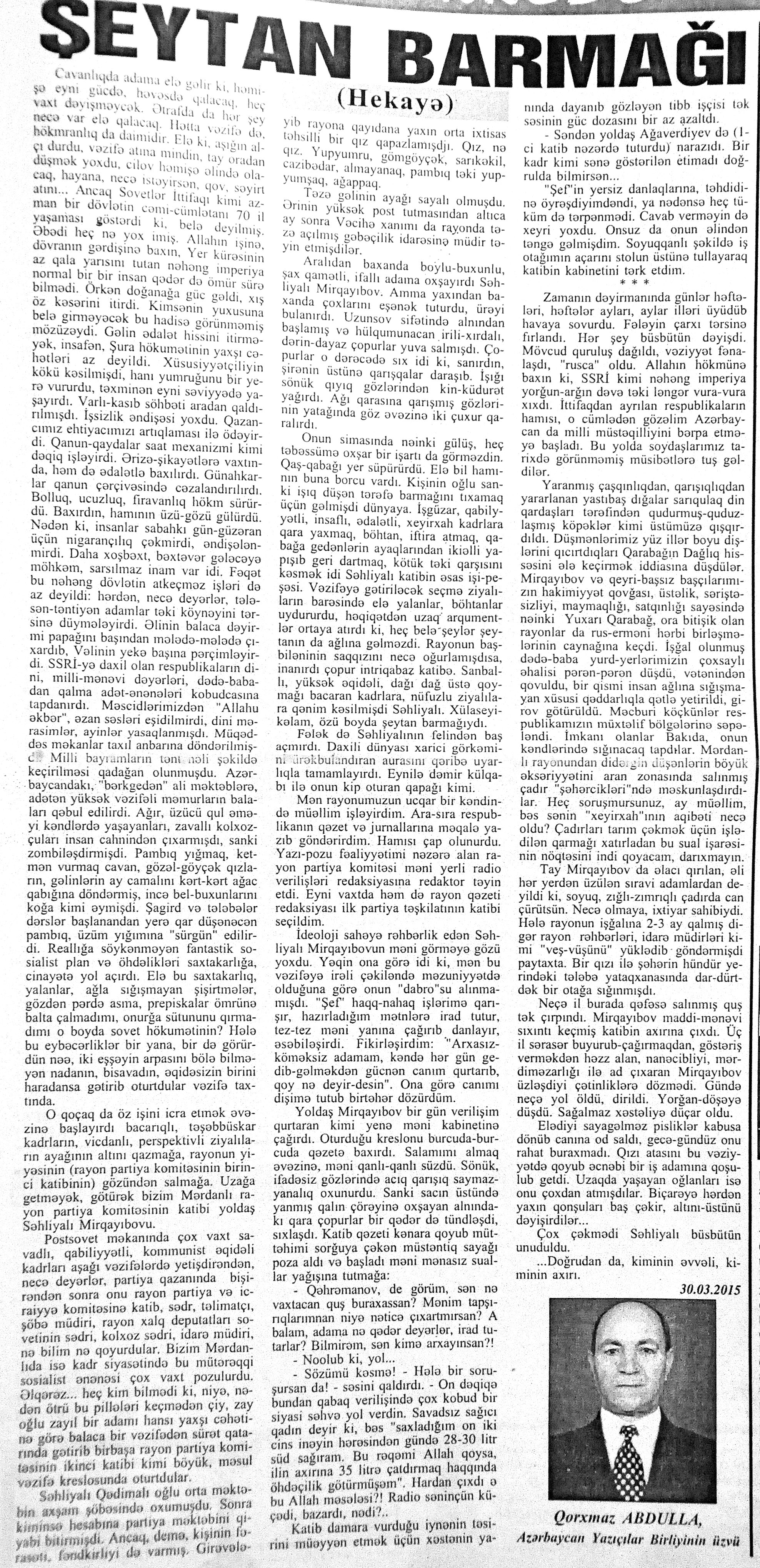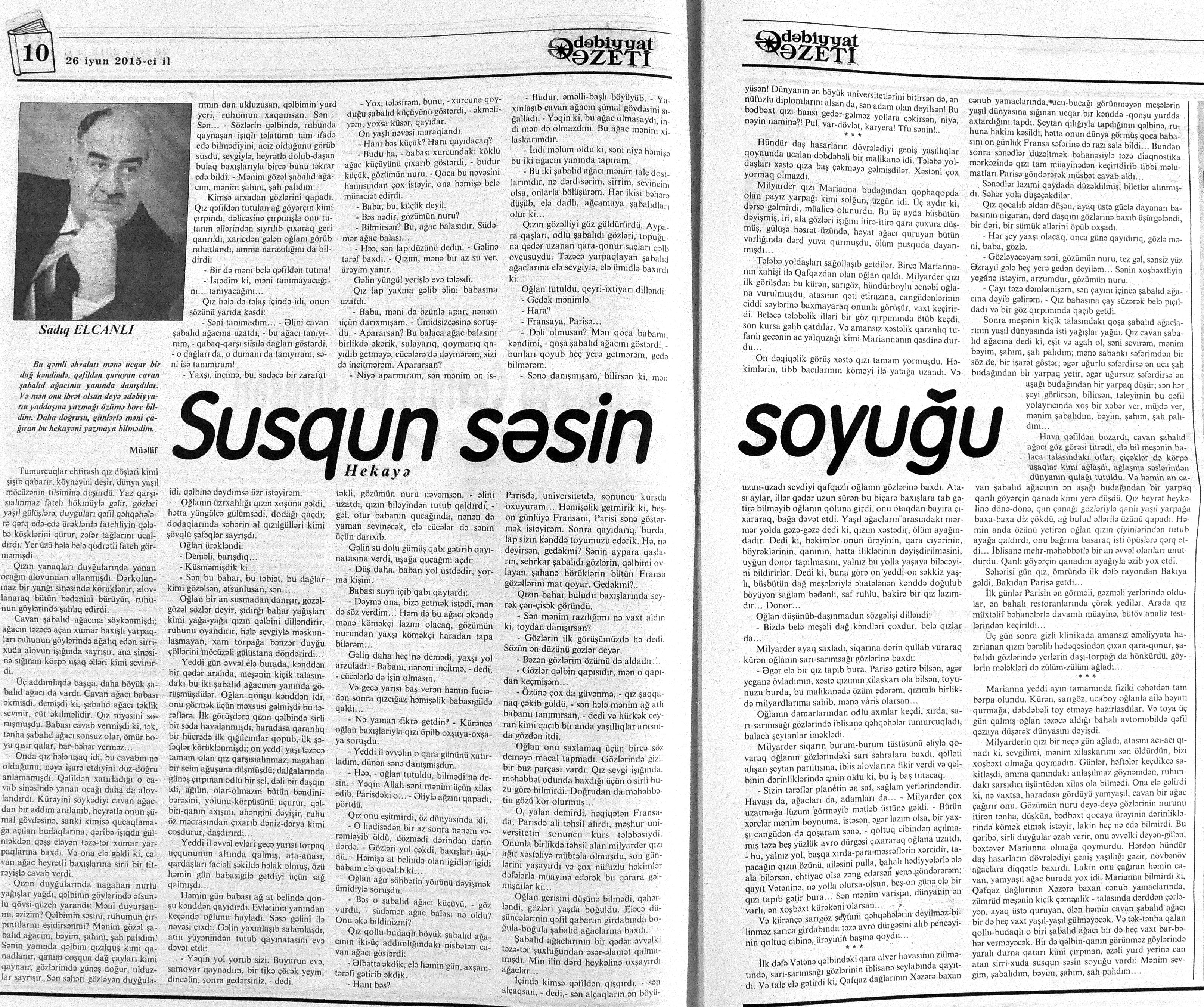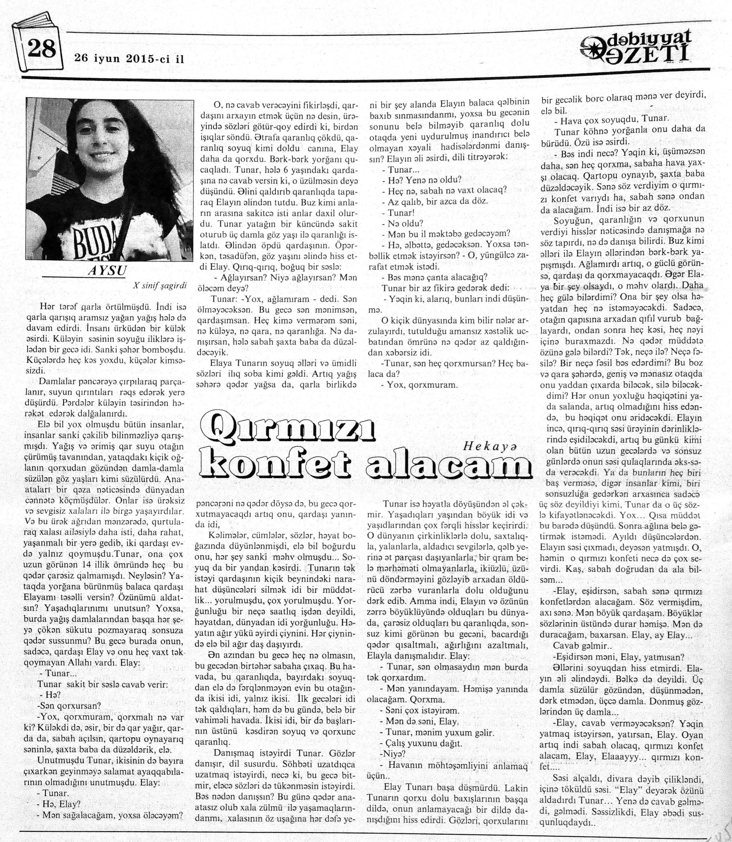 525. Abdulla, Q. Şeytan barmağı: //Kredo.- 2015.- 5 iyun.- S.15. 526. Ağaoğlu, M. Gülüstan müqaviləsinin bağlandığı gecə //Kaspi.- 2015.- 20-22 iyun.- S.22-23. 527. Aqil, M. Pay //Ədəbiyyat qəzeti.- 2015.- 13 iyun.- S.37. 528. Aysu. Qırmızı konfet alacam //Ədəbiyyat qəzeti.- 2015.- 26 iyun.- S.28. 529. Elcanlı, S. Susqun səsin soyuğu: //Ədəbiyyat qəzeti.- 2015.- 26 iyun.- S.10-11. 530. Elsevər, Ə. Çinar ağacı //Azərbaycan: jurnal.- 2015.- №2.- S.139-143. 531. Gülayə. Tənha quşun nağılı //Kaspi.- 2015.-13-16 iyun.- S.24. 532. İsabəyli, Q. Son görüş //Kaspi.- 2015.-13-16 iyun.- S.20. 533. Qurbanlı, R. Simli yaylıq: //525-ci qəzet.- 2015.- 26 iyun.- S.29. 534. Mehdi, Q. Əjdaha və 40 igid haqqında nağıl //Ədəbiyyat qəzeti.- 2015.- 13 iyun.- S.28-29. 535. Məhərrəmov, V. Canavar //525-ci qəzet.- 2015.- 24 iyun.- S.7. 536. Məmmədoğlu, N. Alı kişi //Kredo.- 2015.- 19 iyun.- S.5-6. 537. Mopassan, G. Simonun atası //Kaspi.- 2015.-6-8 iyun.- S.22. 538. Niftiyev, Ə. Mənim anam...; Sizə əsa alacağam //Azərbaycan müəllimi.- 2015.- 13 iyun.- S.12. 539. Sadiq, Ş. Mən ölmüşəm //Ədəbiyyat qəzeti.- 2015.- 13 iyun.- S.7. 540. Tağıyev, A. Oğullar kişi olacaq; Adi əhvalat; Varislər //Azərbaycan: jurnal.- 2015.- №2.- S.127-138. 541. Trifonov, Y. Göbələkli payız //Ədəbiyyat qəzeti.- 2015.- 26 iyun.- S.22. 542. Ümbülbanu. Arabaçı //Ədəbiyyat qəzeti.- 2015.- 13 iyun.- S.45. 543. Zeynaloğlu, C. O müdhiş gecə //Ədalət.- 2015.-12 iyun.- S.6.
