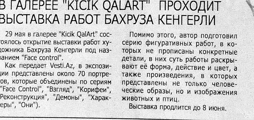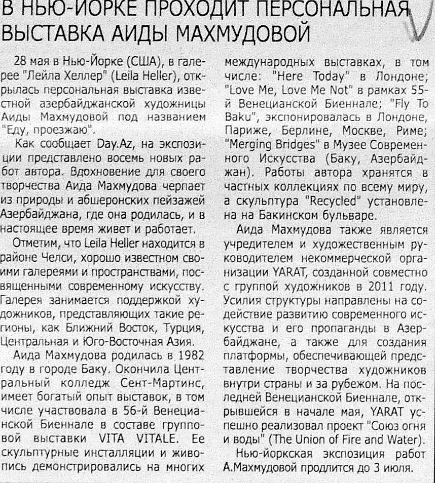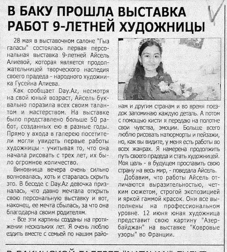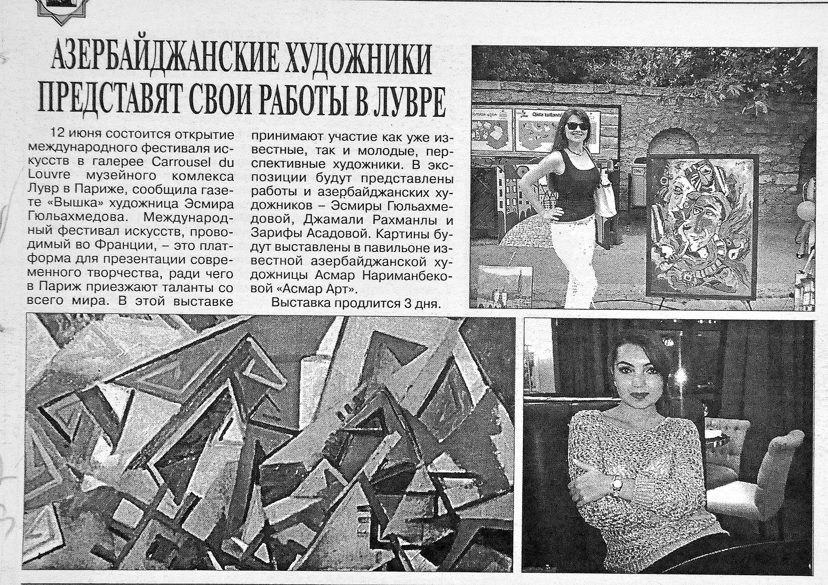 100. Алиева, С. «Импрессия» Мехрибан Эфенди в Словакии: Картина азербайджанской художницы украсит новую художественную галерею Coop art gallery //Эхо.- 2014.- 20 июня.- С.10. 101. Асадова. И. Нигяр Нариманбекова вновь представит Азербайджан во Франции //Эхо.- 2015.- 2 июня. - С. 8. 102. Асадова. И. Нигяр Нариманбекова: «Мои картины завоевали ее сердце... »: Известный азербайджанский художник представила на выставке «Русский дневник в Париже» картину «Адажио» //Эхо.- 2015.- 17 июня. - С.8. 103. Бабанлы,Ю. В Нью-Йорке открылась персональная выставка Аиды Махмудовой //Бакинский рабочий.- 2015. - 2 июня. - С. 11. 104. В галерее «Kicik Qarart» проходит выставка работ Бахруза Кенгерли //Ежедневные новости.- 2015.- 5 июня.- С.10. 105. В музее Лувр открылась персональная выставка талантливой молодой художницы Марьям Алекперли //Бакинский рабочий.- 2015.- 14 июня.- С.9. 106. В Нью-Йорке проходит персональная выставка Аиды Махмудовой //Ежедневные новости.- 2015.- 5 июня.-С.10. 107. Заслуженный художник Сакит Мамедов удостоен Мальтийского Ордена //Бакинский рабочий.- 2015.- 3 июня.- С. 9. 108. Кязимова, Н. Работами азербайджанской художницы заинтересовался совет Третьяковской Галереи: Руфина Абасова представила свои работы на выставке «Цветоритм» в Москве //Эхо.- 2015.- 5 июня.- С. 8.