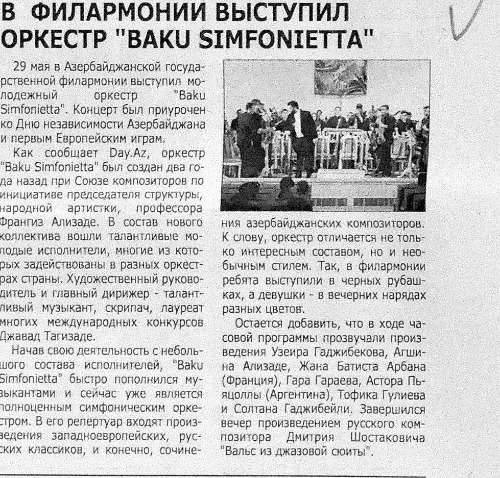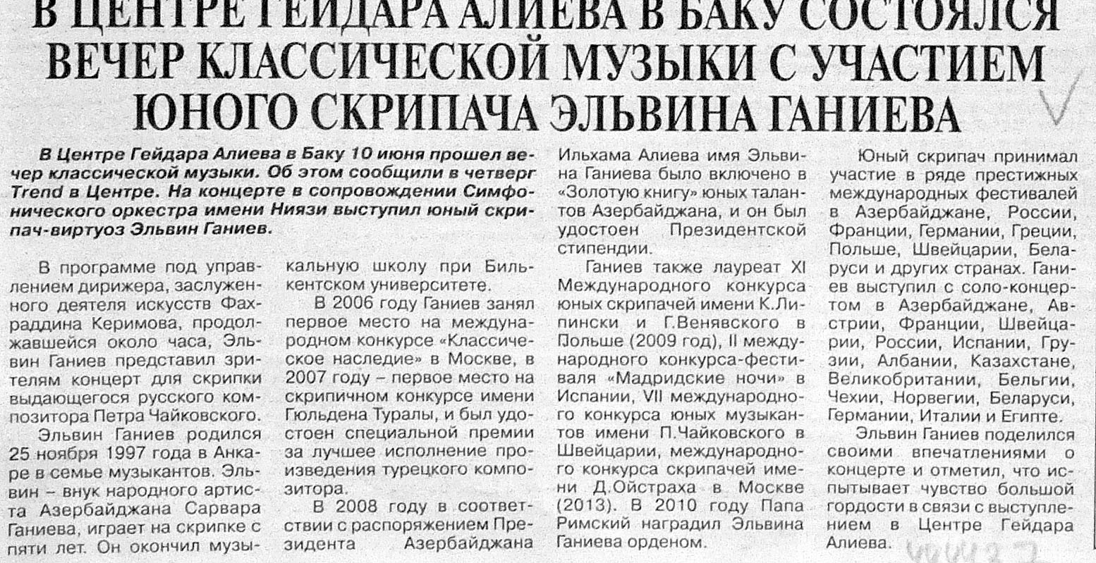 117. Асадова, И. Алим Гасымов выступит в Женеве: Всемирно известный исполнитель азербайджанского мугама даст концерт в столице Швейцарии, а также проведет там мастер-класс //Эхо.- 2015.-20 июня.- С.10. 118. Баннаева, Н. Медаль с портретом Ататюрка: Студент Музыкального колледжа Эльданиз Алекберзаде занял первое место на конкурсе пианистов в Турции //Азербайджанские известия.- 2015.- 18 июня.- С.3. 119. В Баку состоялся концерт итальянского ансамбля Le Dev4s и Азербайджанского симфонического оркестра имени Узеира Гаджибекова //Эхо.- 2015.-25 июня.- С.8. 120. В Филармонии выступил оркестр «Baku simfonietta»: [в День независимости] //Ежедневные новости.- 2015.-5 июня.- С.10. 121. В Москве подведены итоги авторского проекта азербайджанского музыканта: [Тарлана Сеидова] //Бакинский рабочий.- 2015.- 9 июня.- С. 14. 122. В Филармонии выступил оркестр «Baku simfonietta»: [в День независимости] //Ежедневные новости.- 2015.-5 июня.- С.10. 123. В Центре Гейдара Алиева в Баку состоялся вечер классической музыки с участием юного скрипача Эльвина Ганиева //Вышка.- 2015.- 12 июня.- С.11. 124. Ирада, А. «Шелковый Путь» на подходе: В Азербайджане идет подготовка к проведению VI Шекинского международного музыкального фестиваля //Эхо.- 2015.- 30 июня.- С.8. 125. Юный азербайджанский скрипач завоевал первое место в Испании: [Эмиль Гусейнов в Барселоне] //Ежедневные новости.- 2015.- 12 июня.- С.10.