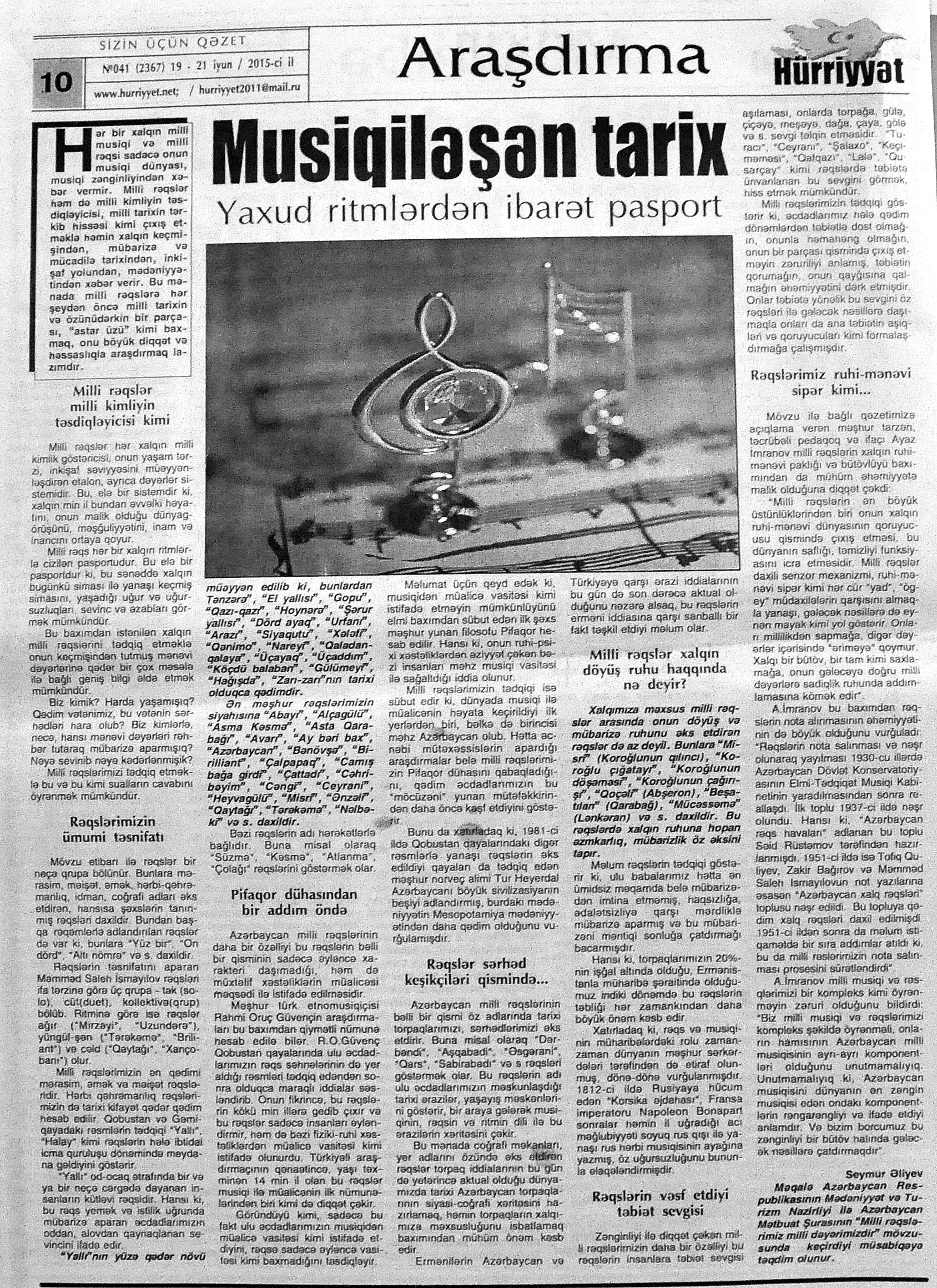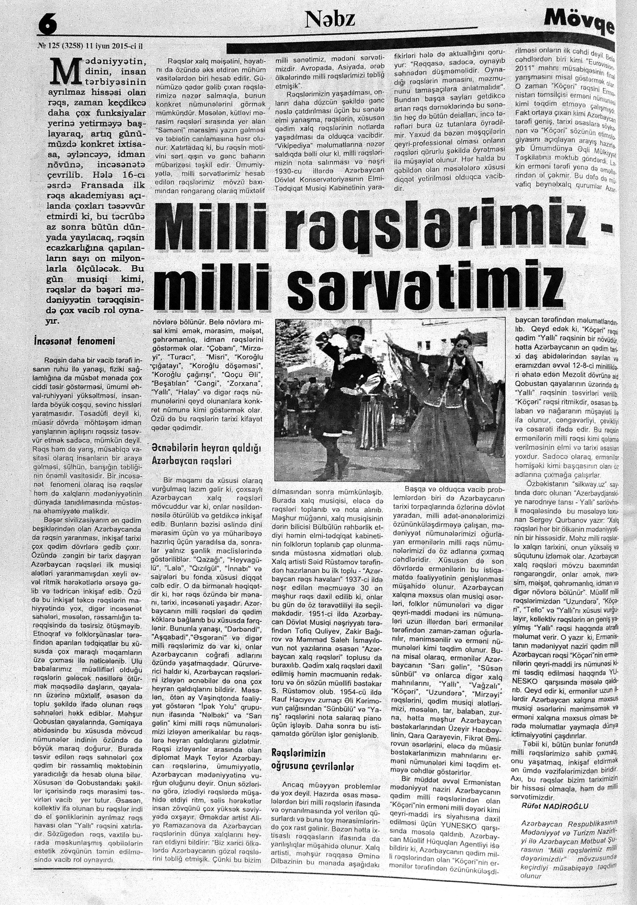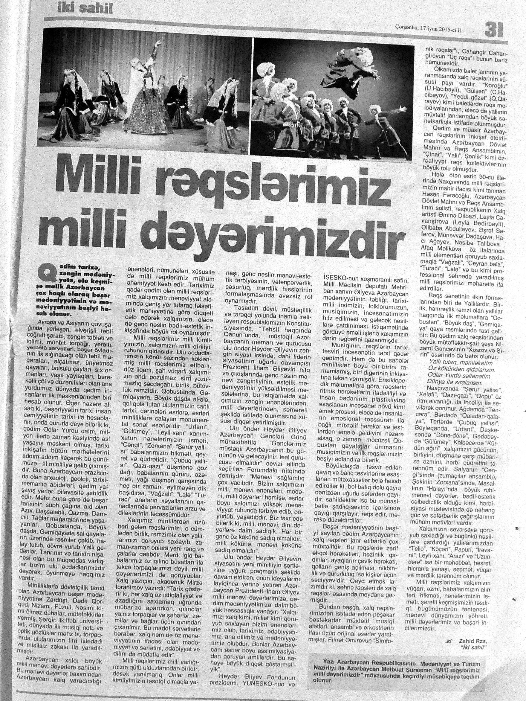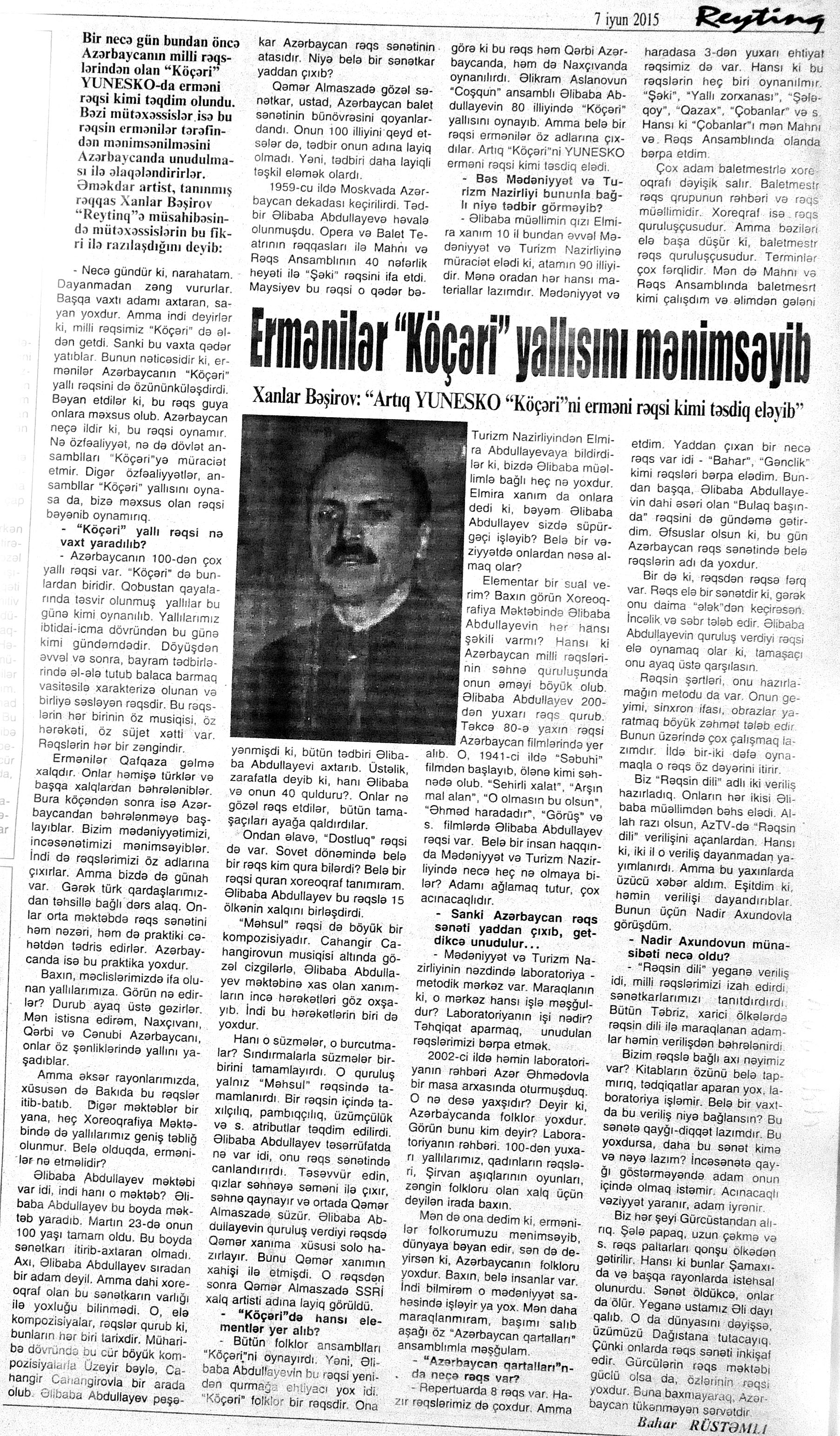 325. Abbaslı, T. Milli rəqslərimiz milli dəyərimizdir: Abbas babam da deyərmiş: “Çalıb-oynamaq bizim hal-əhval xörəyimizdir”... //Mədəniyyət.- 2015.- 17 iyun.- S.12. 326. Abdullayeva, F. Hərəkətin ən gözəli süzməkdir...: Azərbaycan rəqsləri xalqımızın mədəni və məişət irsinin incə təzahür vasitələrindən biridir //Mədəniyyət.- 2015.- 19 iyun.- S.12. 327. Abdullayeva, N. Milli rəqslərimizin təbliğata ehtiyacı var: “Köçəri”ni özününküləşdirməyə çalışan ermənilərin bu cəhdlərinin qarşısını almağın yolu təbliğatdan keçir //Palitra.- 2015.- 11 iyun.- S.12. 328. Bakı Xoreoqrafiya Akademiyasının təbliğat konserti //Mədəniyyət.- 2015.- 5 iyun.- S.9. 329. Bəşirov, X. Ermənilər “Köçəri” yallısını mənimsəyib: Xanlar Bəşirov: “Artıq YUNESKO “Köçəri”ni erməni rəqsi kimi təsdiq eləyib”: [Əməkdar artist, rəqqas Xanlar Bəşirovun müsahibəsi] /müsahibəni apardı Rüstəmli Bahar //Reytinq.- 2015.- 7 iyun.- S.14. 330. Ələsgər, G. Milli rəqslərimiz milli dəyərimizdir //525-ci qəzet.- 2015.- 17 iyun.- S.7. 331. Əliyev, S. Musiqiləşən tarix: Yaxud ritmlərdən ibarət pasport: [Azərbaycan rəqsləri haqqında] //Hürriyyət.- 2015.- 19-21 iyun.- S.10. 332. Fuad. “Sarvan” Türkiyədə rəqs festivalında iştirak edib: [Azərbaycanlıların Mədəniyyət Mərkəzinin nəzdində fəaliyyət göstərən folklor ansamblı haqqında] //Palitra. - 2015.- 18 iyun.- S.16. 333. Heydər Əliyev Sarayında folklor rəqs festivalı //Mədəniyyət.- 2015.- 12 iyun.- S.6. 334. Hüseynova, A. “Rəqs və rəssamlıq həyatımın mənasıdır”: [rəqqas və rəssam Afaq Hüseynova ilə müsahibə] /müsahibəni apardı S. Soltanlı //Mədəniyyət.- 2015.- 26 iyun.- S.13. 335. İndi də gözlərini “Köçəri”yə dikiblər: Ermənistanın mədəniyyət naziri rəqsimizin erməni milli dəyəri kimi tanınması üçün UNESCO qarşısında məsələ qaldırıb //Ekspress.- 2015.- 2 iyun S.15. 336. Məhərrəmova, T. Tarixdən süzülüb gələn rəqslərimiz: Onların ruhunu qorumaqla dəyərlərimizi də qorumuş olarıq: [mövzu ilə bağlı rəqqasələrin fikirləri] //Kaspi.- 2015.- 11 iyun.- S.11. 337. Məmmədli, N. Milli rəqslərimiz milli dəyərimizdir //Ekspress.- 2015.- 1 iyun S.15. 338. Məmmədova, A. Milli rəqslərimiz milli dəyərimizdir //Ekspress.- 2015.- 13-16 iyun S.14; P.S.Elm, təhsil və həyat.- 2015.- 12-19 iyun.- S.13. 339. Milli rəqslərimiz, milli sərvətimiz //Mövqe.- 2015.-12 iyun.- S.6. 340. “Odlar yurdu - rəqs ruhu”: [Heydər Əliyev Sarayında eyniadlı illik hesabat konsertinin keçirilməsi haqqında] //Mədəniyyət.- 2015.- 17 iyun.- S.2. 341. Özbəkistan saytı milli rəqslərimizə qarşı erməni saxtakarlığından yazıb //Mədəniyyət.- 2015.- 5 iyun.- S.4. 342. Rəğbətoğlu, M. Milli rəqslərimiz milli dəyərimizdir //Olaylar.- 2015.- 10 iyun.- S.10. 343. Rza, Z. Milli rəqslərimiz milli dəyərimizdir //İki sahil.- 2015.- 17 iyun.- S.31. 344. Sarıyeva, İ. Milli rəqslərimiz milli dəyərimizdir //Bakı xəbər.- 2015.- 4 iyun.- S.15.
