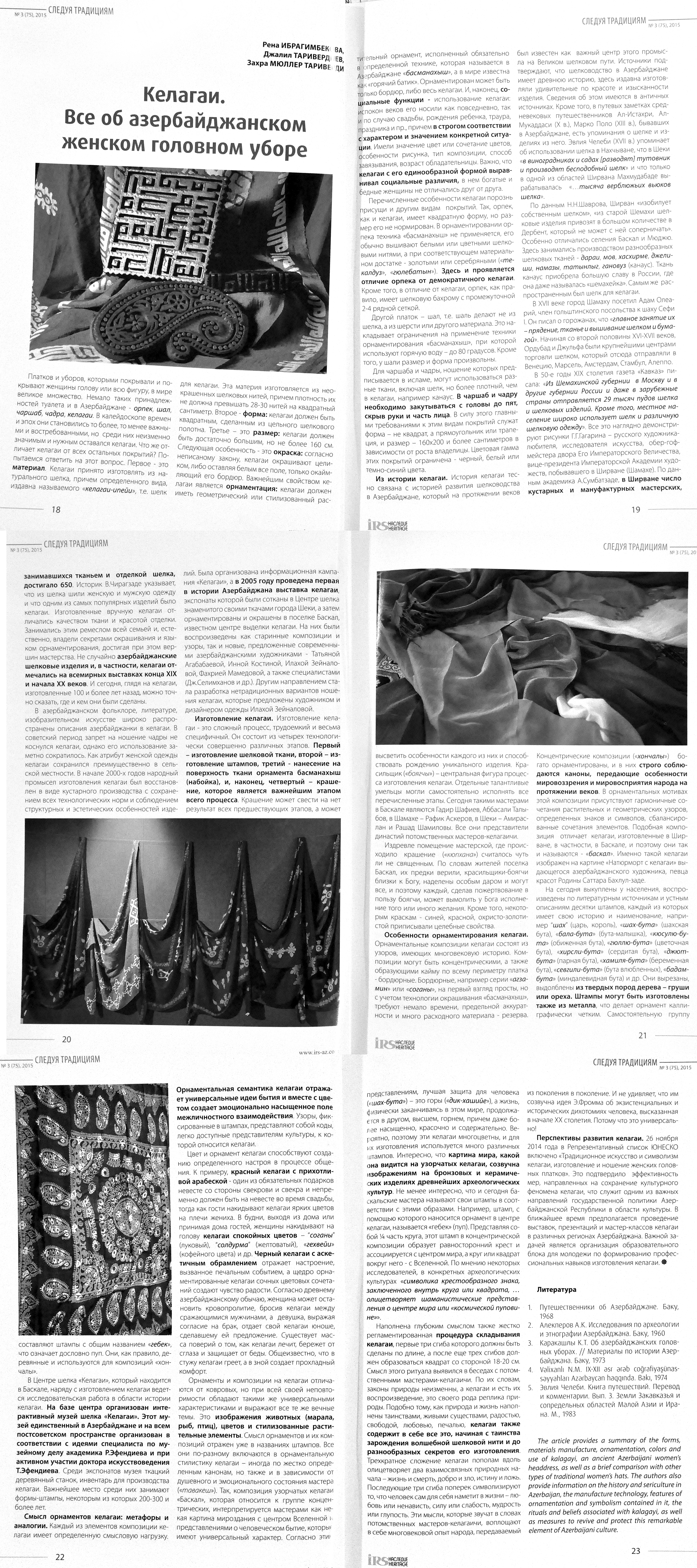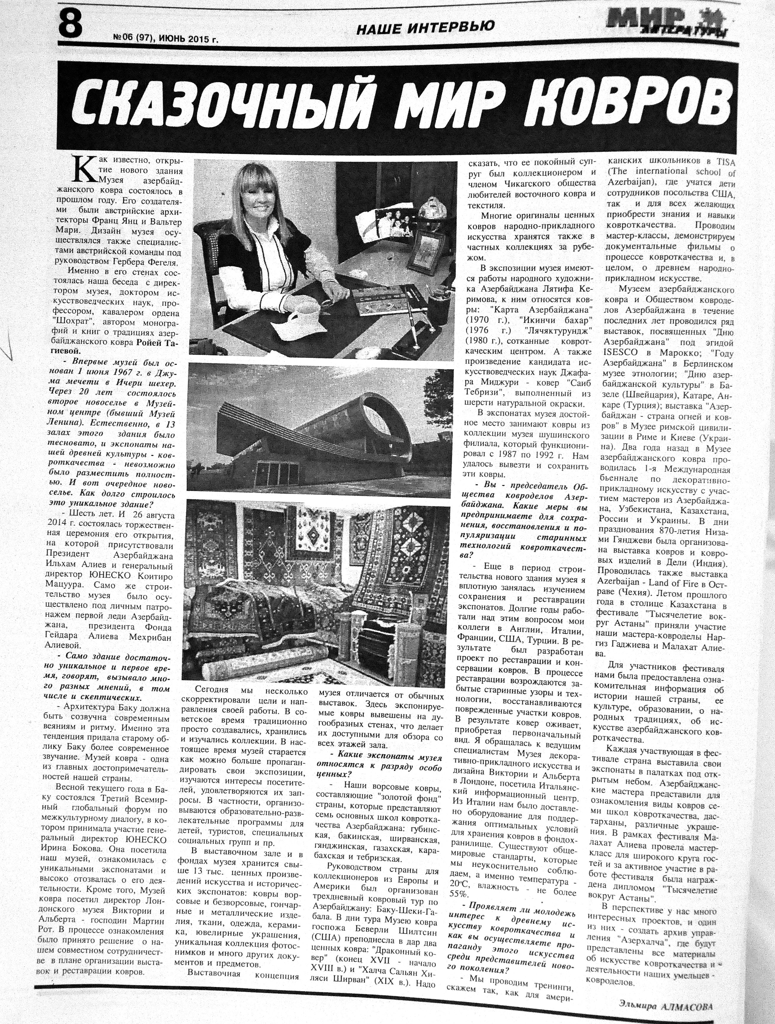 109. Ибрагимбекова, Р. Келагаи. Все об азербайджанском головном уборе //IRS Наследие.- 2015.- №3(75).- С.18-23. 110. Тагиева, Р. Азербайджанский ковер: происхождение и символика //IRS Наследие.- 2015.- №3 (75).- С.24-31. 111. Тагиева, Р. Сказочный мир ковров /Интервью с ди-ректором Музея Ковра провела Э.Алмасова //Мир литературы.- 2015.- 26 июня.- С.8. 112. Яралова, Т. Рождение театра: Куклы и декорации к спектаклю «Лейли и Меджнун» сами по себе — настоящие произведения искусства //Азербайджанские известия.- 2015.- 18 июня.- С.3.