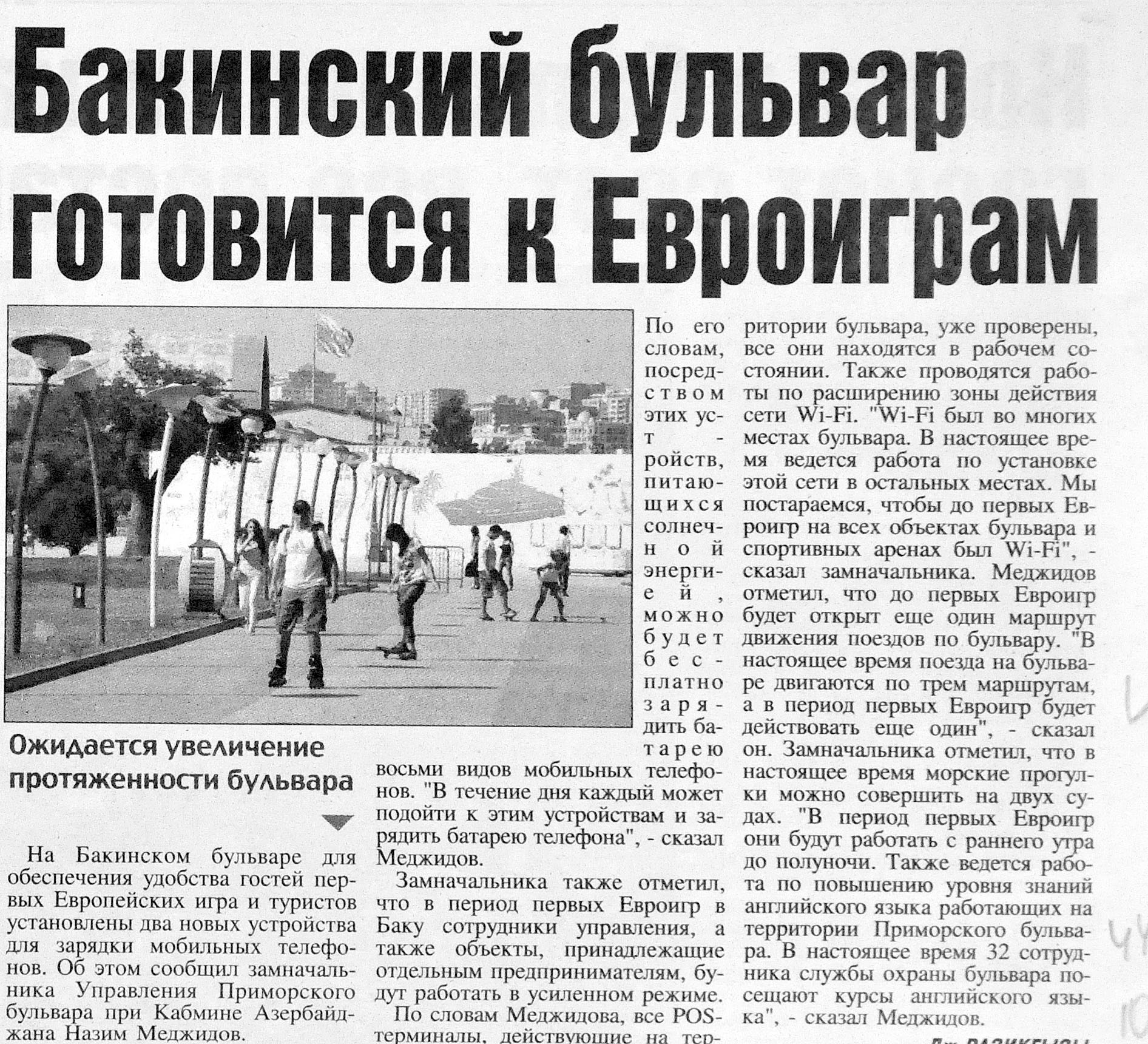 77. Новый парк, созданный перед Парком Европейских игр, привлекает внимание своей красотой //Бакинский рабочий.- 2015.- 9 июня.- С.4. 78. Президент Азербайджана Ильхам Алиев принял участие в открытии Баиловского бульвара //Бакинский рабочий.- 2015.- 9 июня.- С.4.