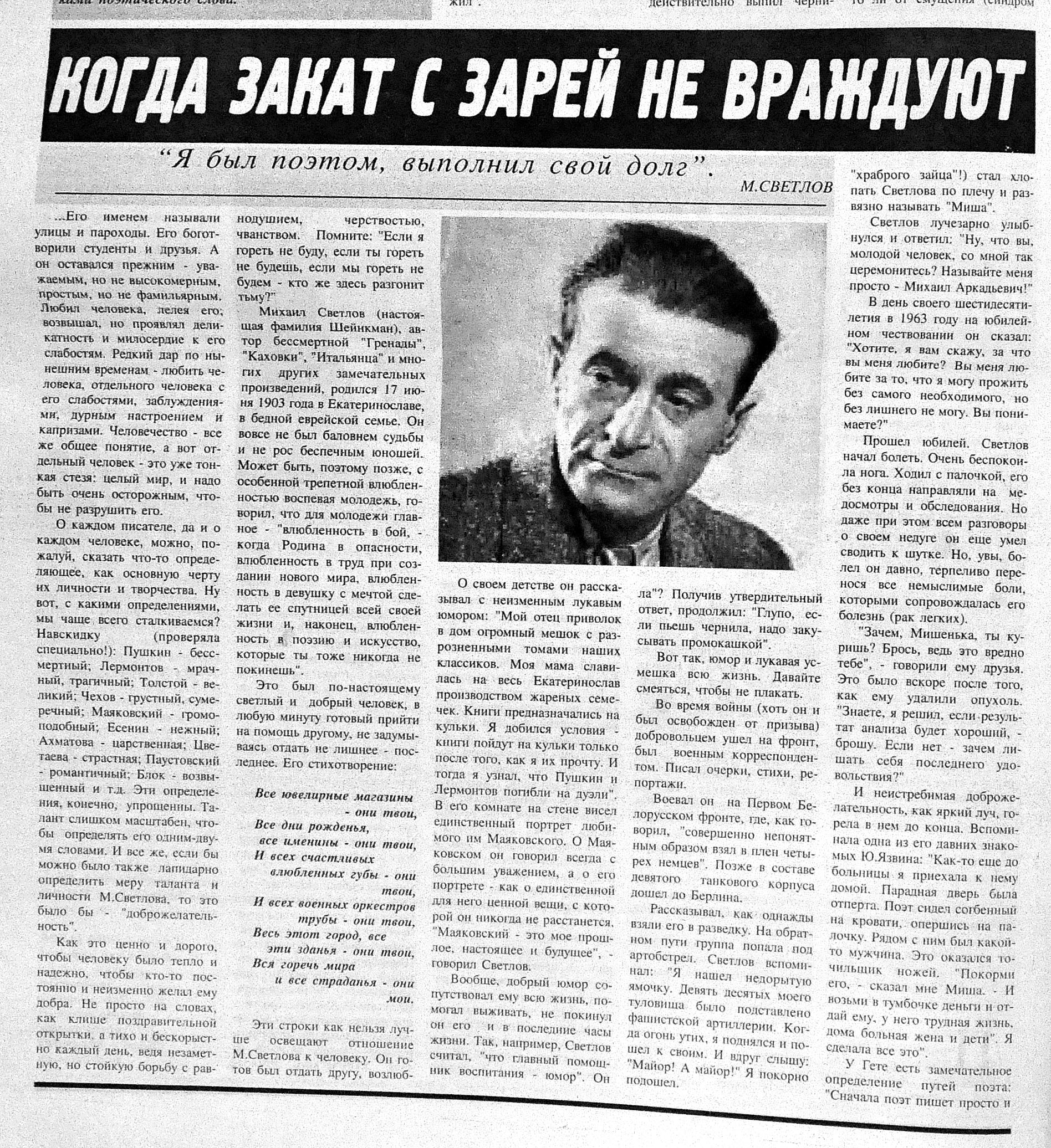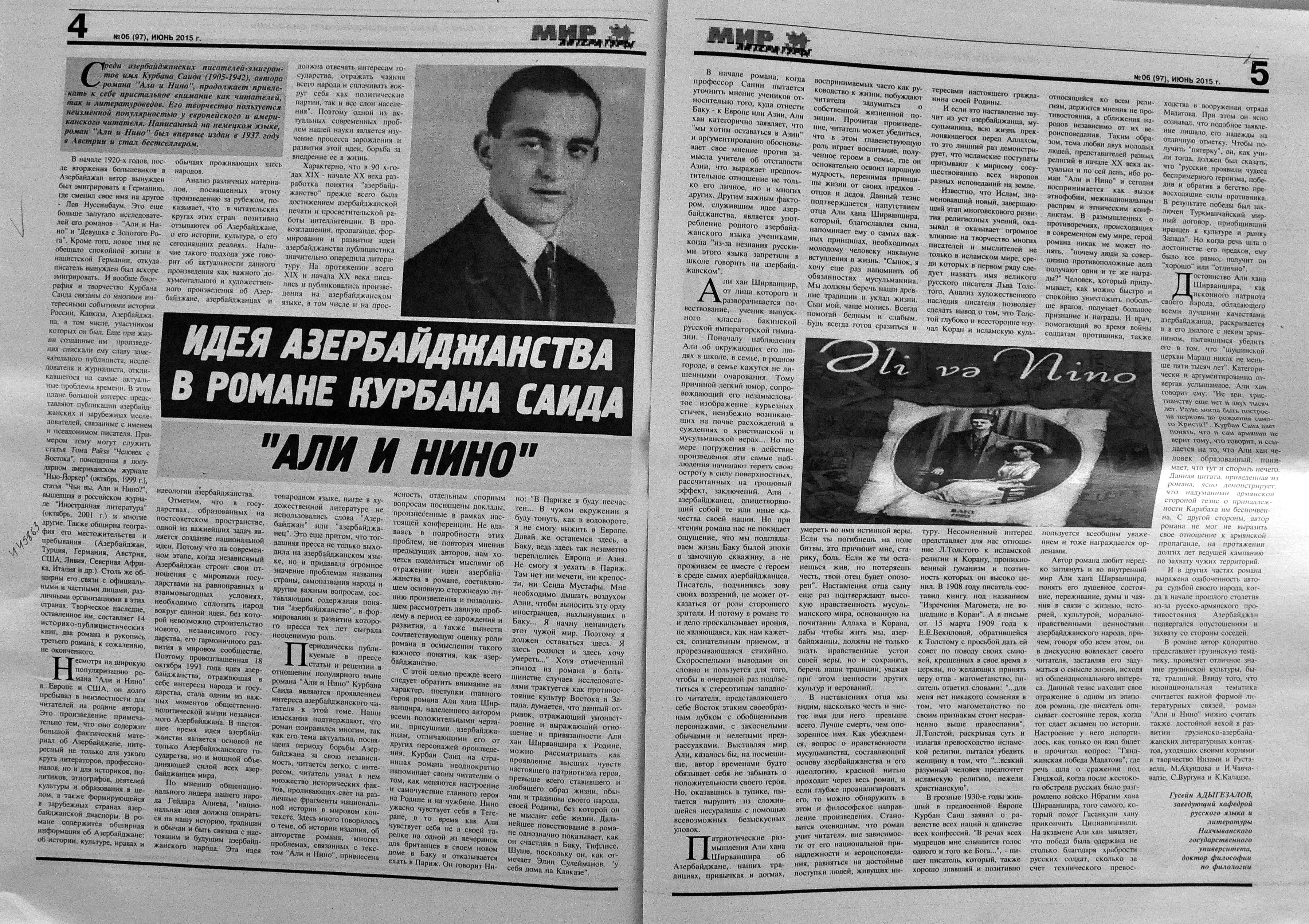 140. Асадова. И. Натиг Расулзаде: «Этот роман писался необычно долго... »: Известный писатель рассказывает о новом произведении //Эхо.- 2015. -13 июня.- С.10. 141. Багирова, Л. Когда закат с зарей не враждуют: «Я был поэтом, выполнил свой долг»: [о творчестве русского поэта Михаила Светлакова] //Мир литературы.- 2015. - 26 июня.- С.6. 142. Баннаева, Н. Поэзия начинается с молитвы: Вагиф Самедоглу успел прочитать последнюю написанную о нем книгу: [вечер памяти Народного поэта в Джаз-центре] //Азербайджанские известия.- 2015.- 10 июня.- С. 4. 143. В Баку состоялась презентация книги «Несказанное тебе»: [азербайджанской поэтессы, публициста Афаг Шихлы] //Бакинский рабочий.- 2015.- 24 июня.- С.10. 144. Идея Азербайджанства в романе Курбана Саида «Али и Нино» //Мир литературы.- 2015.- 26 июня.- С.4. 145. Ингилаб И. Суметь сохранить детство: Ингилаб Исаг: Есть авторы, которые словно стараются вызвать отвращение к литературе /Интервью провел Ф.Гусейн //Каспiй.- 2015.- 12 июня.- С.2. 146. Микеладзе, Г. Волшебные мосты: Анна Барткулашвили презентовала еще одну книгу //Каспiй.- 2015.-13 июня.- С.17. 147. Нифтиев, Н. Новое из глубины веков: Вышла в свет книга «Совместное проживание в Азербайджане и мультикультурализм» /Интервью с журналистом провел А.Саидов //Каспiй.- 2015.- 13 июня.- С. 13.