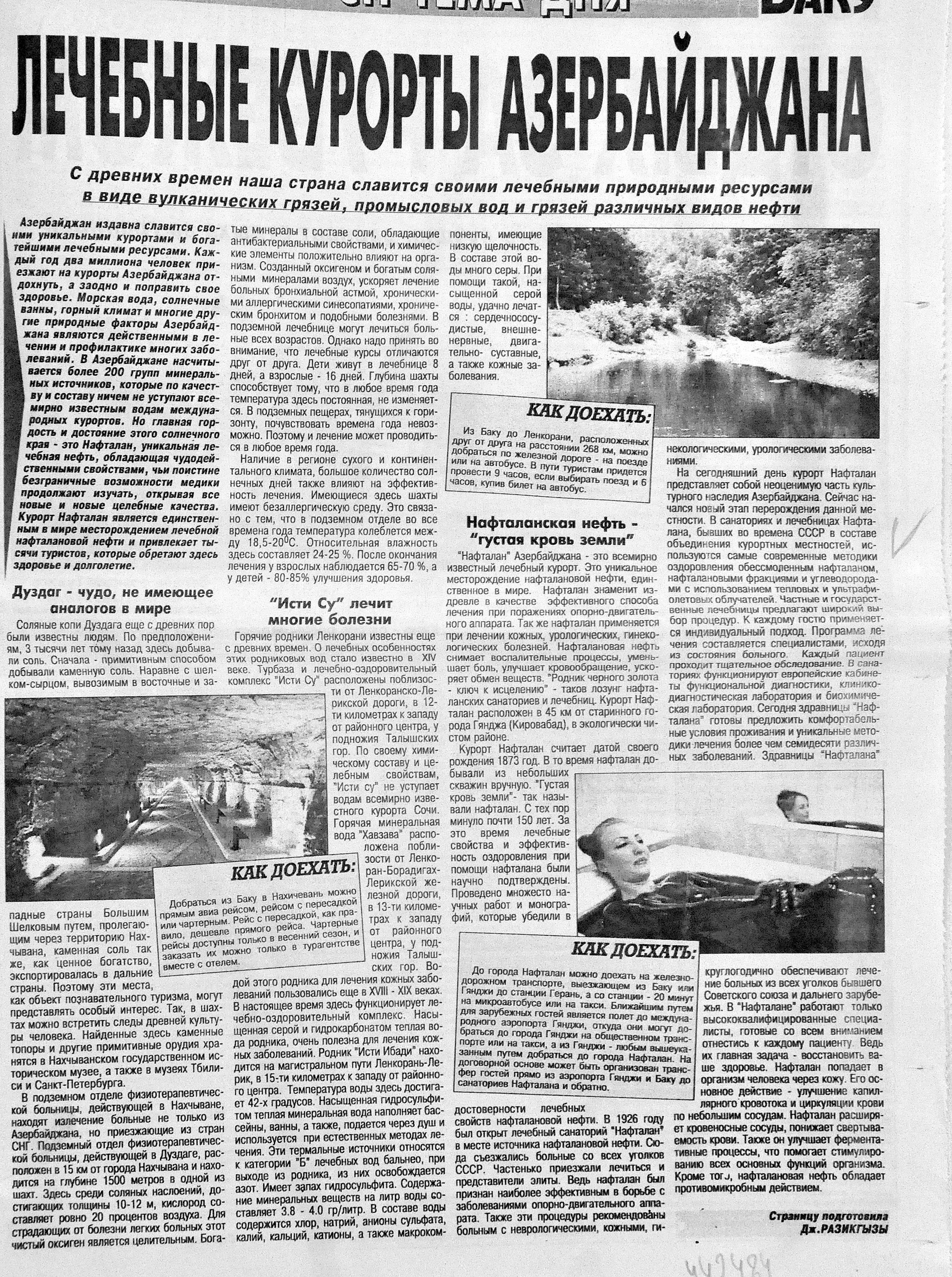 138. Асадова, И. Вышел новый номер Baku Guide //Эхо. - 2015.- 5 июня.- С. 8. 139. Разикгызы, Дж. Лечебные курорты Азербайджана //Неделя.- 2015.- 5 июня.- С. 15.