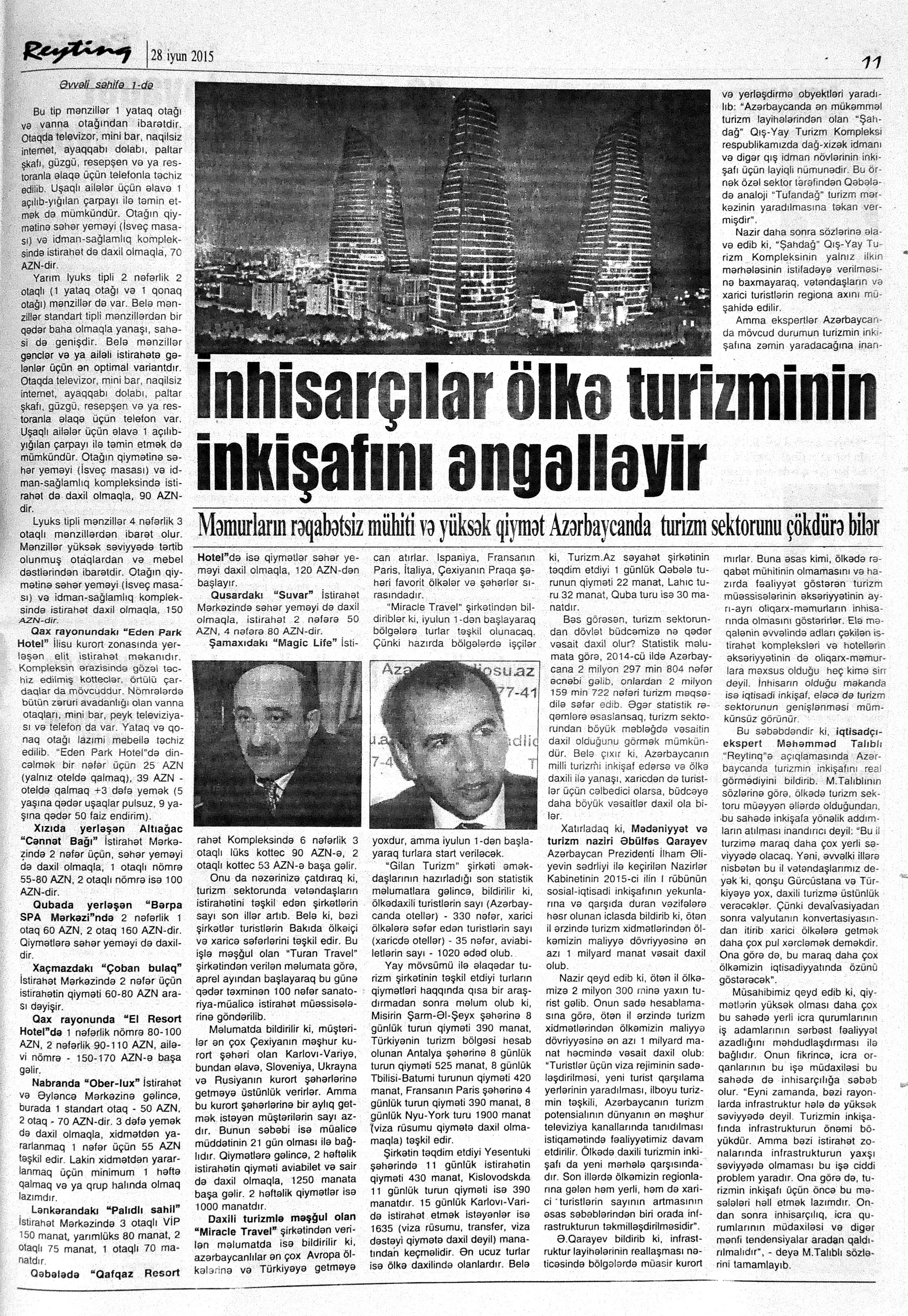 415. Abdullayeva, F. Həmkarlar ittifaqlarının xətti ilə “Şahdağ”da dincəlin: Turizm mərkəzi Respublika Həmkarlar İttifaqları Konfederasiyası ilə əməkdaşlıq edəcək //Mədəniyyət.- 2015.- 19 iyun.- S.9. 416. Abdullayeva, F. Konqreslər Bürosunun daha bir nailiyyəti: [beynəlxalq fizika konfransına ev sahibliyi edəcək] //Mədəniyyət.- 2015.- 19 iyun.- S.9. 417. Abdullayeva, F. Şahdağ Turizm Mərkəzində yay kampaniyası //Mədəniyyət.- 2015.- 19 iyun.- S.9. 418. Abdullayeva, F. Turizm şirkətlərimiz dünya standartlarına cavab verir: “Millennium Tourism & Congress” şirkətinin yeni ofisi təqdim edildi //Mədəniyyət.- 2015.- 10 iyun. - S.6. 419. “Azerbaijan breakfast”in təqdimatı keçirilib: [İçərişəhərdə] //Mədəniyyət.- 2015.- 10 iyun. - S.8. 420. Azərbaycan ilk dəfə beynəlxalq assosiasiya görüşləri reytinqində: [Azərbaycan Konqreslər Bürosunun fəaliyyəti haqqında] //Mədəniyyət.- 2015.- 12 iyun.- S.3. 421. Mehmanxanalar dərəcə sertifikatı, turizm obyektləri və şirkətləri lisenziya alıb //Mədəniyyət.- 2015.- 3 iyun.- S.8. 422. Məmmədli, Z. İnhisarçılar ölkə turizminin inkişafını əngəlləyir: Məmurların rəqabətsiz mühiti və yüksək qiymət Azərbaycanda turizm sektorunu çökdürə bilər //Reytinq.- 2015.- 28 iyun.- S.11. 423. Özbəkistan saytında “İstisu” haqqında məqalə //Mədəniyyət.- 2015.- 24 iyun.- S.12. 424. Şahdağ Turizm Mərkəzi yay mövsümünü açıq elan edir //Azərbaycan.- 2015.- 17 iyun.- S.16; Mədəniyyət.- 2015.- 17 iyun.- S.11. 425. Ümumdünya Turizm Təşkilatı İcraiyyə Şurasının 100-cü sessiyası: Yubiley sessiyası Azərbaycan üçün əlamətdar nəticələrlə yadda qalıb: [Mədəniyyət və Turizm naziri Əbülfəs Qarayevin rəhbərliyi ilə nümayəndə heyətinin Xorvatiyanın Rovinj şəhərində keçirilən sessiyada iştirakı haqqında] //Mədəniyyət.- 2015.- 3 iyun.- S.8.