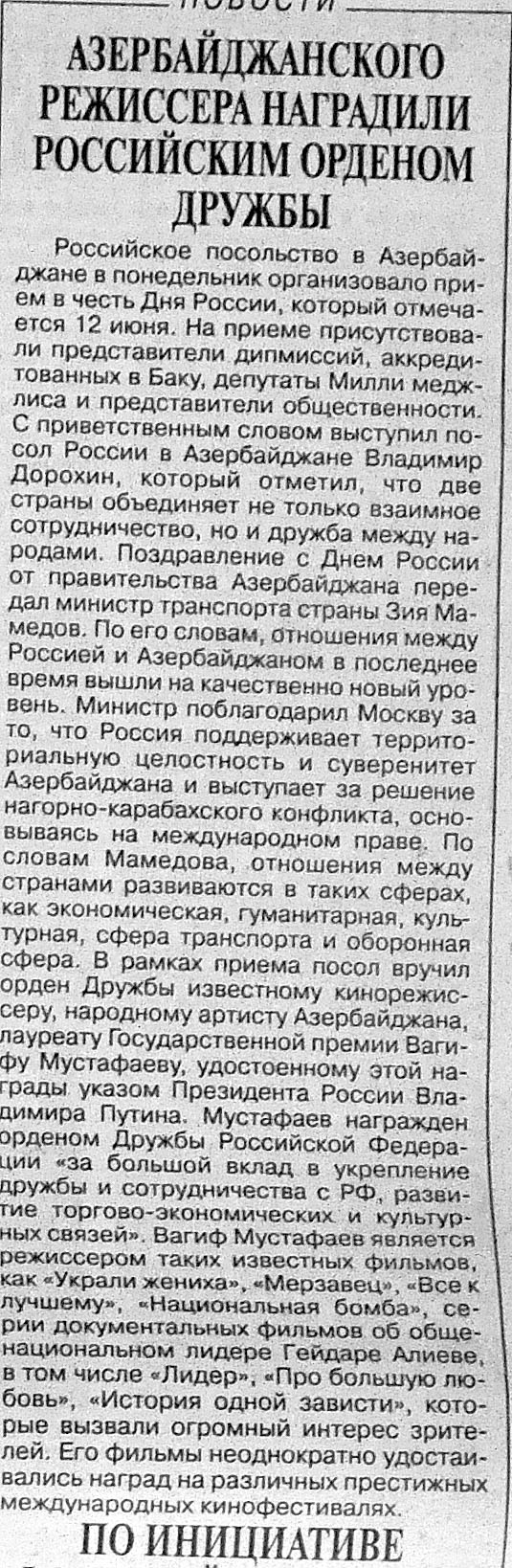 132. Азербайджанского режиссера наградили российским орденом Дружбы: [Вагифа Мустафаева] //Вышка.- 2015.- 12 июня.- С.11. 133. Асадова, И. Вагифу Мустафаеву вручили Орден Дружбы от Путина: Награждение состоялось в рамках празднования Дня России в Азербайджане //Эхо.- 2015.- 10 июня.- С. 8. 134. В Киеве прошел показ азербайджанского анимационного фильма «Старые часы»: [режиссер-Джавид Ахадов] //Эхо.- 2015.- 3 июня.- С.8 135. Вагиф Мустафаев награжден орденом Дружбы России //Бакинский рабочий.- 2015.- 10 июня.- С.9.