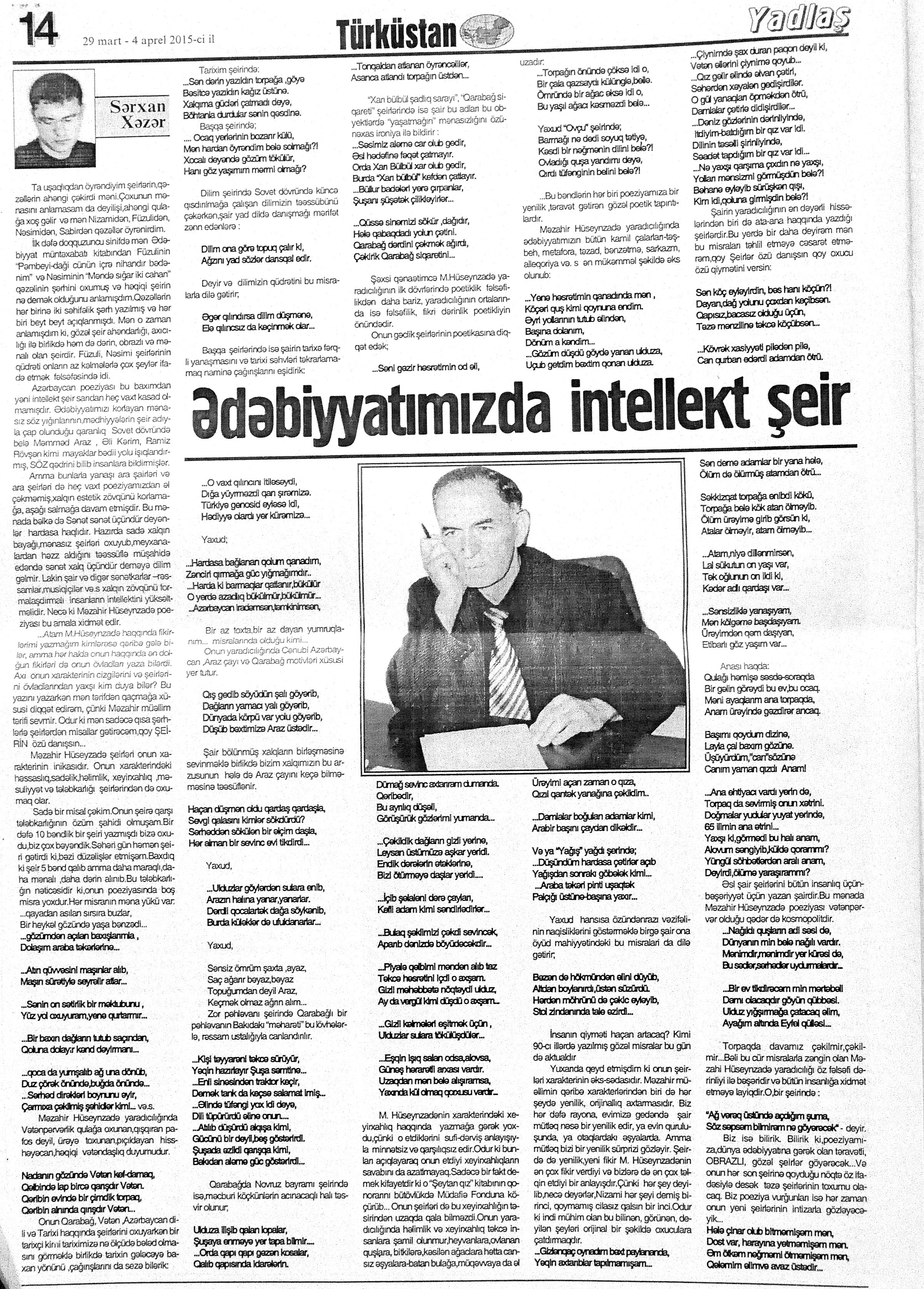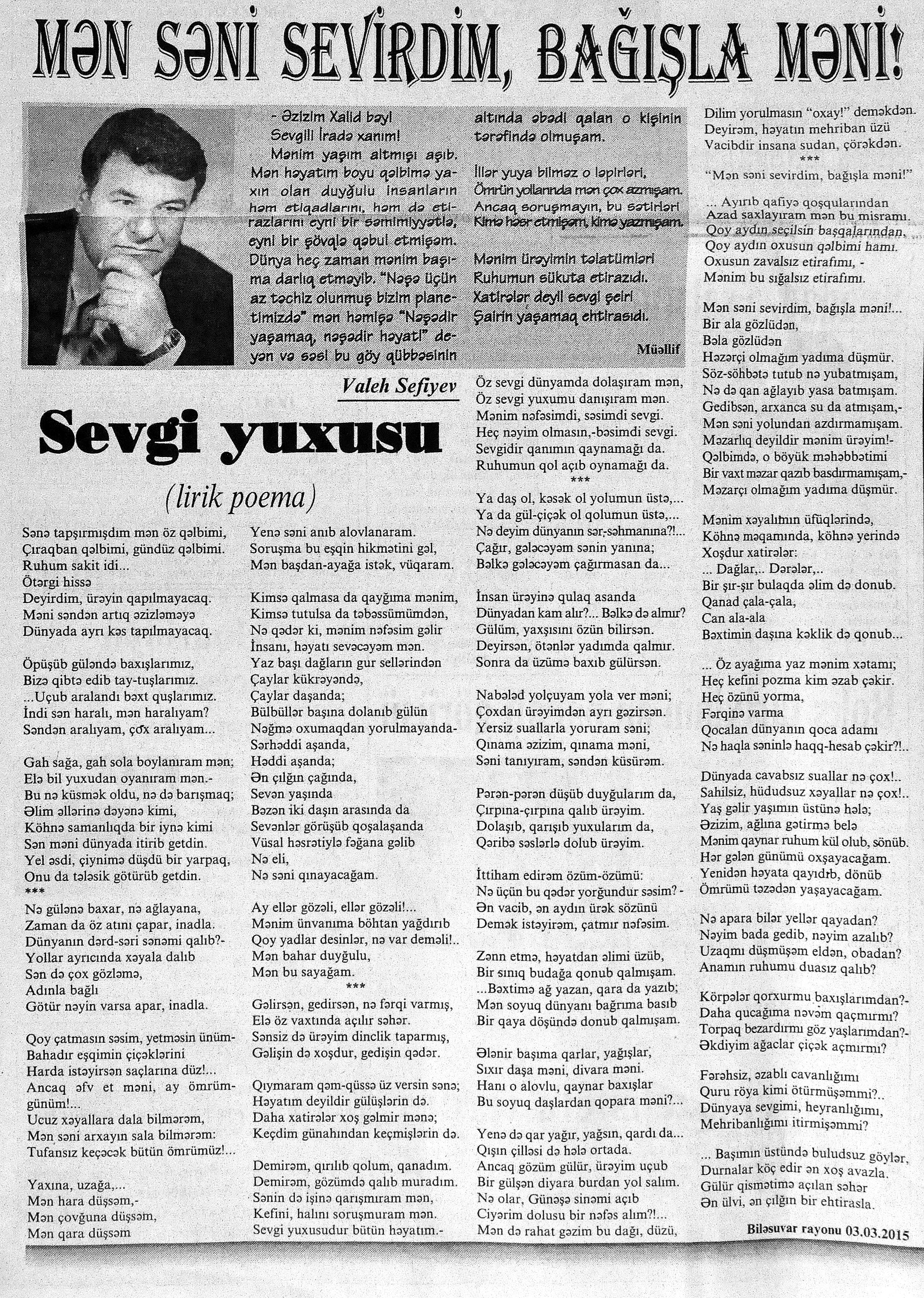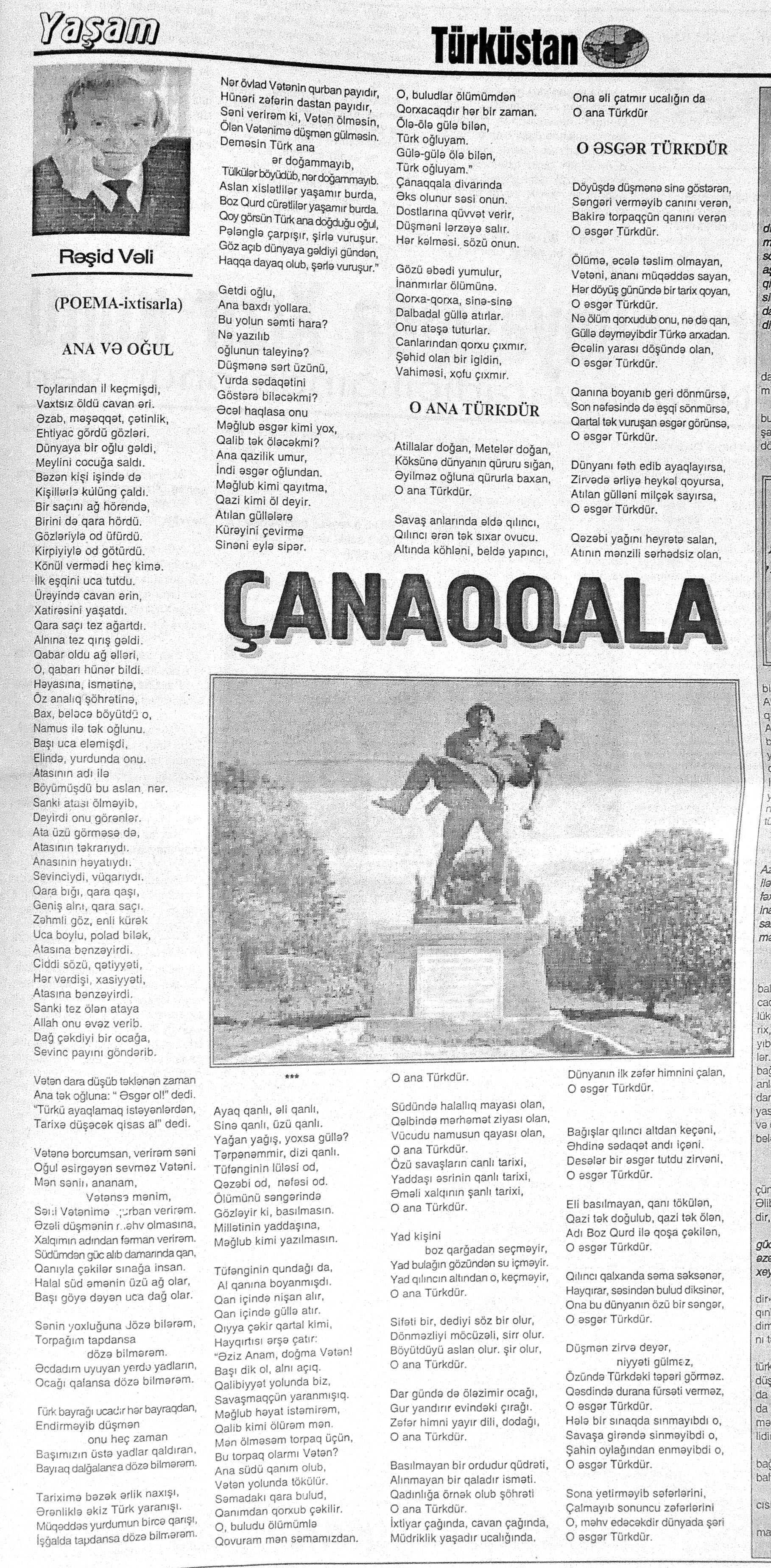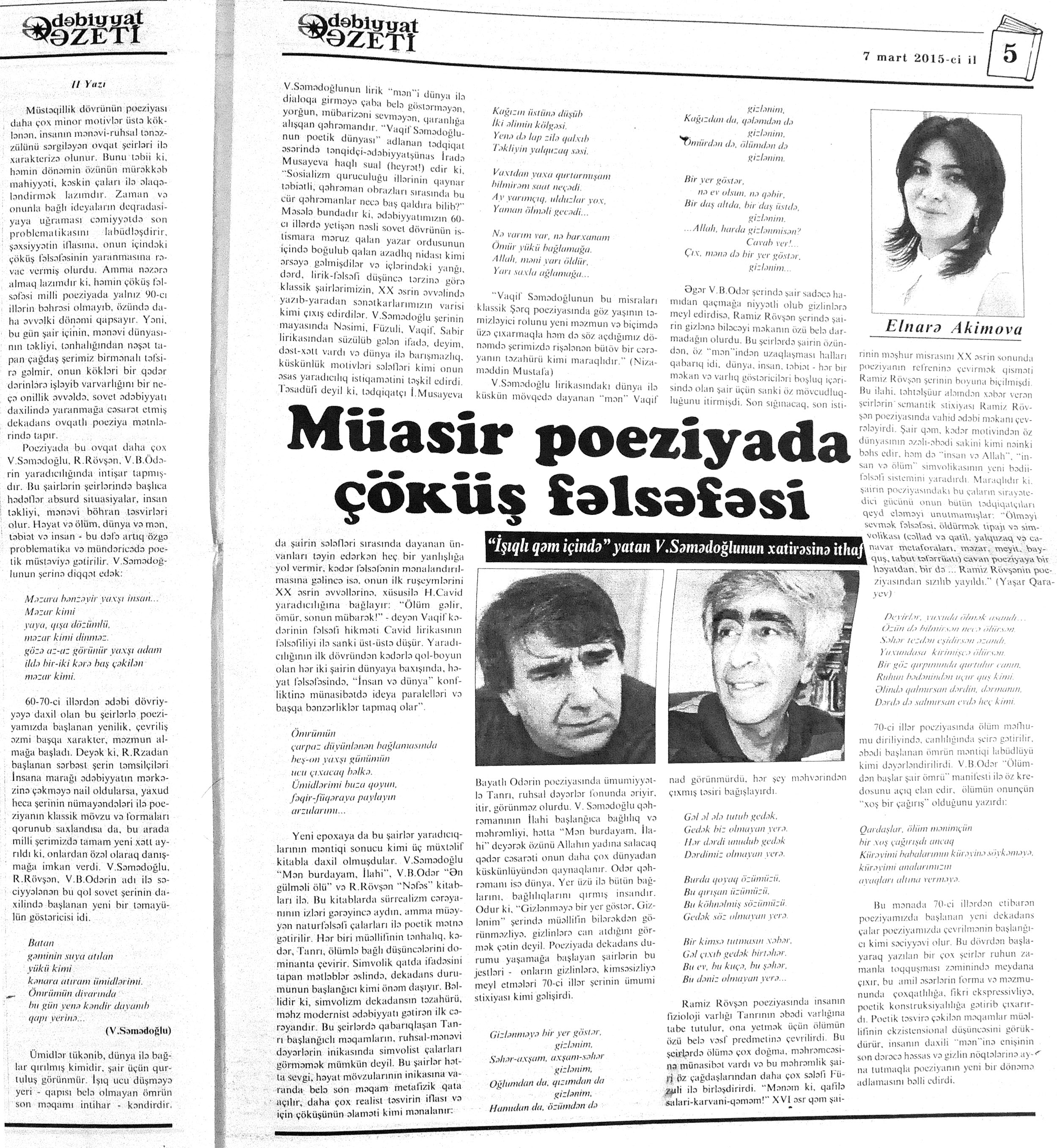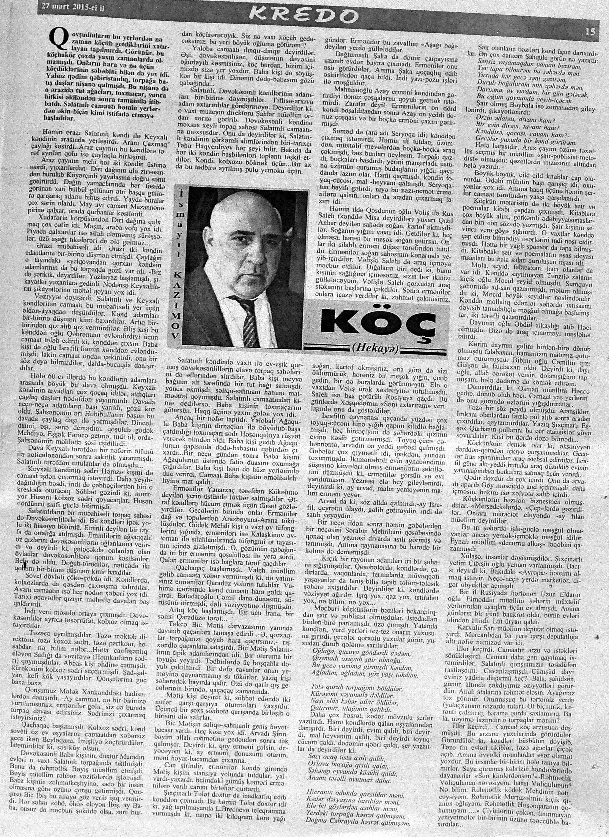 375. Sefiyev V. Mən səni sevirdim, bağışla məni!; Sevgi yuxusu //Azad Azərbaycan.- 2015.- 15 mart.- S.7. 376. Vəli, R. Çanaqqala //Türküstan.- 2015.- 29 mart-4 aprel.- S.15.