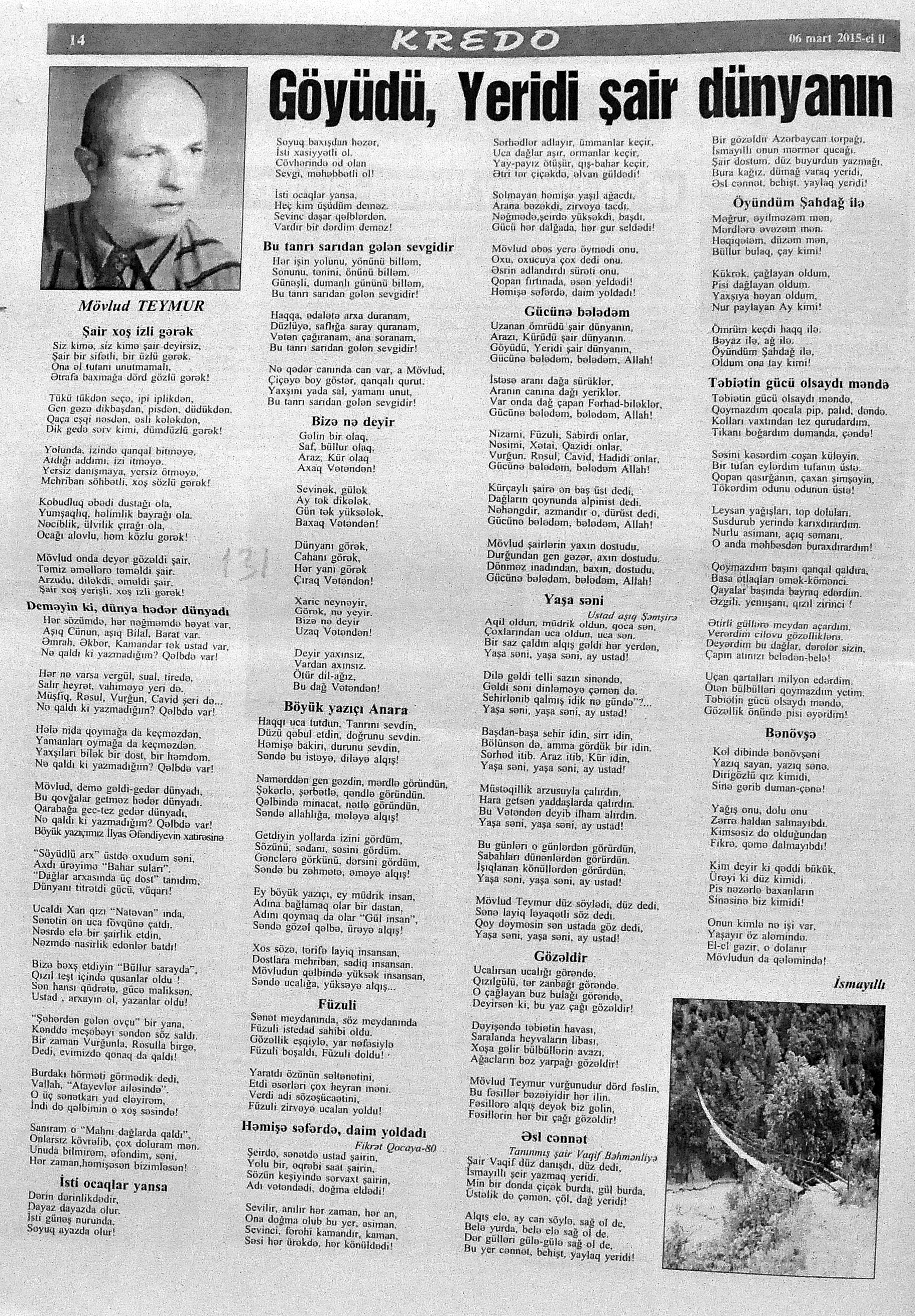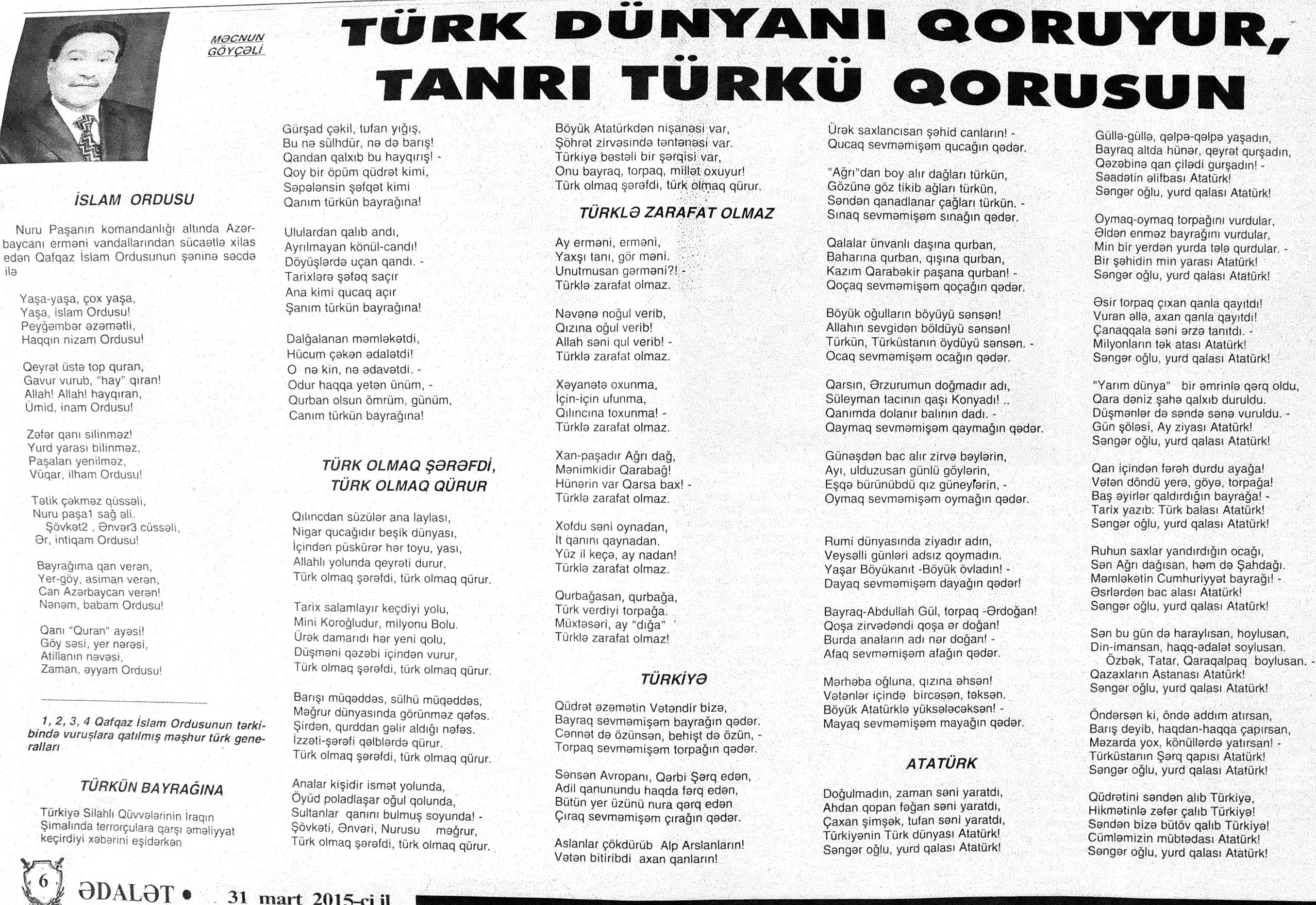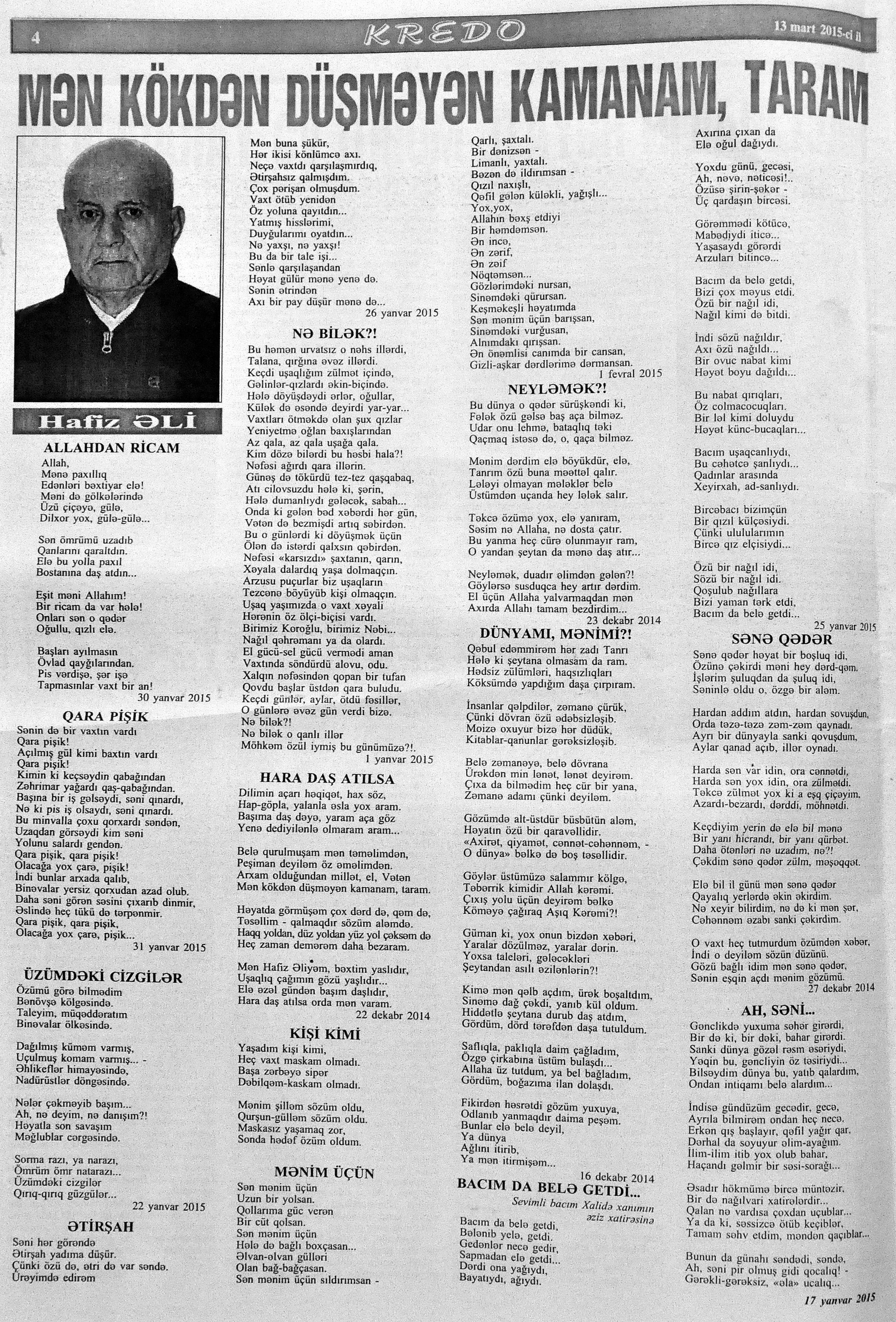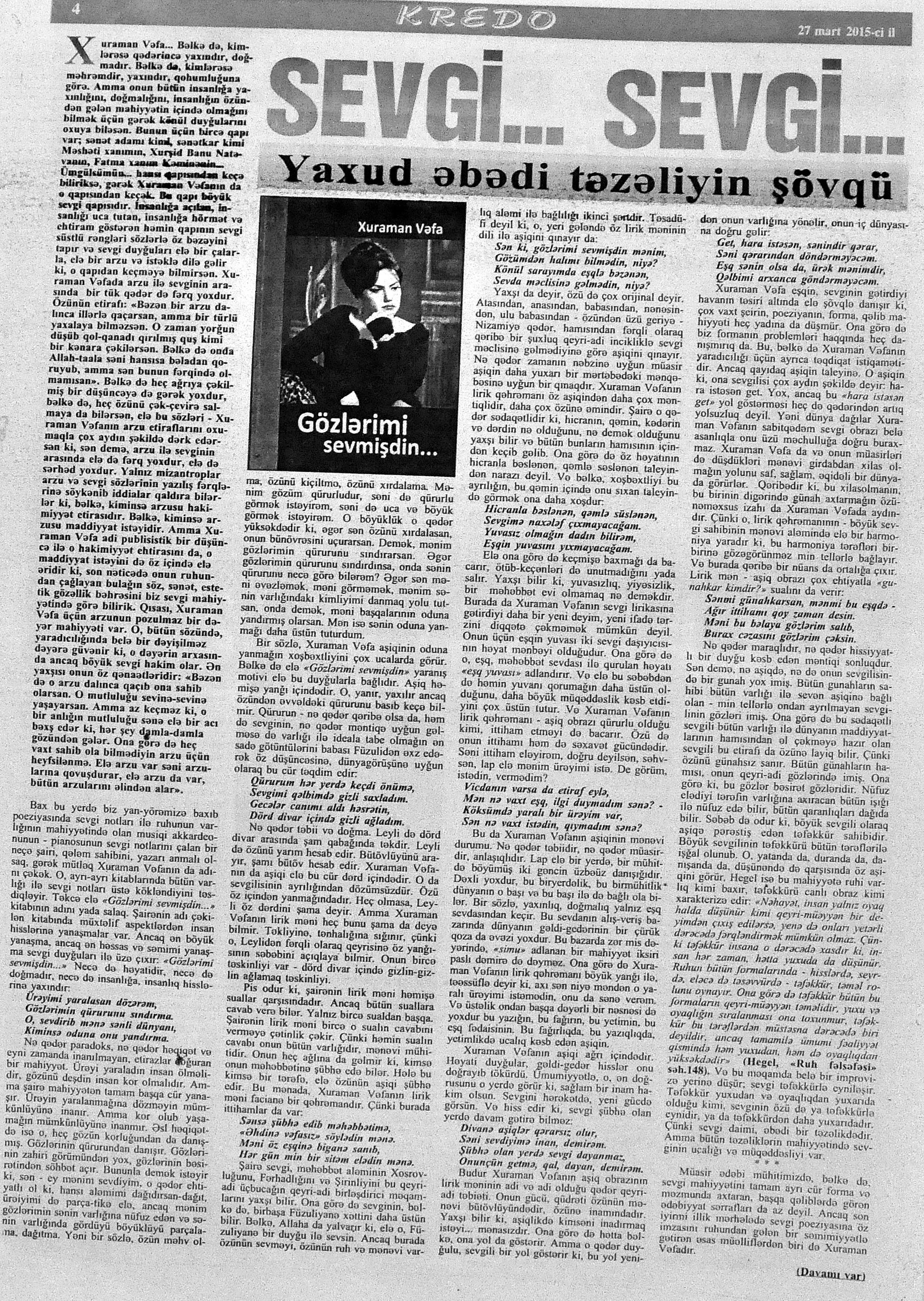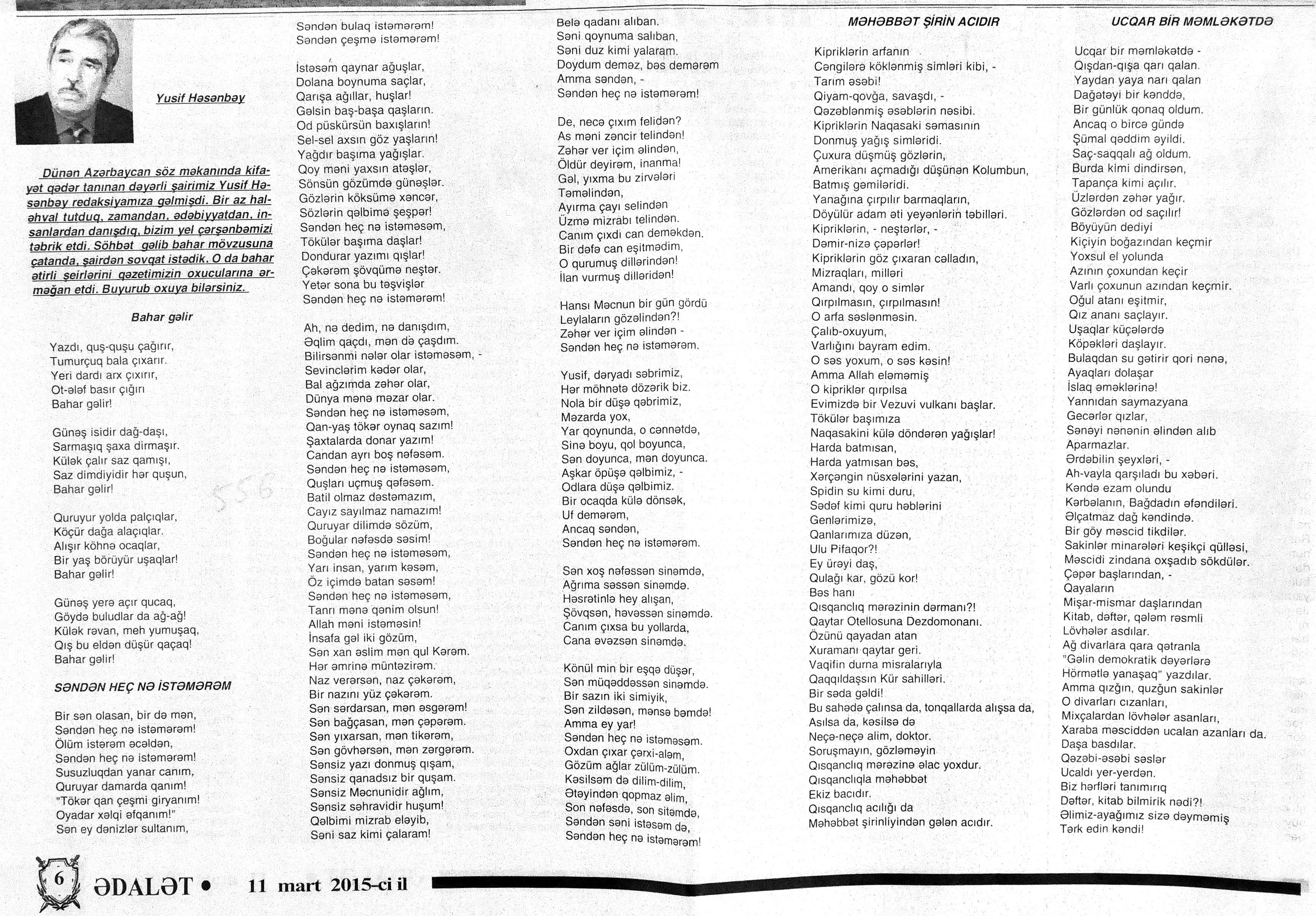 375. Sefiyev V. Mən səni sevirdim, bağışla məni!; Sevgi yuxusu //Azad Azərbaycan.- 2015.- 15 mart.- S.7. 376. Vəli, R. Çanaqqala //Türküstan.- 2015.- 29 mart-4 aprel.- S.15.