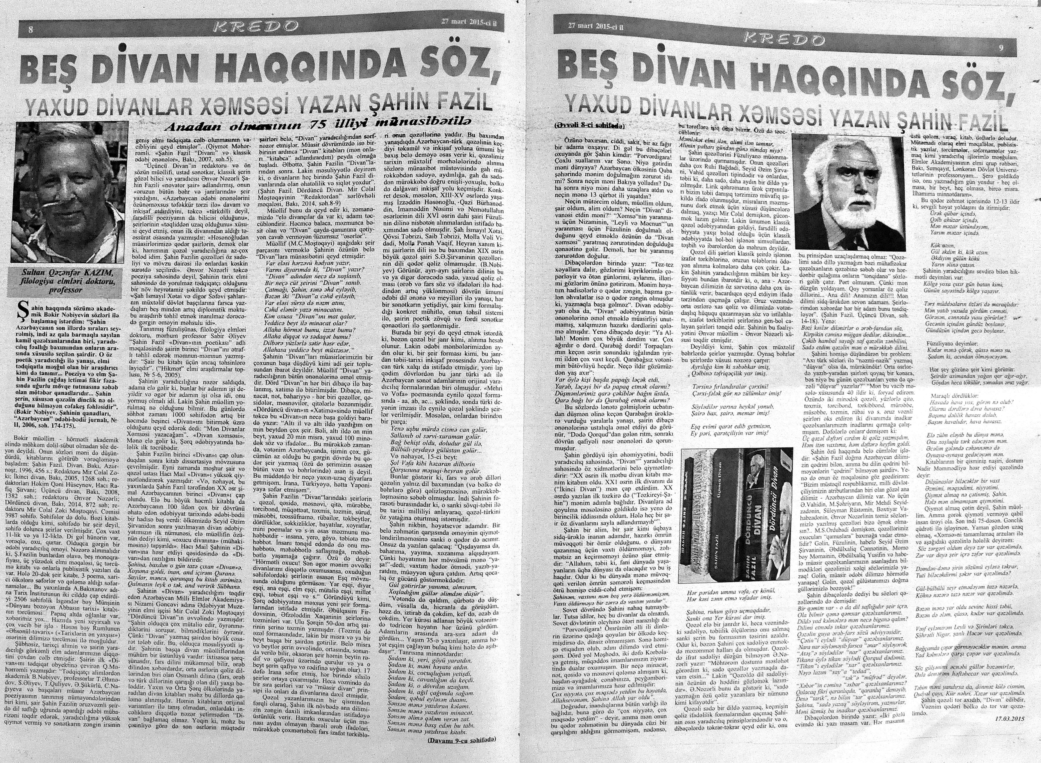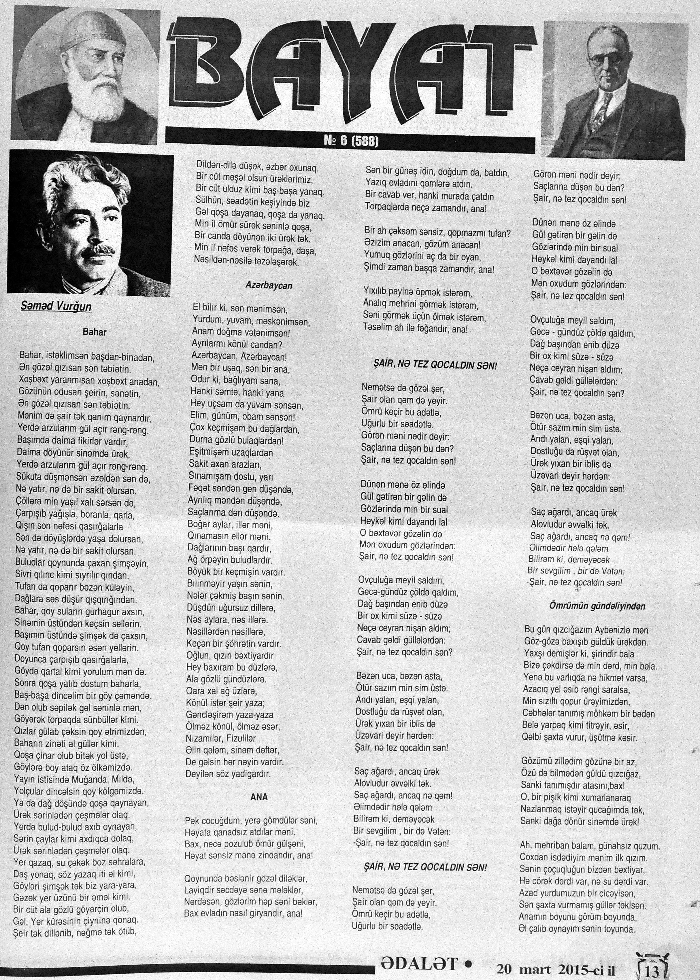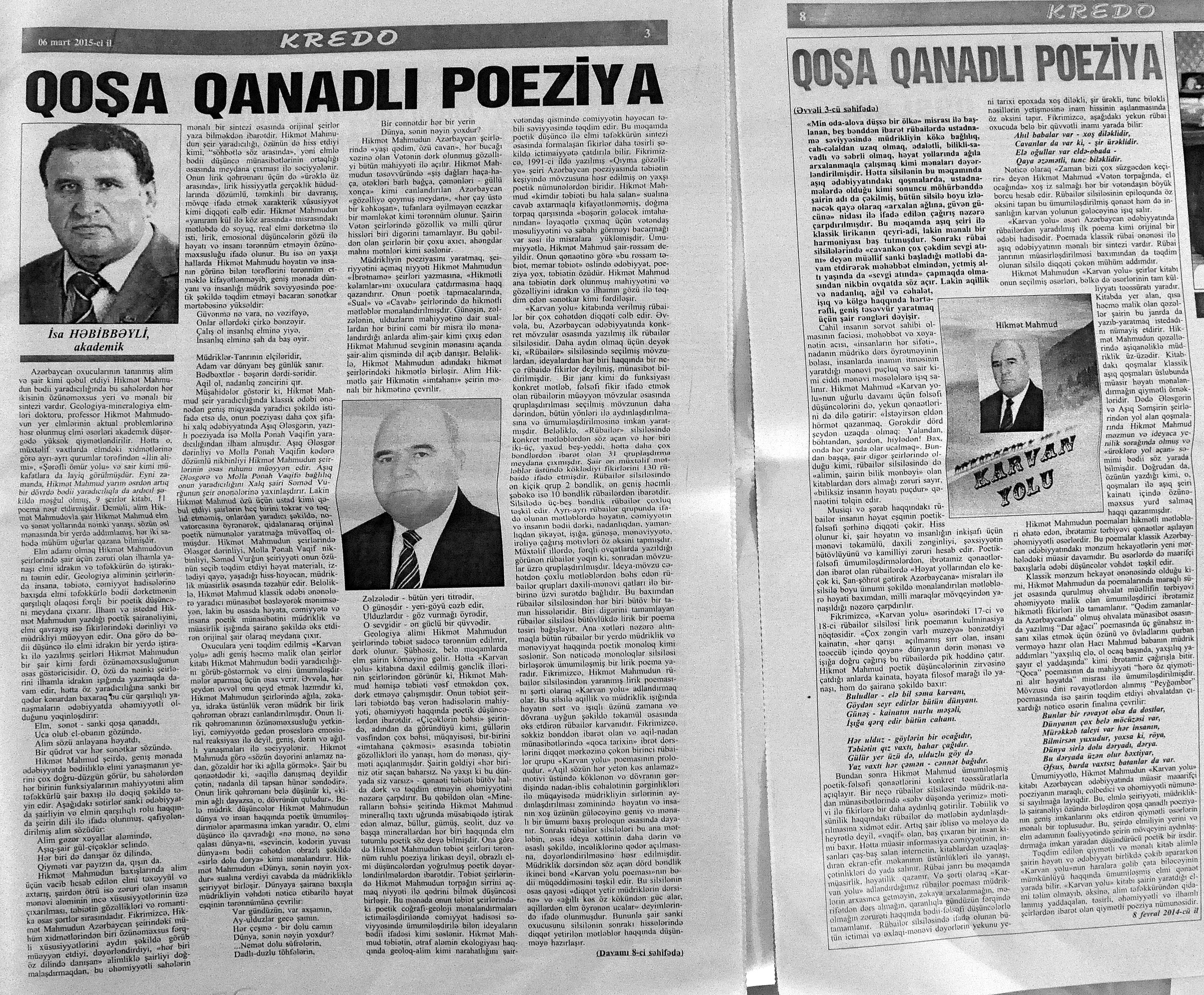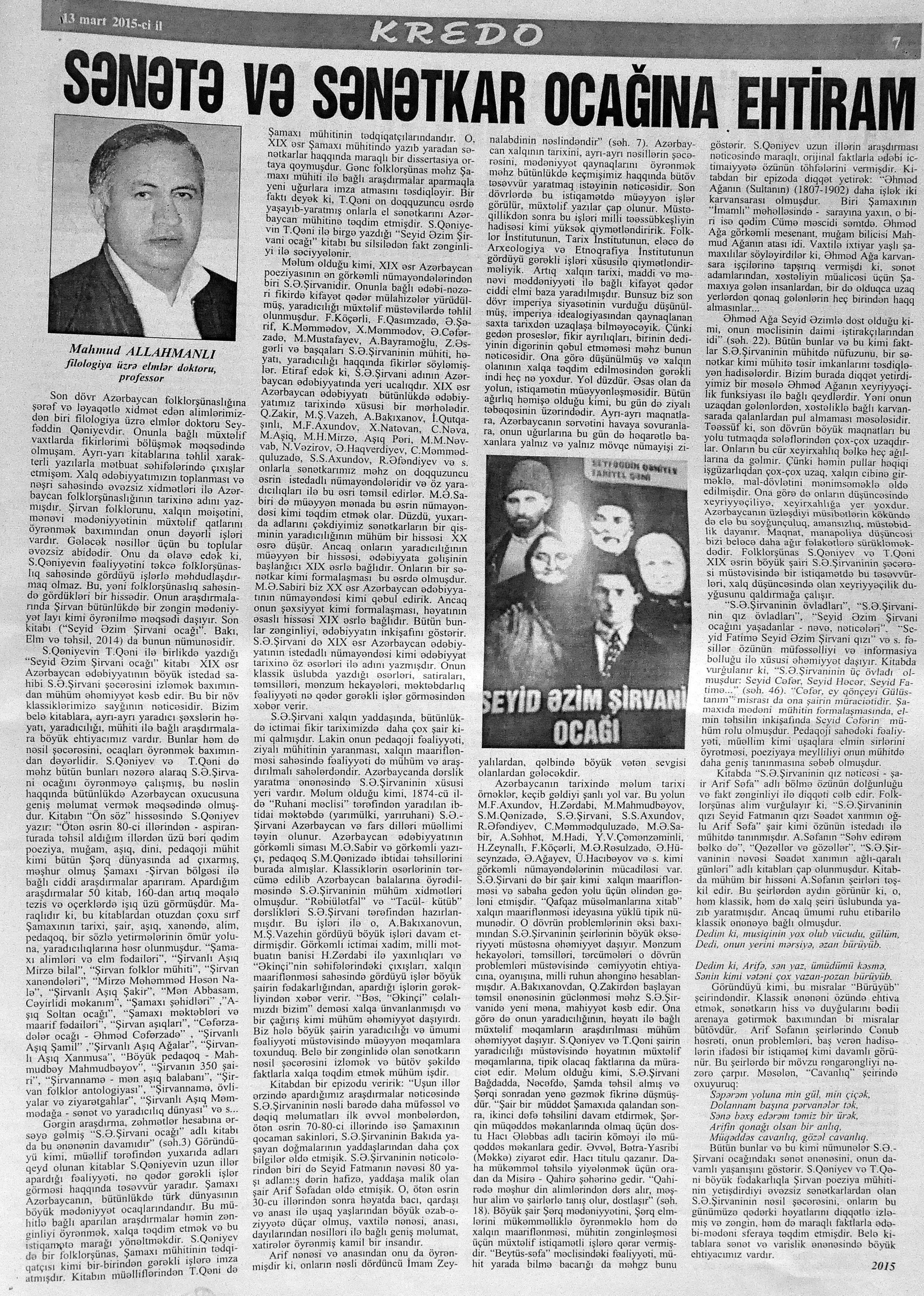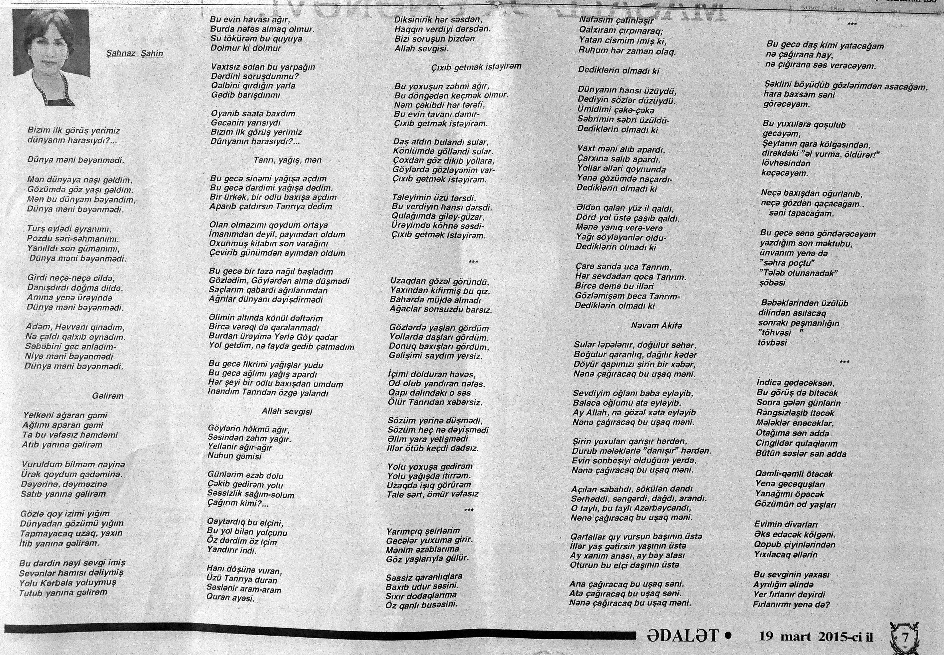 375. Sefiyev V. Mən səni sevirdim, bağışla məni!; Sevgi yuxusu //Azad Azərbaycan.- 2015.- 15 mart.- S.7. 376. Vəli, R. Çanaqqala //Türküstan.- 2015.- 29 mart-4 aprel.- S.15.