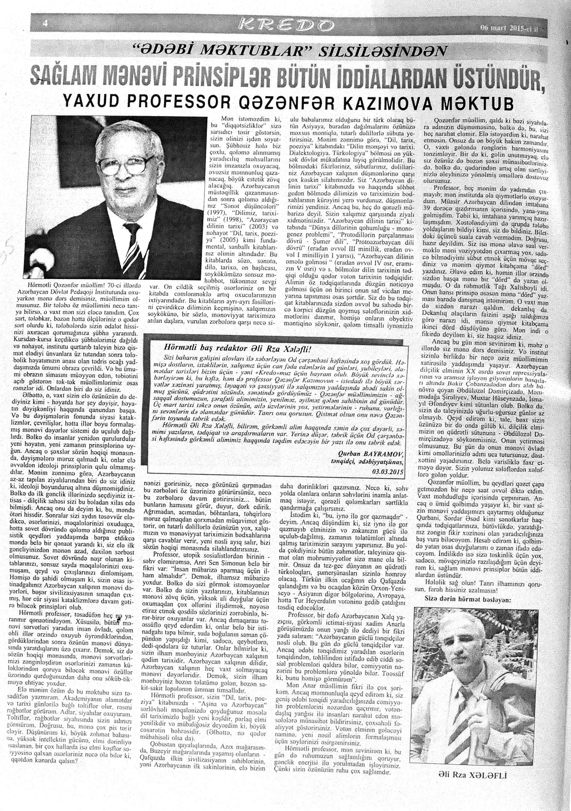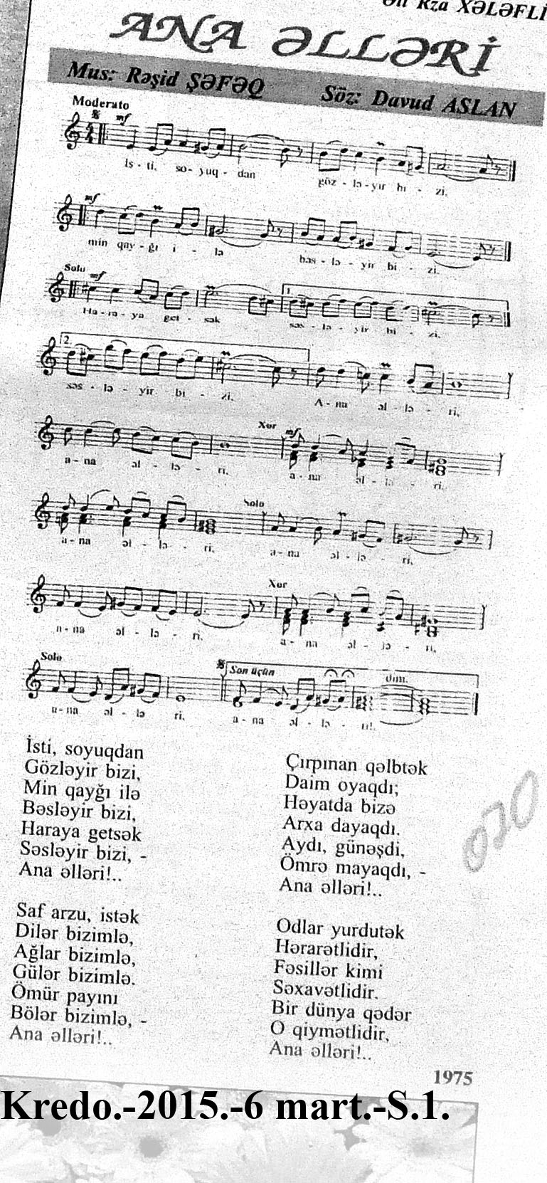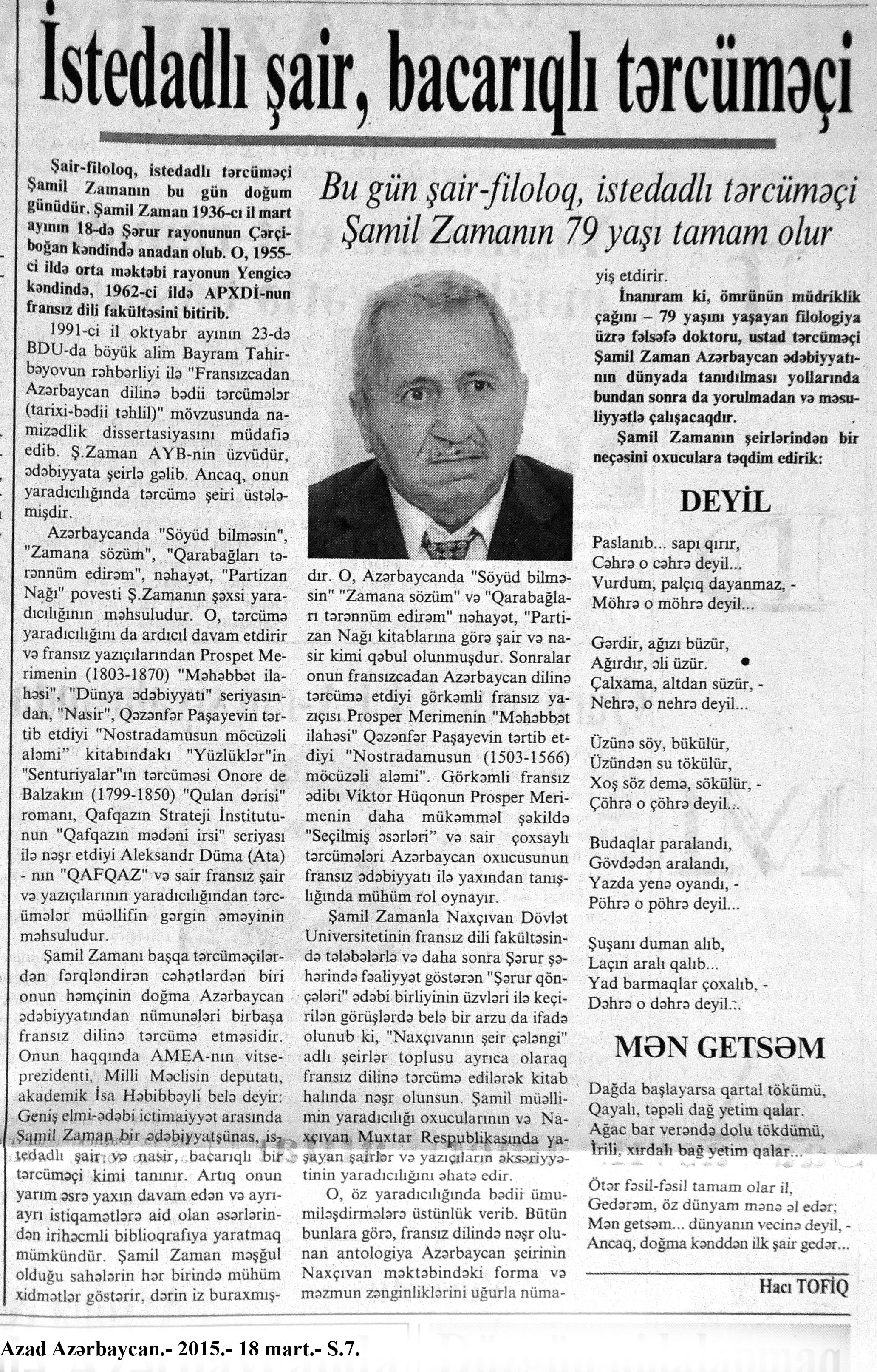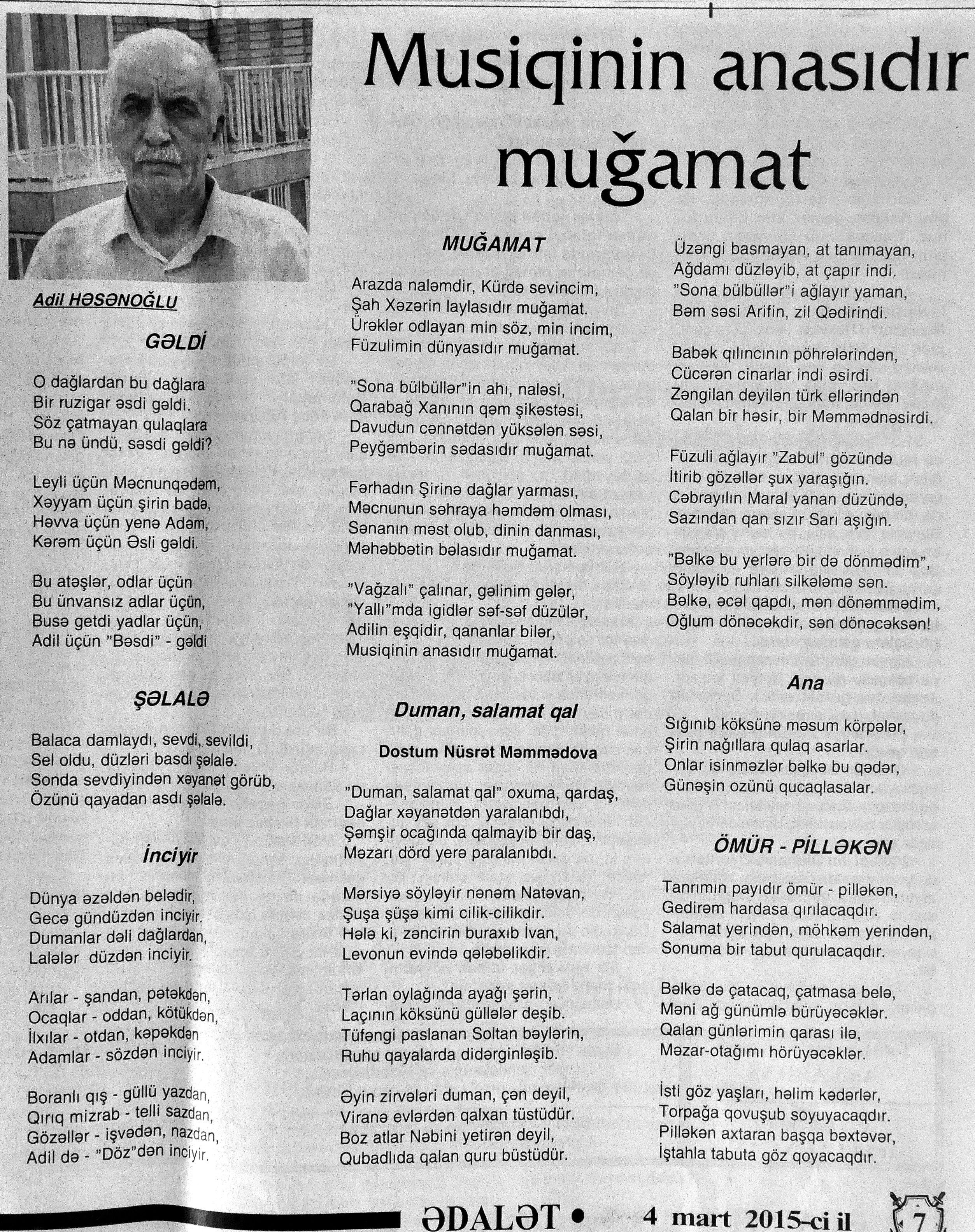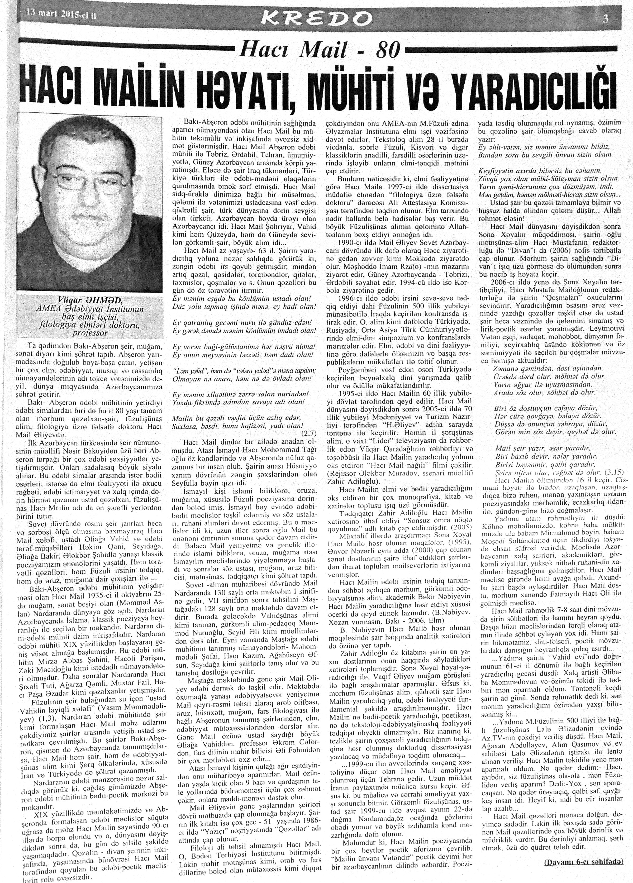 375. Sefiyev V. Mən səni sevirdim, bağışla məni!; Sevgi yuxusu //Azad Azərbaycan.- 2015.- 15 mart.- S.7. 376. Vəli, R. Çanaqqala //Türküstan.- 2015.- 29 mart-4 aprel.- S.15.