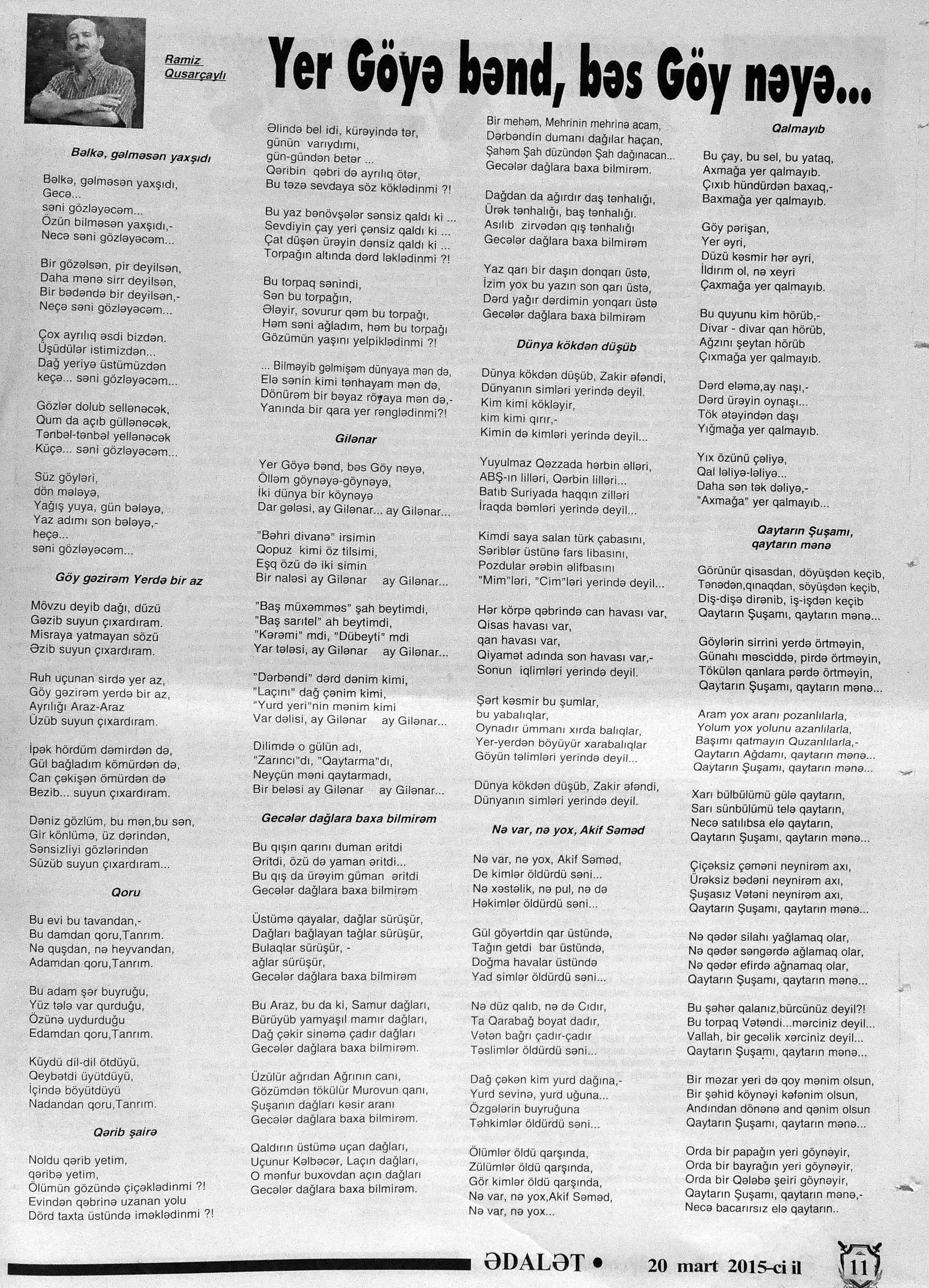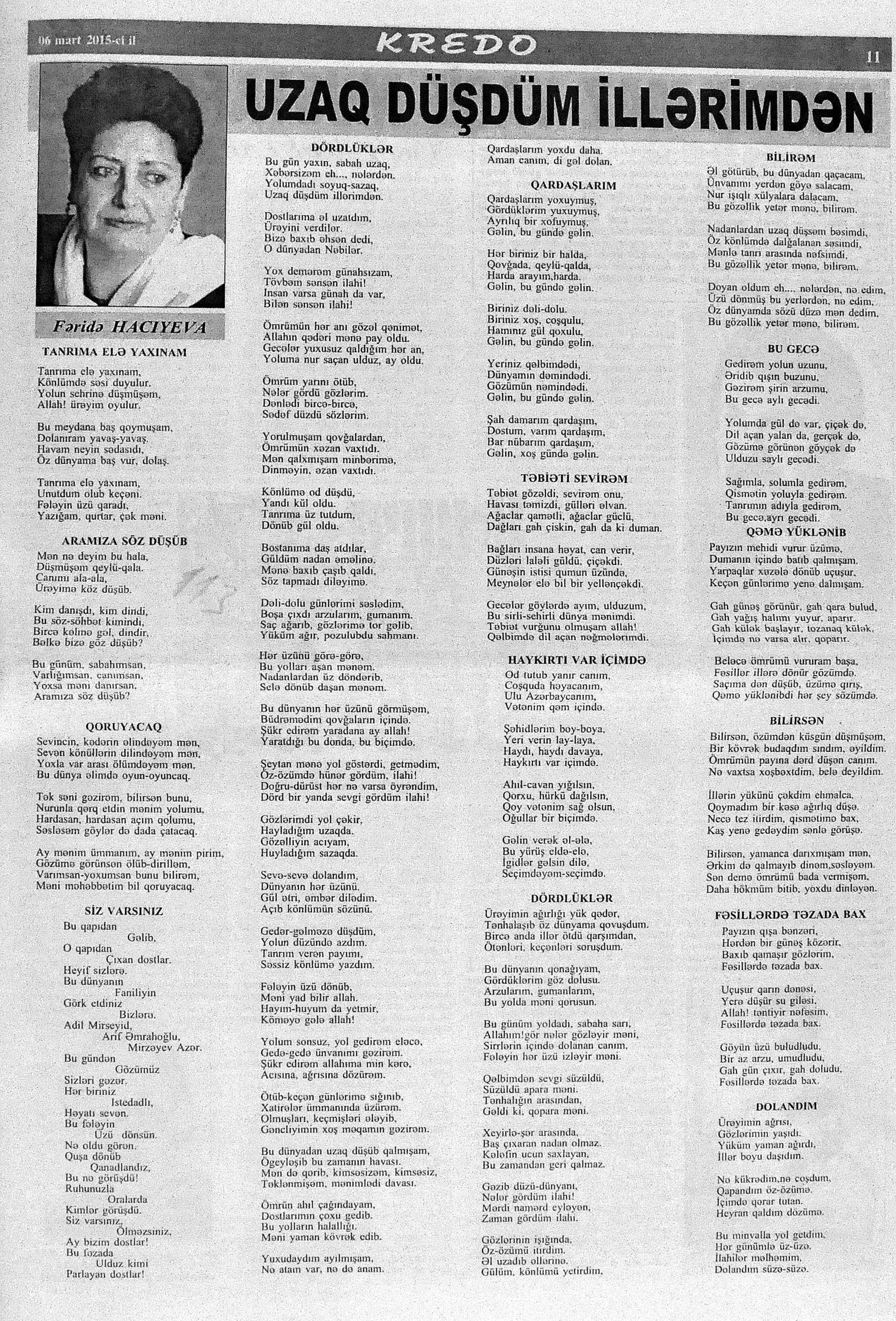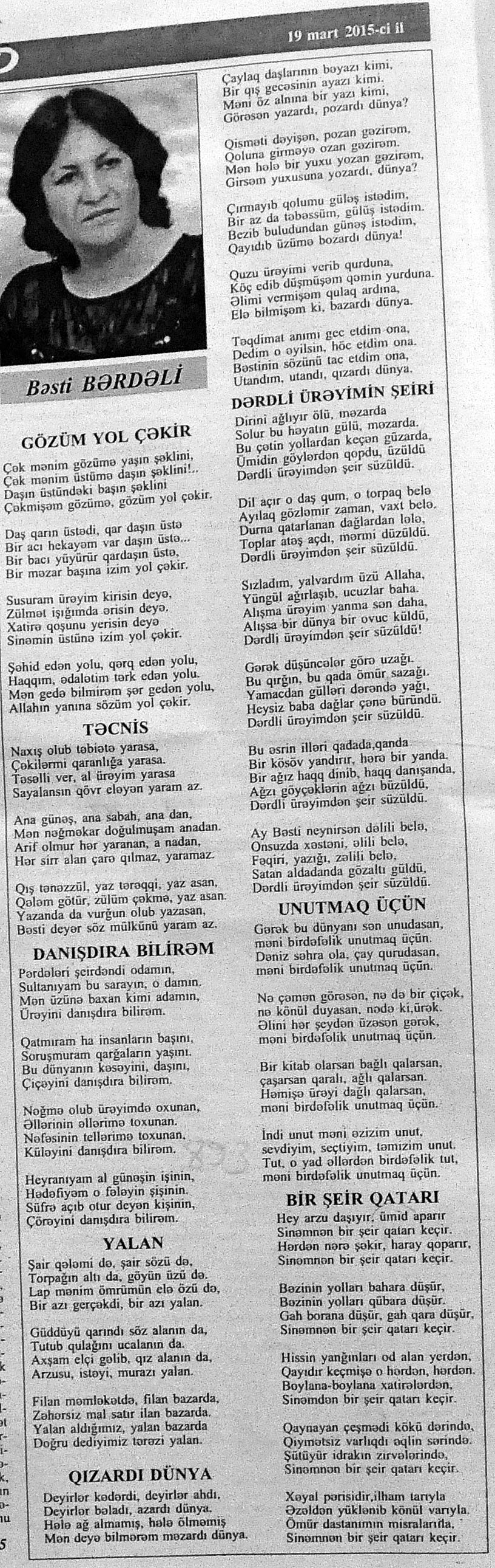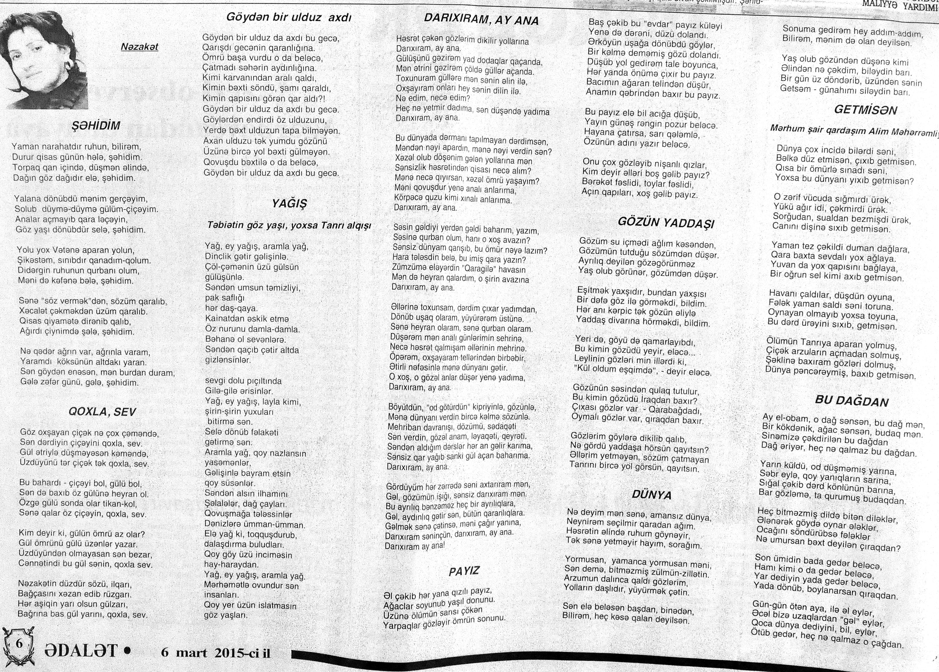 337. Ana əlləri: Mahnı: (Mus:Rəşid Şəfəq Söz:Davud Aslan) //Kredo.- 2015.- 6 mart.- S.1. 338. Aslanova, S. Bilirəm; Ata; Belə olaq //Azad Azərbaycan.- 2015.- 15 mart.- S.7. 339. Babanlı, V. Həyat eşqi: (İsa Muğannanın əziz xatirəsinə); Ata haqqı; İki səkkiz və s. //Ədəbiyyat qəzeti.- 2015.- 7 mart.- S.27. 340. Bərdəli, B. Gözüm yol çəkir; Təcnis; Danışdıra bilirəm; Yalan; //Kredo.- 2015.- 19 mart.- S.12. 341. Bəyim, N. Göydən düşsəydin yerə...; Hərdən şeir də susur...; Qanımın arasına girdim... //Ədəbiyyat qəzeti. - 2015.- 7 mart.- S.29. 342. Borçalı, E. Kaş...; Bəsdi; Nikbinlik və s. //Ədəbiyyat qəzeti.- 2015.- 14 mart.- S.23. 343. Cavad, Ə. Dörd çərşənbənin dördüncüsü //Azərbaycan.- 2015.- 17 mart.- S.6. 344. Çaylı, Ə. Çanaqqala savaşının yüz illik anımına //Respublika.- 2015.- 3 mart.- S.7. 345. Əhməd, R. Nikbinlik; Metamorfoz; Uşaqlar və s. //Ədəbiyyat qəzeti.- 2015.- 14 mart.- S.4. 346. Ələkbərli, M. Mənim könül dünyamda doğmaların yeri var, hər birinin istəyi, hər birinin şeiri var: Ad verənlər yanılmayıb; Adın ucalığı; Oqtay Rzaya 80 illiyi münasibətilə və s. //Kaspi.- 2015.- 14-16 mart.- S.19. 347. Əli, H. Mən kökdən düşməyən kamanam, taram: Allahdan ricam; Qara pişik; Üzümdəki cizgilər və s. //Kredo.- 2015.- 13 mart.- S.4. 348. Əziz, M. Vətən; Oldu; Meşəbəyi; Kəhkəşan yoludur yolu Tanrının //Kaspi.- 2015.- 14-16 mart.- S.20. 349. Faxralı, R. İşıq istəyirəm...:(fraqmentlər): Qızlarıma, nəvələrimə //525-ci qəzet.- 2015.- 5 mart.- S.7. 350. Fazil, Ş. Qəzəl; Qəzəl; Tənha qalmayıram tək qalanda da; Güllə yeri //Ədəbiyyat qəzeti.- 2015.- 14 mart.- S.25. 351. Fəhmi, İ. Əruz gəzişmələri: Bir az yüngül, bir az ağır...; ...bəlkə də tənbəllik....; Harda unutdum və s. //Ədəbiyyat qəzeti.- 2015.- 7 mart.- S.10. 352. Göyçəli, M. Türk dünyanı qoruyur, tanrı türkü qorusun: İslam ordusu; Türkün bayrağına; Türk olmaq şərəfdi, türk olmaq qürur və s. //Ədalət.- 2015.- 31 mart.- S.6. 353. Gün, N. Yol gedirəm; Boşluq; Quş, məkan, şair və vətənə dair aydın cavab //Ədəbiyyat qəzeti.- 2015.- 7 mart.- S.30. 354. Hacıyeva, F. Uzaq düşdüm illərimdən: Tanrıma elə yaxınam; Aramıza söz düşüb; Qoruyacaq və s. //Kredo.- 2015.- 6 mart.- S.11. 355. Həsənbəy, Y. Bahar gəlir; Səndən heç nə istəmirəm; Məhəbbət şirin acıdır; Ucqar bir məmləkətdə //Ədalət.- 2015.- 11 mart.- S.6. 356. Həsənoğlu, A. Musiqinin anasıdır muğamat: Gəldi; Şəlalə; İnciyir və s. //Ədalət.- 2015.- 4 mart.- S.7. 357. Xətai, Ş. İ. Qızılgül bagü büstanım... //Ədəbiyyat qəzeti.- 2015.- 14 mart.- S.1. 358. İlhami, İ. Cırcırama; Yarasa; Su və s. //Kaspi.- 2015.- 7-10 mart.- S.21. 359. Qaraxanov,Y. Mənimdir, Vətən //Səs.- 2015.- 20 mart.- S.12. 360. Qəşəmoğlu, Ə. Bu qəfil sevda; Mənə fikir vermə, dedin; Yaman yubandın //Ədəbiyyat qəzeti.- 2015.- 7 mart.- S.29. 361. Qurbanov, S. Gəldi; Göy üzü; “Gedək biz olmayan yerə” və s. //Ədəbiyyat qəzeti.- 2015.- 14 mart.- S.8. 362. Qusarçaylı, R. Yer göyə bənd, bəs Göy nəyə...: Bəlkə, gəlməsən yaxşıdı; Göy gəzirəm Yerdə bir az; Qoru və s. //Ədalət.- 2015.- 20 mart.- S.11. 363. Müslüm, F. Ölümə çəkdi; Ruhani çal, Ruhani; İncimə və s. //525-ci qəzet.- 2015.- 7 mart.- S.28. 364. Nəzakət. Şəhidim; Qoxla, sev; Göydən bir ulduz axdı və s. //Ədalət.- 2015.- 6 mart.- S.6. 365. Novruz, C. Sağlığında qiymət verin insanlara...; İnana bilmirəm; Mənim ölməz şeirlərim və s. //Ədalət.- 2015.- 12 mart.- S.6. 366. Rza, O. Qəlbi geniş, nurla dolu!: “Adlı, ünvanlı misralar” silsiləsindən //525-ci qəzet.- 2015.- 30 mart.- S.8. 367. Şahin, Ş. Bizim ilk görüş yerimiz...; Gəlirəm; Tanrı, yağış, mən və s. //Ədalət.- 2015.- 19 mart.- S.6. 368. Şəfi, Z. Sənsizlikdə ölənlər var...var: Səndən sonra həyat elə ömürdü...; Sən günəşi görməmisən-...; Su olub axmasa içinə sənin-... və s. //Ədəbiyyat qəzeti.- 2015.- 7 mart.- S.8. 369. Talıboğlu, Ə. Dağlar məni cagırır; Göz açdım; Ömür yaşadım və s. //Kaspi.- 2015.- 7-10 mart.- S.19. 370. Teymur, M. Göyüdü, Yeridi şair dünyanın: Şair xoş izli gərək; Deməyin ki, dünya hədər dünyadı; Bu tanrı sarıdan gələn sevgidir və s. //Kredo.- 2015.- 6 mart.- S.14. 371. Teyyub, F. ...İşimin nə adı, nə maaşı var: Ümid paylayaram adamlara mən: Xalq yazıçısı Anara; Söz; Ağaclar üşüyür //525-ci qəzet.- 2015.- 14 mart.- S.29. 372. Təmkin, R. Gəlin qayası; Bir uşaq qaçır; Azərbaycan tanıyıram //Kaspi.- 2015.- 14-16 mart. S.19. 373. Vurğun, S. Bahar; Azərbaycan; Ana və s. //Ədalət.- 2015.- 20 mart.- S.13. 374. Yusifoğlu, R. Cavab istəmirəm sevgimə səndən; Üç daş; Ürəkdə bitən ağac və s. //Kaspi.- 2015.- 7-10 mart.- S.20.