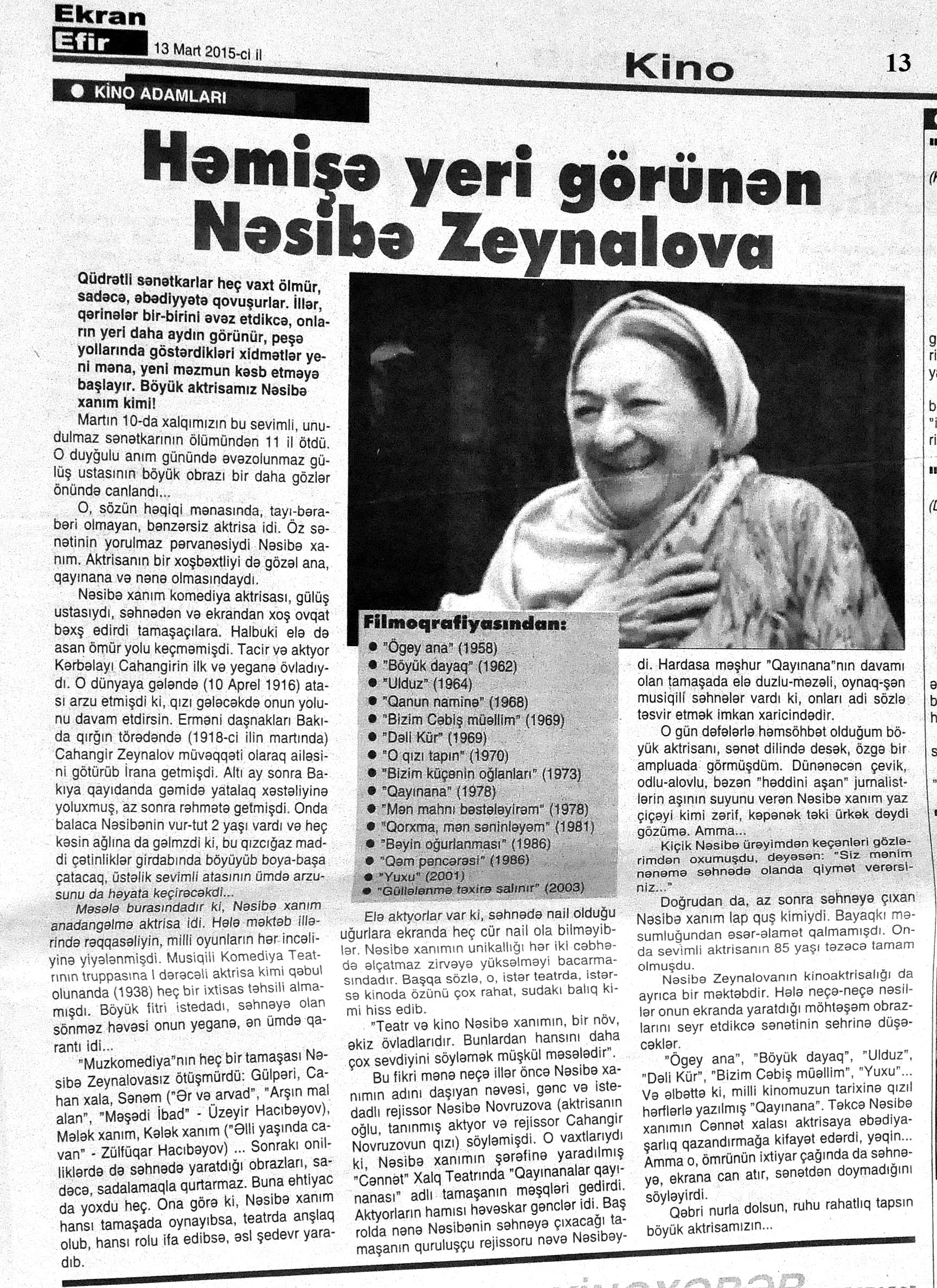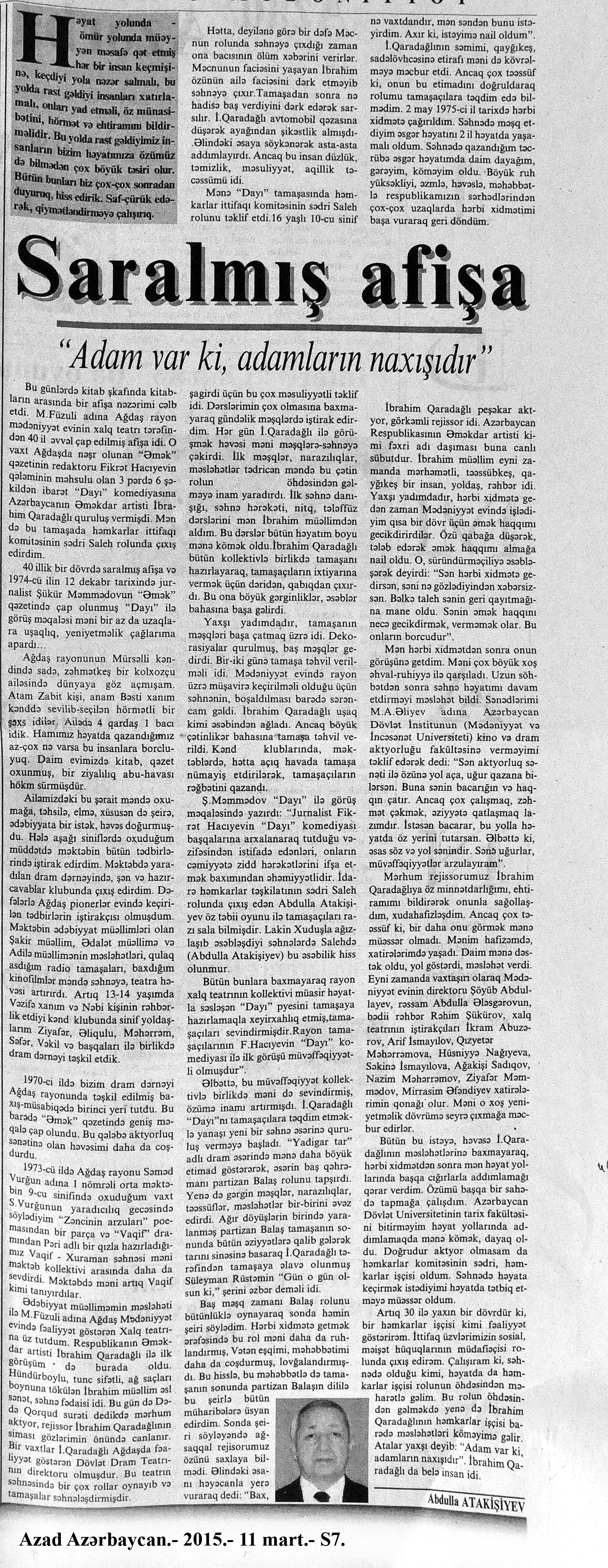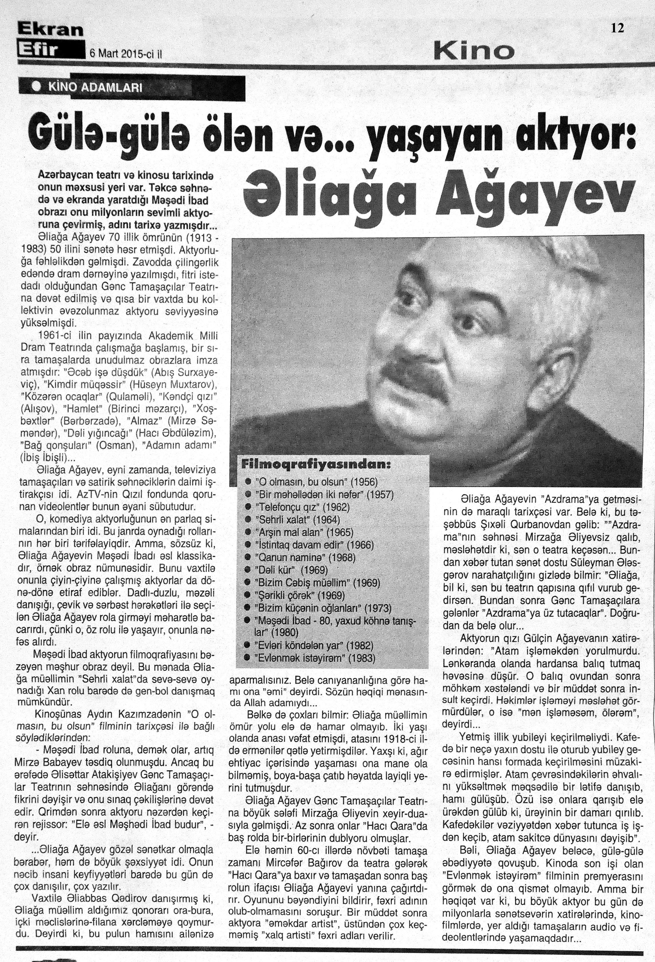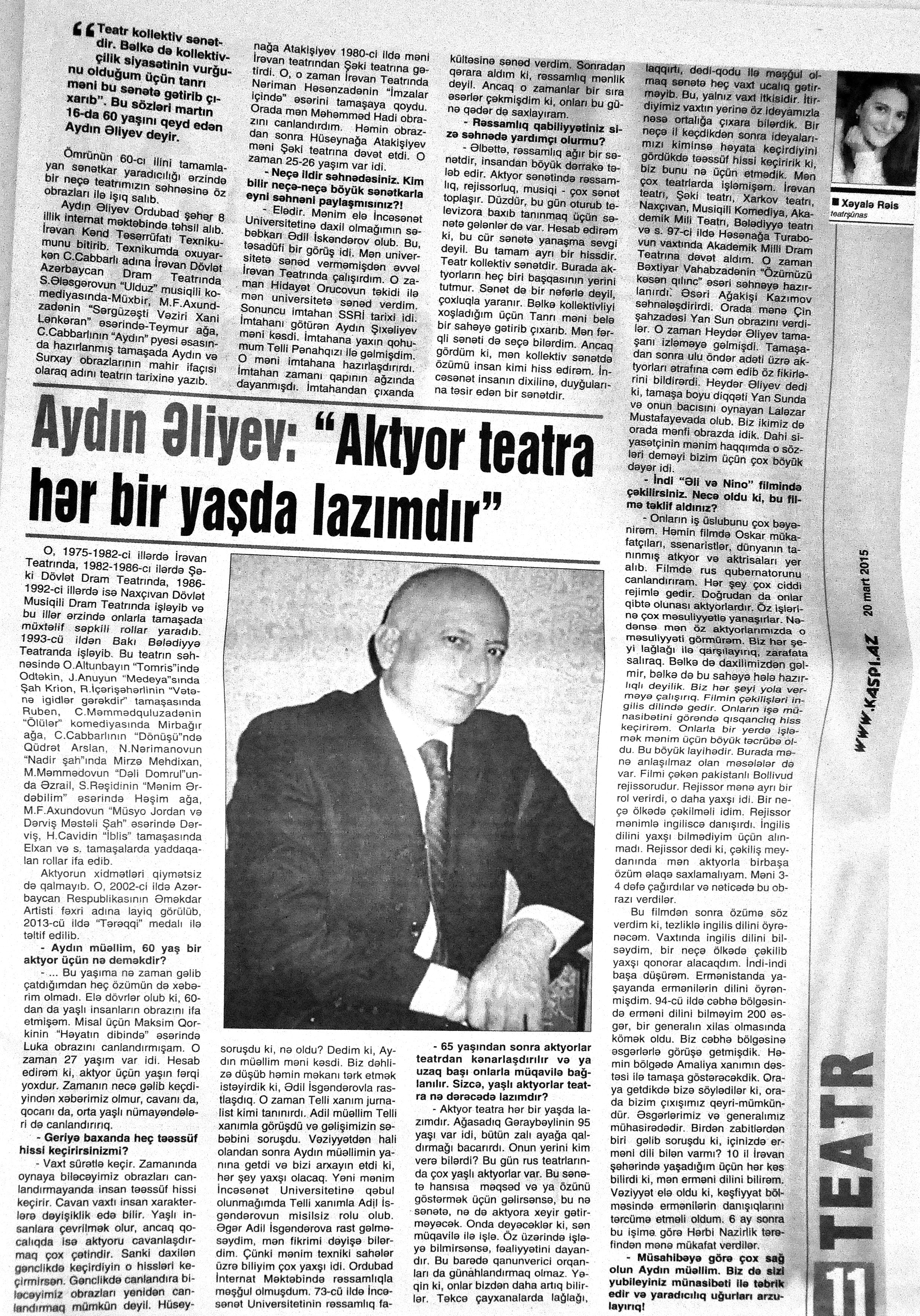 296. “Baladadaşın toy hamamı”nın səhnə tərtibatı müzakirə edilib: [Azərbaycan Dövlət Musiqili Teatrında Xalq artisti Cənnət Səlimovanın hazırladığı tamaşa haqqında] //Mədəniyyət.- 2015.- 6 mart.- S.5. 297. Dadaşov, E. “Özümü Musiqili Komediya Teatrında tapdım”: Elməddin Dadaşov: “Yuğ” “ata ocağım”, Musiqili Komediya isə “ana ocağım”dır: [rejissor və aktyorla müsahibə] /müsahibəni apardı Xədicə Qiyas //Ekspress.- 2015.- 14-16 mart S.21. 298. Əlili, G. “Sevgidən ölməyə söz vermirəm”: [aktrisa Gültac Əlili ilə müsahibə]/müsahibəni apardı Etibar Cəbrayıloğlu //Ədalət.- 2015.- 7 mart.- S.15. 299. Gülə-gülə ölən və... yaşayan aktyor: Əliağa Ağayev //Ekran-efir.- 2015.- 6 mart.- S.12. 300. İsaq, İ. Güldüyü yerdə ürəyi dayanan böyük sənətkar: Komik obrazları ilə tamaşaçı sevgisi qazanmış mərhum aktyor Əliağa Ağayevin həyatından – İradə İsaq yazır //Həftə içi.- 2015.- 17 mart.- S.6. 301. İsaq, İ. Lütfəli Abdullayevin film kimi həyatı – İradə İsaq yazır //Həftə içi.- 2015.- 11 mart.- S.6. 302. Həmişə yeri görünən Nəsibə Zeynalova //Ekran-efir.- 2015.- 13 mart.- S.13.