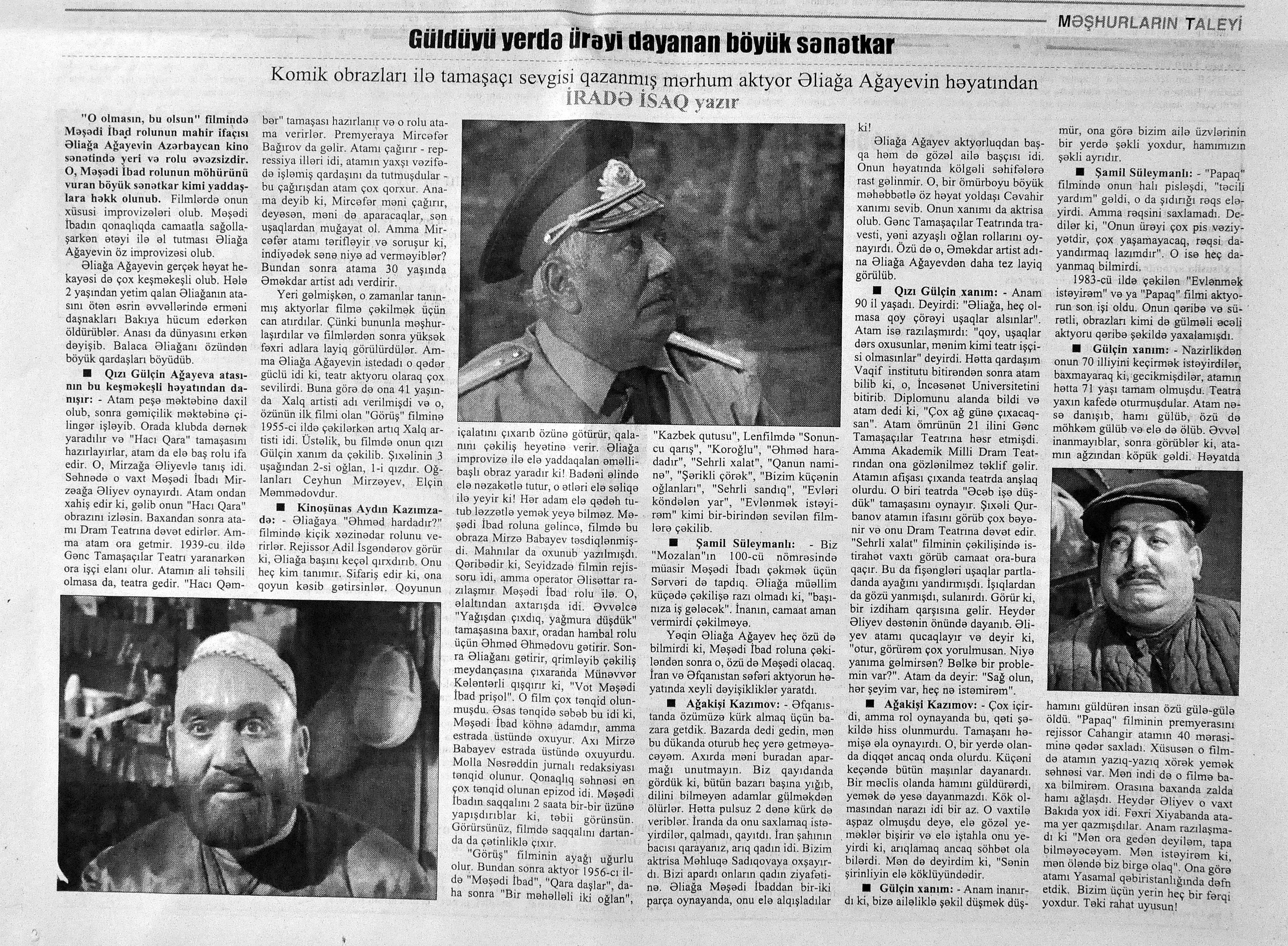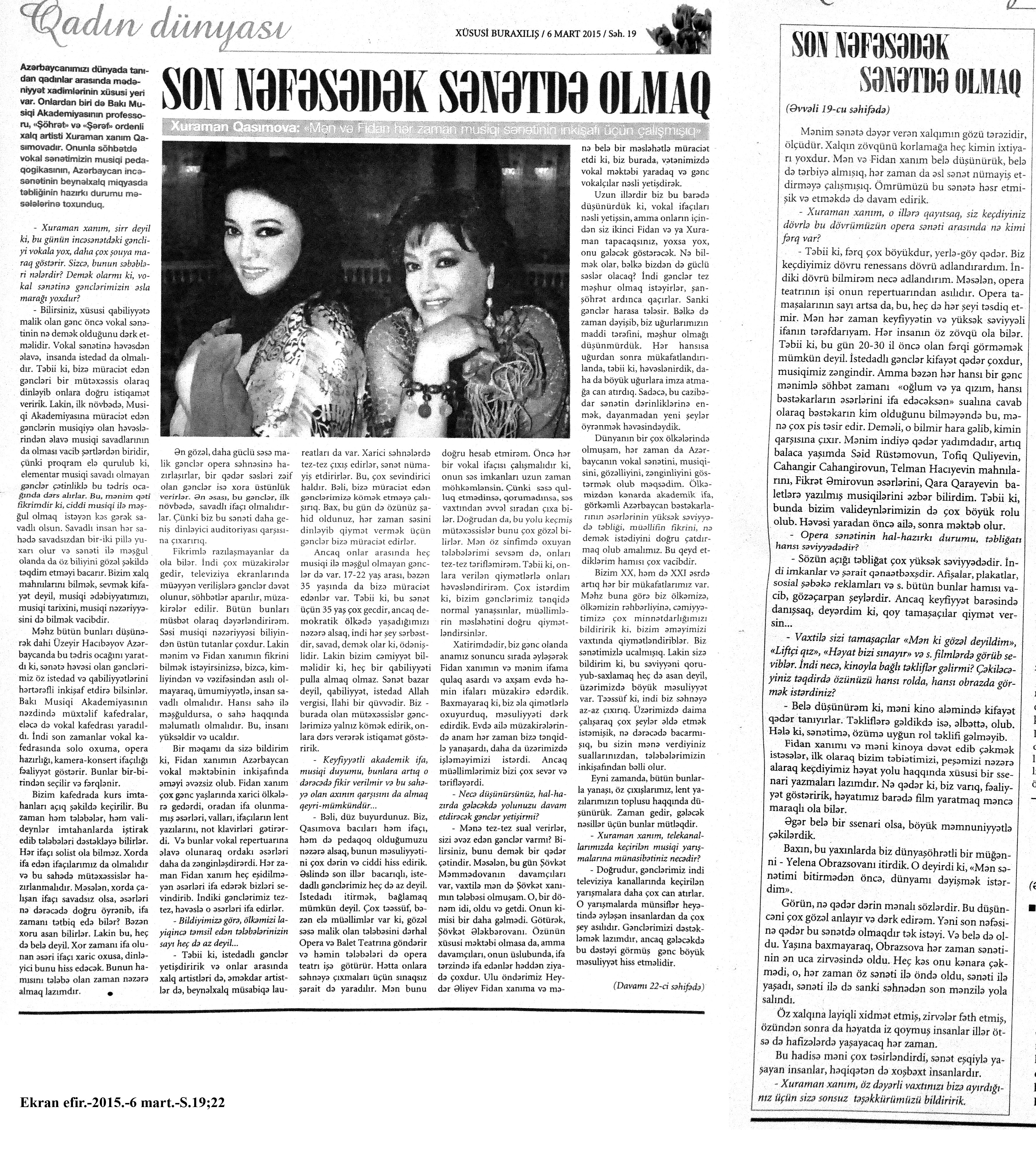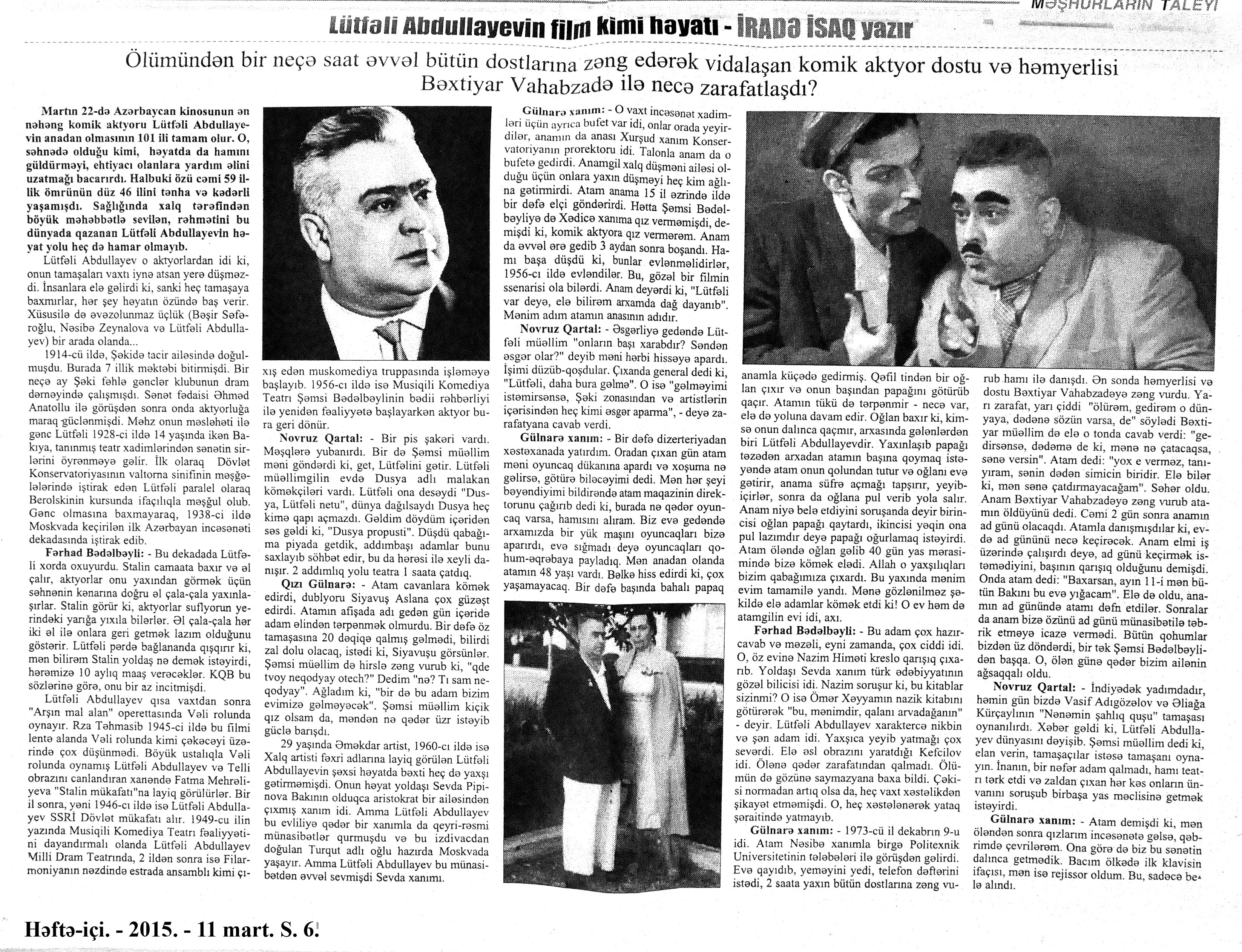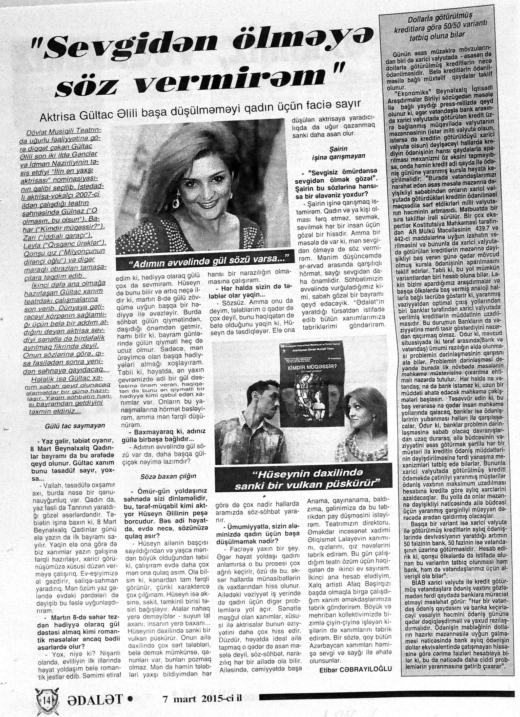296. “Baladadaşın toy hamamı”nın səhnə tərtibatı müzakirə edilib: [Azərbaycan Dövlət Musiqili Teatrında Xalq artisti Cənnət Səlimovanın hazırladığı tamaşa haqqında] //Mədəniyyət.- 2015.- 6 mart.- S.5. 297. Dadaşov, E. “Özümü Musiqili Komediya Teatrında tapdım”: Elməddin Dadaşov: “Yuğ” “ata ocağım”, Musiqili Komediya isə “ana ocağım”dır: [rejissor və aktyorla müsahibə] /müsahibəni apardı Xədicə Qiyas //Ekspress.- 2015.- 14-16 mart S.21. 298. Əlili, G. “Sevgidən ölməyə söz vermirəm”: [aktrisa Gültac Əlili ilə müsahibə]/müsahibəni apardı Etibar Cəbrayıloğlu //Ədalət.- 2015.- 7 mart.- S.15. 299. Gülə-gülə ölən və... yaşayan aktyor: Əliağa Ağayev //Ekran-efir.- 2015.- 6 mart.- S.12. 300. İsaq, İ. Güldüyü yerdə ürəyi dayanan böyük sənətkar: Komik obrazları ilə tamaşaçı sevgisi qazanmış mərhum aktyor Əliağa Ağayevin həyatından – İradə İsaq yazır //Həftə içi.- 2015.- 17 mart.- S.6. 301. İsaq, İ. Lütfəli Abdullayevin film kimi həyatı – İradə İsaq yazır //Həftə içi.- 2015.- 11 mart.- S.6. 302. Həmişə yeri görünən Nəsibə Zeynalova //Ekran-efir.- 2015.- 13 mart.- S.13.