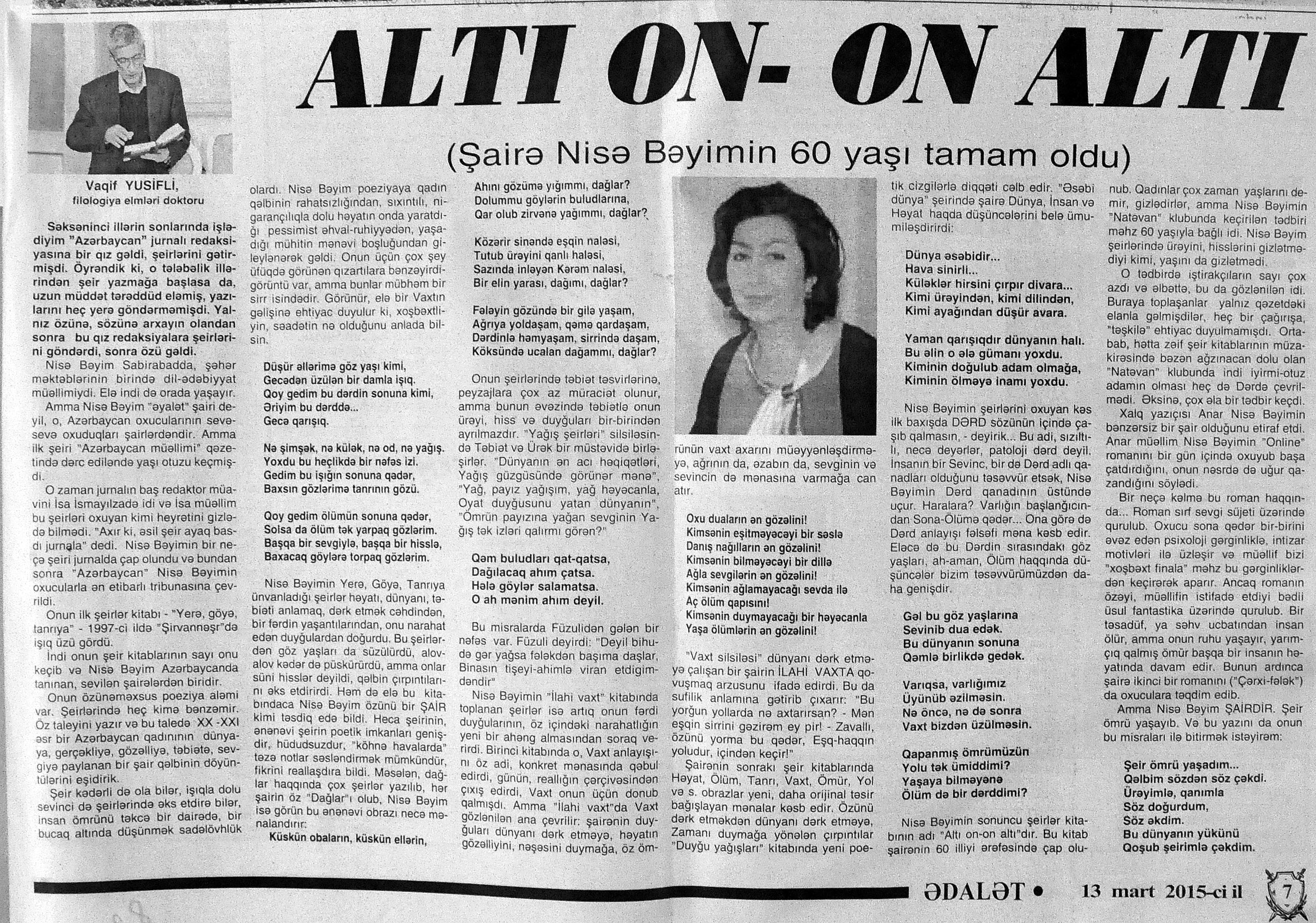 15. “Ana müqəddəsdir, ana əzizdir”: Pirallahı rayonundakı 14 saylı Musiqi məktəbinin bayram konserti //Mədəniyyət.- 2015.- 11 mart.- S.6. 16. Azərbaycan qadınları ölkəmizin ictimai-siyasi, mədəni həyatında mühüm rol oynayırlar: [Ailə, Qadın və Uşaq Problemləri üzrə Dövlət Komitəsinin tədbiri haqqında] //Azərbaycan.- 2015.- 7 mart.- S.5. 17. Azəri, L. “Cənnət lövhələri”: Gənc bəstəkar Arzu Abbasovanın xanımlara bayram töhfəsi //Mədəniyyət.- 2015.- 6 mart.- S. 4. 18. Azəri, L. Xanımlara sənət və musiqi hədiyyəsi: Muzey Mərkəzində “Gözəllik nuru” layihəsinin növbəti təqdimatı: [tədbirdə Əbülfəs Qarayevin çıxışı haqqında] //Mədəniyyət.- 2015.- 6 mart.- S.2. 19. Beynəlxalq Qadınlar Günü münasibətilə xeyriyyə sərgisi: [Gəncliyə Yardım Fondunun təşkilatçılığı ilə “Azərbaycan və Türkiyə xanımlarının əl işləri” adlı xeyriyyə sərgisinin təşkil edilməsi haqqında] //Mədəniyyət.- 2015.- 11 mart.- S.11. 20. Əzizova, D. Qaxda qadınlar bayramına həsr olunmuş mərasim //Mədəniyyət.- 2015.- 11 mart.- S.12. 21. Gözəlliyin bayramı: [Bərdə Şəhər 2 saylı Kitabxana filialında “Qadın gözəllikdir” adlı ədəbi-bədii kompozisiyanın təşkil edilməsi haqqında] //Mədəniyyət.- 2015.- 11 mart.- S.12. 22. Hüseynov, F. “Gözəlliyin tükənməz çalarları”: [Azərbaycan Milli İncəsənət Muzeyində konsert-sərginin keçirilməsi haqqında] //Mədəniyyət.- 2015.- 6 mart.- S.2. 23. Rəis, X. Türkiyəli müğənnidən Azərbaycan xanımlarına 8 Mart hədiyyəsi: Oya Ergünün Rəşid Behbudovun 100 illik yubileyi ərəfəsinə düşən konserti anşlaqla keçdi: [Beynəlxalq Mətbuat Mərkəzində “Sevgilim” adlı diskin təqdimat mərasimi haqqında] //Kaspi.- 2015.- 7-10 mart.- S.8.