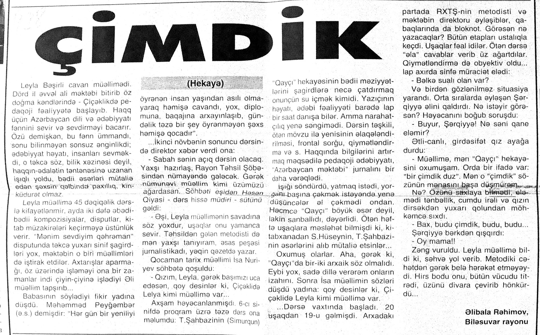 552. Али Т. Государственная детская филармония вновь порадовала своих зрителей: В Театре песни им. Р.Бейбудова прошла дебютная постановка «Джыртдан» Детской театральной студии при Филармонии //Эхо.-2015.- 20 марта. - С.10. 553. Гашимова, З. Раскрывая талант: Заида Гашимова: Ребенок не должен стать тем, кем хотели бы вы его видеть: [беседа с директором Детского Художественного Центра в РИКЦ] /провела В.Третьякова //Каспiй.- 2015.- 5 марта. - С.13.