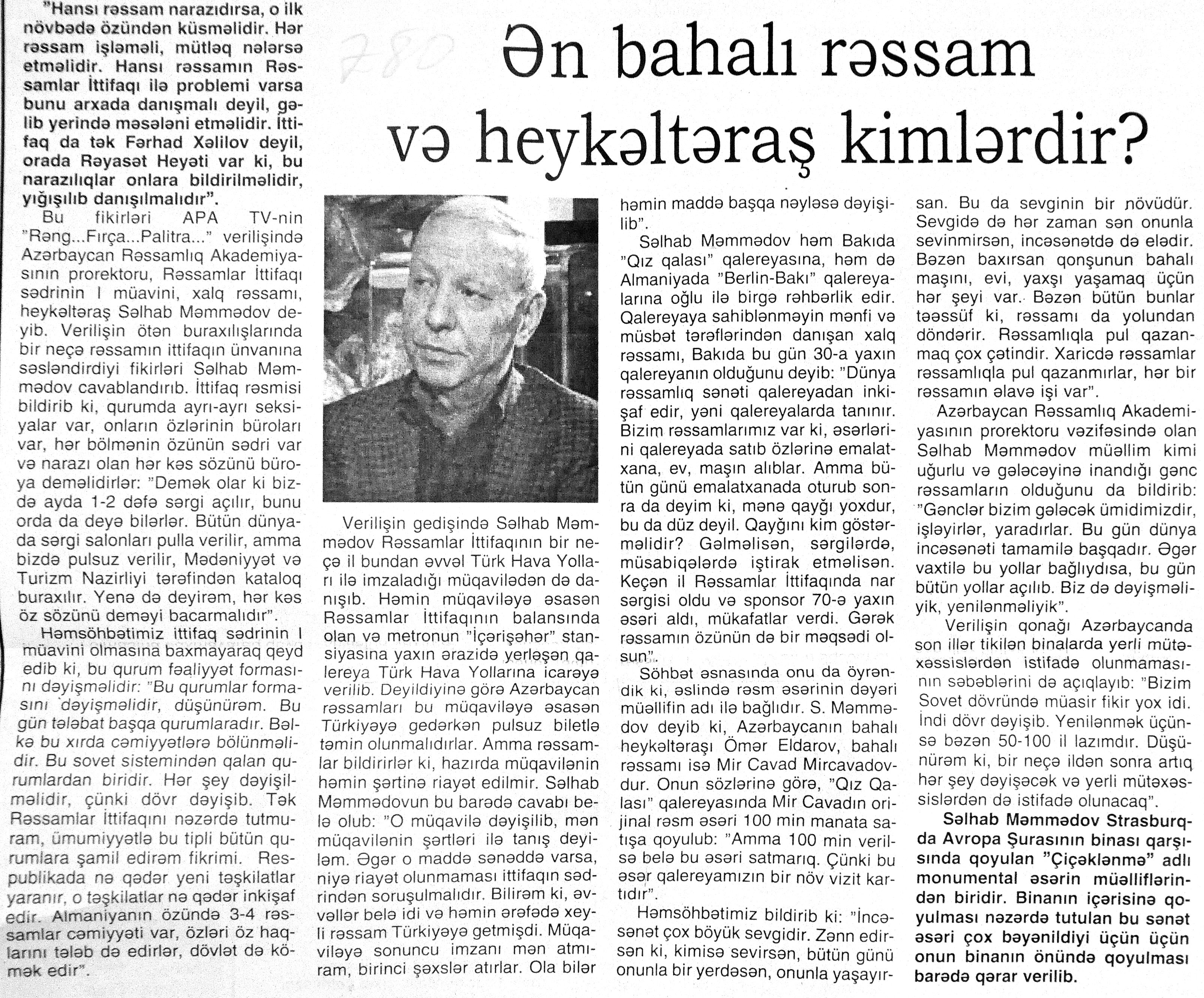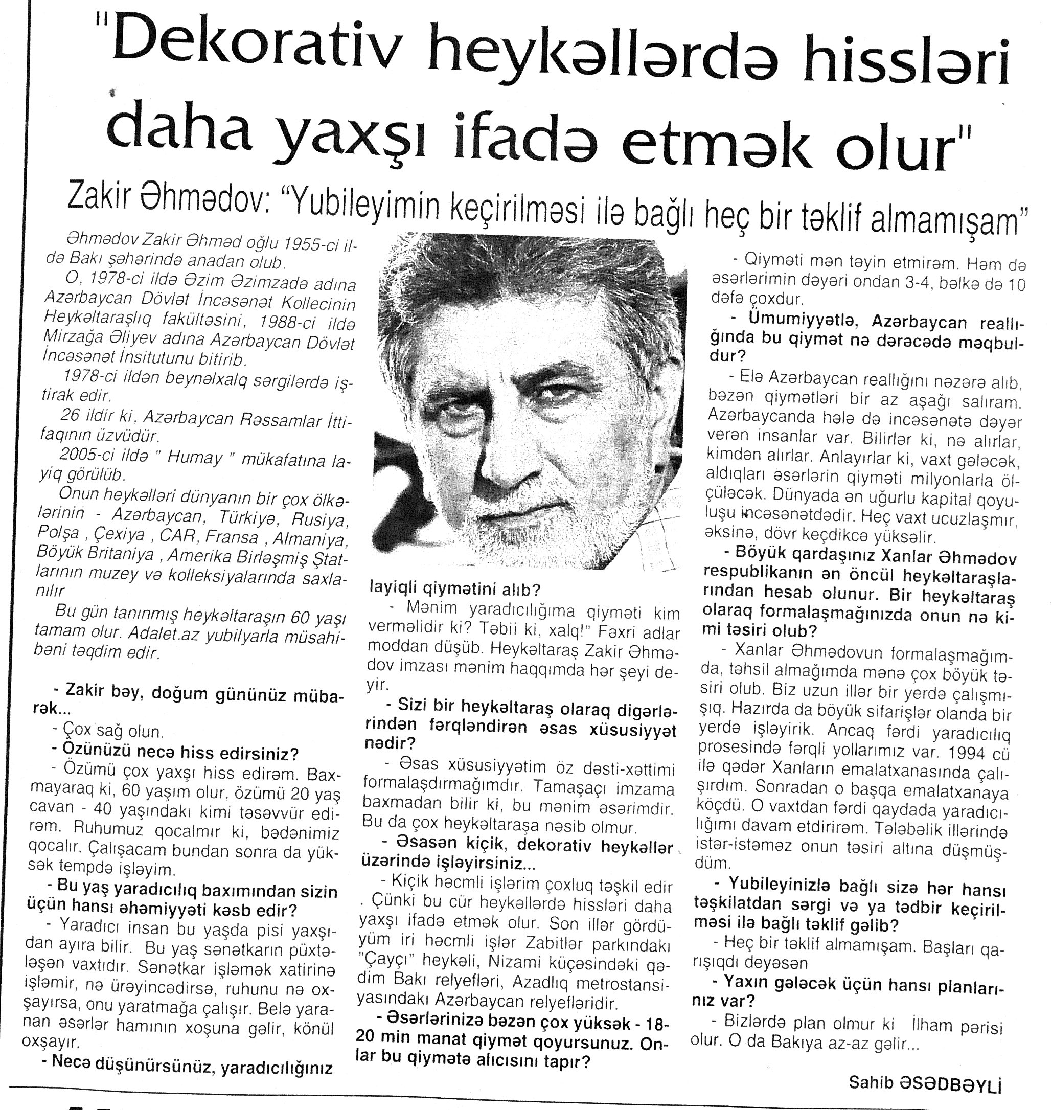 142. Əhmədov, Z. “Dekorativ heykəllərdə hissləri daha yaxşı ifadə etmək olur”: [rəssam, heykəltəraş Zakir Əhmədovla müsahibə]/müsahibəni apardı Sahib Əsədbəyli //Ədalət.- 2015.- 31 mart.- S.6. 143. Ən bahalı rəssam və heykəltəraş kimlərdir?: [Xalq rəssamı, heykəltəraş Səlhab Məmmədov haqqında] //Ədalət.- 2015.- 31 mart.- S.8. 144. Fərəcov, S. Sənət tariximizi zənginləşdirən heykəltəraş: [Xalq rəssamı İbrahim Zeynalov haqqında] //Mədəniyyət.- 2015.- 6 mart.- S.11. 145. Sadıqov, S. Heykəltəraş Mehdi Səmədinin “Dante Aligyeri” obrazı //Palitra.- 2015.- 20 mart.- S.13.