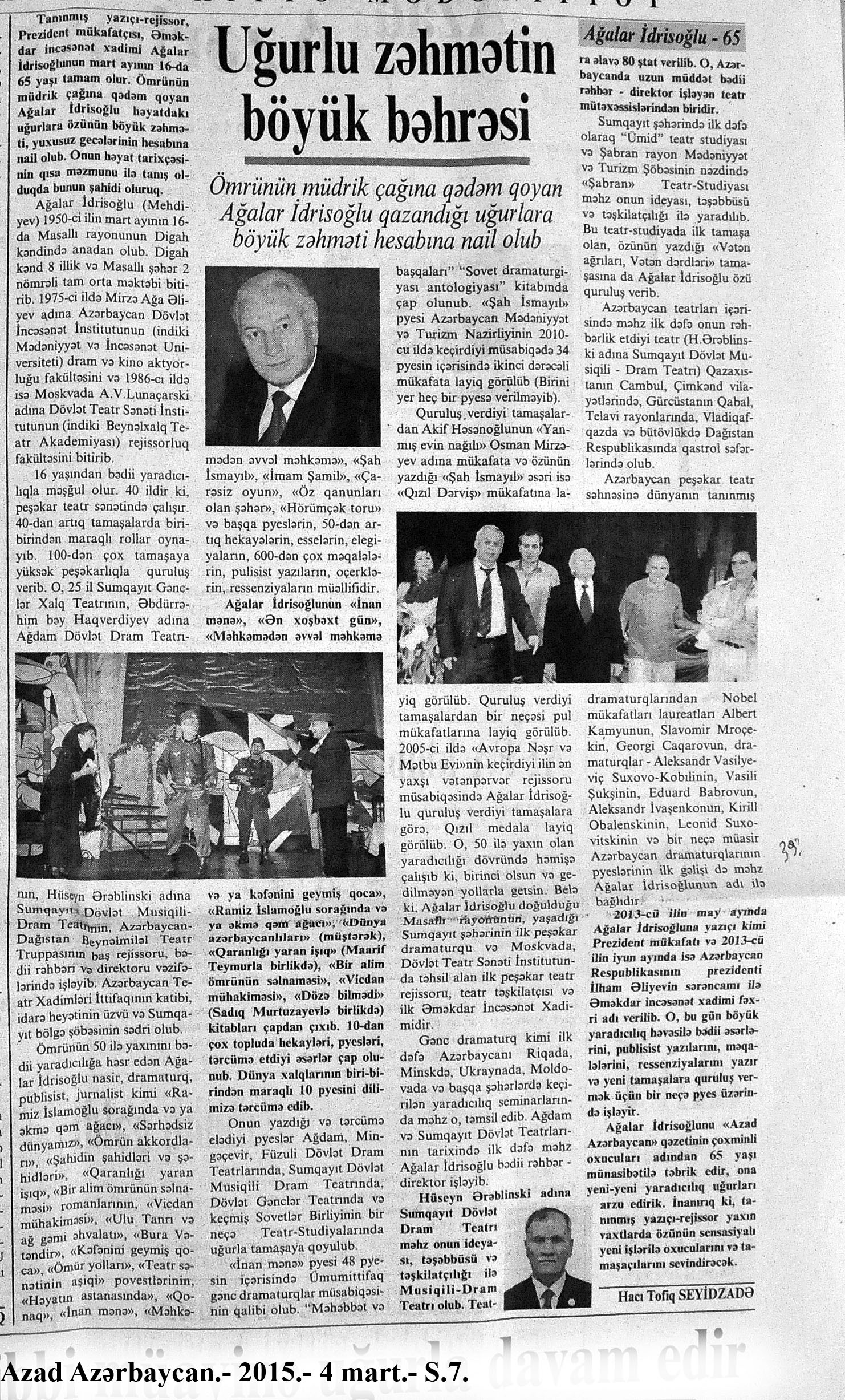 268. Abbaslı, T. Həsən Əbluc qiraətləri: Süsən sünbül əsimli, şeyda bülbül sədalı, şəbi-hicran ağrılı, dili-vüsal çağrılı...: [bədii qiraət ustası, rejissor və aktyor haqqında] //Mədəniyyət.- 2015.- 13 mart.- S.11. 269. Abdullayeva, S. III Ümumrespublika Teatr Festivalı həlledici mərhələdə //525-ci qəzet.- 2015.- 31 mart.- S.7. 270. Atakişiyev, A. Saralmış afişa: “Adam var ki, adamların naxışıdır”: [rejissor İbrahim Qaradağlı haqqında] //Azad Azərbaycan.- 2015.- 11 mart.- S.7. 271. Aydın Əliyev: Aktyor teatra hər bir yaşda lazımdır”: [Əməkdar artistlə müsahibə] /müsahibəni apardı Xəyalə Rəis //Kaspi.- 2015.- 20-29 mart.- S.11. 272. “Etüd” və “Bədii qiraət” müsabiqəsinə yekun vurulub: [Azərbaycan Dövlət Mədəniyyət və İncəsənət Universitetinin “Səda” Tədris Teatrında] //Mədəniyyət.- 2015.-18 mart.- S.4. 273. Elçinin “Teleskop” əsərinin London premyerası böyük maraqla qarşılanıb: [İkinci Beynəlxalq “Buta” İncəsənət festivalı çərçivəsində Metyu Quldun hazırladığı tamaşanın premyerası haqqında] //525-ci qəzet.- 2015.- 3 mart.- S. 7; Mədəniyyət.- 2015.- 4 mart.- S.8. 274. Ələsgərli, Ç. “Burdan min atlı keçdi”– İrəvan Teatrının daha bir yaradıcılıq uğuru: [Firudin Məhərrəmovun hazırladığı eyniadlı tamaşa İrəvan Dövlət Dram Teatrının səhnəsində] //525-ci qəzet.- 2015.- 12 mart.- S.7. 275. Kazımzadə, A. Düşündürən komediyalar müəllifi: [Sabit Rəhmanın milli teatr və kinomuzun inkişafındakı xidmətləri haqqında] //Azərbaycan.- 2015.- 19 mart.- S.14. 276. Nizamiqızı, H. Teatrdan danışanlar...: [AMEA Memarlıq və İncəsənət İnstitutunda keçirilən “Müasir Azərbaycan teatrı və mass media: problemlər, perspektivlər” mövzusunda seminar-müzakirə keçirildi] // Mədəniyyət.- 2015.- 6 mart.- S.7. 277. Piriyev, İ. Ürəyəyatımlı sənətkar: [C.Cabbarlı adına İrəvan Dövlət Azəbaycan Teatrının aktrisası Səmayə İsmayılova haqqında] //Mədəniyyət.- 2015.- 13 mart.- S.15. 278. Seyidzadə, T. Uğurlu zəhmətin böyük bəhrəsi: [yazıçı-rejissor Ağalar İdrisoğlu haqqında] //Azad Azərbaycan.- 2015.- 4 mart.- S.7. Bax: 265, 266, 267