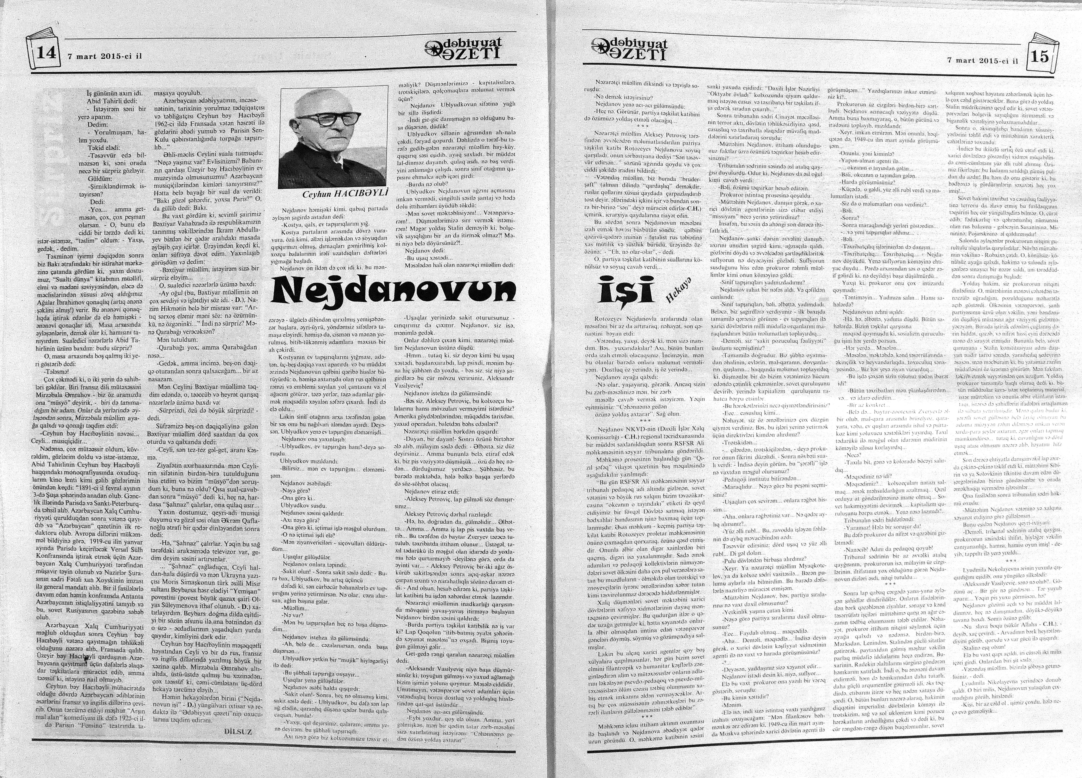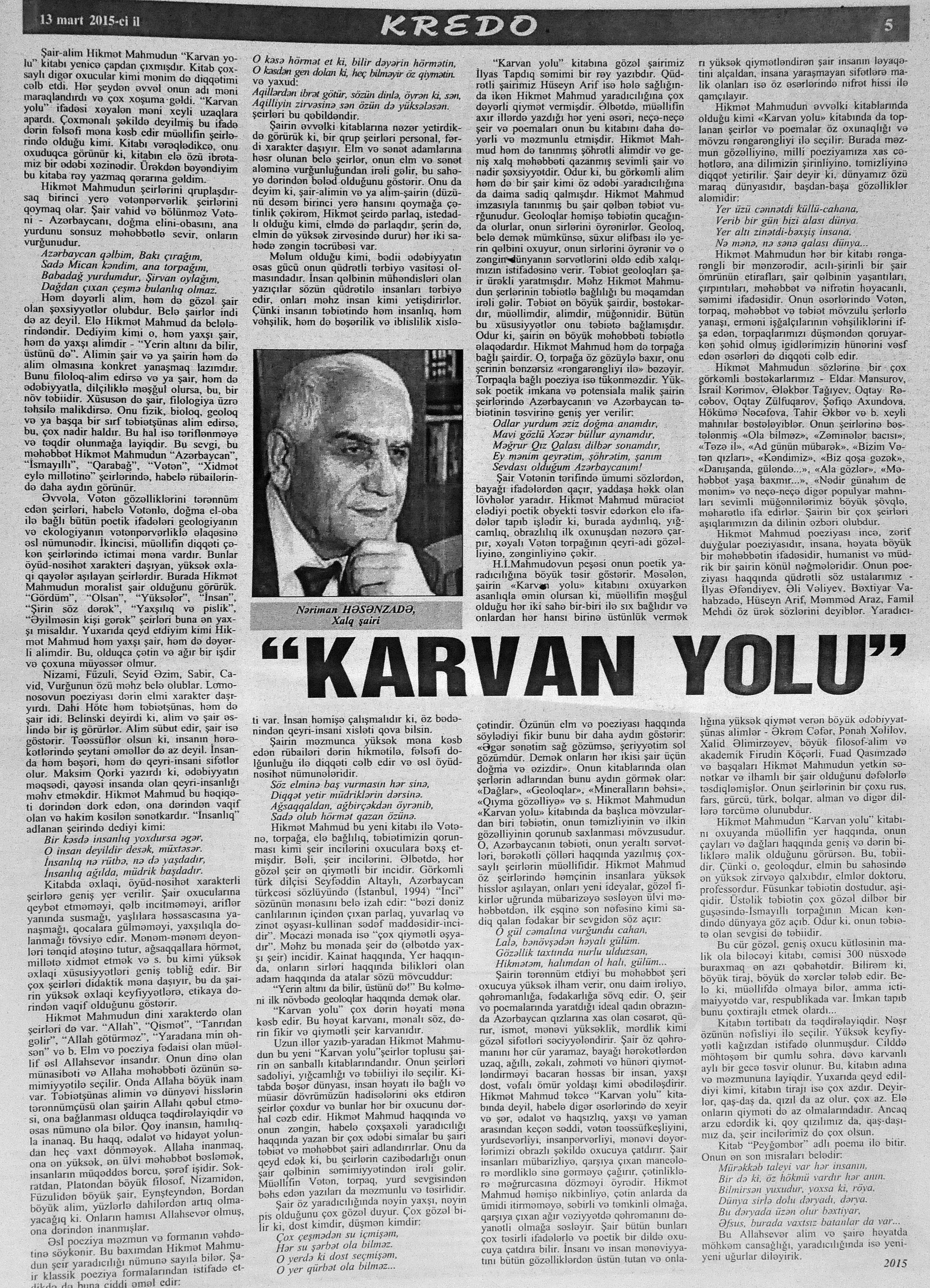 387. Hesse, H. Roman oxumaq: [alman dilindən tərcümə] /tərc. etdi Xanım Aydın //Kaspi.- 2015.- 7-10 mart.- S.15. 388. Hüseyn, F. Təbir caizsə //Ədəbiyyat qəzeti.- 2015.- 7 mart.- S.11; 14 mart.- S.10. 389. Mehdi, Q. Zəlimxan Yaqub yaddaşı //Kaspi.- 2015.- 14-16 mart.- S.20. 390. Şükür, Ş. Xocalım mənim... //Kredo.- 2015.- 13 mart.- S.15. ROMANLAR