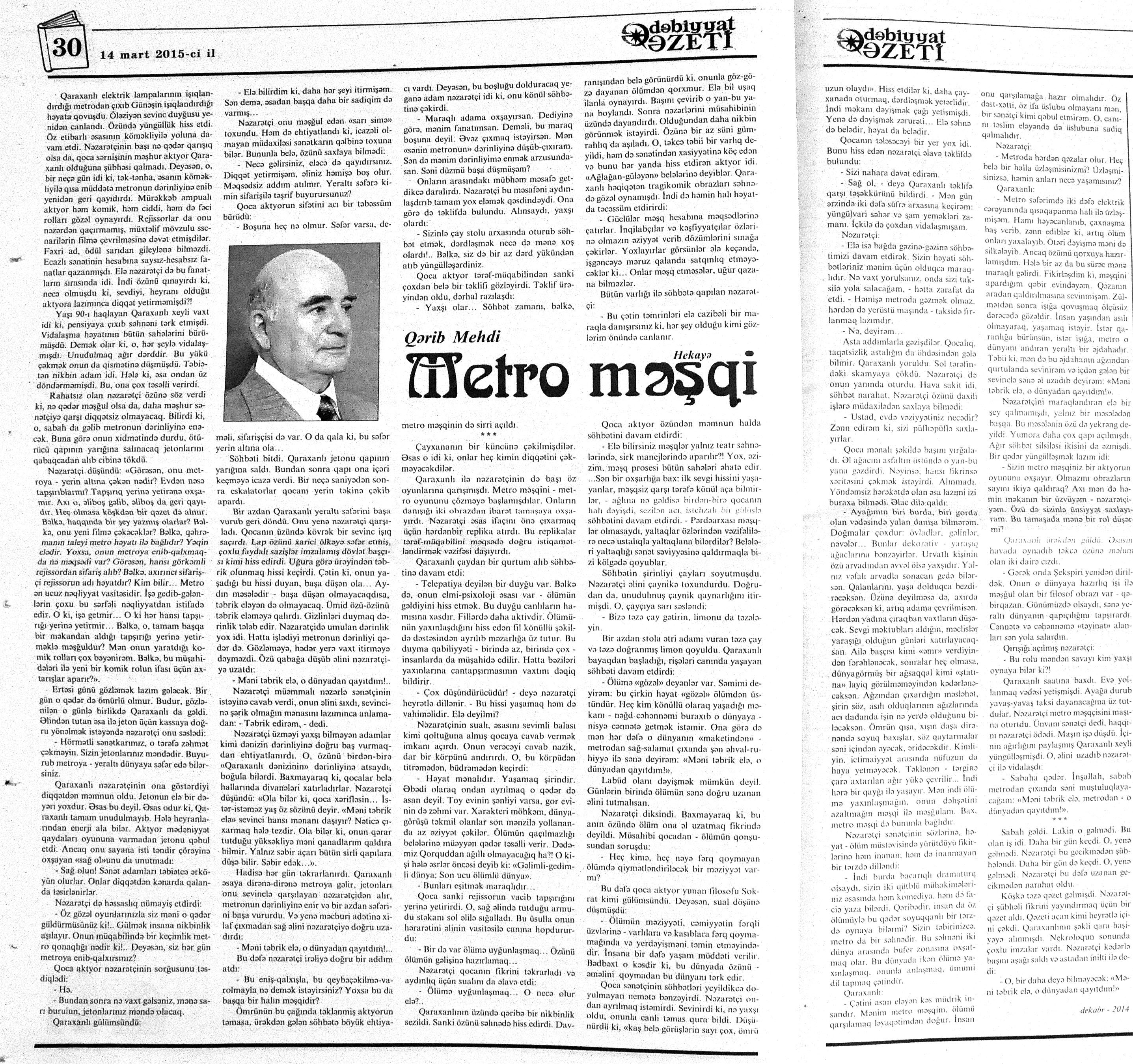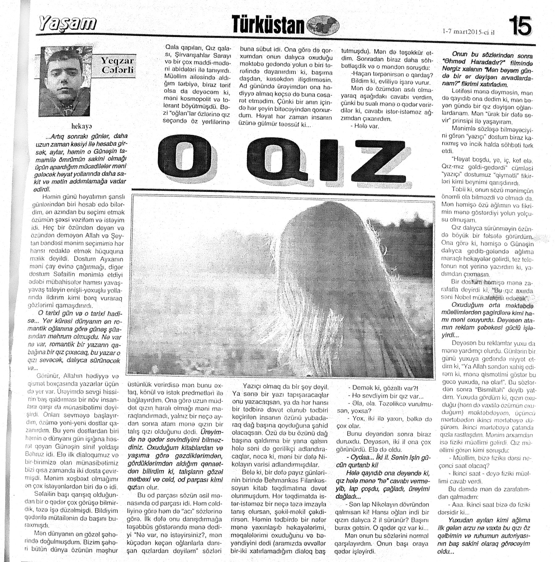 377. Cəfərli, Y. O qız //Türküstan.- 2015.- 1-7 mart.- S.15. 378. Elcanlı, S. Yovşanlı yamacın qürub çağında //Ədəbiyyat qəzeti.- 2015.- 7 mart.- S.24. 379. Fikrətoğlu, O. Son igidin nağılı //Ədəbiyyat qəzeti.- 2015.- 14 mart.- S.5. 380. Hacıbəyli, C. Neydanovun işi //Ədəbiyyat qəzeti.- 2015.- 7 mart.- S.14-15. 381. Kazımov, İ. Köç //Kredo.- 2015.- 27 mart.- S.15. 382. Mehdi, Q. Metro məşqi //Ədəbiyyat qəzeti.- 2015.- 14 mart.- S.30-31. 383. Nəzərli, Ş. Xalçanın sirri //Azərbaycan xalçaları.-2014.- № 12.- S.134-140. 384. Rəhimov, Ə. Çimdik //Ədalət.- 2015.- 13 mart.- S.6. 385. Yılmaz, Ş. Kolleksioner //Kaspi.- 2015.- 14-16 mart.- S.22. 386. Zeynalov, E. Onlar quşa döndülər //525-ci qəzet.- 2015.- 30 mart.- S.7.