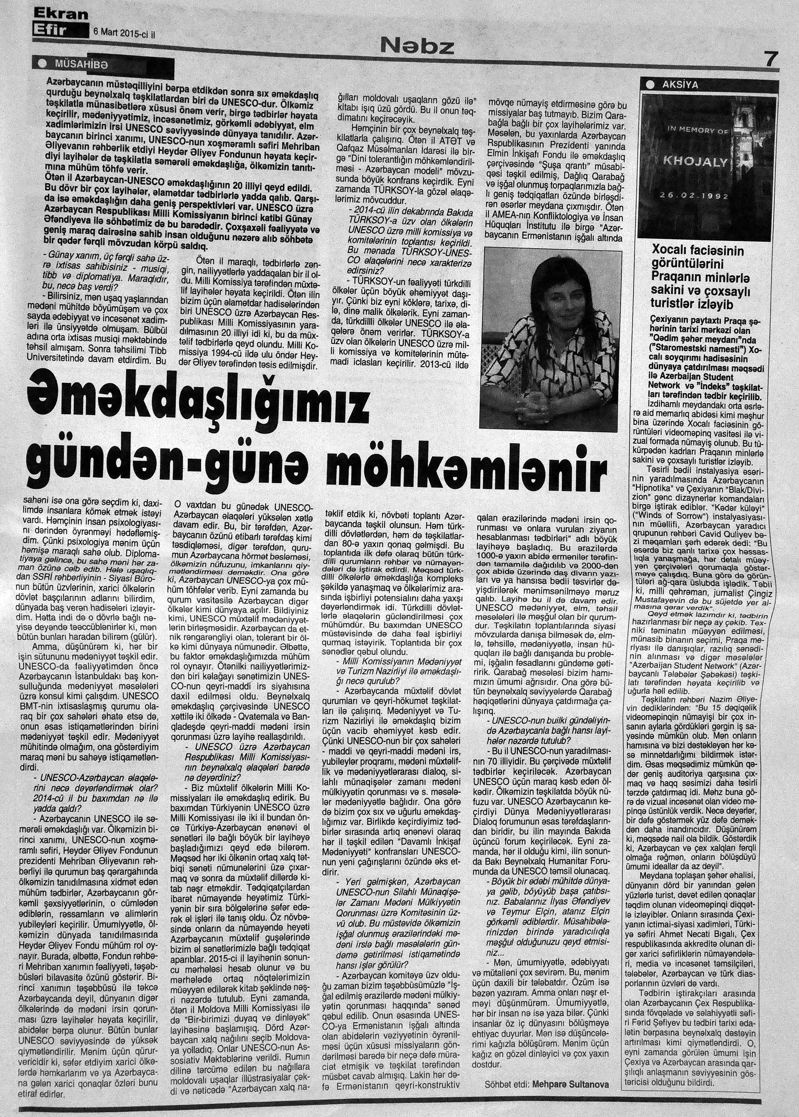 46. Abdullayeva, F. Bakıda Misir kurortlarının təqdimatı keçirilib: Azərbaycanlı turistlərə bu ölkəyə Gürcüstandan uçmaq təklif edilir //Mədəniyyət.- 2015.- 11 mart.- S.9. 47. Abdullayeva, F. Əbülfəs Qarayev: Turizm emosiyalar əsasında təşkil edilir: [Moskvada prestijli “Conde Nast Traveller Luxury Travel Fair” sərgisində ölkəmizin turizm potensialının təqdimat mərasimində mədəniyyət və turizm nazirinin çıxışı haqqında] //Azərbaycan.- 2015.- 19 mart.- S.9. 48. Abdullayeva, F. Fransanın turizm imkanları barədə təqdimat: Bakıda fransız qastronomiyası həftəsi keçiriləcək: //Mədəniyyət.- 2015.- 6 mart.- S.9. 49. Abdullayeva, F. Tələbkar Rusiya tamaşaçısı Murtuza Bülbülün debütünü alqış və gül-çiçəklə qarşıladı: [Moskva Dövlət Konservatoriyasında] //Azərbaycan.- 2015.- 17 mart.- S.8. 50. Abdullayeva, S. ABŞ hindularının “Oklahoma Fancy Dancers” qrupu Naxçıvanda konsert verib //525-ci qəzet.- 2015.- 17 mart.- S.7. 51. Abdullayeva, S. “Azərbaycanla Yunanıstan elm və mədəniyyət işığında”: [“Elm çırağı” İctimai Birliyinin keçirdiyi eyniadlı seminar haqqında] //525-ci qəzet.- 2015.- 12 mart.- S.7. 52. Abdullayeva, S. Bakıda Tacik Kinosu Günləri keçirlir: [Nizami Kino Mərkəzində] //525-ci qəzet.- 2015.- 12 mart.S.6. 53. Abdullayeva, S. Əbülfəs Qarayev İtaliya nümayəndə heyətini qəbul edib //525-ci qəzet.- 2014.- 13 mart.- S.7. 54. Azərbaycan Xalça Muzeyi Pakistan dövlətinin başçısında xoş təəssürat doğurdu: Pakistan prezidenti Məmnun Hüseynin Azərbaycana rəsmi səfəri //Azərbaycan.- 2015.- 14 mart.- S.2. 55. Abdullayeva, S. Azərbaycan “Xalqlar dostluğu” festivalında təmsil olunub: [“Belarus-Rusiya Universiteti” təhsil müəssisələrinin təşkilati dəstəyi ilə əcnəbi tələbələrin VIII beynəlxalq festivalının keçirilməsi haqqında] //525-ci qəzet.- 2015.- 31 mart.- S.7. 56. Azərbaycan-Niderland mədəni əlaqələri müzakirə olunub: Niderlandlı ekspertlər azərbaycanlı rəsm bərpaçıları üçün treninqlər keçəcəklər: [mədəniyyət və turizm nazirinin müavini Sevda Məmmədəliyevanın Niderland Krallığının Azərbaycandakı səfiri Robbert Qabrielseni qəbul etməsi haqqında] //Mədəniyyət.- 2015.- 6 mart.- S.4. 57. Bakıda YARAT Müasir İncəsənət Mərkəzinin açılışı münasibətilə “Şirin Neşat: Gözlərimin evi” sərgisi təqdim olunub: [İran əsilli rəssamın eyniadlı fotosərgisi haqqında] //Azərbaycan.- 2015.- 30 mart.- S.9; Respublika.- 2015.- 30 mart.- S.6; 525-ci qəzet.- 2015.- 30 mart.- S.2; Səs.- 2015.- 30 mart.- S. 5. 58. “Bir-birimizi duyaq və dinləyək”: Azərbaycan – Moldova mədəni əlaqələri müzakirə olunub: [Kişineu şəhərində UNESCO üzrə Azərbaycan Respublikası Milli Komissiyasının birinci katibi Günay Əfəndiyeva ilə Moldovanın mədəniyyət və turizm naziri Monika Babuk arasında keçirilən görüş haqqında] //Mədəniyyət.- 2015.- 18 mart.- S.3. 59. Bişkekdə Azərbaycan musiqisi günü //Xalq qəzeti.- 2015.- 20 mart.- S.9; 525-ci qəzet.- 2015.- 13 mart.- S.7. 60. Ergün, O. Musiqinin vətəni yoxdur: Oya Ergün: “Xoşbəxtəm ki, uzun müddətdən sonra Avropada Rəşid Behbudovun mahnılarından ibarət konsert proqramı ilə çıxış edəcəyəm”:[türkiyəli musiqiçi ilə müsahibə] /müsahibəni apardı Xəyalə Rəis //Kaspi.- 2015.- 28 fevral.- 2 mart.- S.8. 61. Əfəndiyeva, G. Əməkdaşlığımız gündən-günə möhkəmlənir: [UNESCO üzrə Azərbaycan Respublikası Milli Komissiyasının birinci katibi Günay Əfəndiyeva ilə müsahibə] /müsahibəni apardı Mehparə Sultanova //Ekran-efir.- 2015.- 6 mart.- S.7. 62. Əliyeva, T. Türkiyədə “Türk xalqları mədəniyyətində qadın mövzusu” adlı beynəlxalq simpozium keçirilmişdir: [simpoziumda azərbaycanlı alimlərdən ibarət nümayəndə heyəti iştirak edib] //Azərbaycan.- 2015.- 20 mart.- S.15. 63. Əməkdaşlıq məsələləri müzakirə olunub: [Bakıdakı Misir Mədəniyyət Mərkəzinin müdiri Əhməd Sami Elaydinin Azərbaycan Respublikasının Prezidenti yanında Elmin İnkişafı Fondunda olması haqqında] //Mədəniyyət.- 2015.- 13 mart.- S.5. 64. Heydər Əliyev Mərkəzi ilə tanışlıq: [Pakistan prezidenti Məmnun Hüseynin Azərbaycana rəsmi səfəri çərçivəsində] //Azərbaycan.- 2015.- 15 mart.- S.3. 65. Heydər Əliyev Mərkəzində “Sloveniya Günü”nün açılışı olub //Azərbaycan.- 2015.- 14 mart.- S.3. 66. Hüseynov, F. Bakıda Tacikistan kinosu günləri keçirilir: [Nizami Kino Mərkəzində] //Mədəniyyət.- 2015.- 11 mart.S.2. 67. Hüseynov, F. “Gizli məna”: Çinli rəssam öz əsərini Milli İncəsənət Muzeyinə hədiyyə edib //Mədəniyyət.- 2015.- 11 mart.- S.4. 68. Hüseynov, F. Türk uşaq ədəbiyyatı həftəsi: [Rəşid Behbudov adına Dövlət Mahnı Teatrında Respublika Uşaq Kitabxanası və TİKA-nın (Türk Əməkdaşlıq və Koordinasiya Agentliyi) birgə layihəsi çərçivəsində] //Mədəniyyət.- 2015.- 4 mart. S.2. 69. İohan Sebastyan Bax beynəlxalq festivalı çərçivəsində növbəti konsert “ÜNS” Yaradıcılıq Səhnəsində təqdim olunub //Azərbaycan.- 2015.- 13 mart.- S.10. 70. Lalə. Ölkəmiz “Milan EXPO 2015” sərgisində zəngin pavilyonla təmsil olunacaq: Mədəniyyət və turizm naziri Əbülfəs Qarayev “Milan EXPO 2015”in İtaliya pavilyonunun nümayəndə heyətini qəbul edib //Mədəniyyət.- 2014.- 13 mart.- S.4. 71. Mehparə. Azərbaycanda Amerika günləri //Mədəniyyət.- 2015.- 13 mart.- S.5. 72. Mehparə. Bakıda Fransa həftəsi: [Frankofoniya günləri çərçivəsində Bakıdakı Fransa İnstitutunda bu ölkənin mədəniyyəti və qastronomiyasına dair “Kino mətbəxdə” adı altında filmlərin nümayiş olunması haqqında] //Mədəniyyət.- 2015.- 13 mart.S.10. 73. Milli Azərbaycan Tarixi